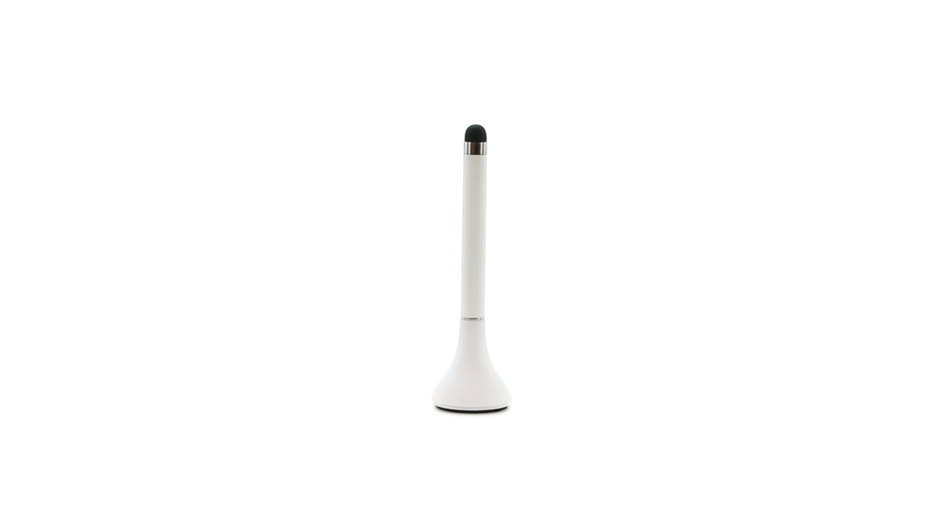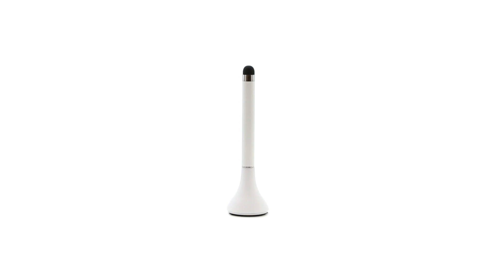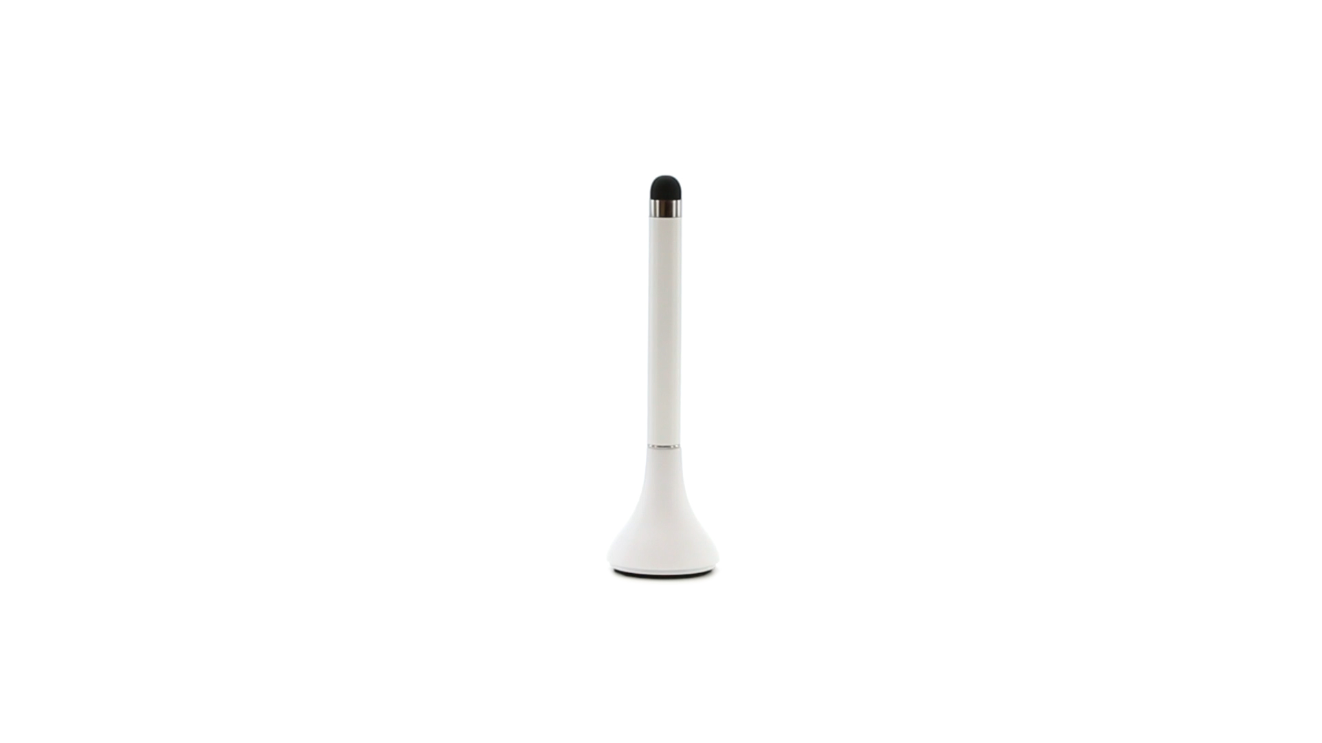 Origineller Stylus-Kugelschreiber mit Kappe und minimalistischem Design in glänzendem Weiss. Mit integriertem Bildschirmreiniger und blauer Tinte.