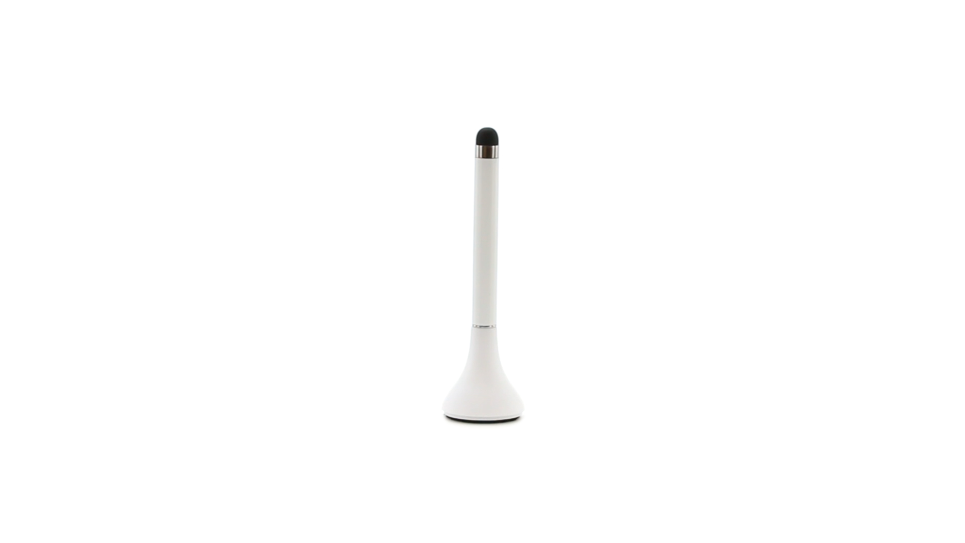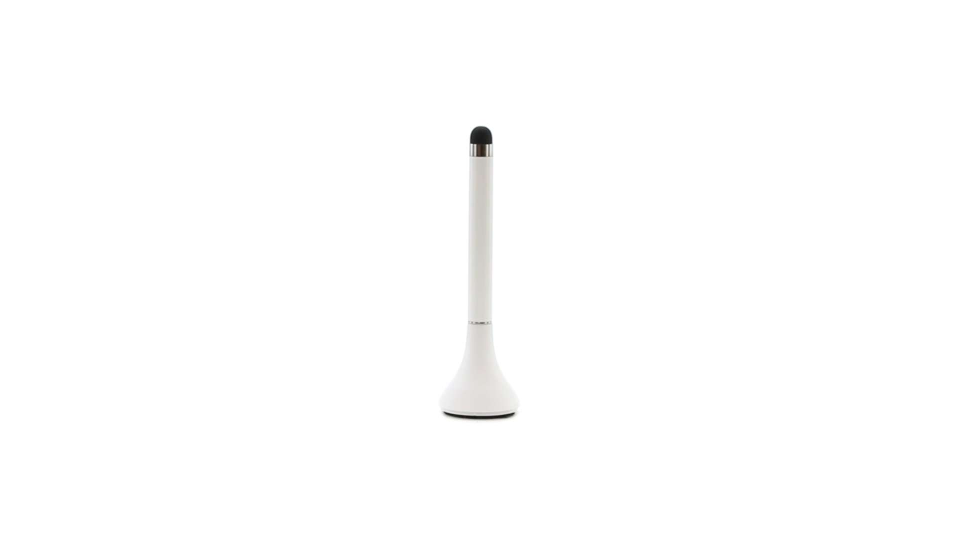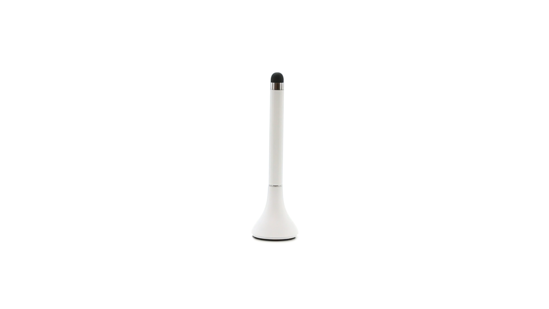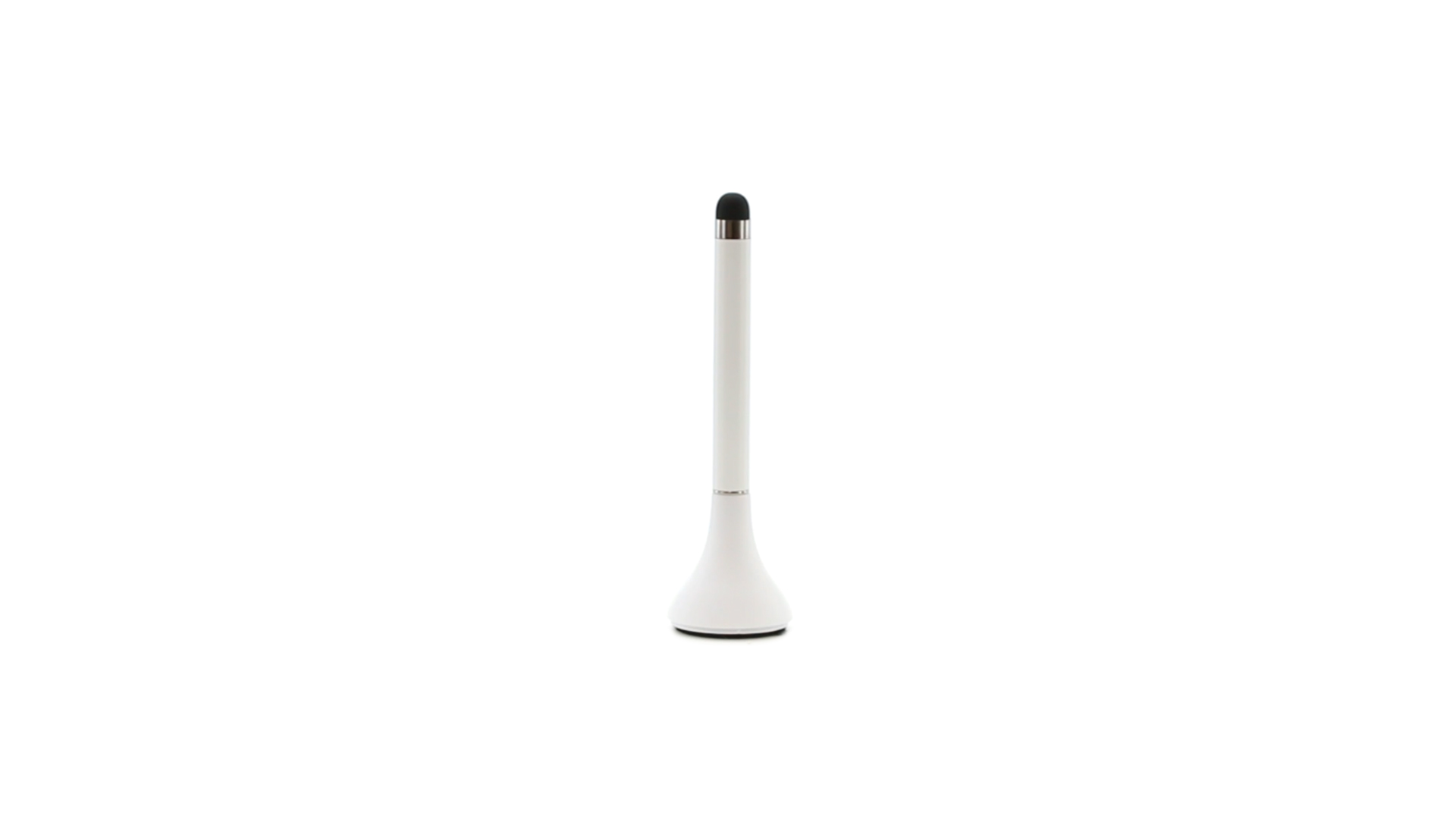 Origineller Stylus-Kugelschreiber mit Kappe und minimalistischem Design in glänzendem Weiss. Mit integriertem Bildschirmreiniger und blauer Tinte.
