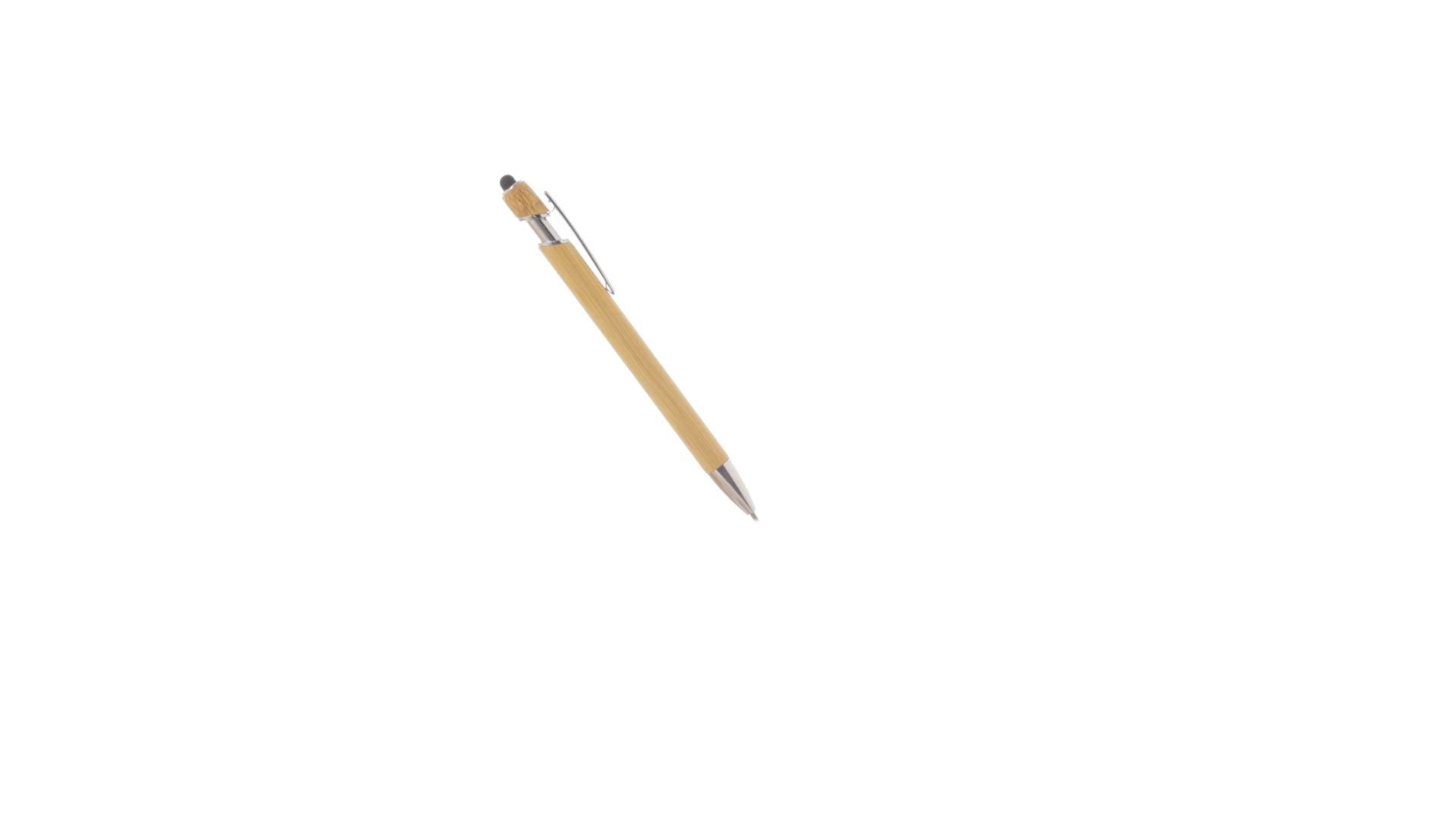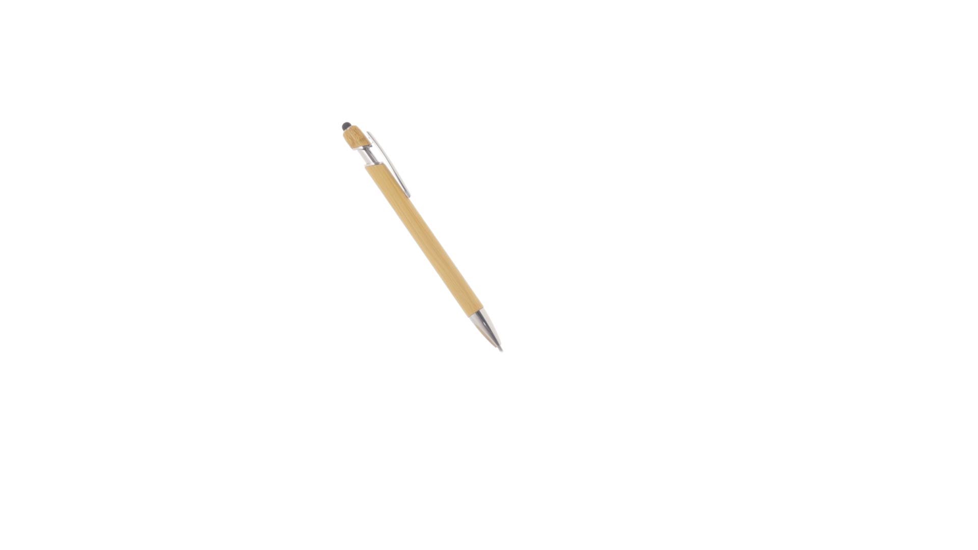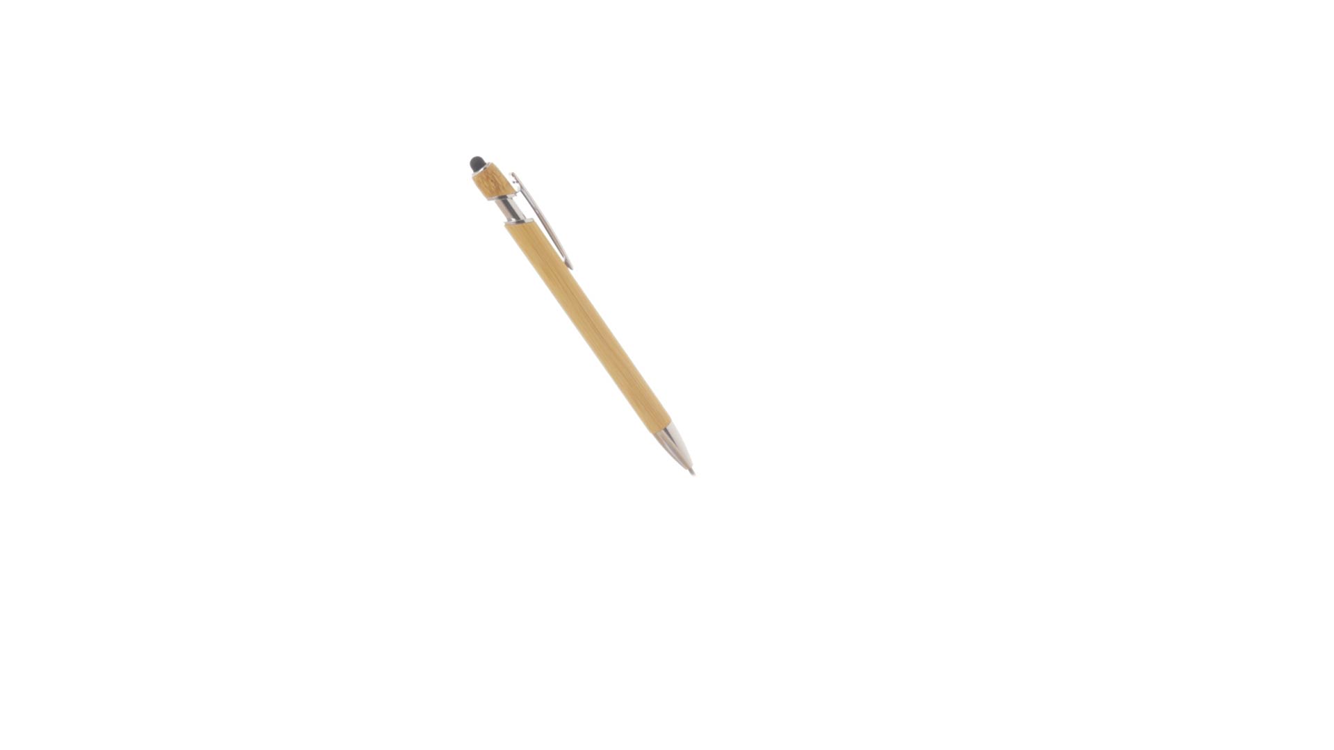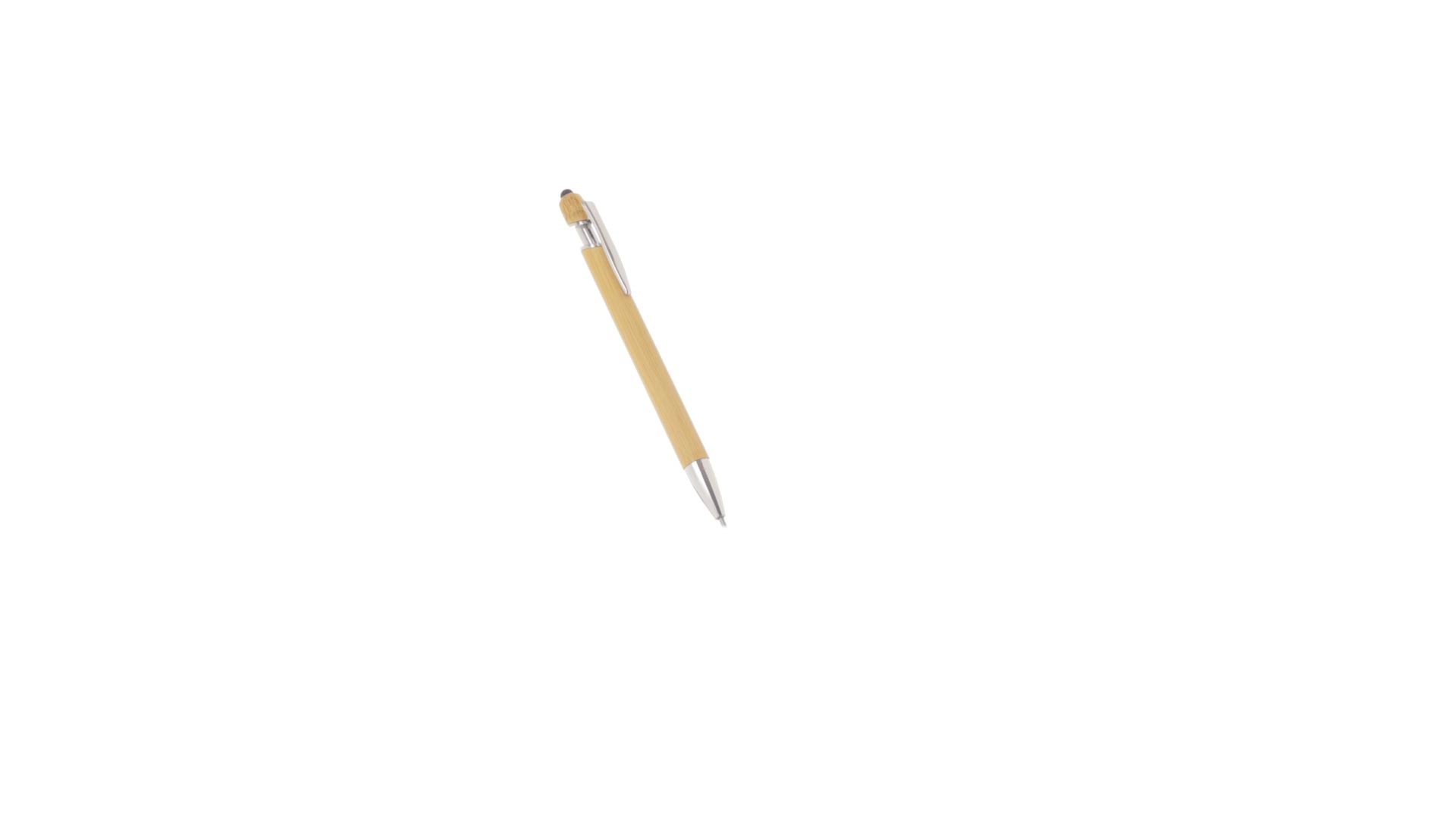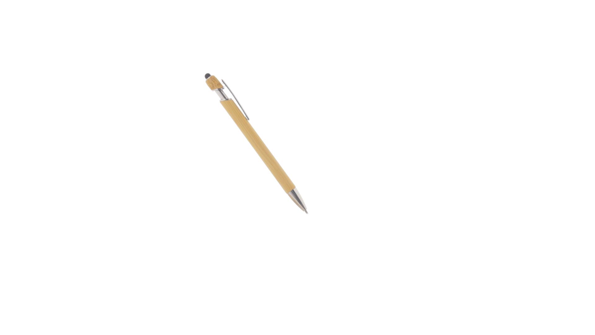Kugelschreiber mit Druckknopfmechanismus, Bambusschaft, verchromten Beschlägen und schwarzem Zeiger. Metallclip und blaue Tinte.