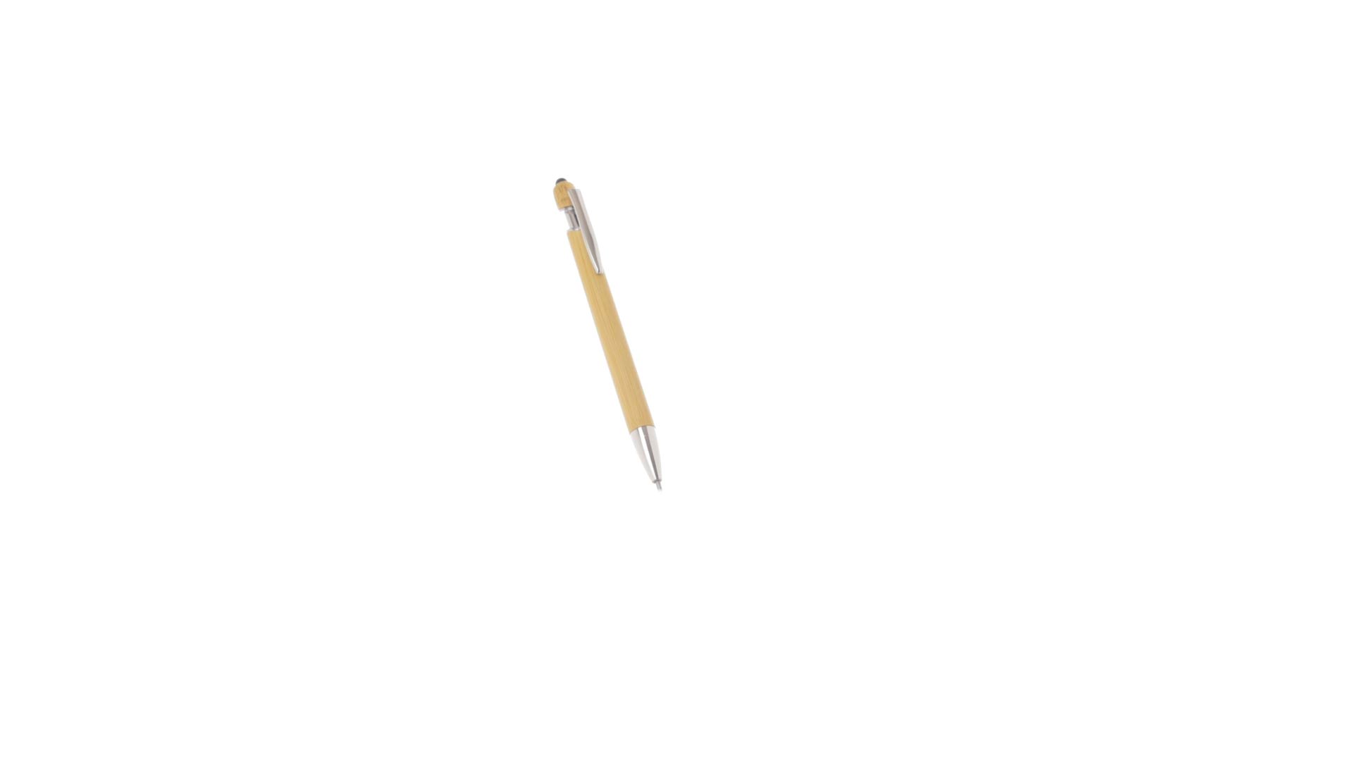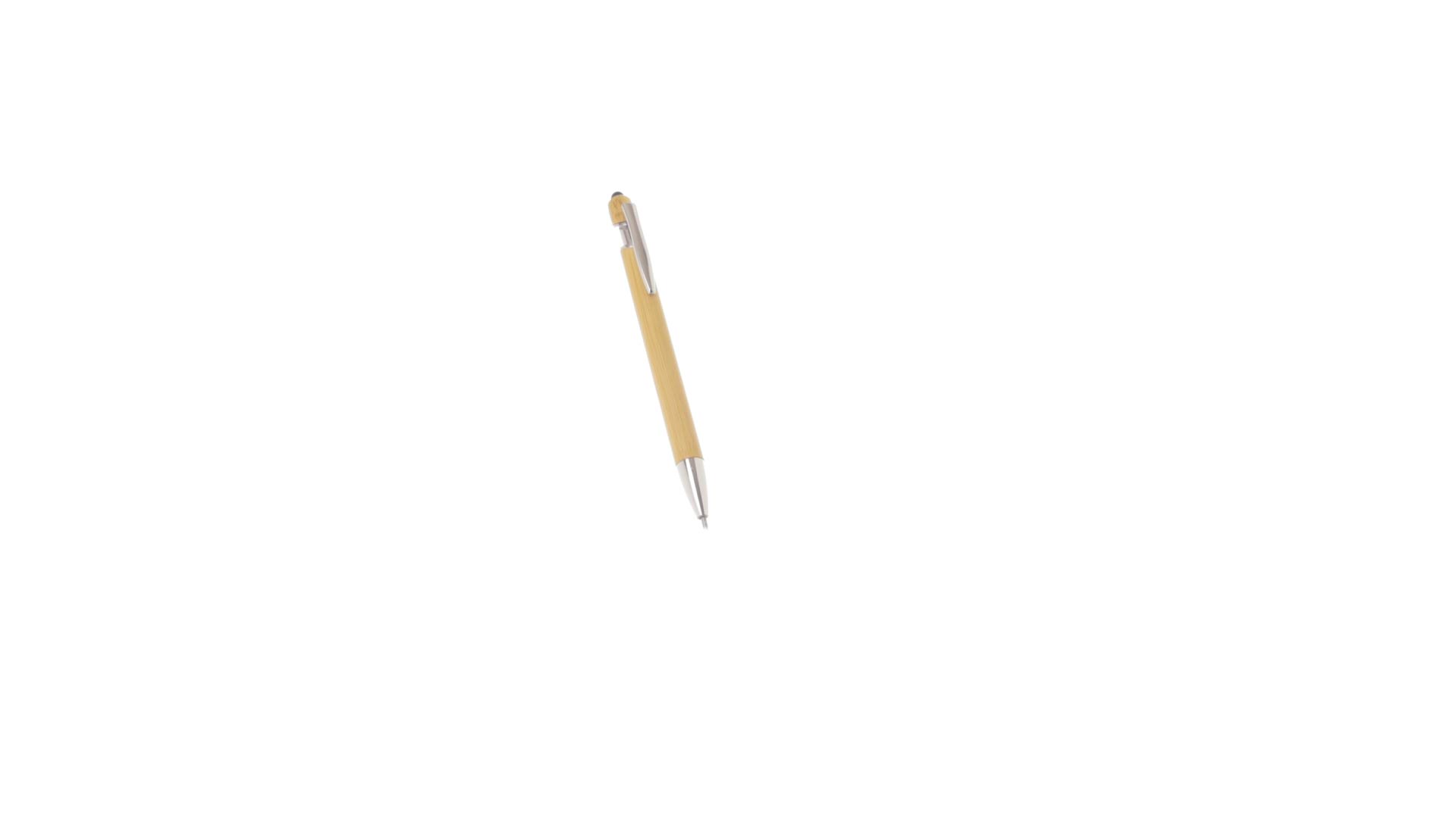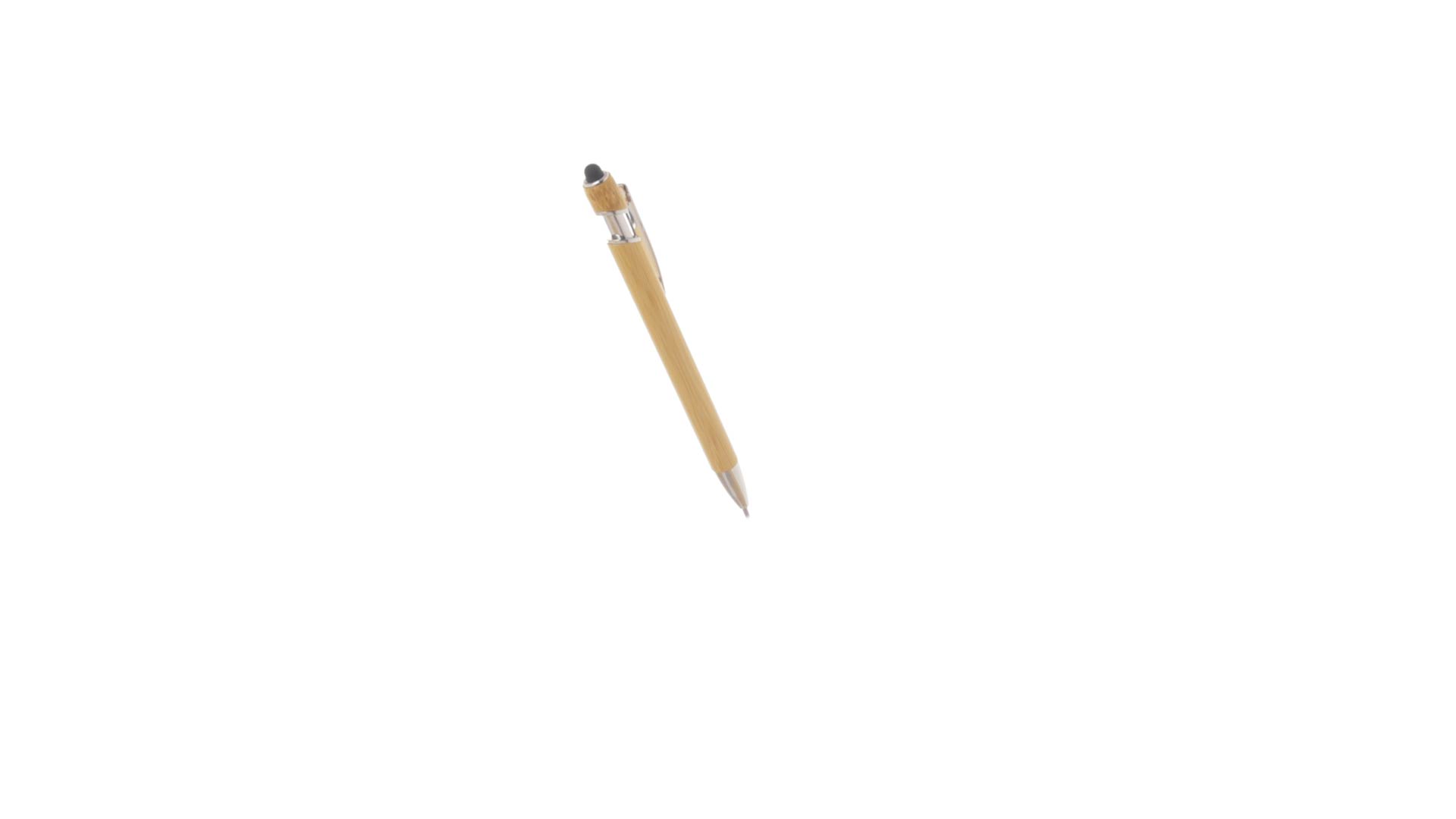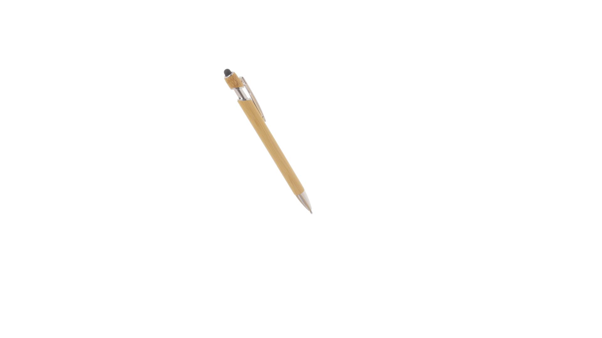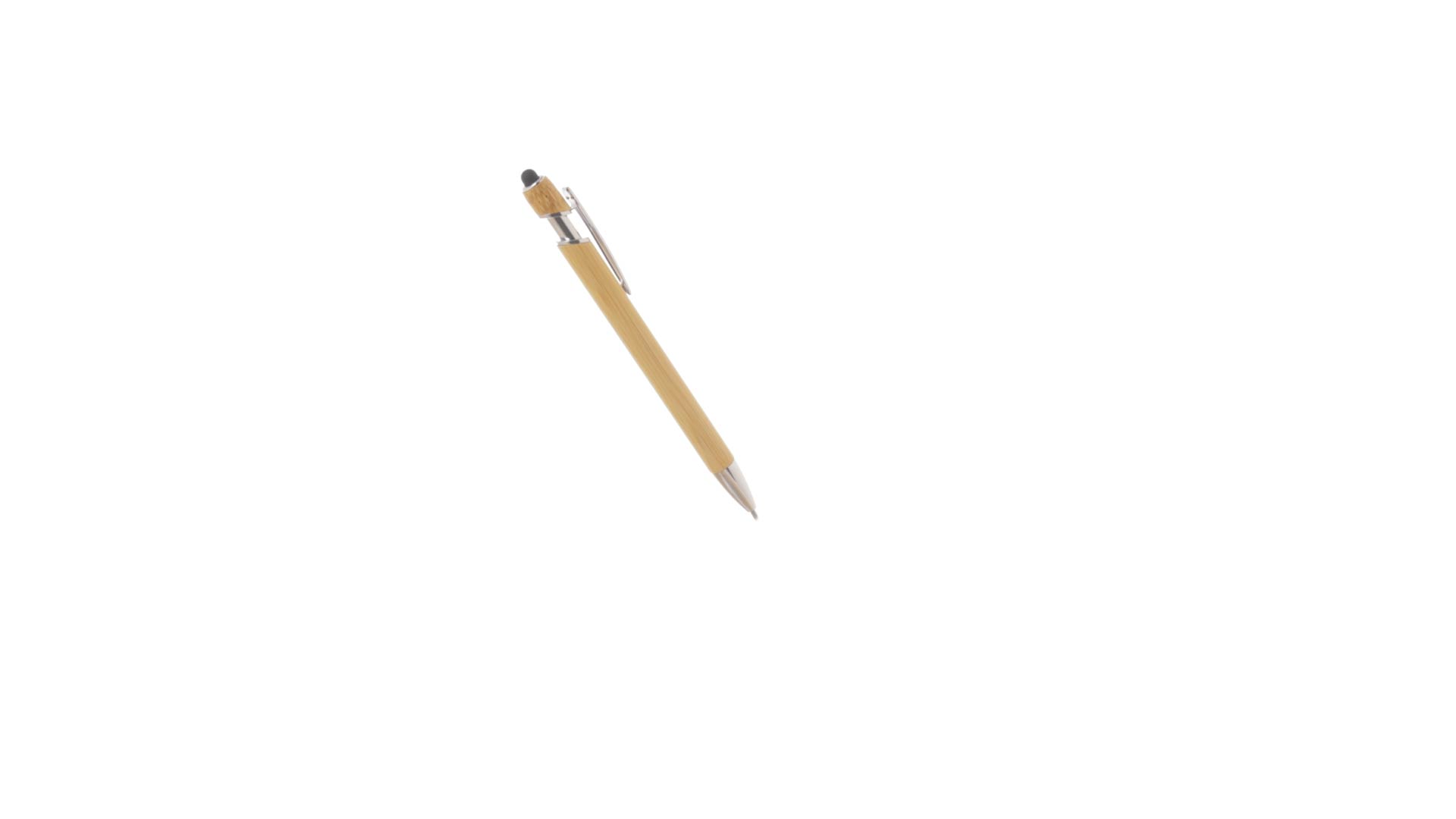 Kugelschreiber mit Druckknopfmechanismus, Bambusschaft, verchromten Beschlägen und schwarzem Zeiger. Metallclip und blaue Tinte.
