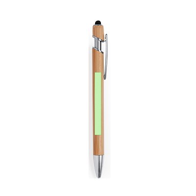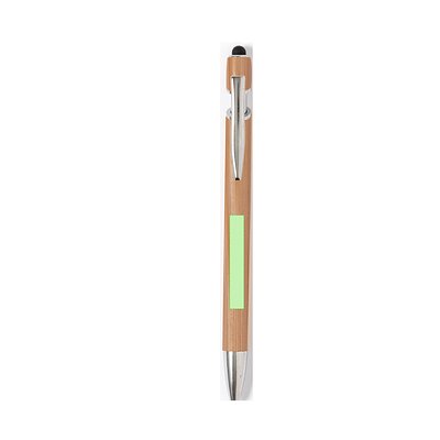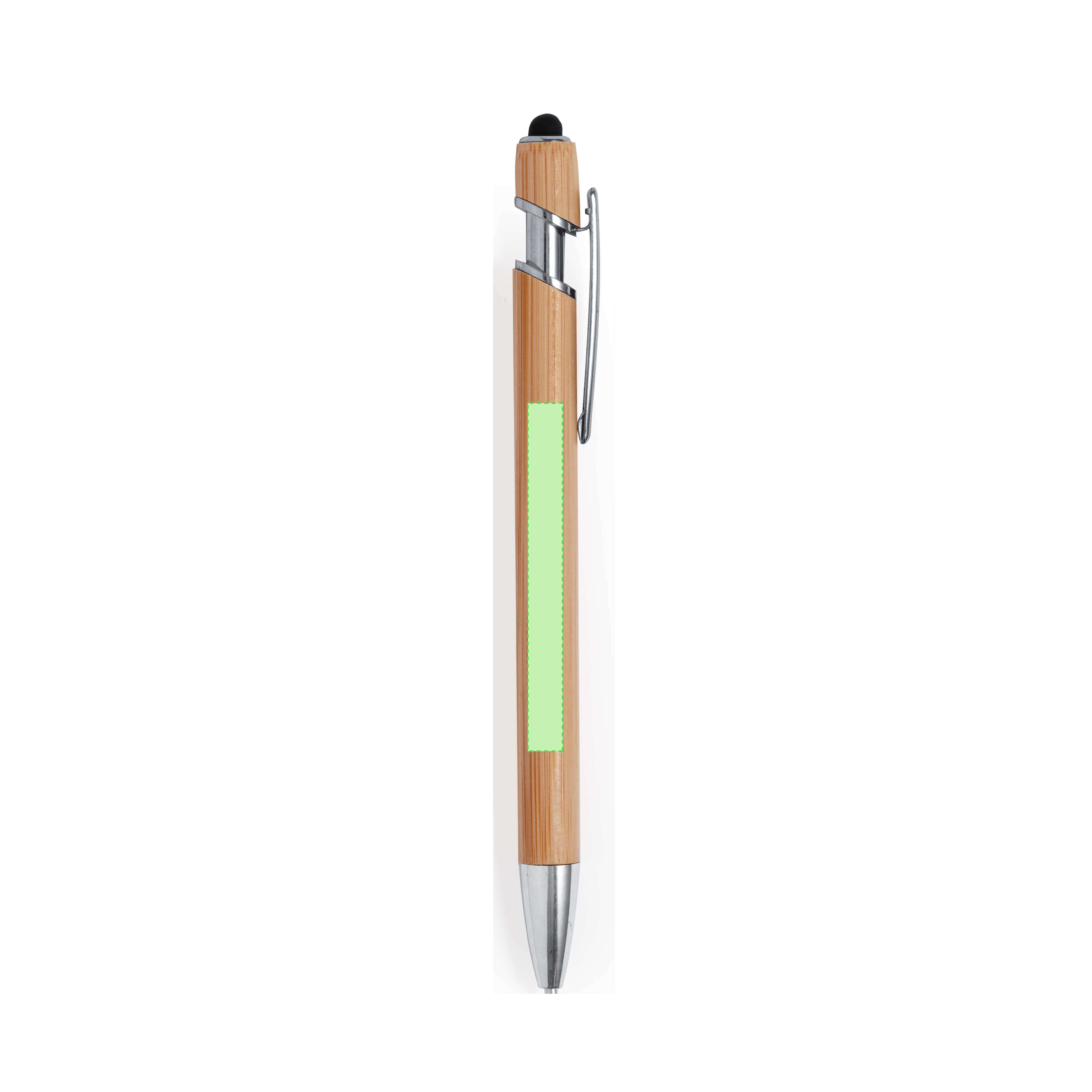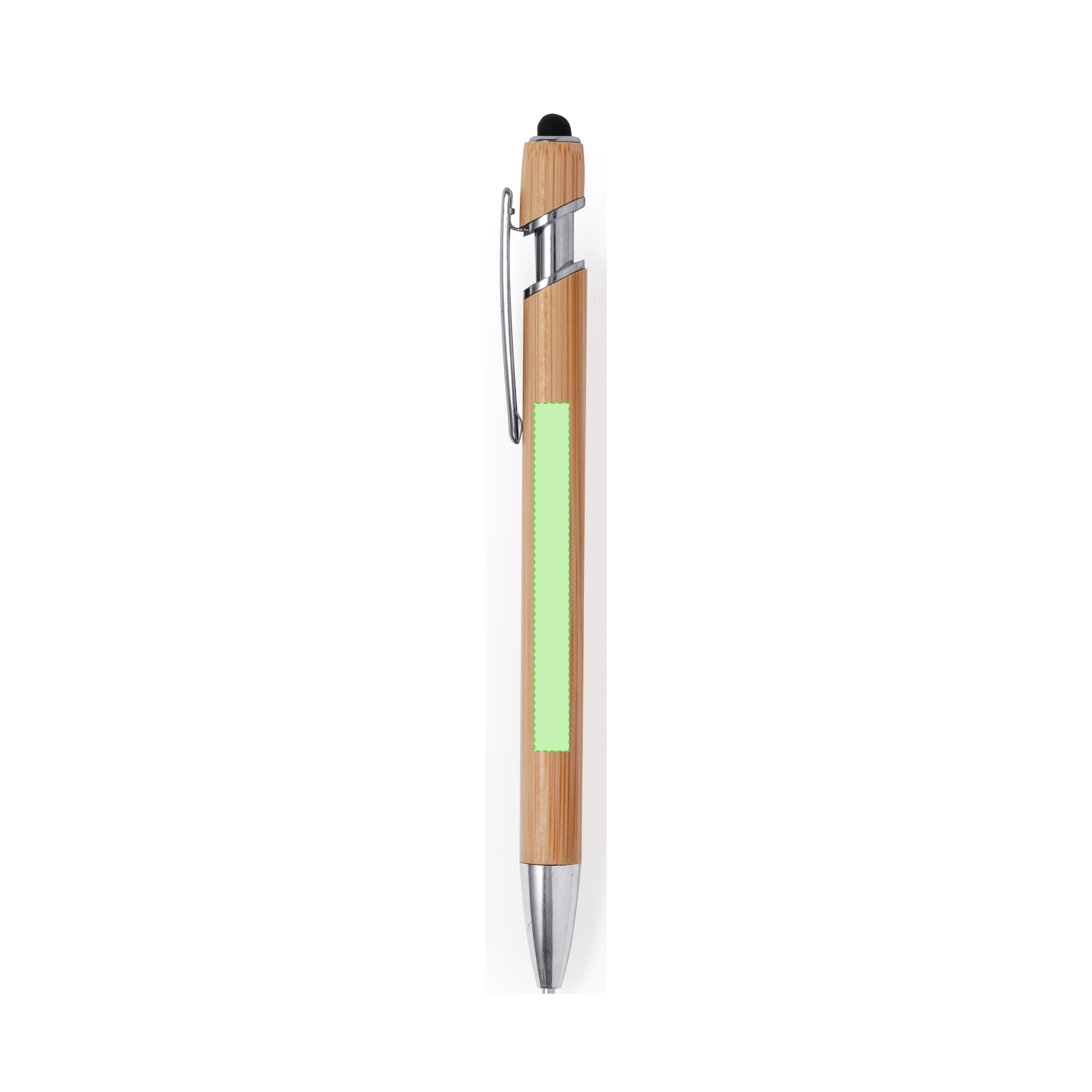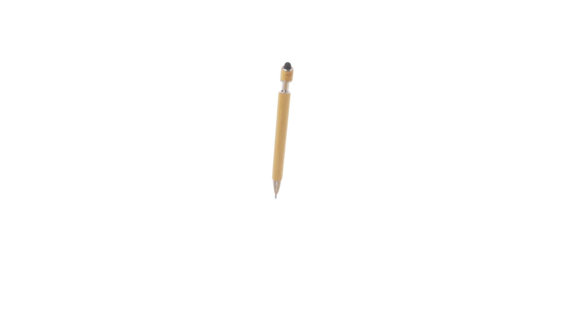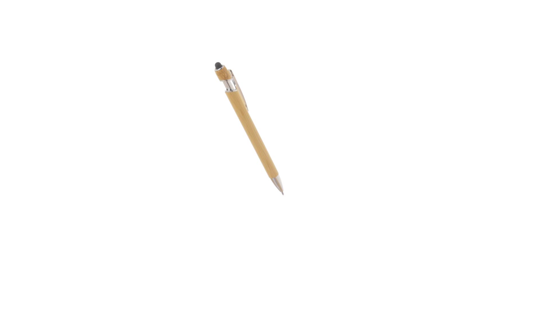 Kugelschreiber mit Druckknopfmechanismus, Bambusschaft, verchromten Beschlägen und schwarzem Zeiger. Metallclip und blaue Tinte.