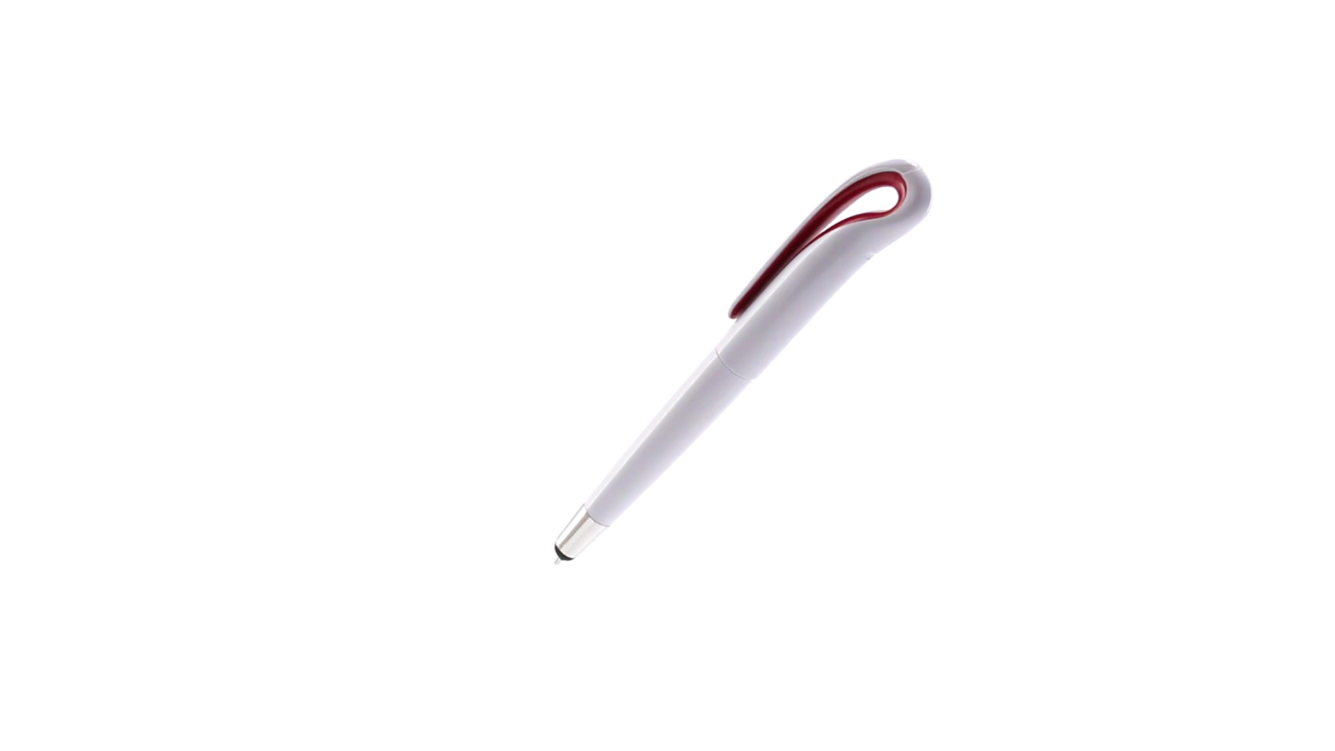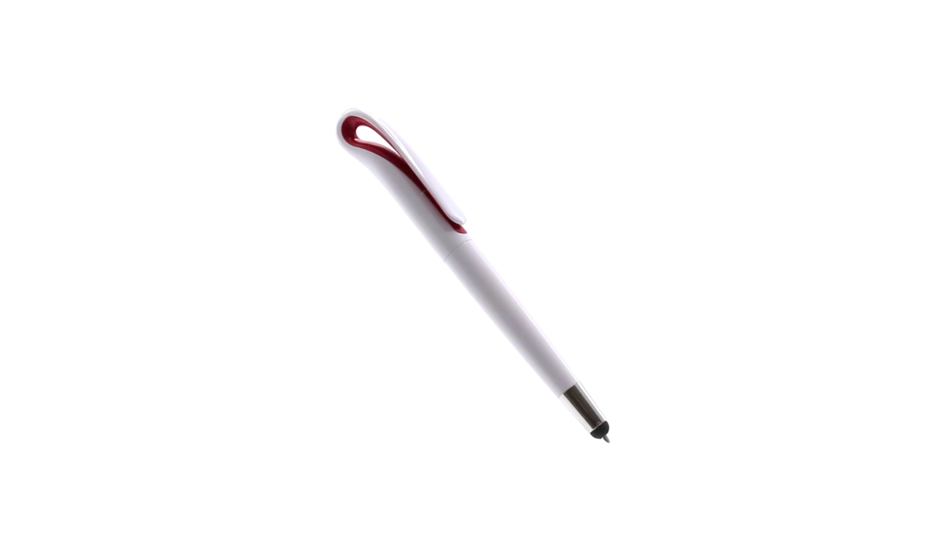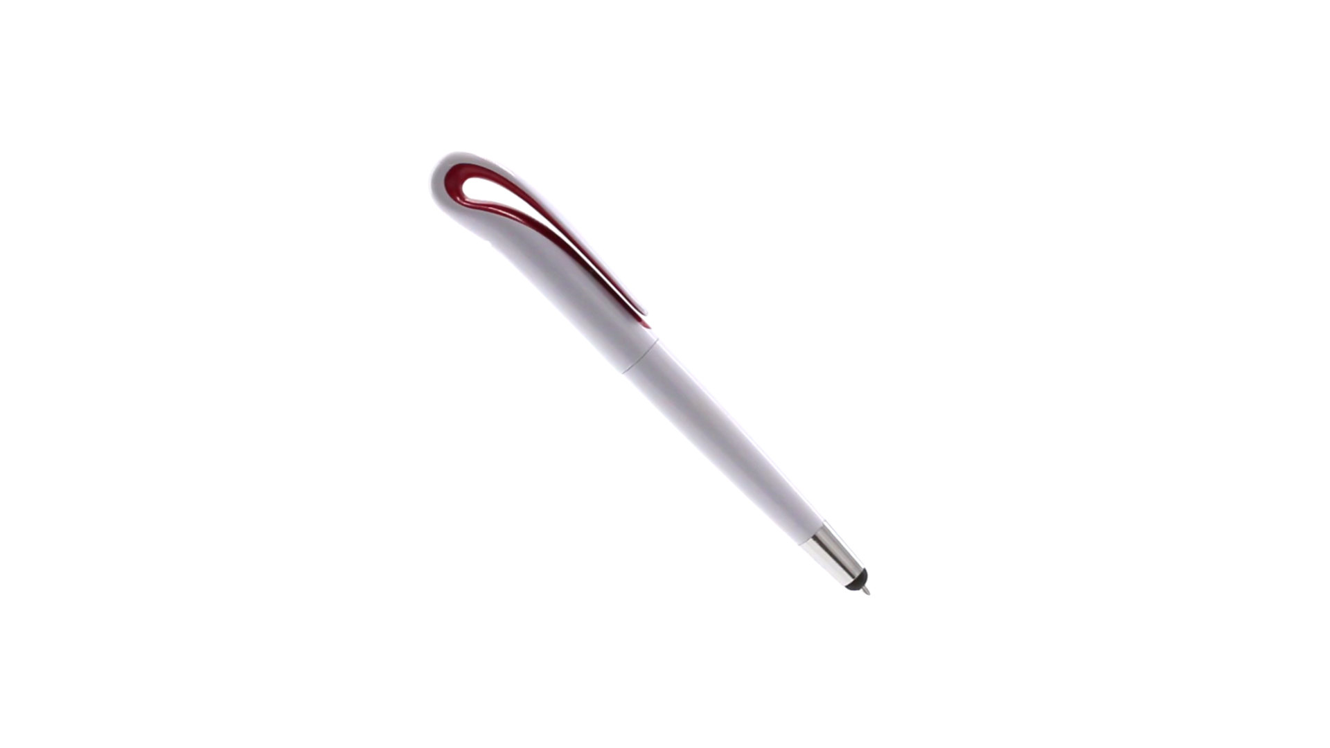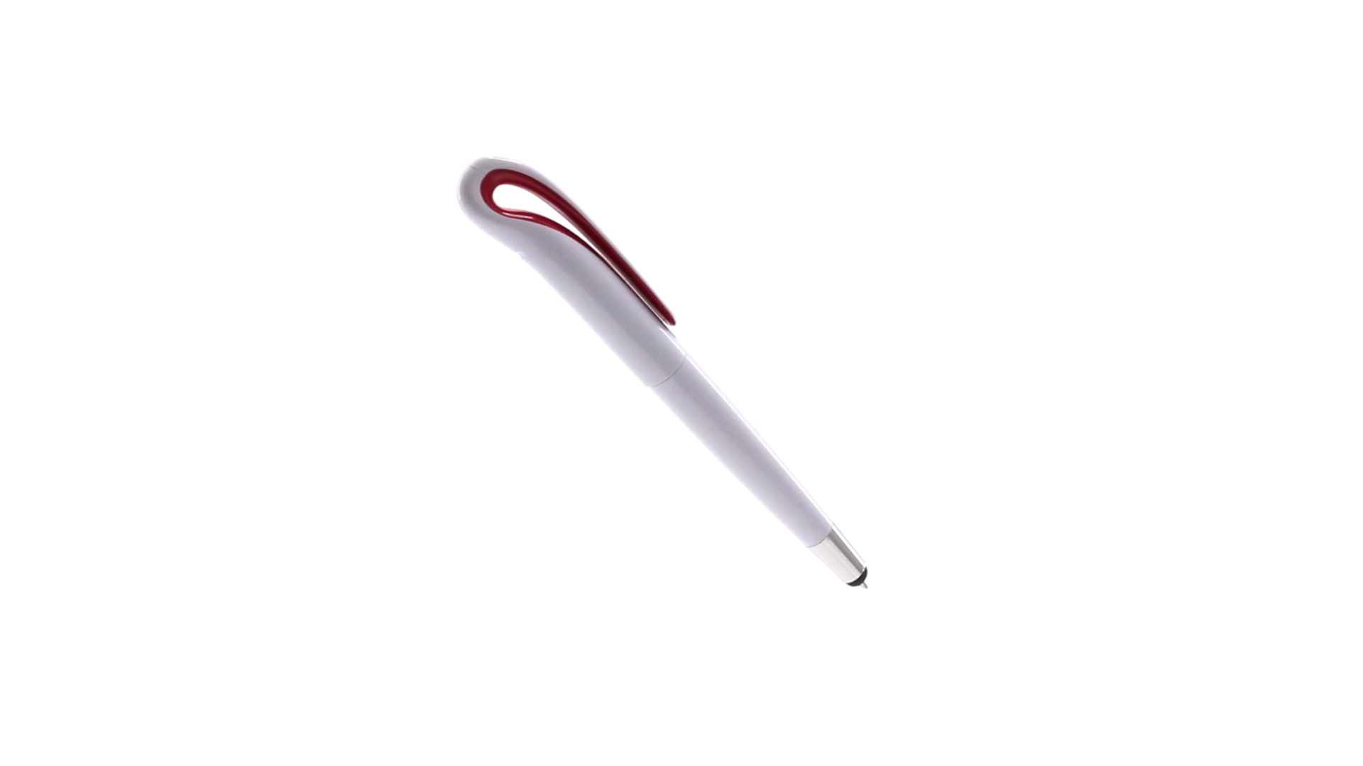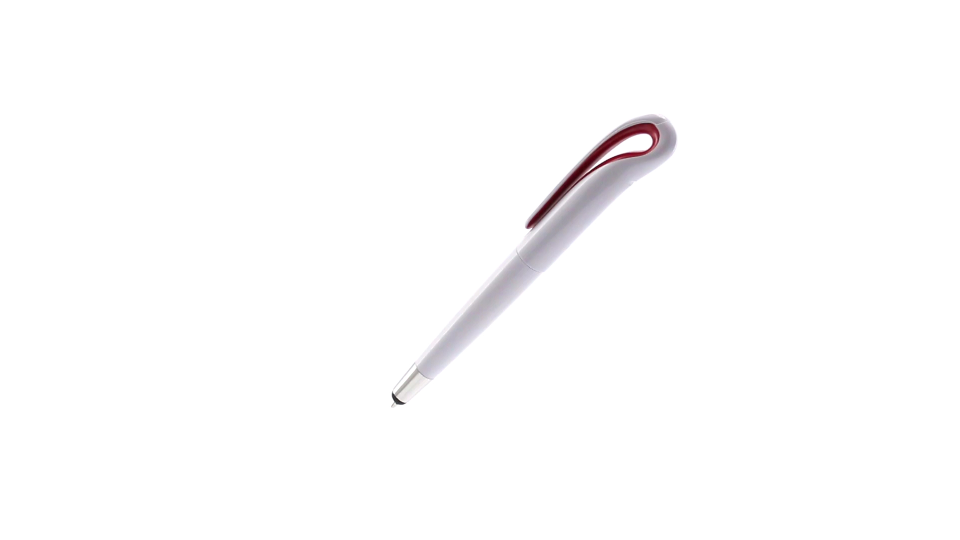 Dreh-Kugelschreiber mit Stylus und auffälligem, zweifarbigem Design. Mit Schaft in solidem, glänzendem Weiss mit Kontrastdetails in lebendigen Farben und originellem geschwungenem Clip in zwei Farben. Blaue Tinte.