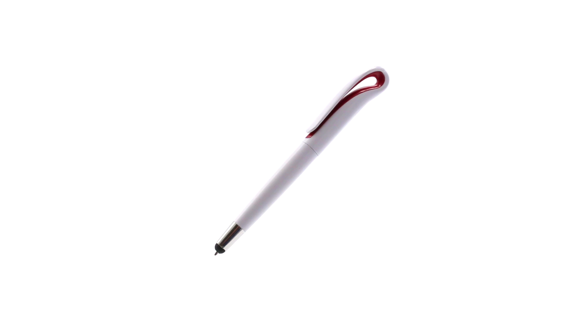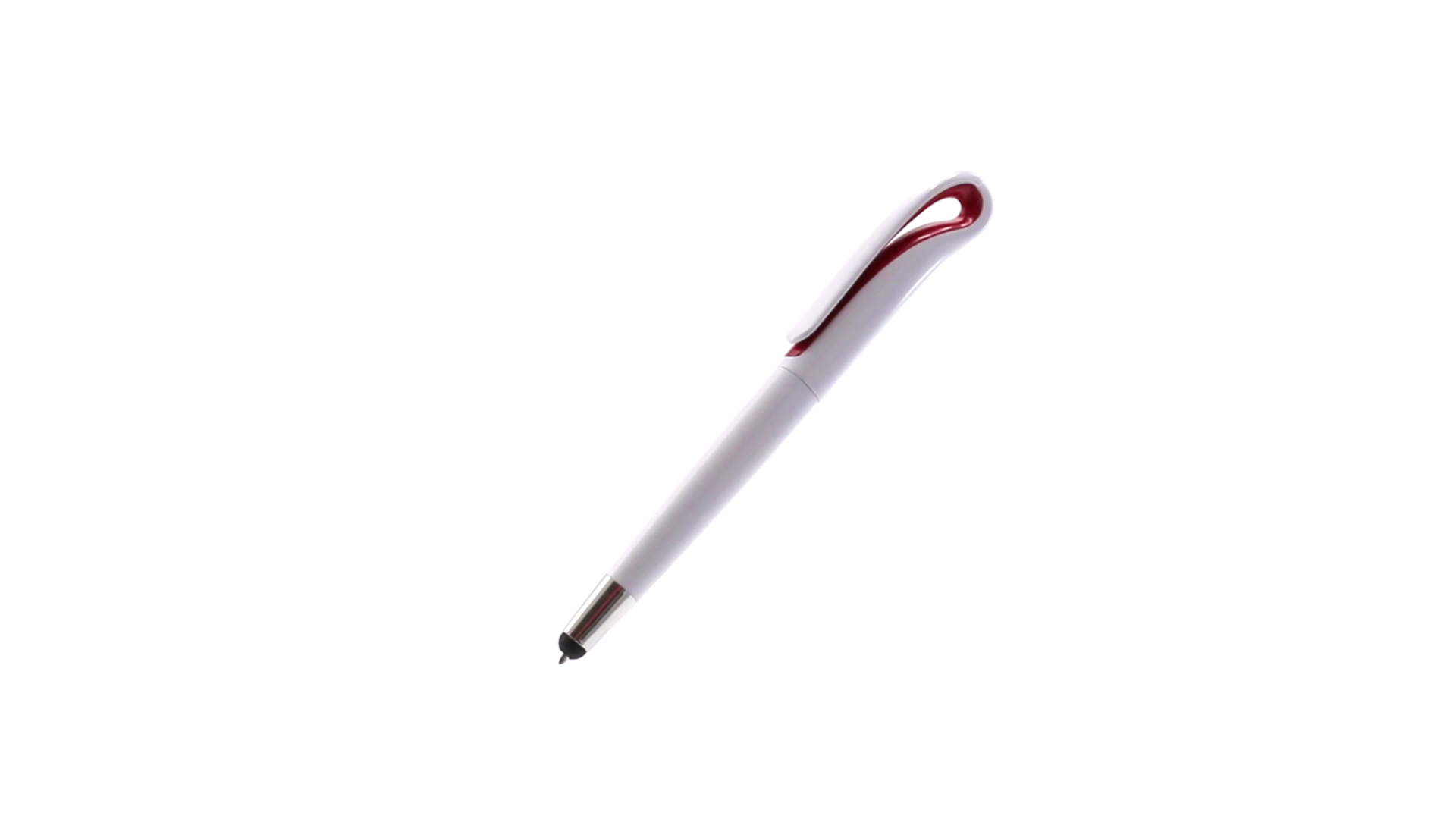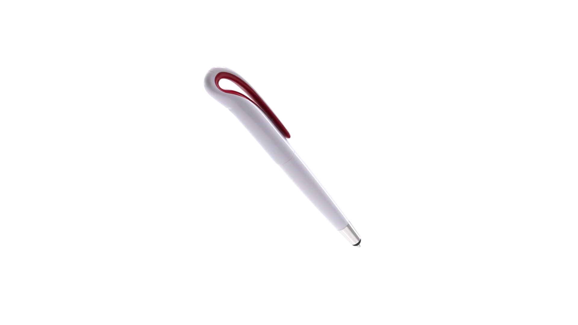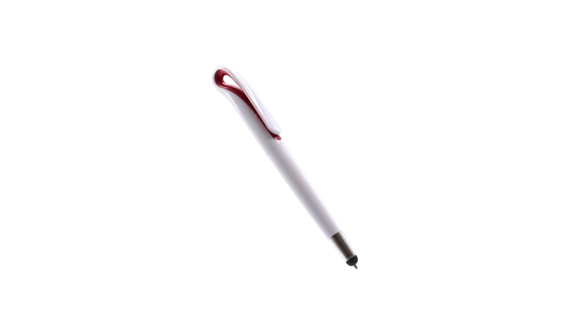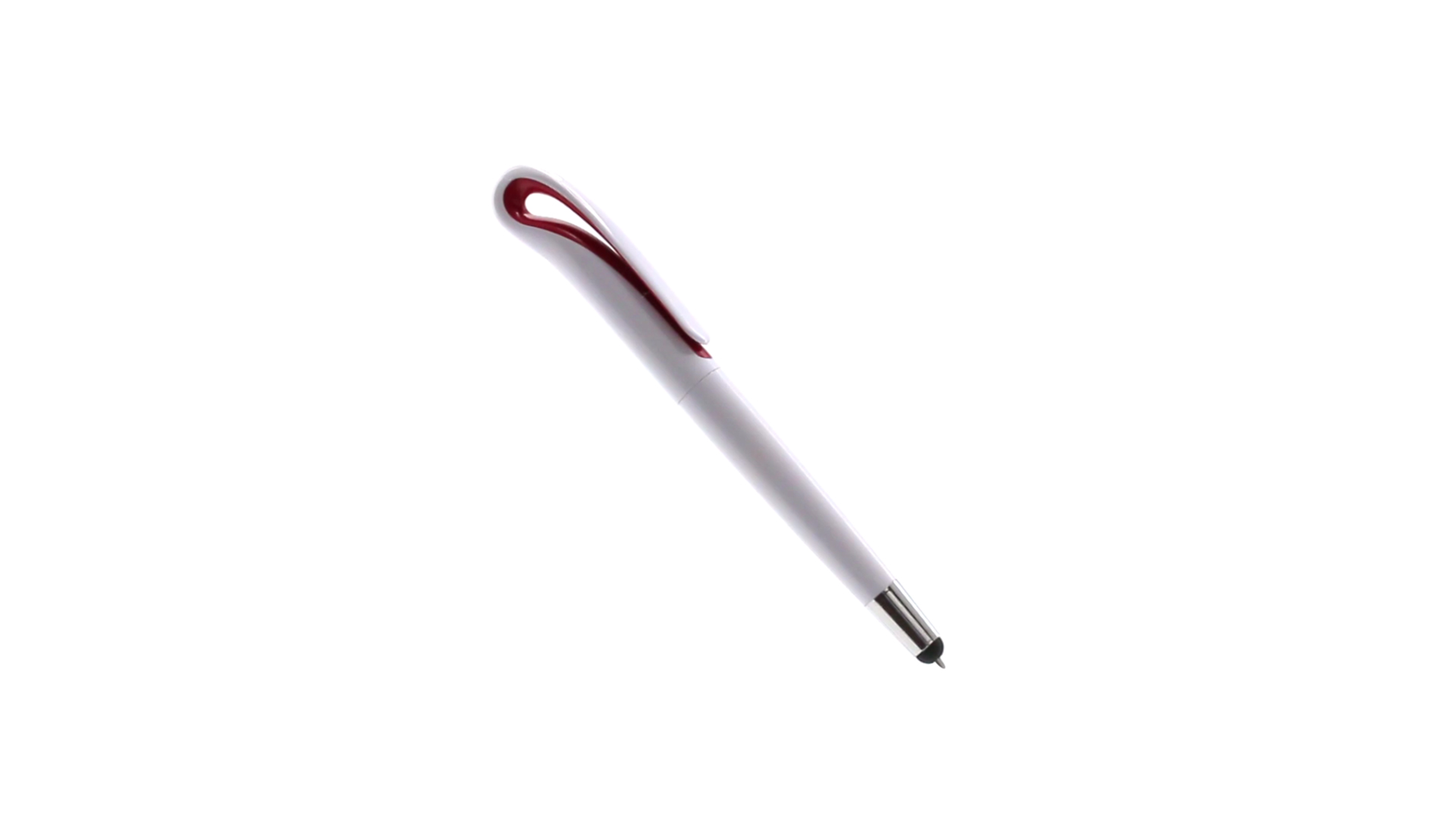 Dreh-Kugelschreiber mit Stylus und auffälligem, zweifarbigem Design. Mit Schaft in solidem, glänzendem Weiss mit Kontrastdetails in lebendigen Farben und originellem geschwungenem Clip in zwei Farben. Blaue Tinte.