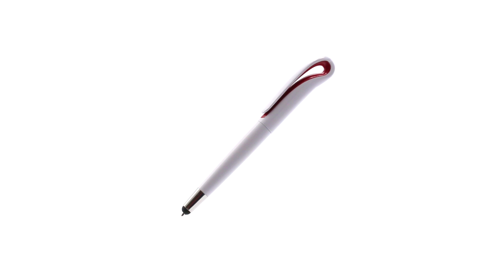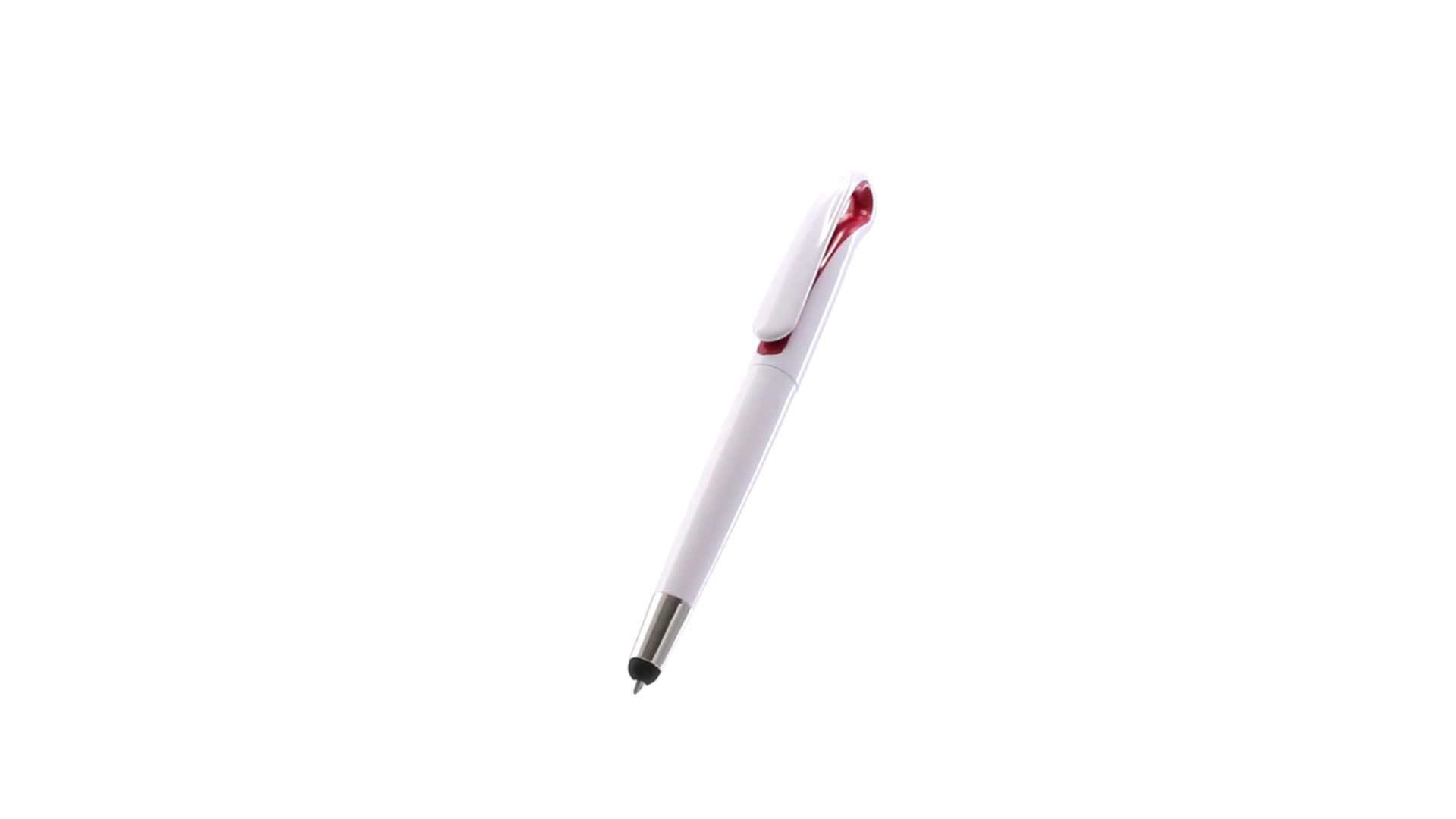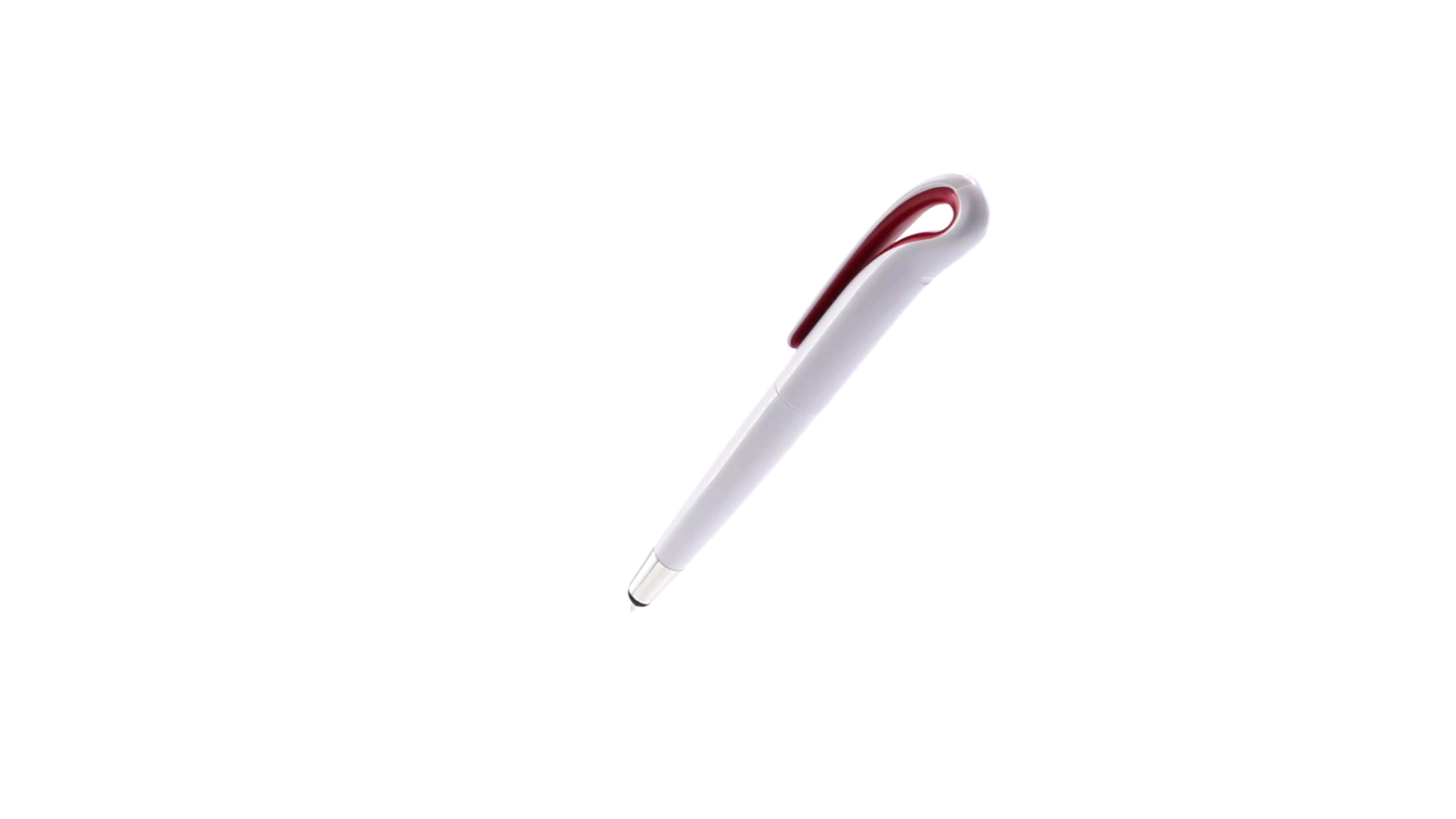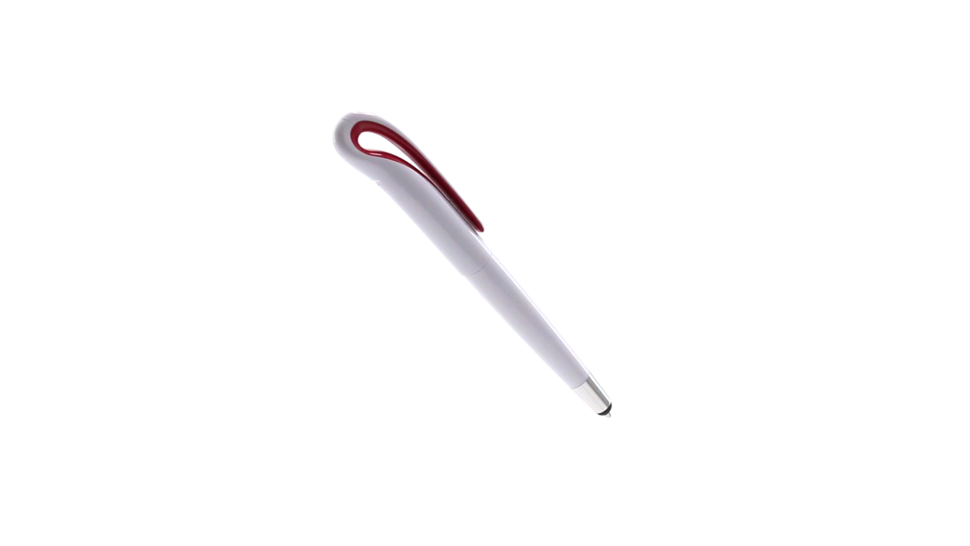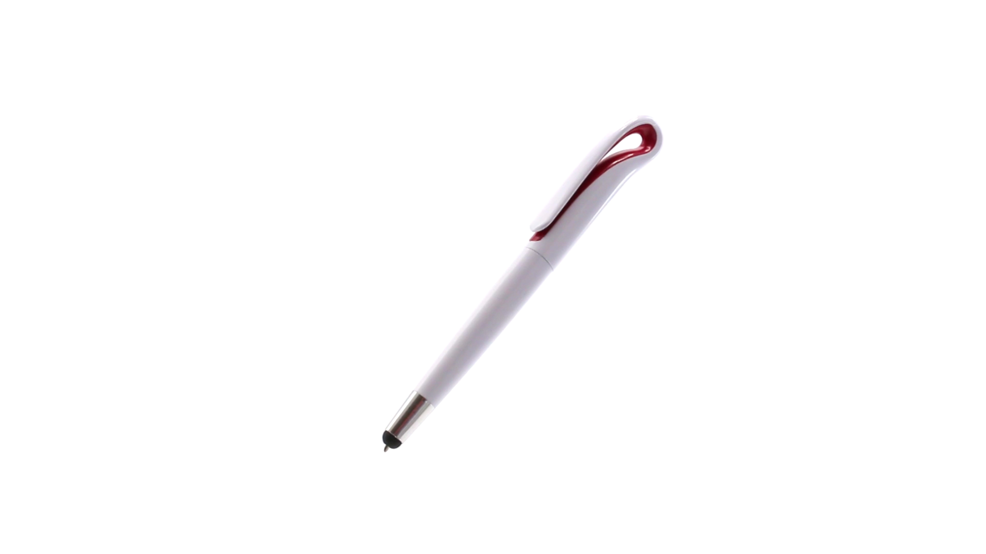 Dreh-Kugelschreiber mit Stylus und auffälligem, zweifarbigem Design. Mit Schaft in solidem, glänzendem Weiss mit Kontrastdetails in lebendigen Farben und originellem geschwungenem Clip in zwei Farben. Blaue Tinte.