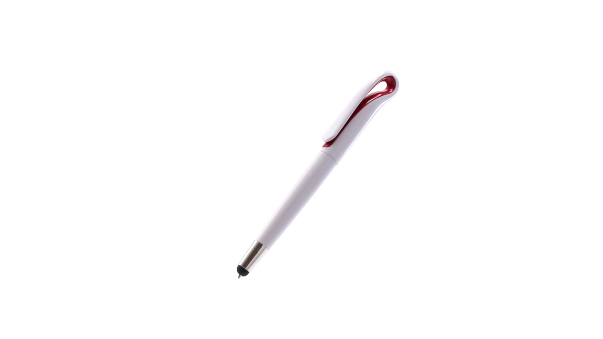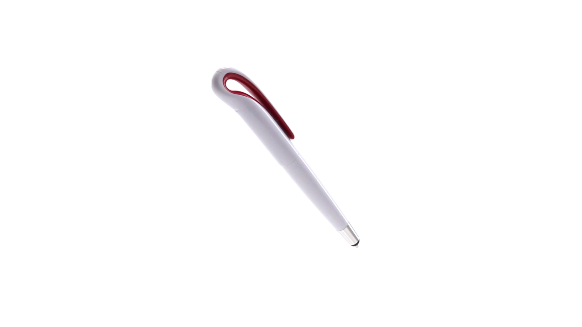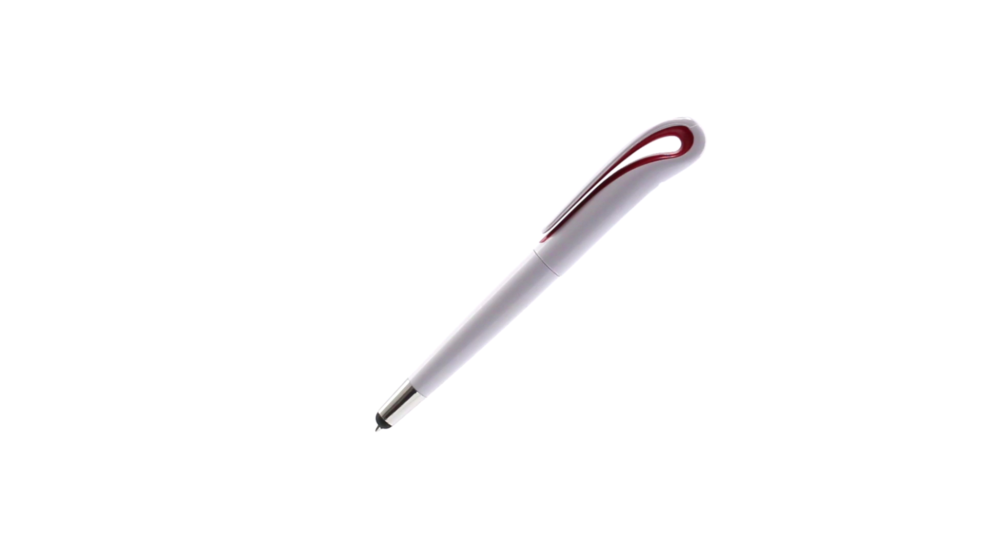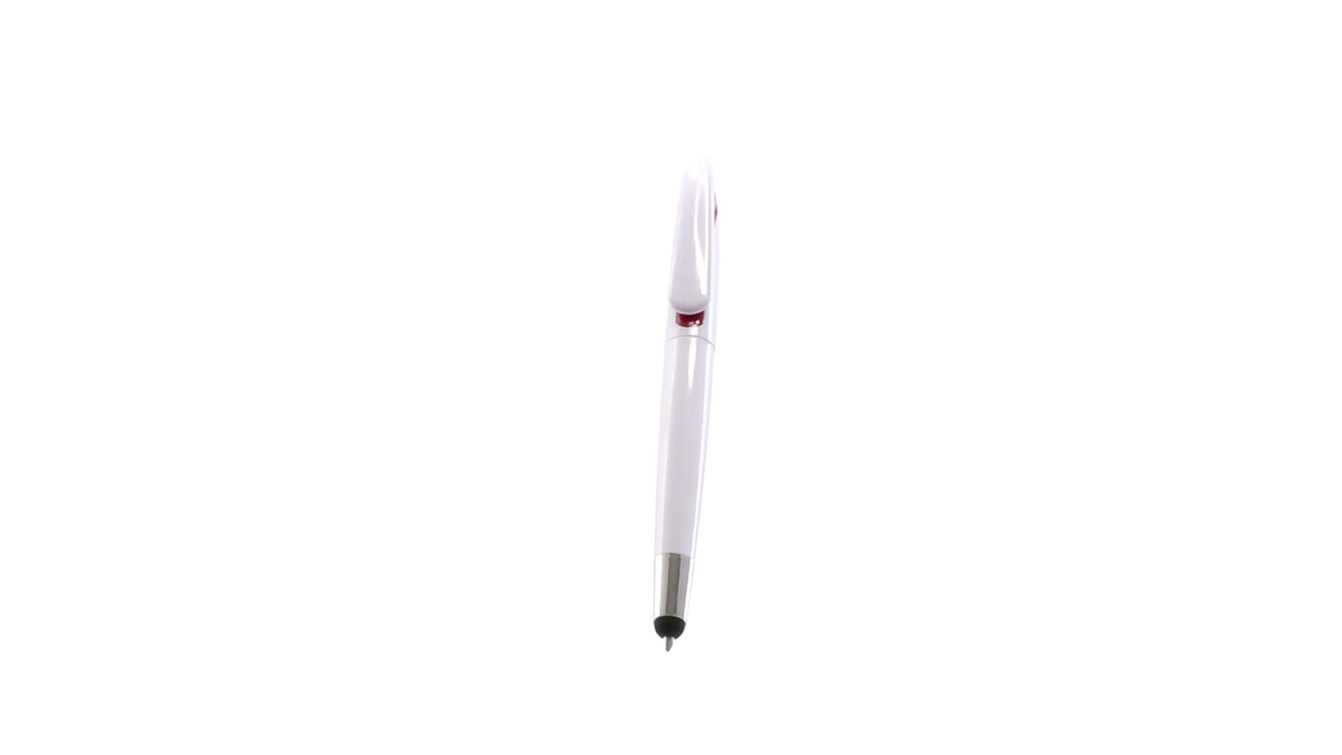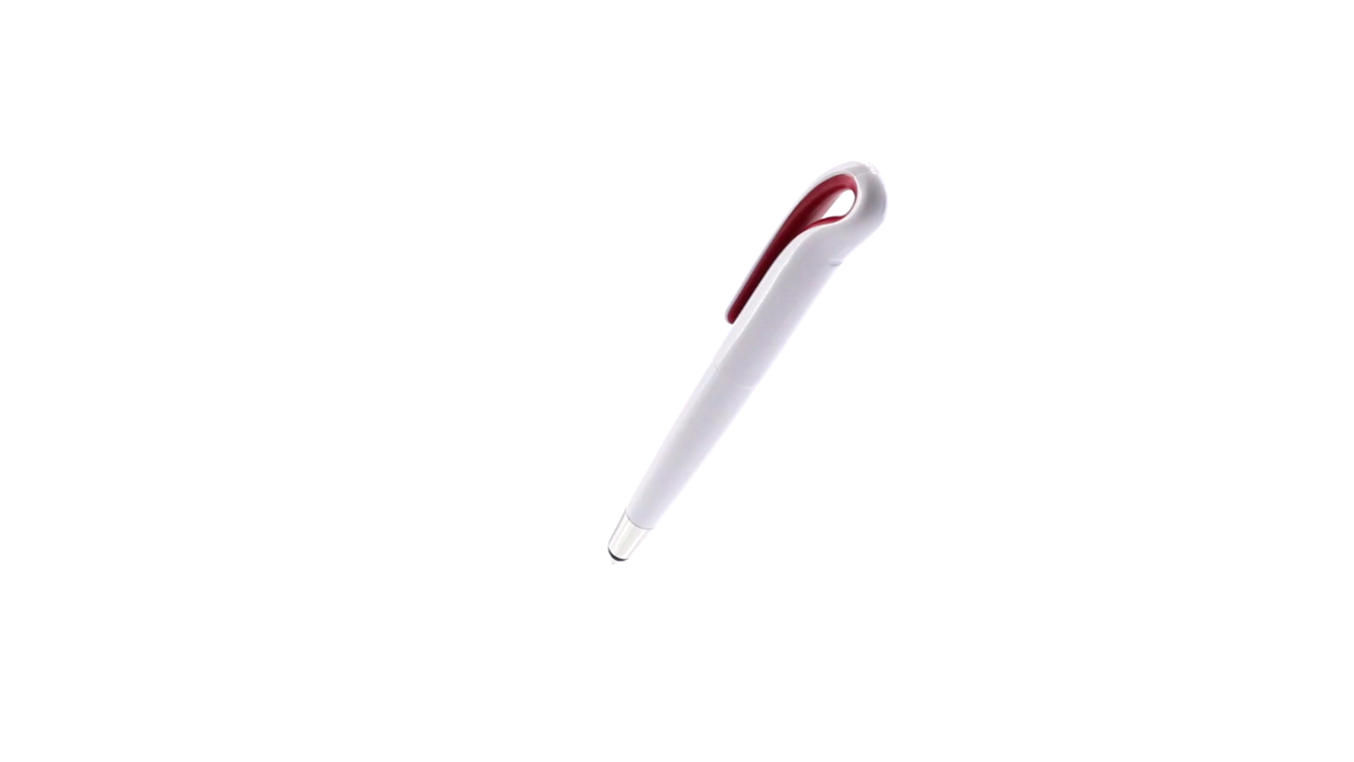 Dreh-Kugelschreiber mit Stylus und auffälligem, zweifarbigem Design. Mit Schaft in solidem, glänzendem Weiss mit Kontrastdetails in lebendigen Farben und originellem geschwungenem Clip in zwei Farben. Blaue Tinte.