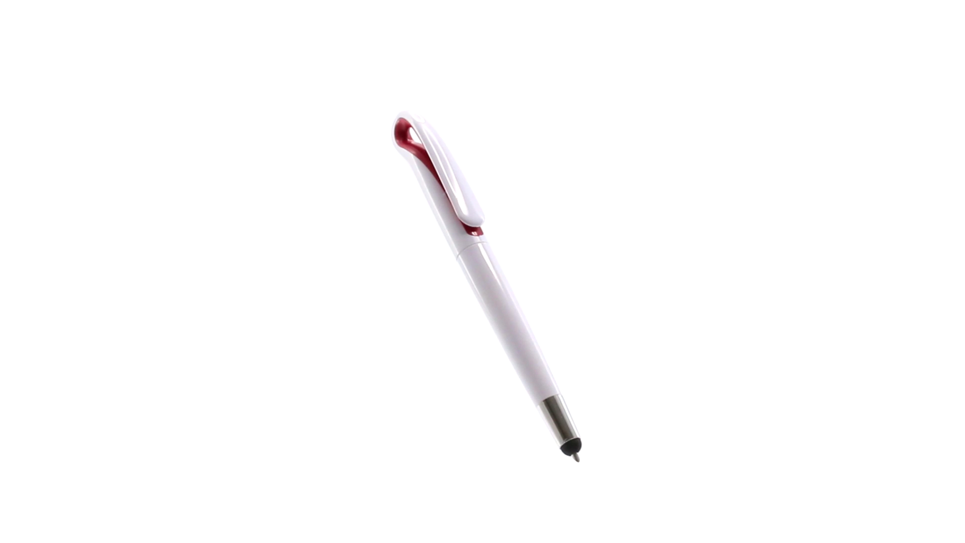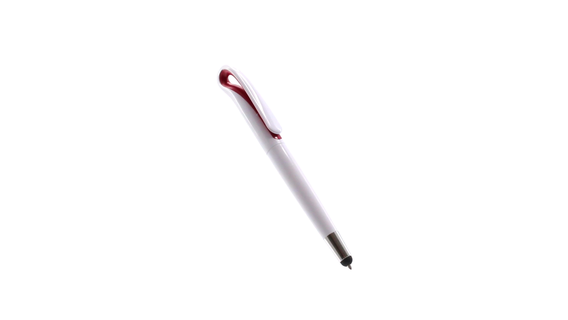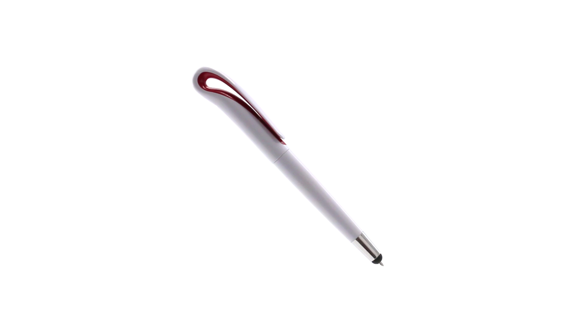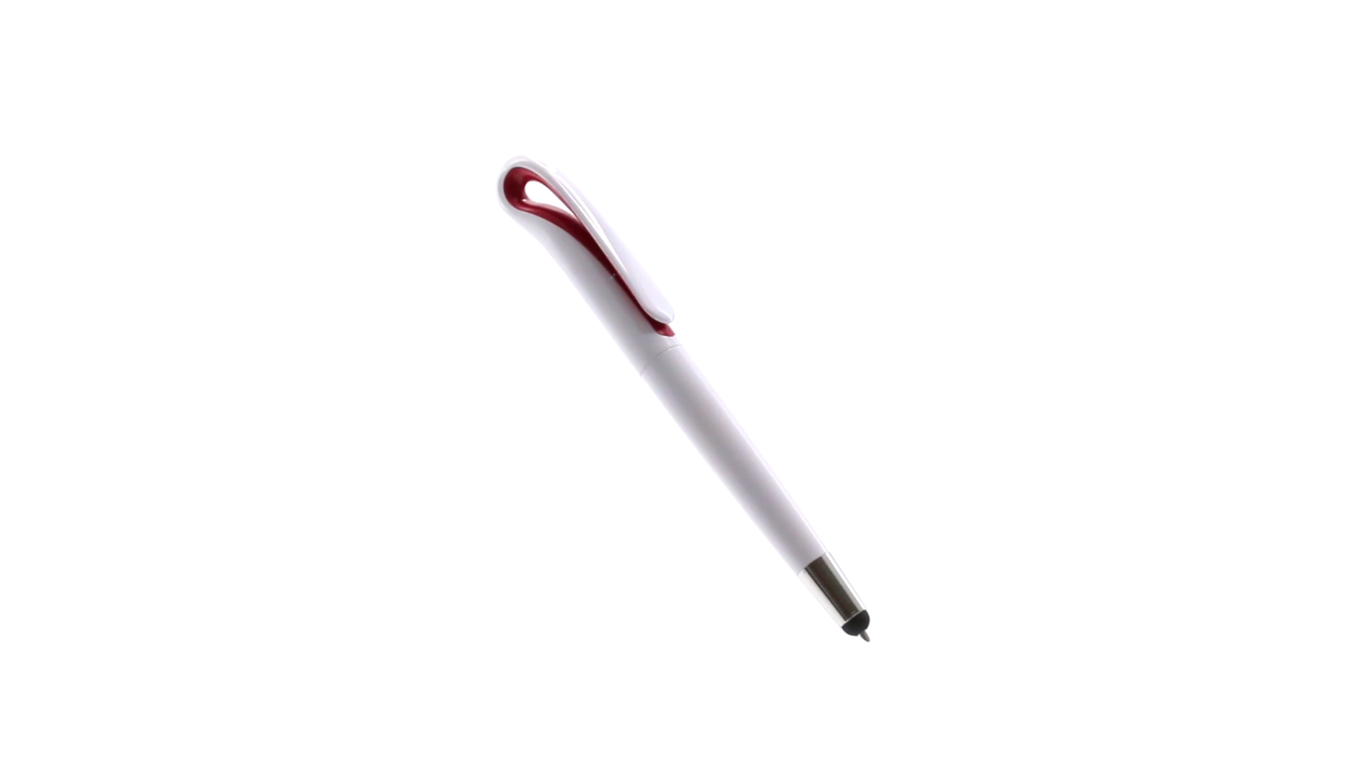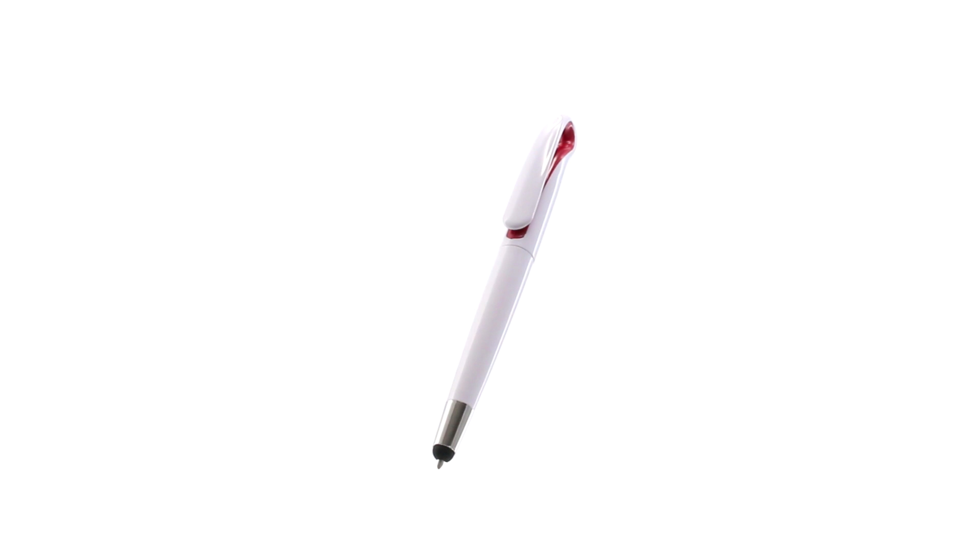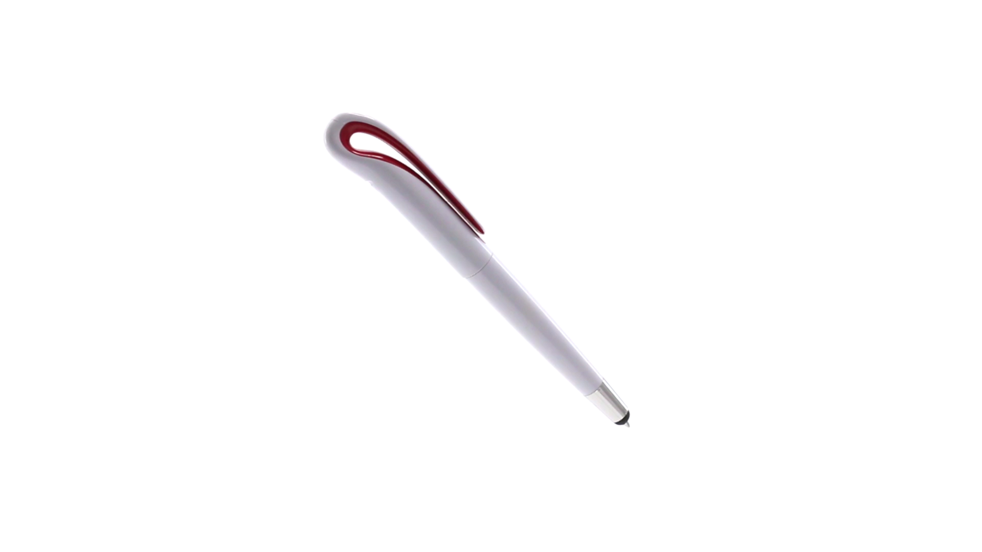 Dreh-Kugelschreiber mit Stylus und auffälligem, zweifarbigem Design. Mit Schaft in solidem, glänzendem Weiss mit Kontrastdetails in lebendigen Farben und originellem geschwungenem Clip in zwei Farben. Blaue Tinte.