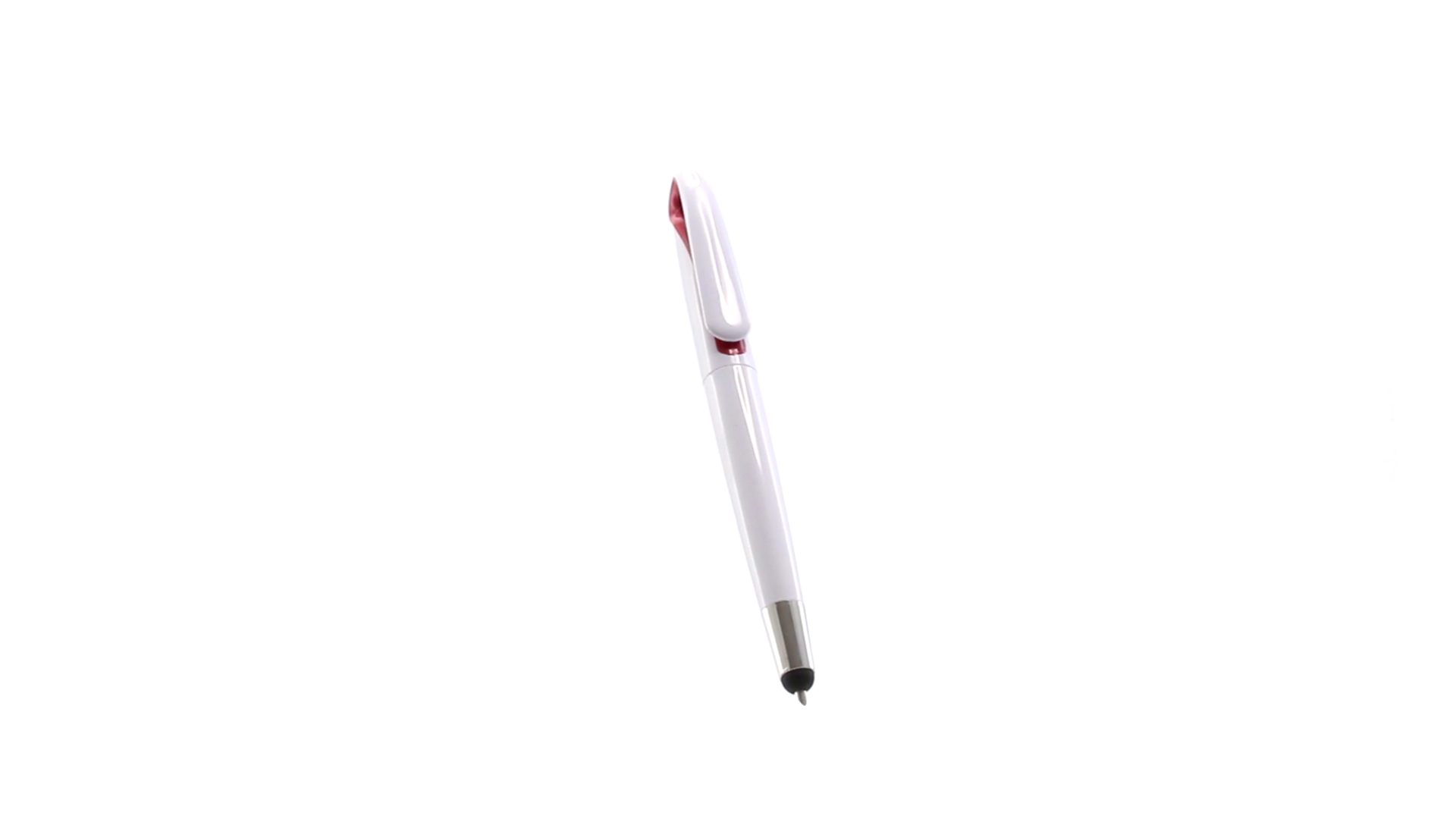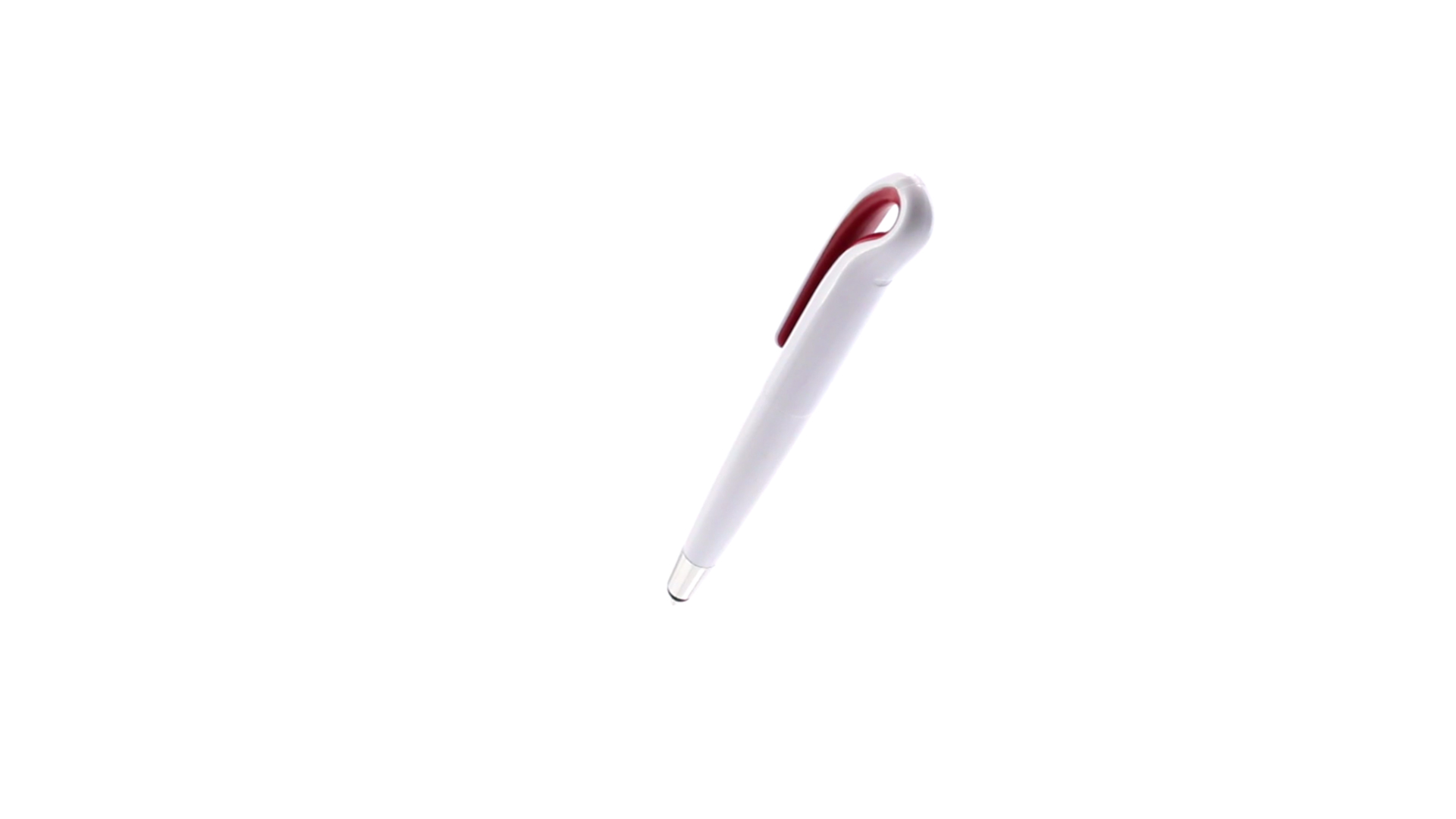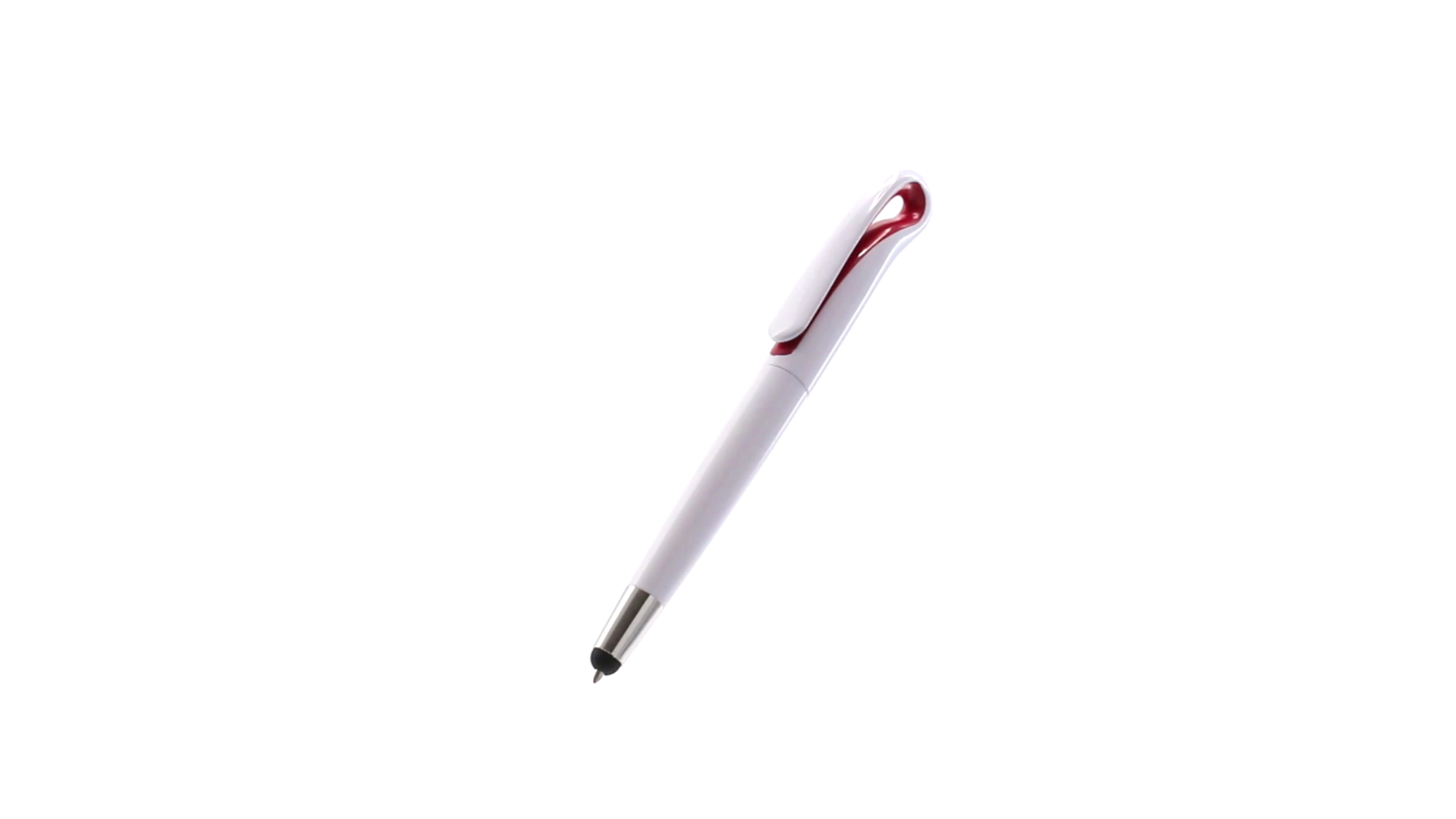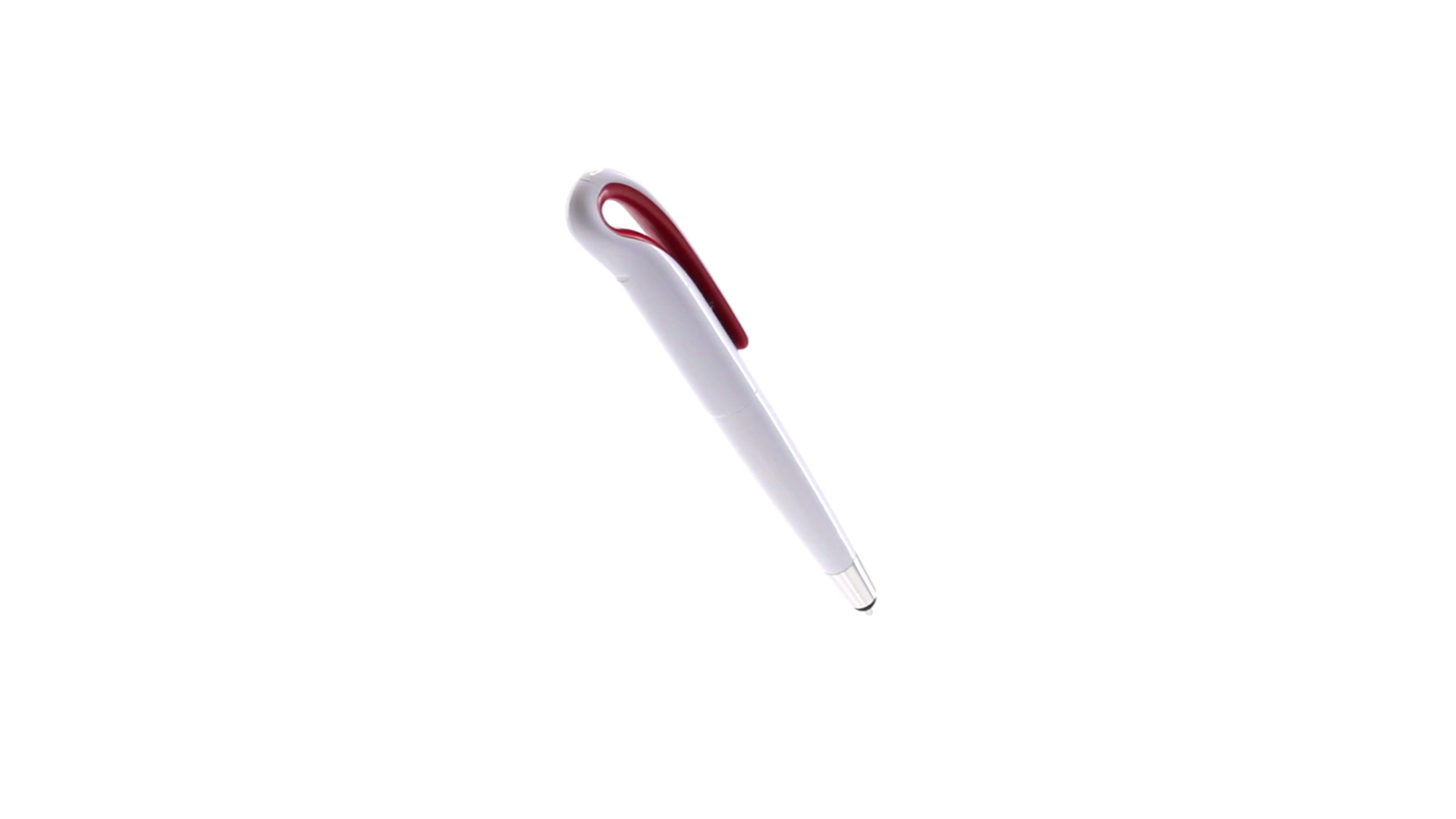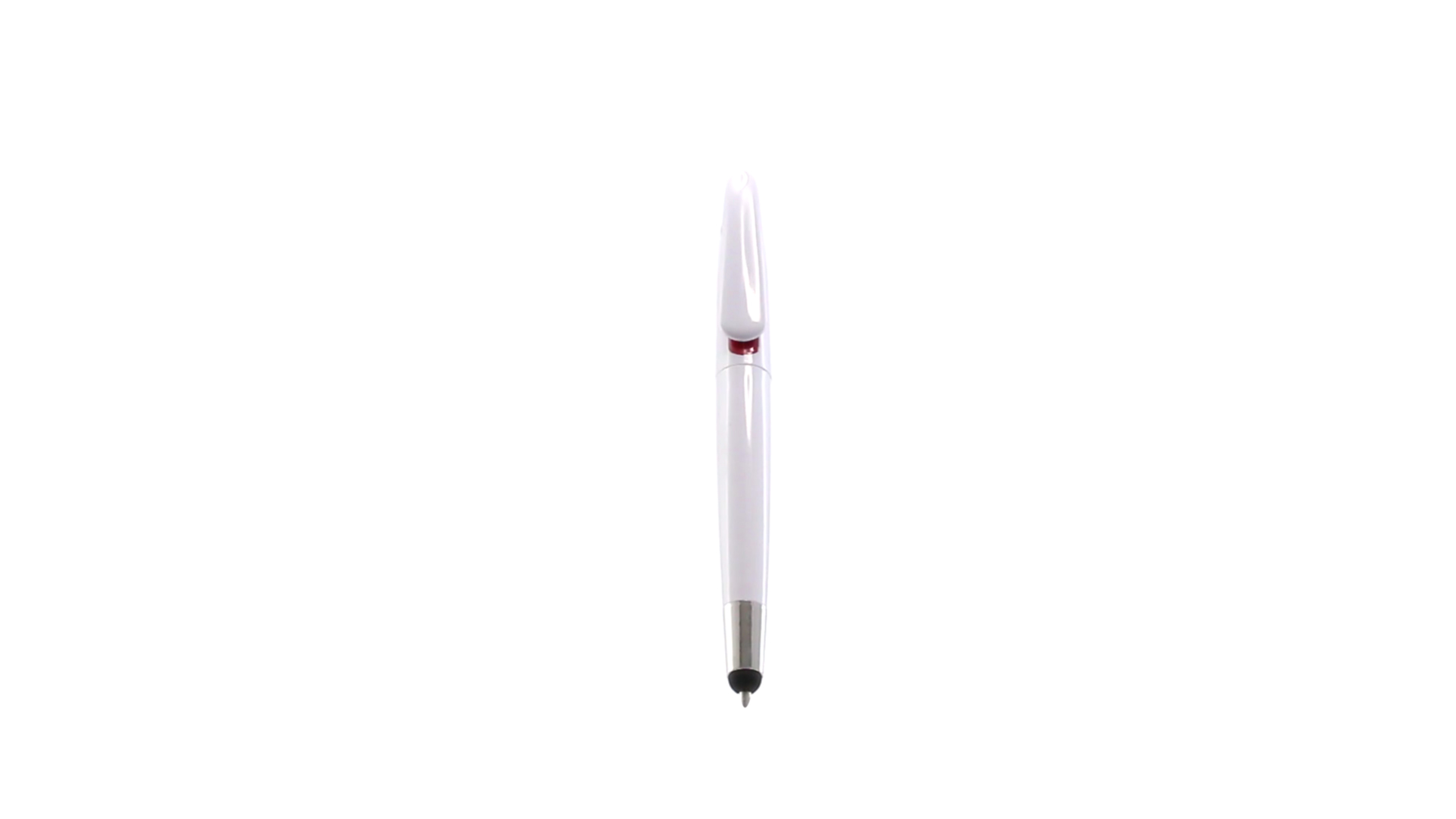 Dreh-Kugelschreiber mit Stylus und auffälligem, zweifarbigem Design. Mit Schaft in solidem, glänzendem Weiss mit Kontrastdetails in lebendigen Farben und originellem geschwungenem Clip in zwei Farben. Blaue Tinte.
