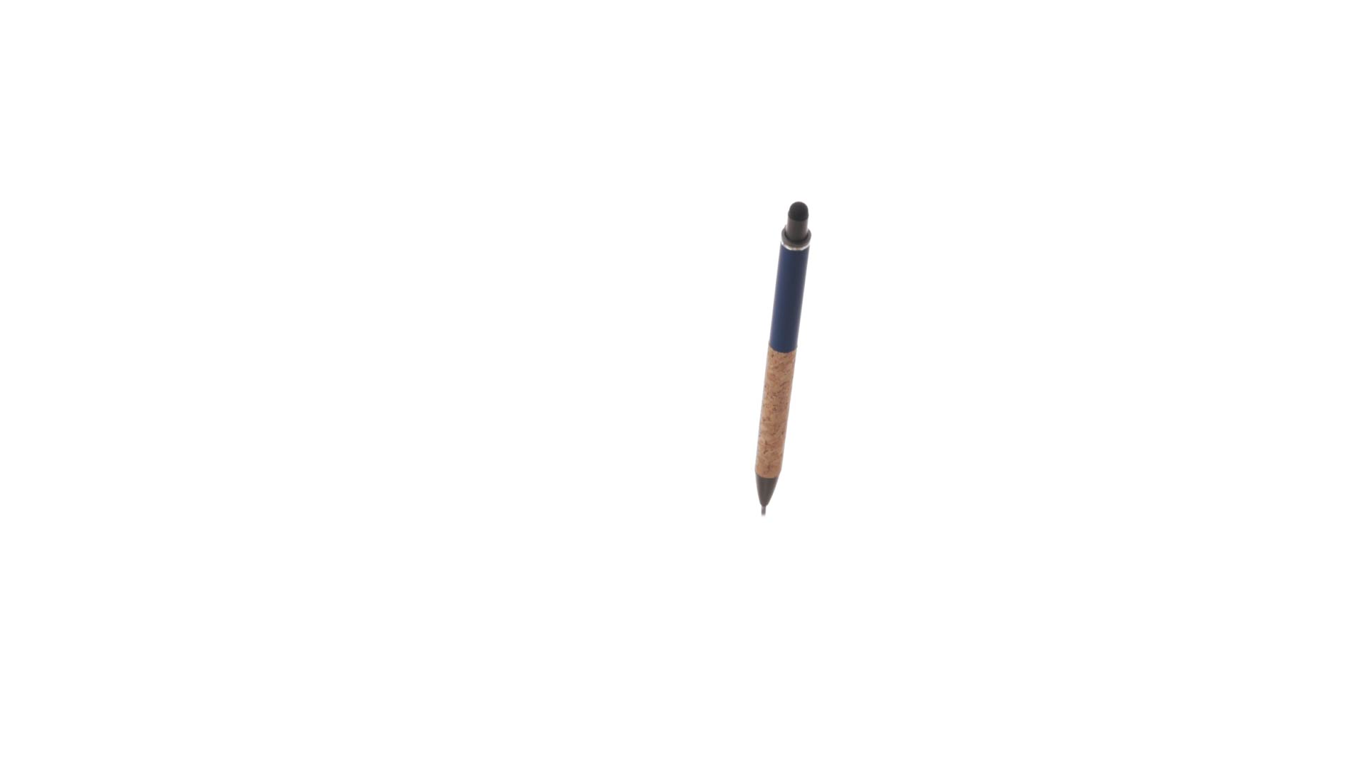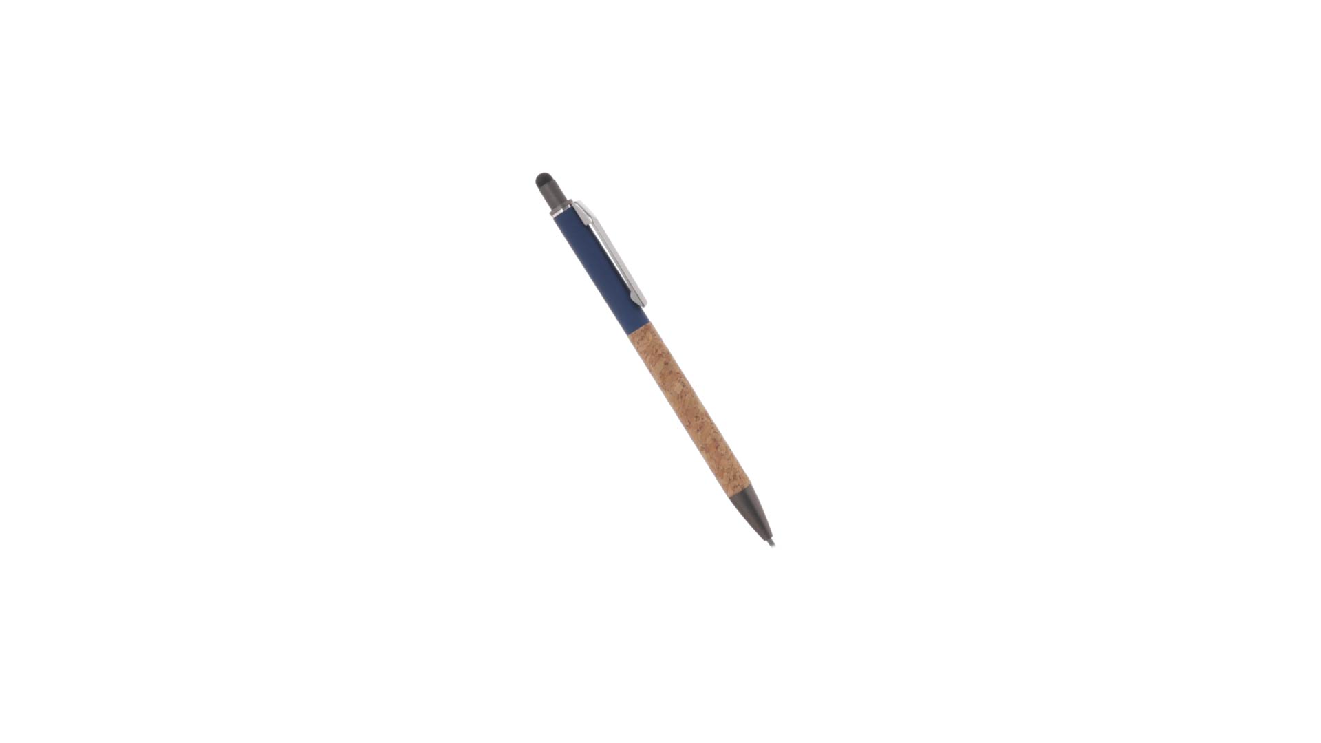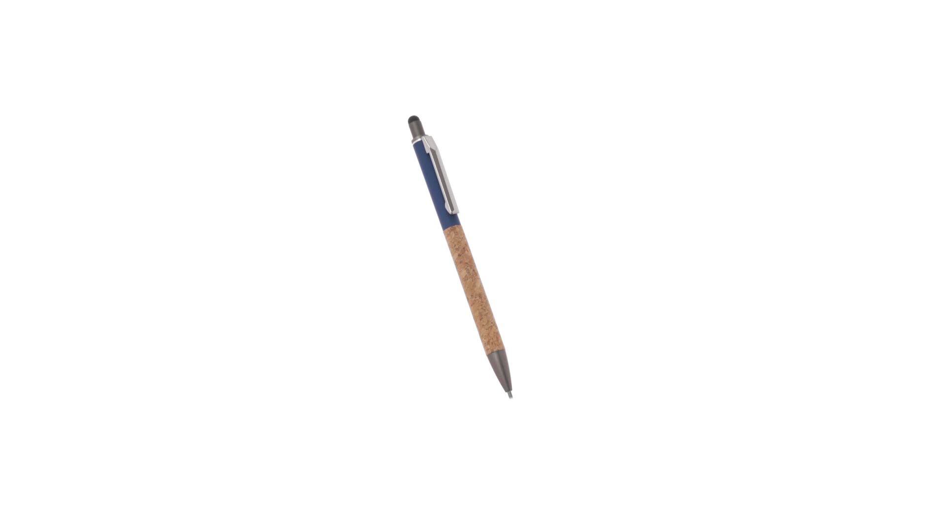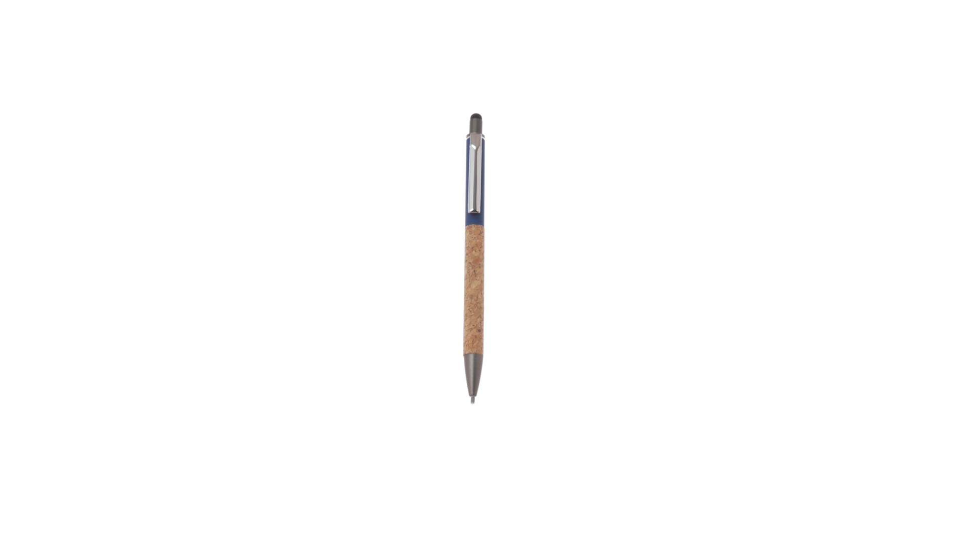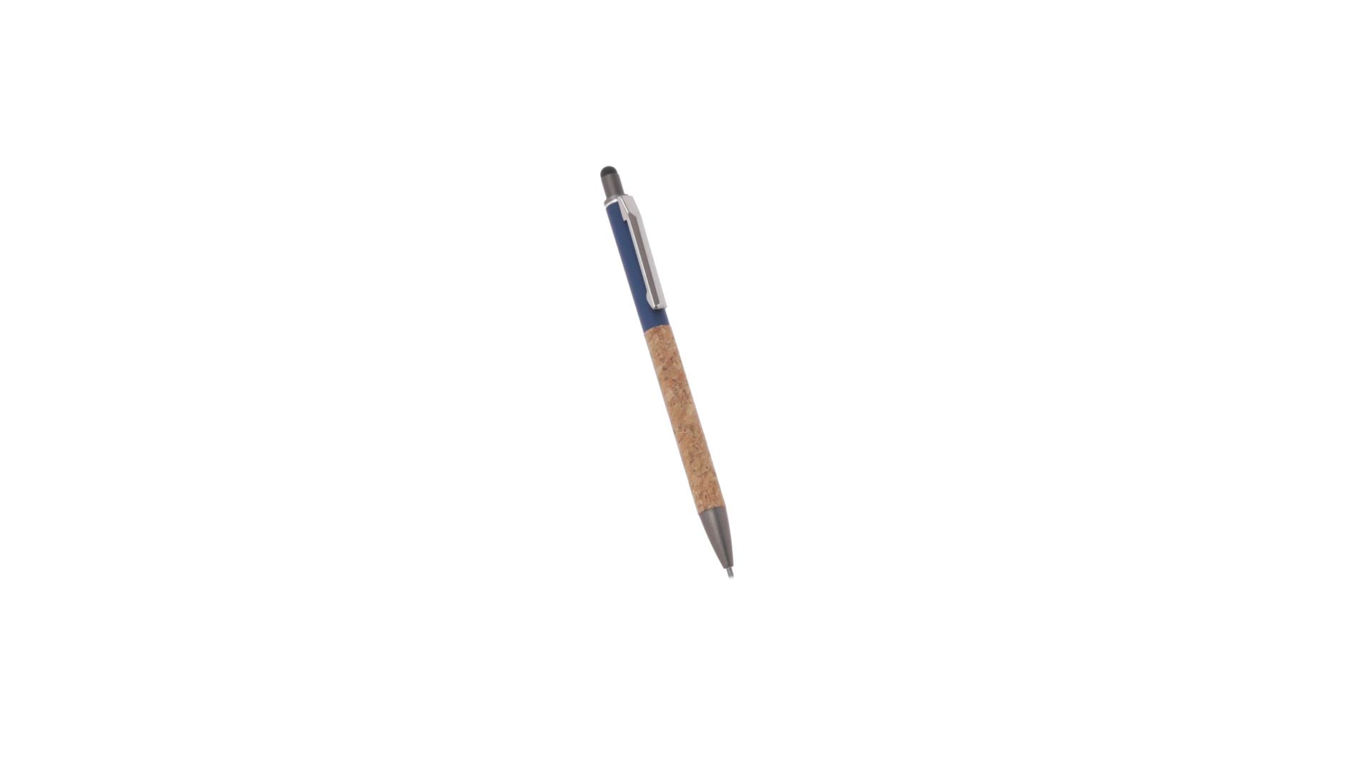 Stilvoller Kugelschreiber aus Kork und Aluminium, mit Druckknopfmechanismus. Robuster, mattierter Aluminiumschaft und Korkgriff mit schwarzem Zeiger oben und in grauer Farbe. Metallclip und präsentiert in einer einzelnen recycelten Tasche. Hergestellt aus pflanzlichen Bestandteilen, um die Verwendung natürlicher Rohstoffe zu fördern und Schadstoffemissionen zu reduzieren.