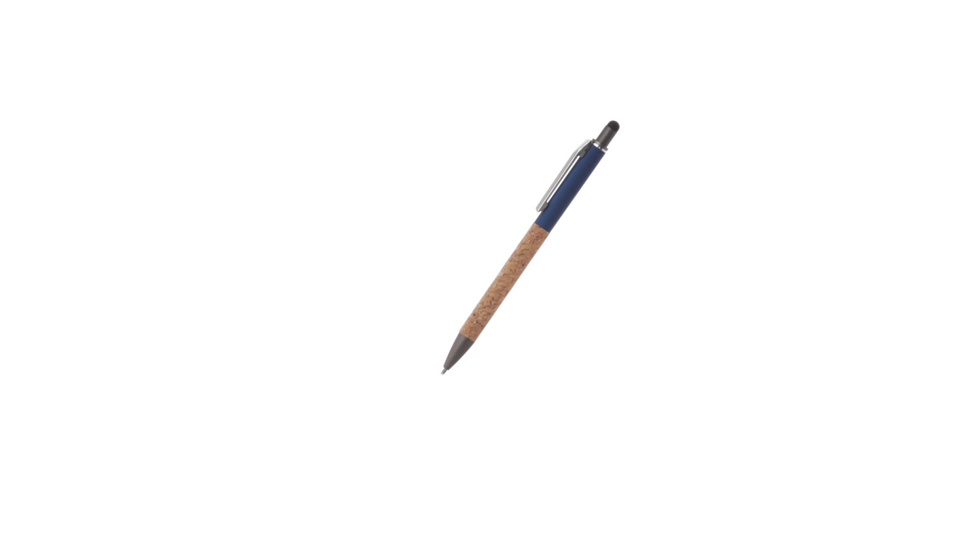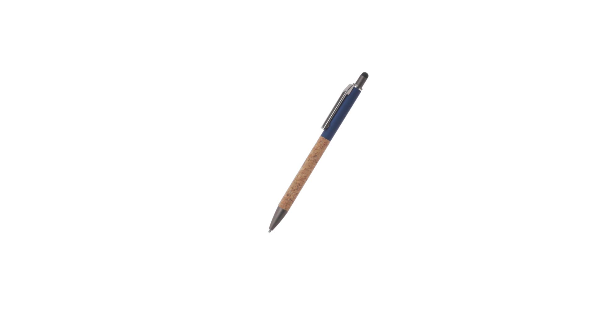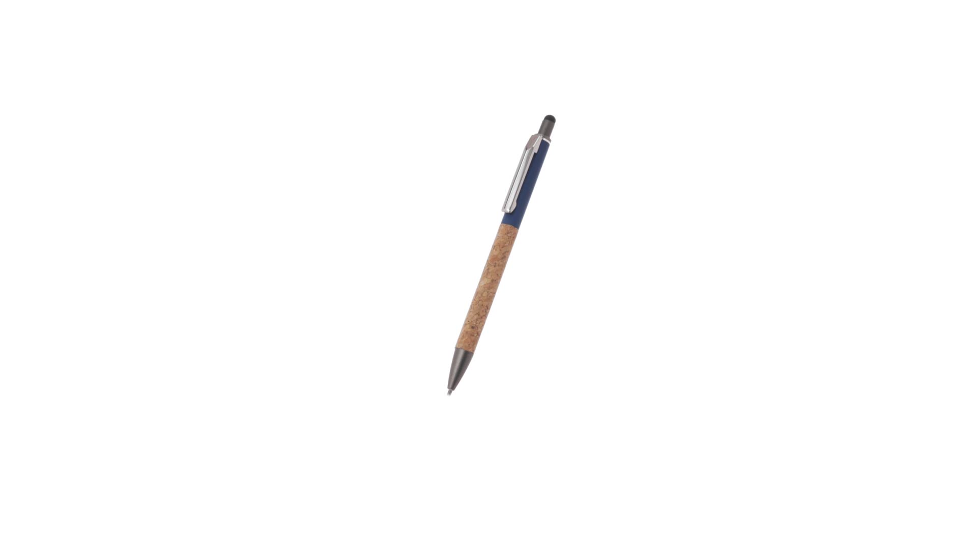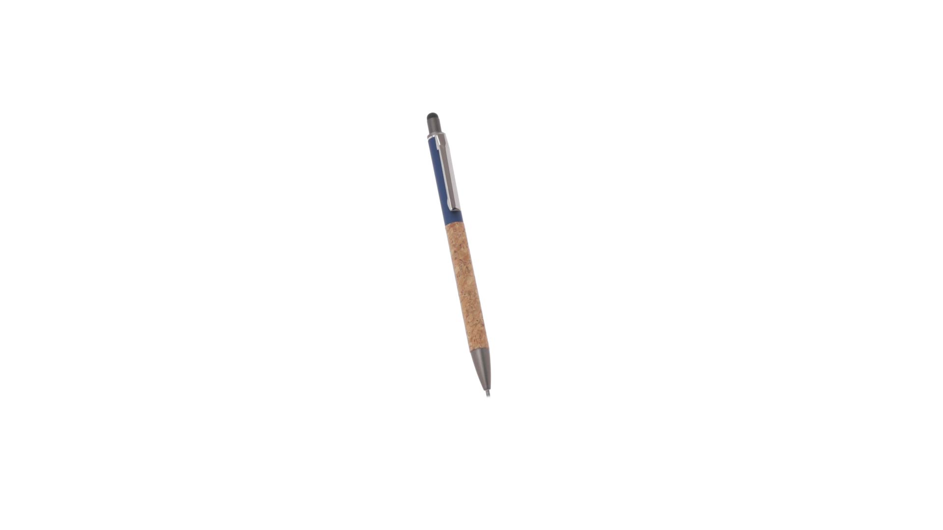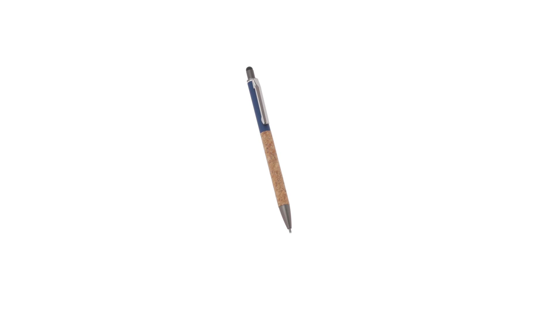 Stilvoller Kugelschreiber aus Kork und Aluminium, mit Druckknopfmechanismus. Robuster, mattierter Aluminiumschaft und Korkgriff mit schwarzem Zeiger oben und in grauer Farbe. Metallclip und präsentiert in einer einzelnen recycelten Tasche. Hergestellt aus pflanzlichen Bestandteilen, um die Verwendung natürlicher Rohstoffe zu fördern und Schadstoffemissionen zu reduzieren.