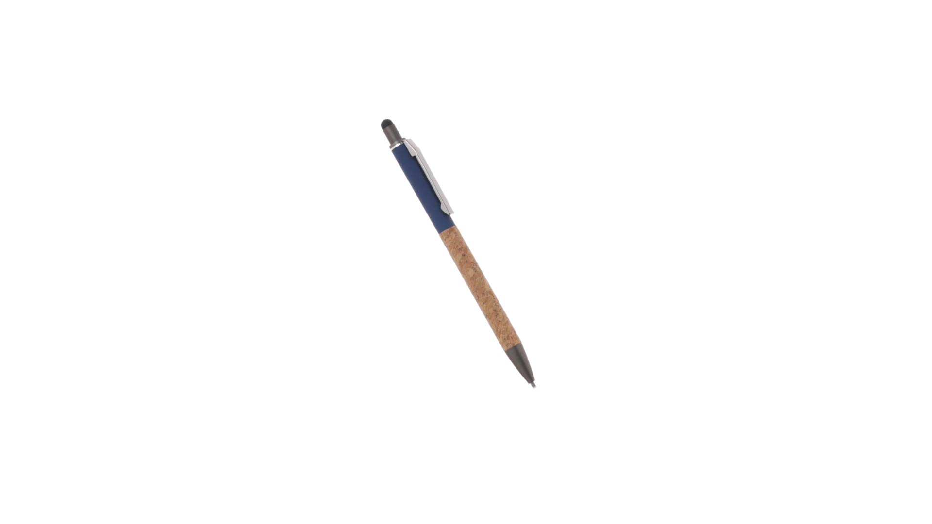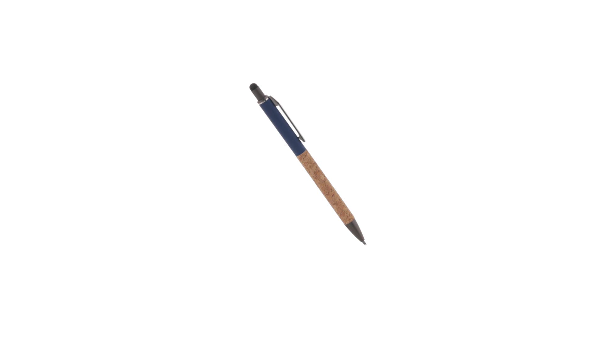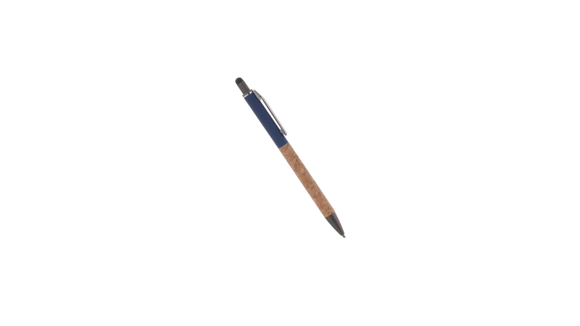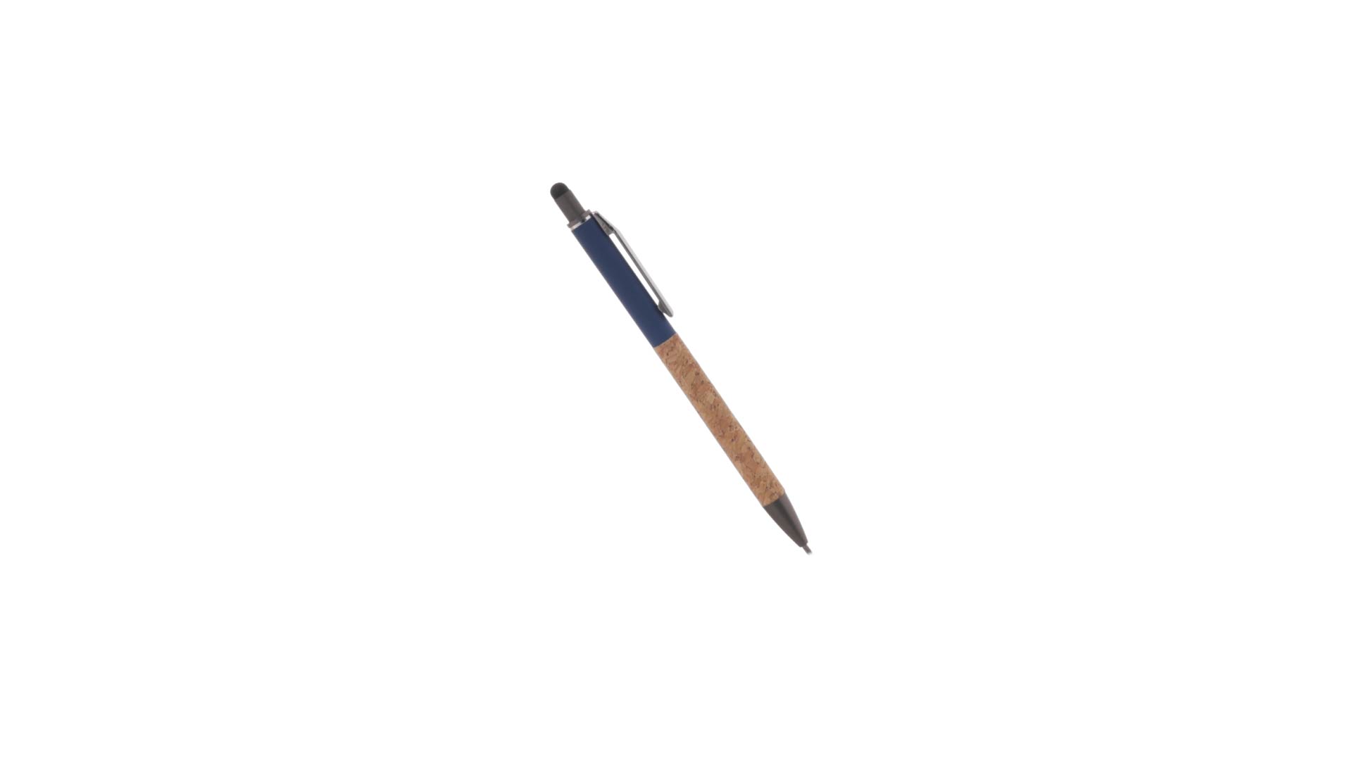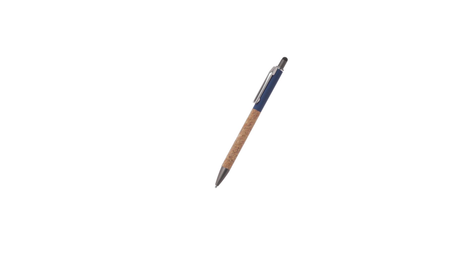 Stilvoller Kugelschreiber aus Kork und Aluminium, mit Druckknopfmechanismus. Robuster, mattierter Aluminiumschaft und Korkgriff mit schwarzem Zeiger oben und in grauer Farbe. Metallclip und präsentiert in einer einzelnen recycelten Tasche. Hergestellt aus pflanzlichen Bestandteilen, um die Verwendung natürlicher Rohstoffe zu fördern und Schadstoffemissionen zu reduzieren.