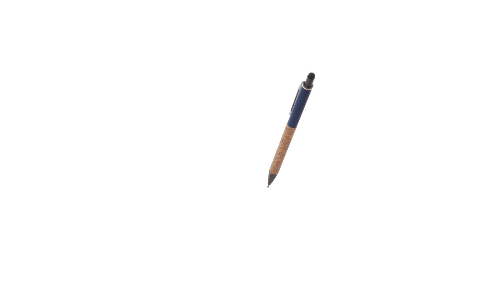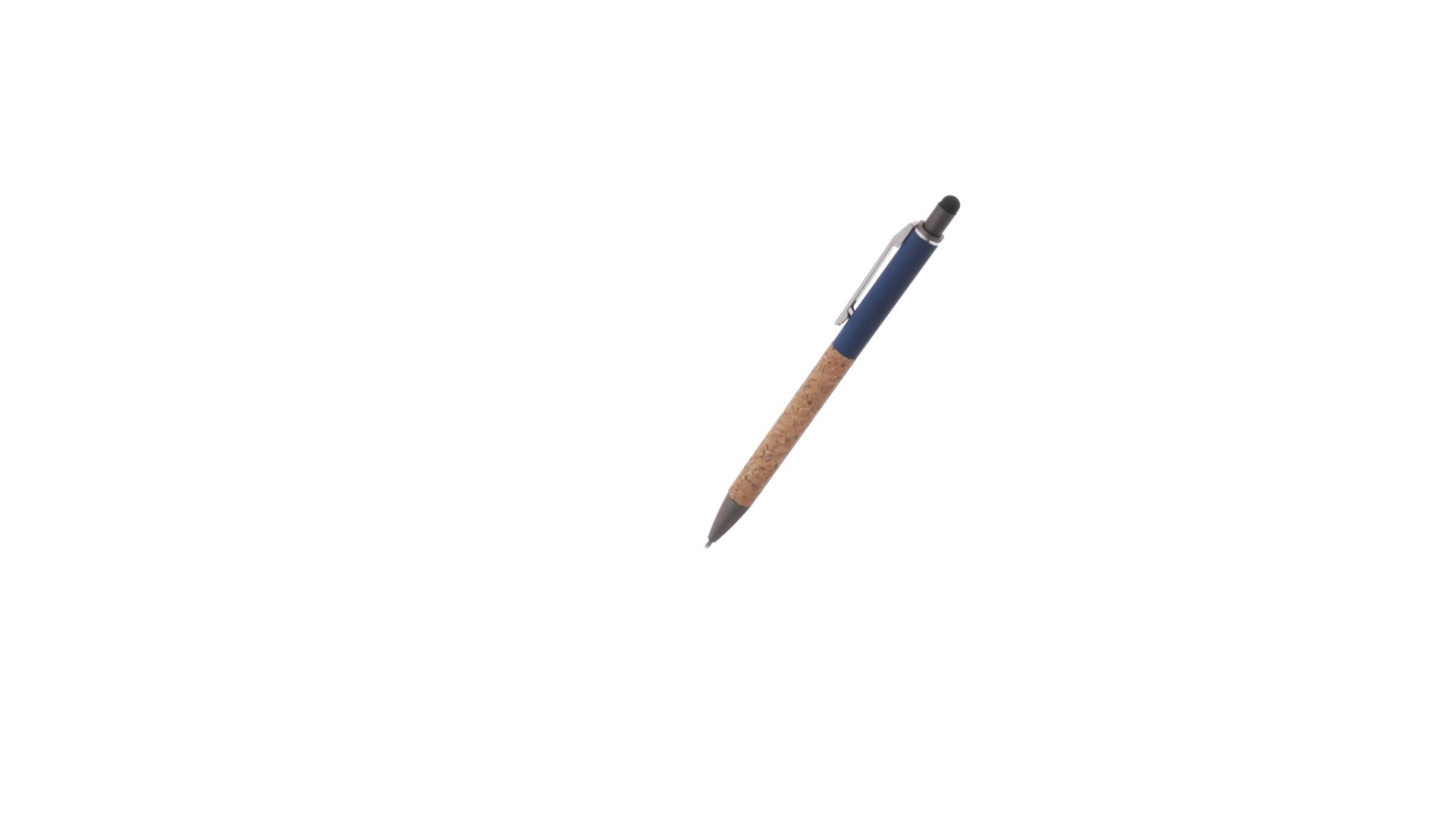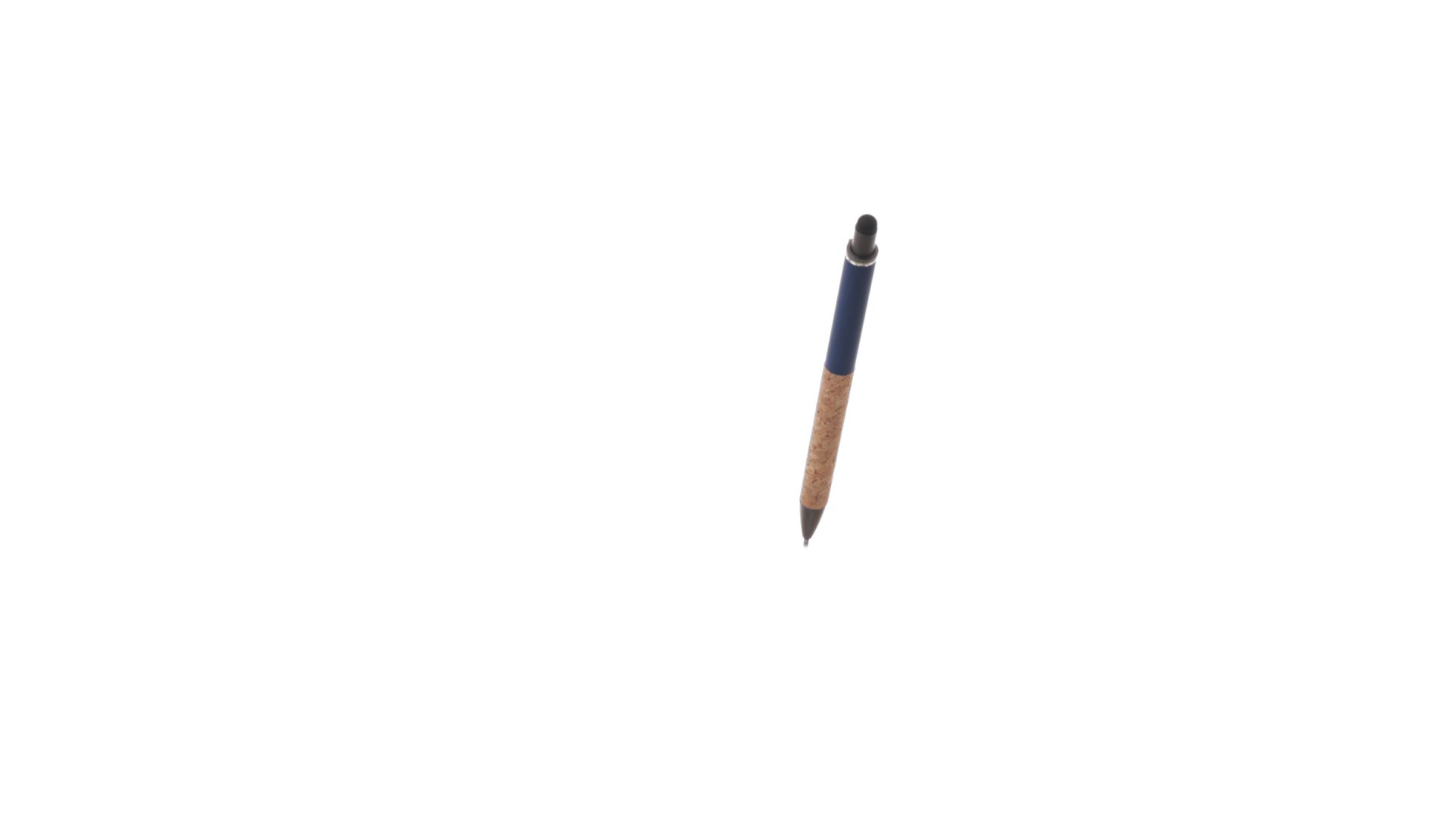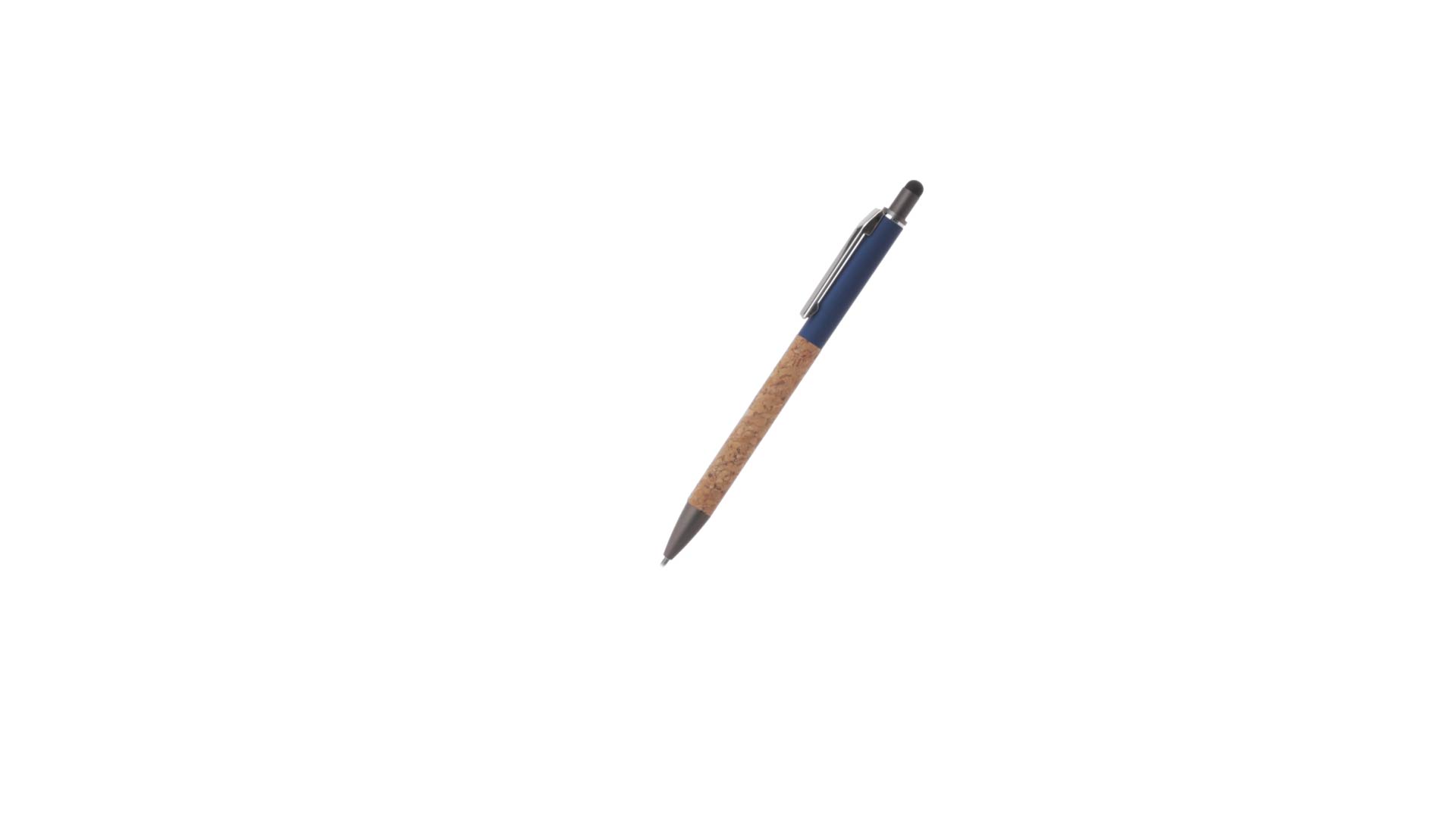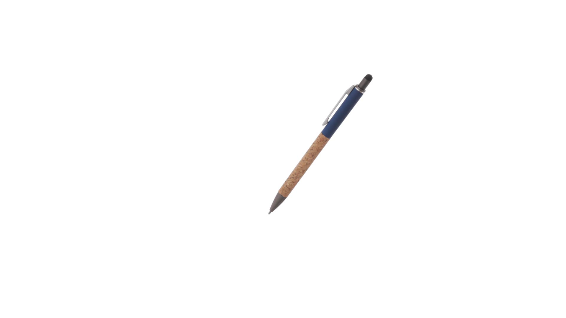 Stilvoller Kugelschreiber aus Kork und Aluminium, mit Druckknopfmechanismus. Robuster, mattierter Aluminiumschaft und Korkgriff mit schwarzem Zeiger oben und in grauer Farbe. Metallclip und präsentiert in einer einzelnen recycelten Tasche. Hergestellt aus pflanzlichen Bestandteilen, um die Verwendung natürlicher Rohstoffe zu fördern und Schadstoffemissionen zu reduzieren.