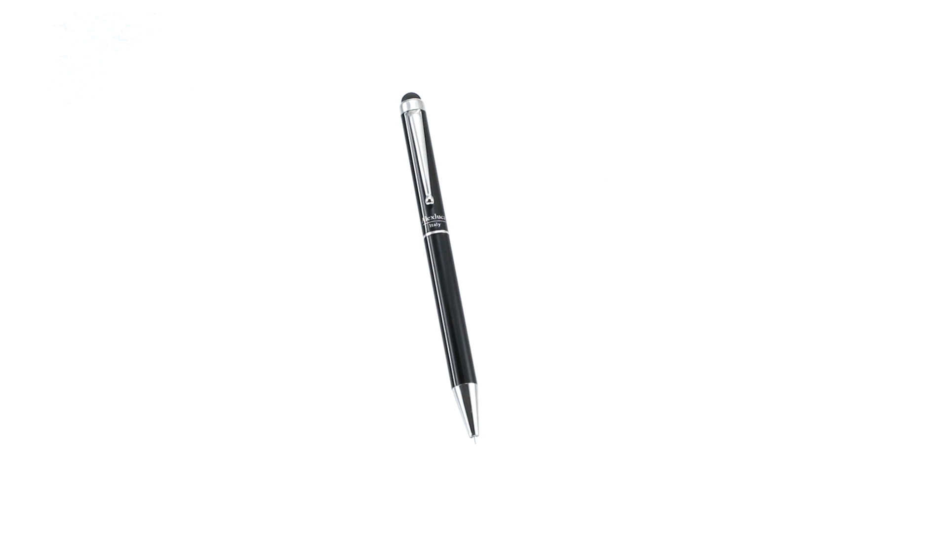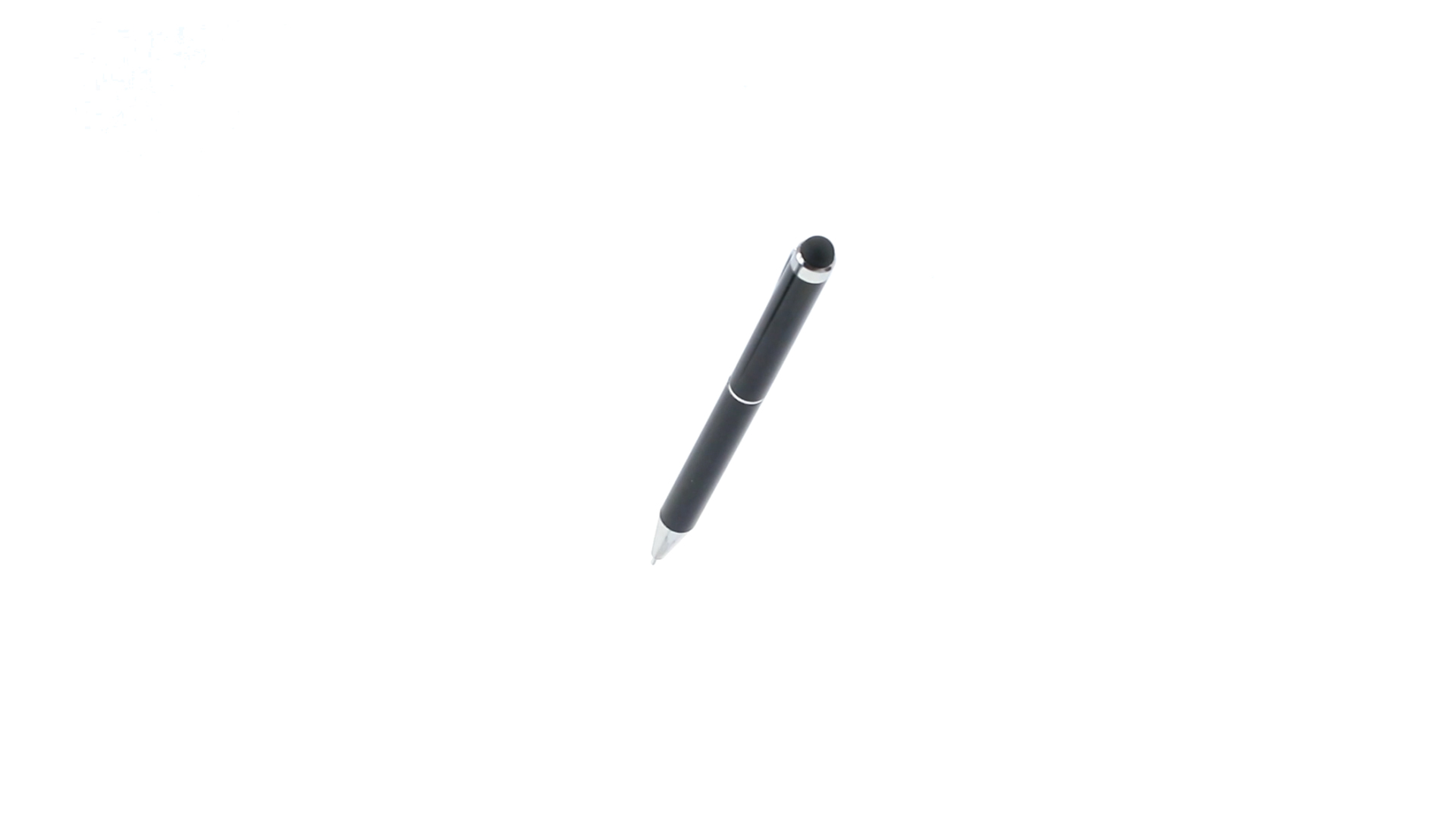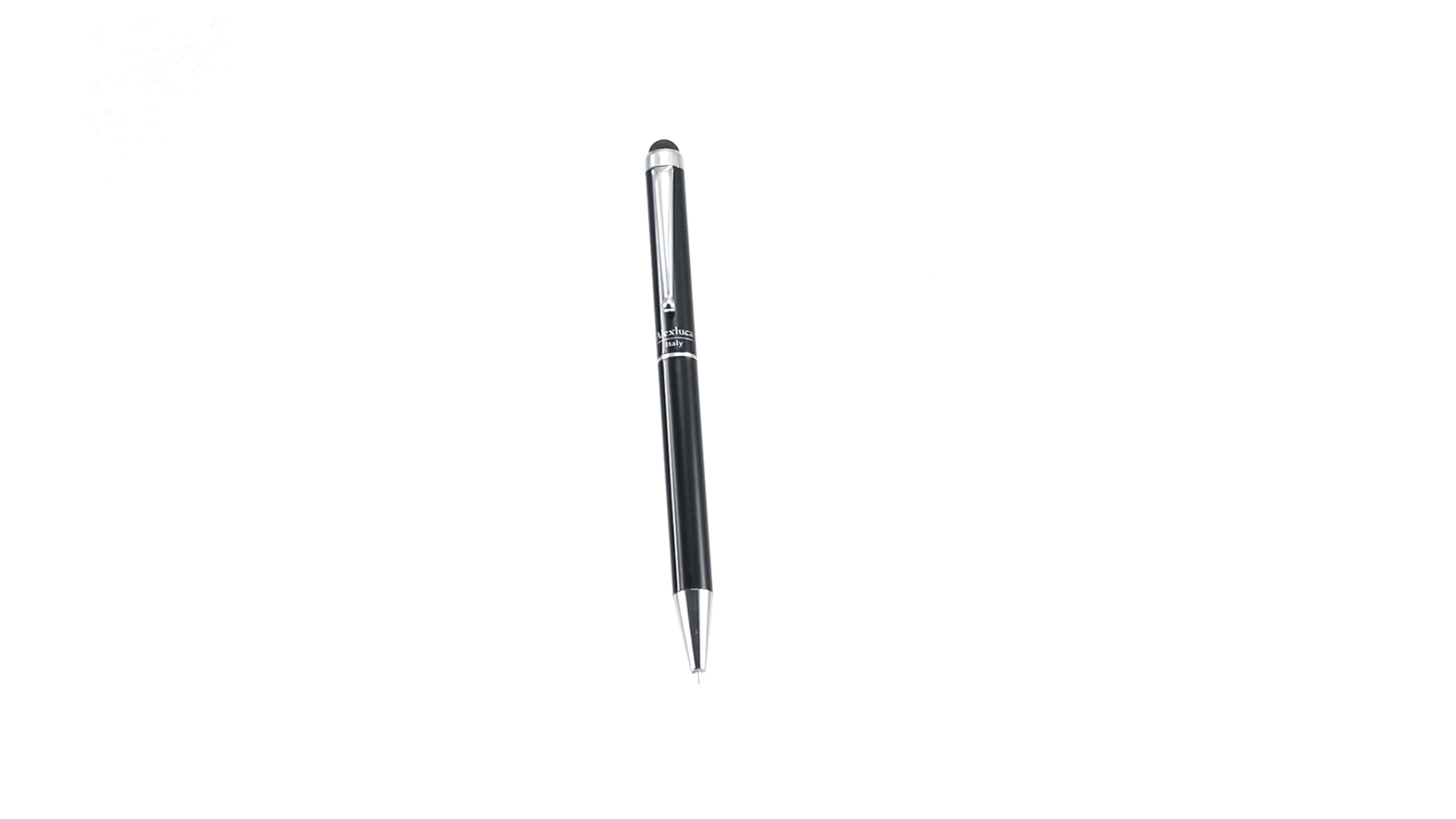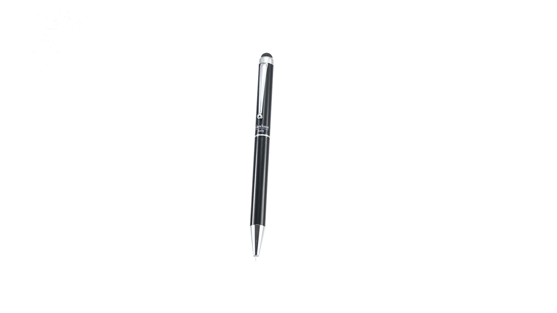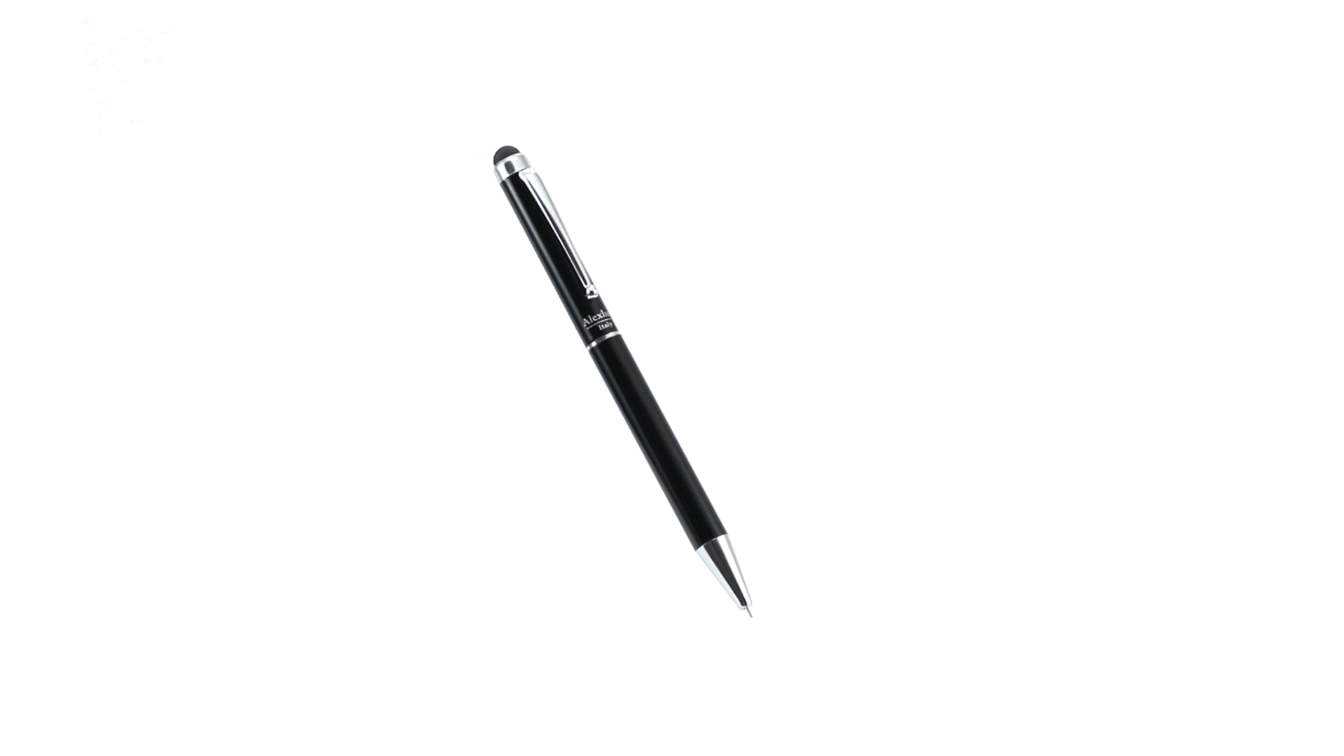 Dreh-Kugelschreiber mit Stylus von Alexluca. Mit angenehm weichem Metallschaft in elegantem Schwarz. Clip und Spitze in passender Farbe. Präsentiert in einem individuellen schwarzem Etui mit Markenlogo. Blaue Tinte.