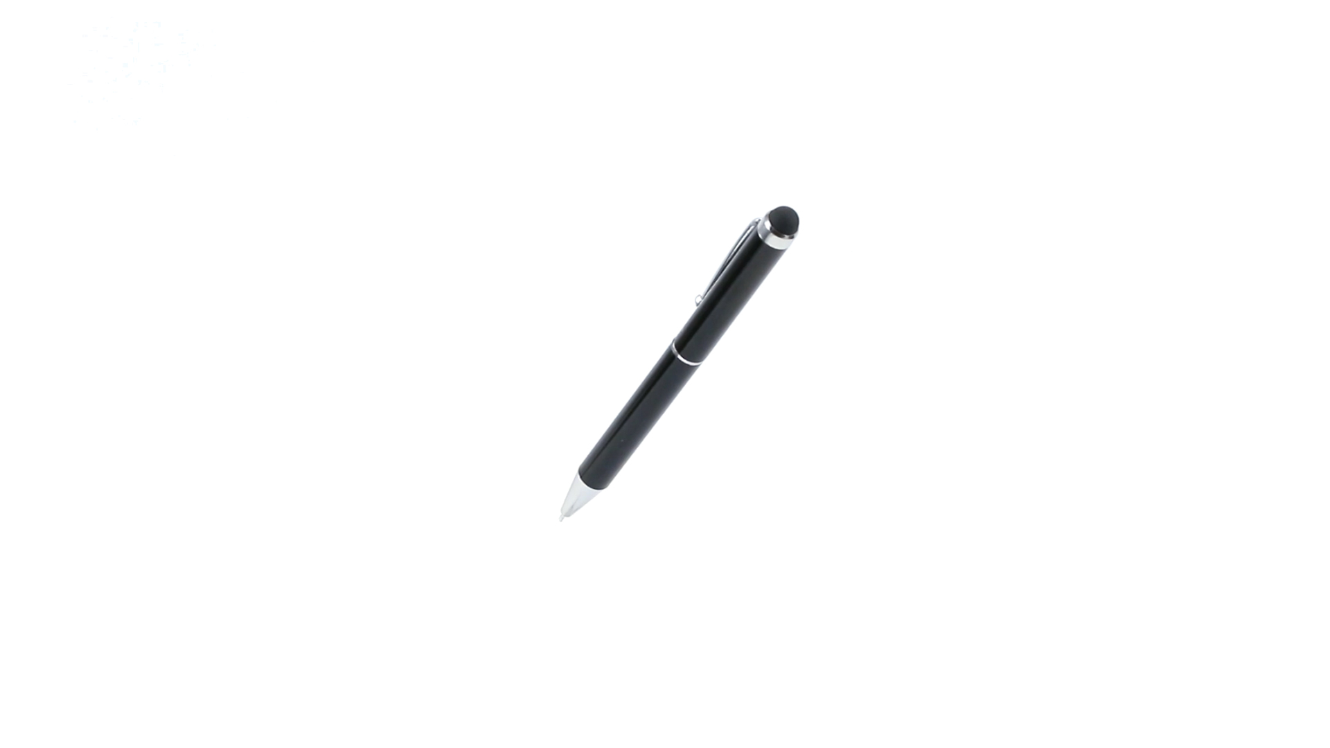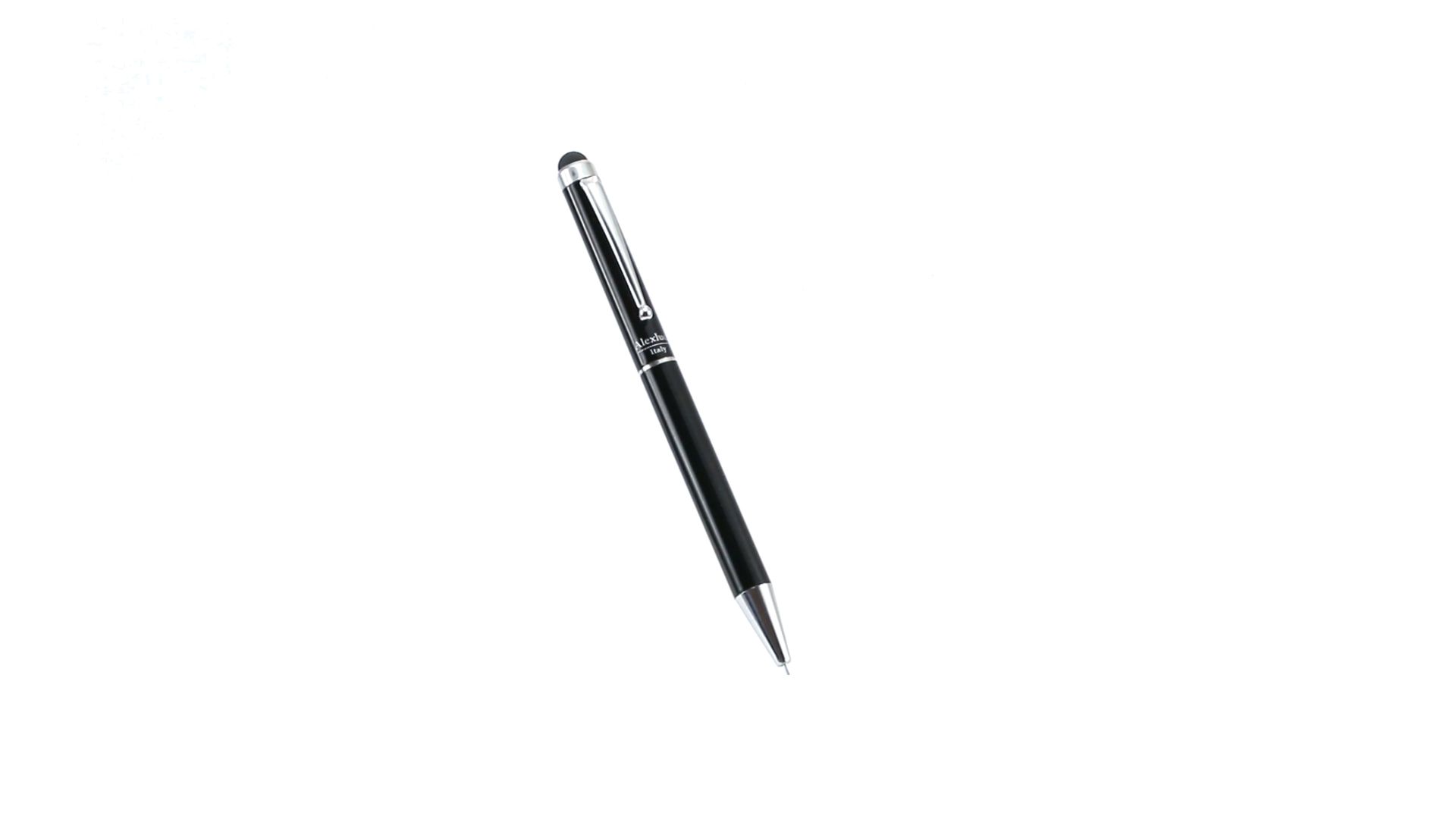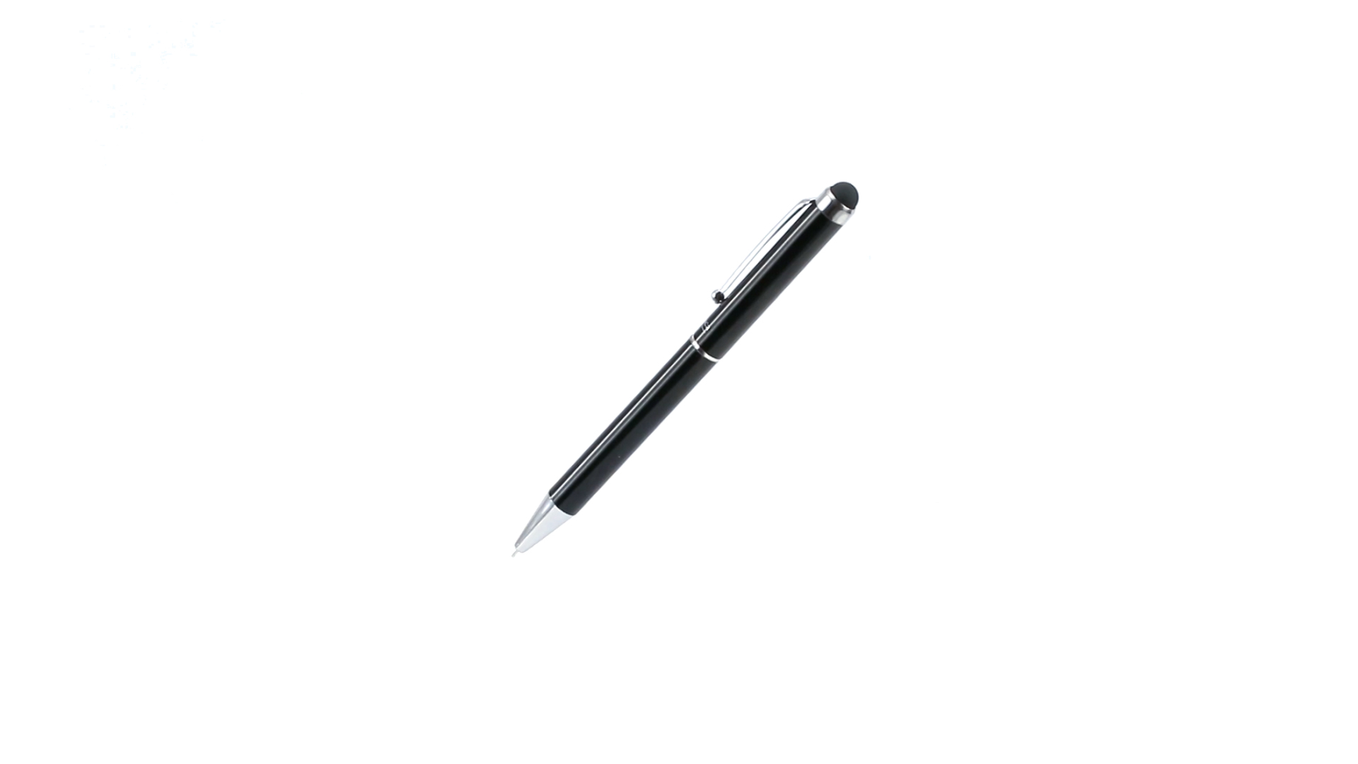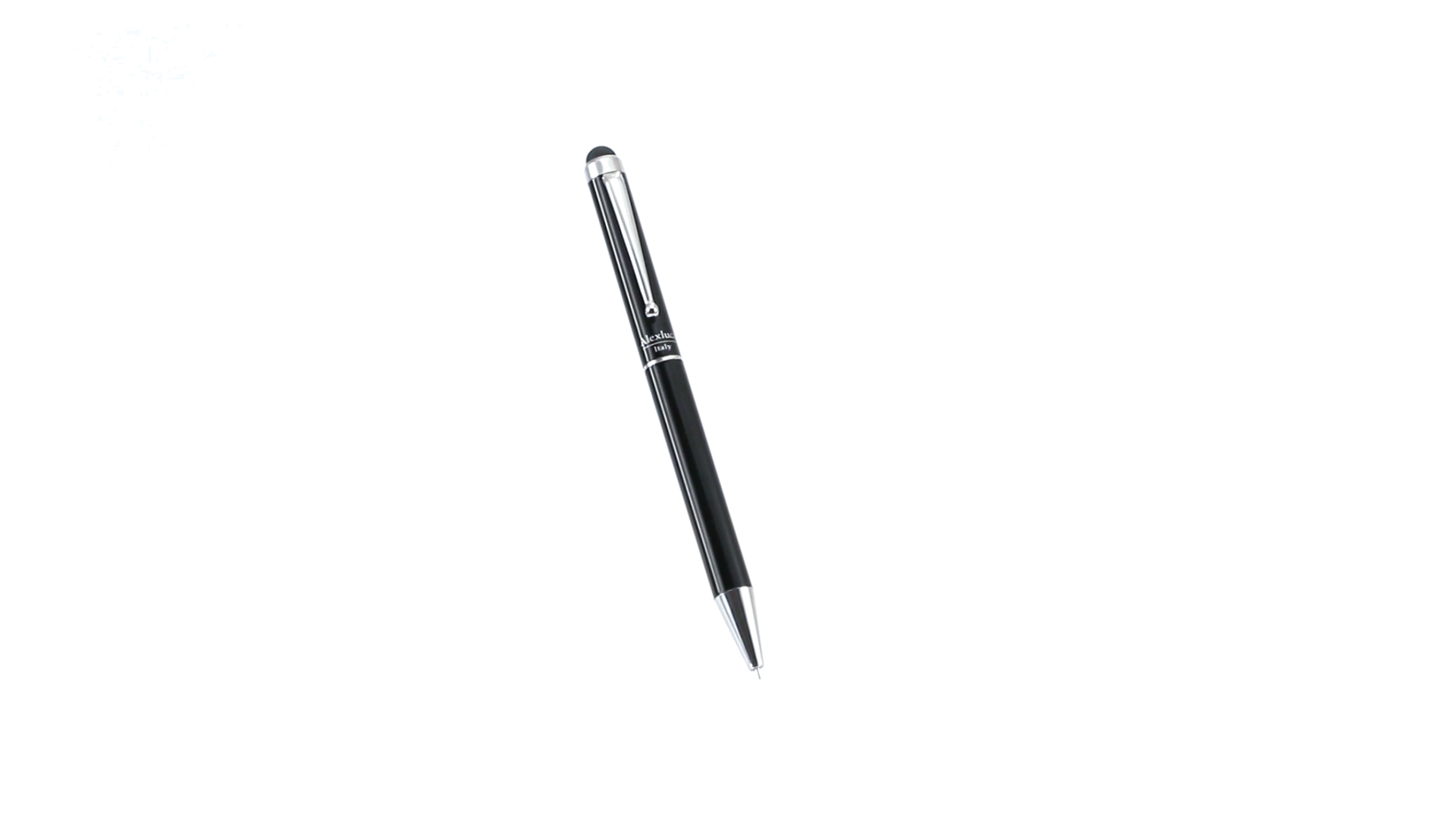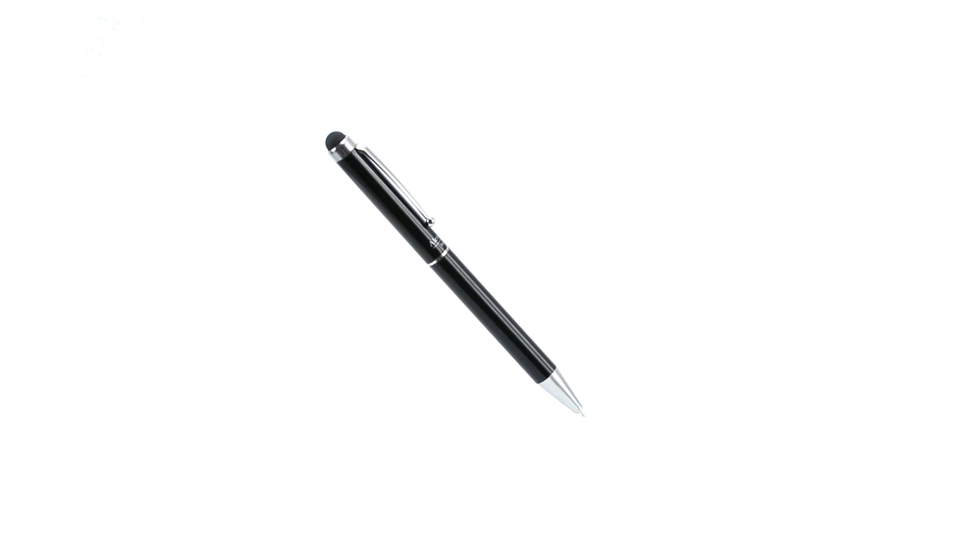 Dreh-Kugelschreiber mit Stylus von Alexluca. Mit angenehm weichem Metallschaft in elegantem Schwarz. Clip und Spitze in passender Farbe. Präsentiert in einem individuellen schwarzem Etui mit Markenlogo. Blaue Tinte.