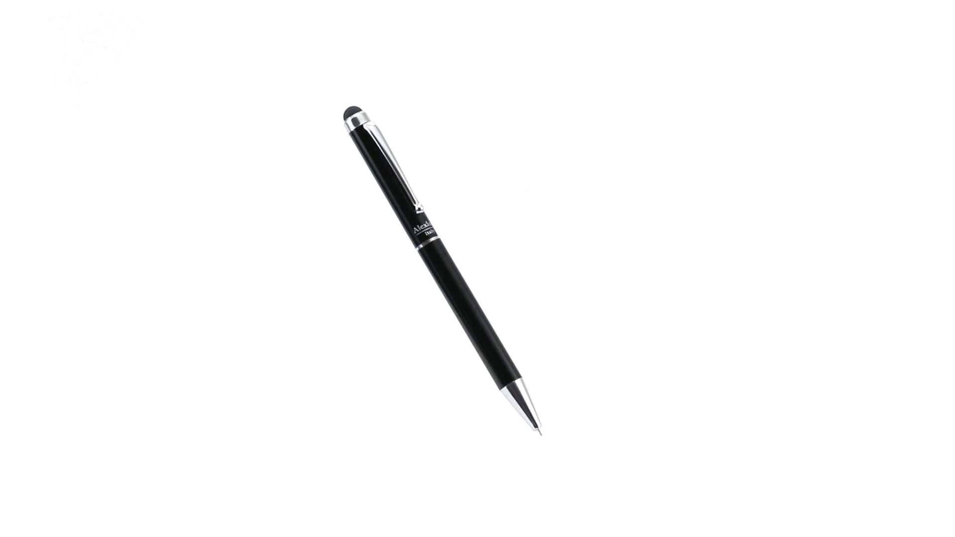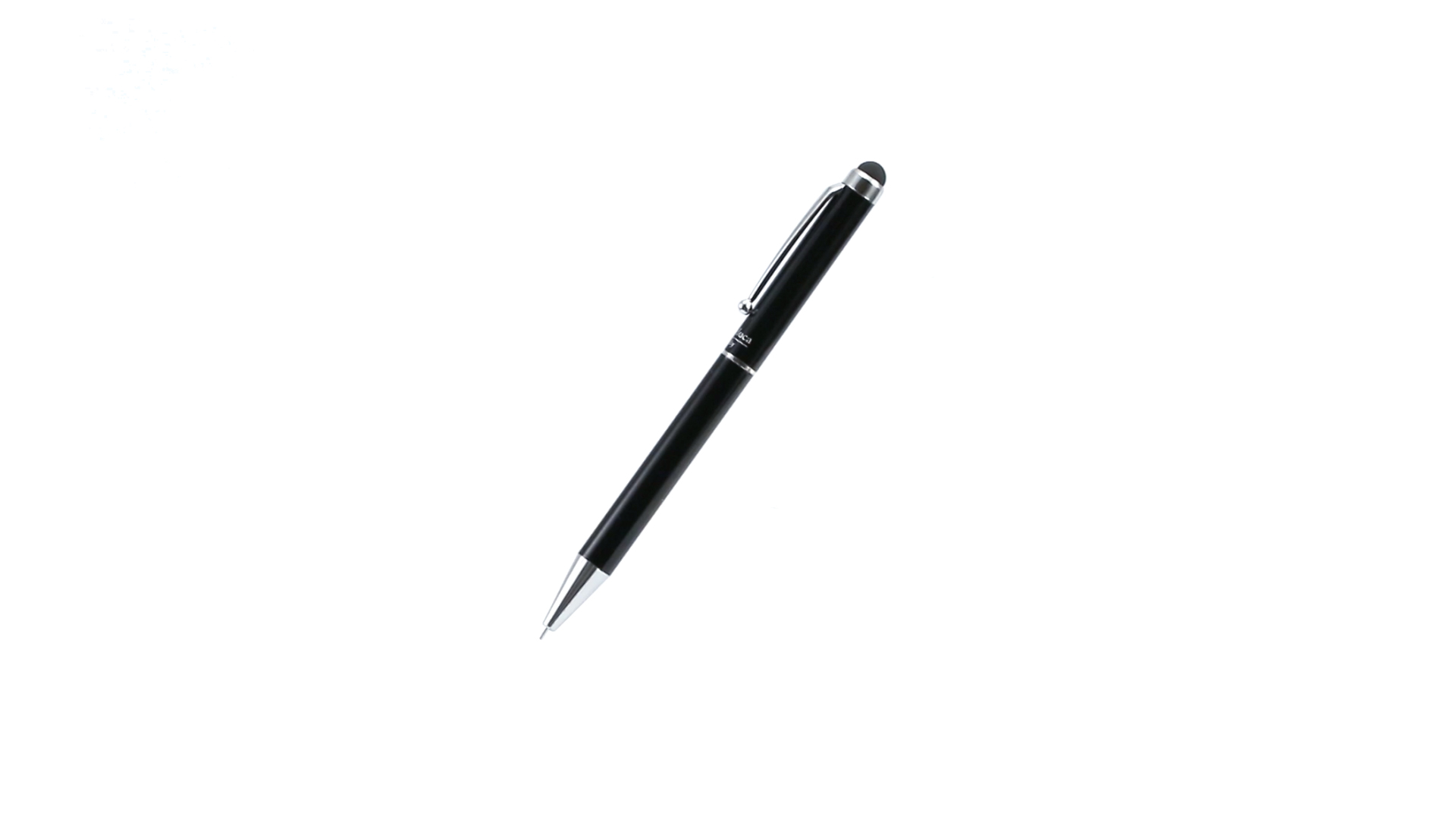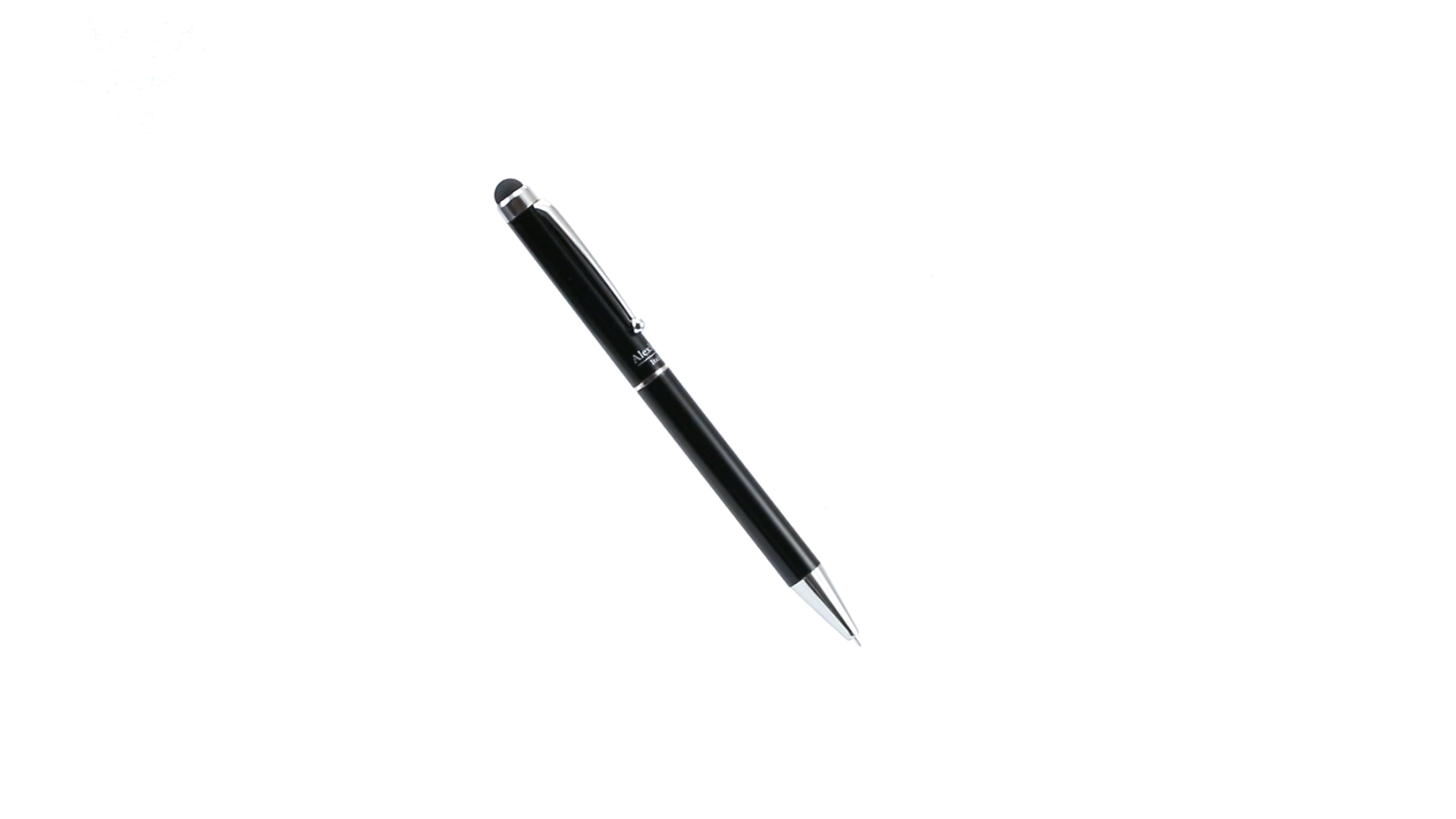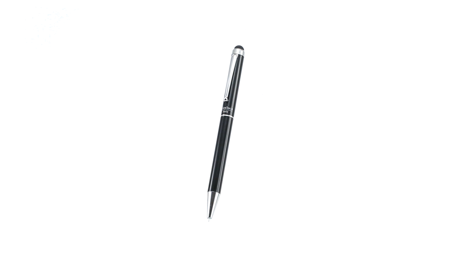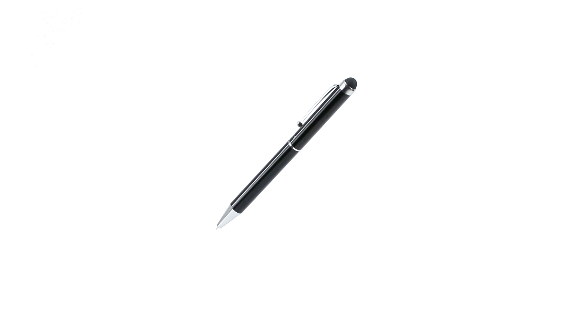 Dreh-Kugelschreiber mit Stylus von Alexluca. Mit angenehm weichem Metallschaft in elegantem Schwarz. Clip und Spitze in passender Farbe. Präsentiert in einem individuellen schwarzem Etui mit Markenlogo. Blaue Tinte.