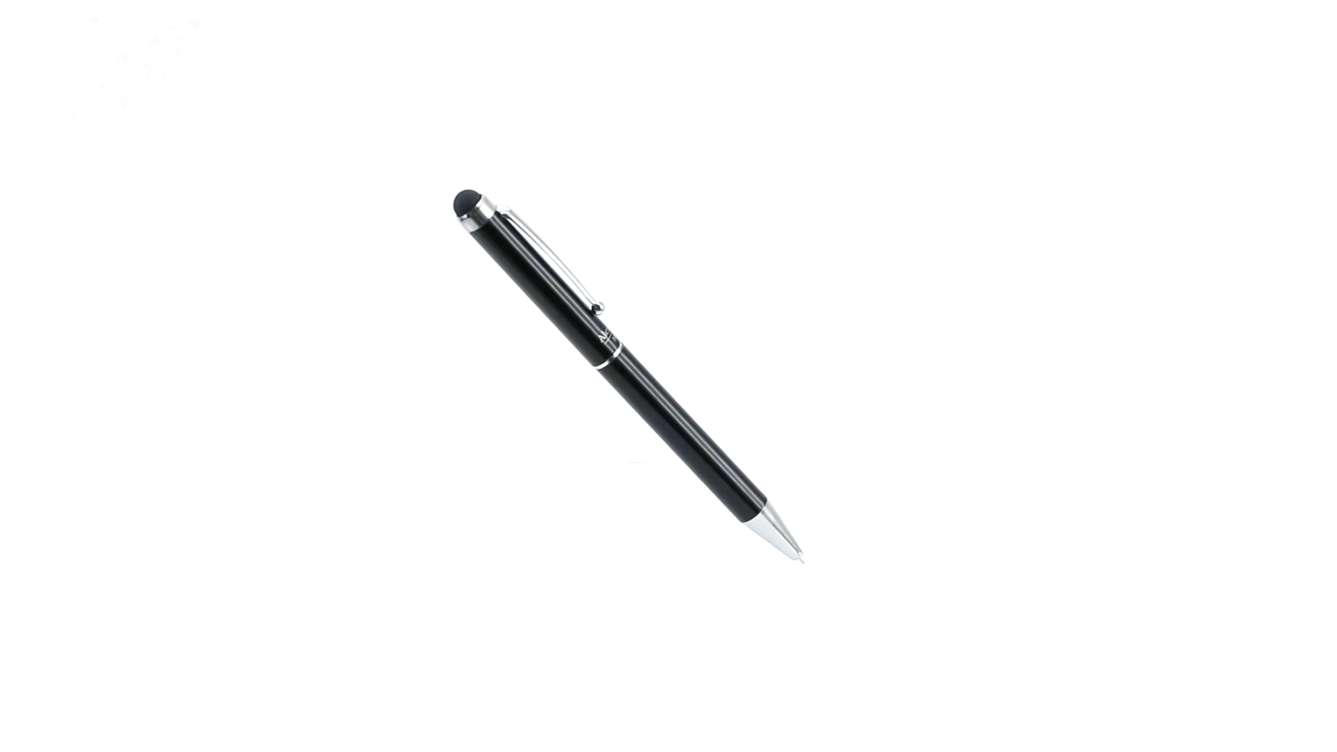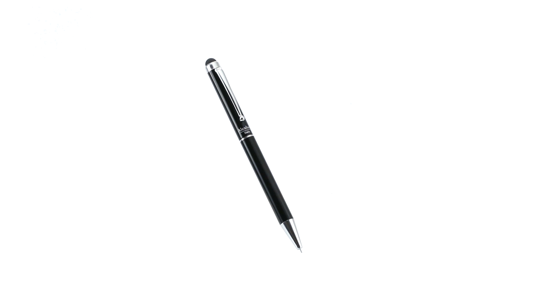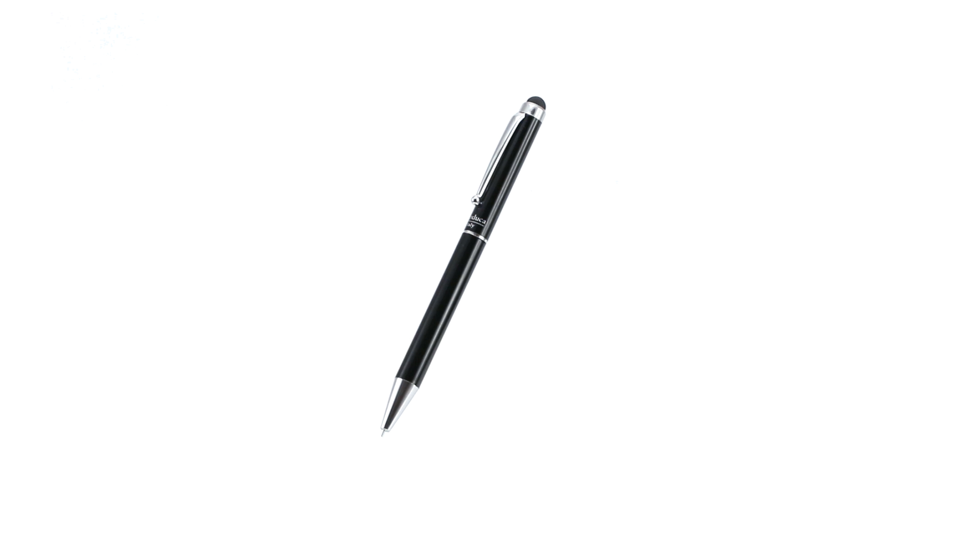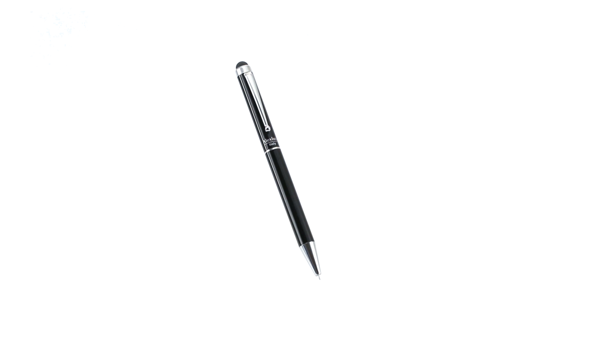 Dreh-Kugelschreiber mit Stylus von Alexluca. Mit angenehm weichem Metallschaft in elegantem Schwarz. Clip und Spitze in passender Farbe. Präsentiert in einem individuellen schwarzem Etui mit Markenlogo. Blaue Tinte.