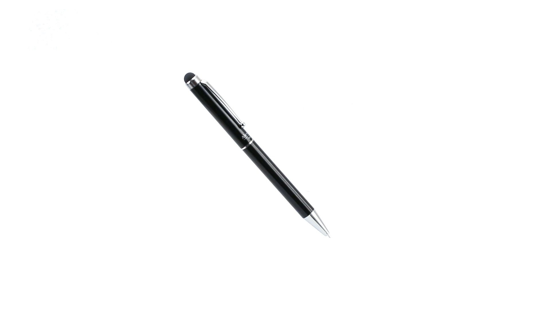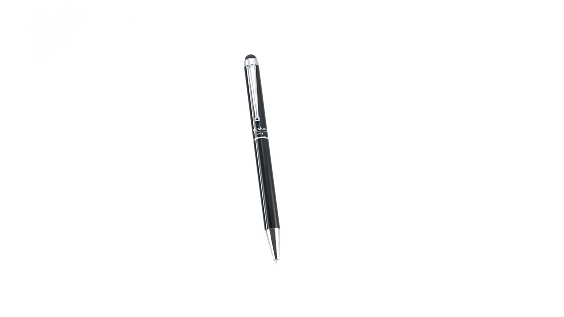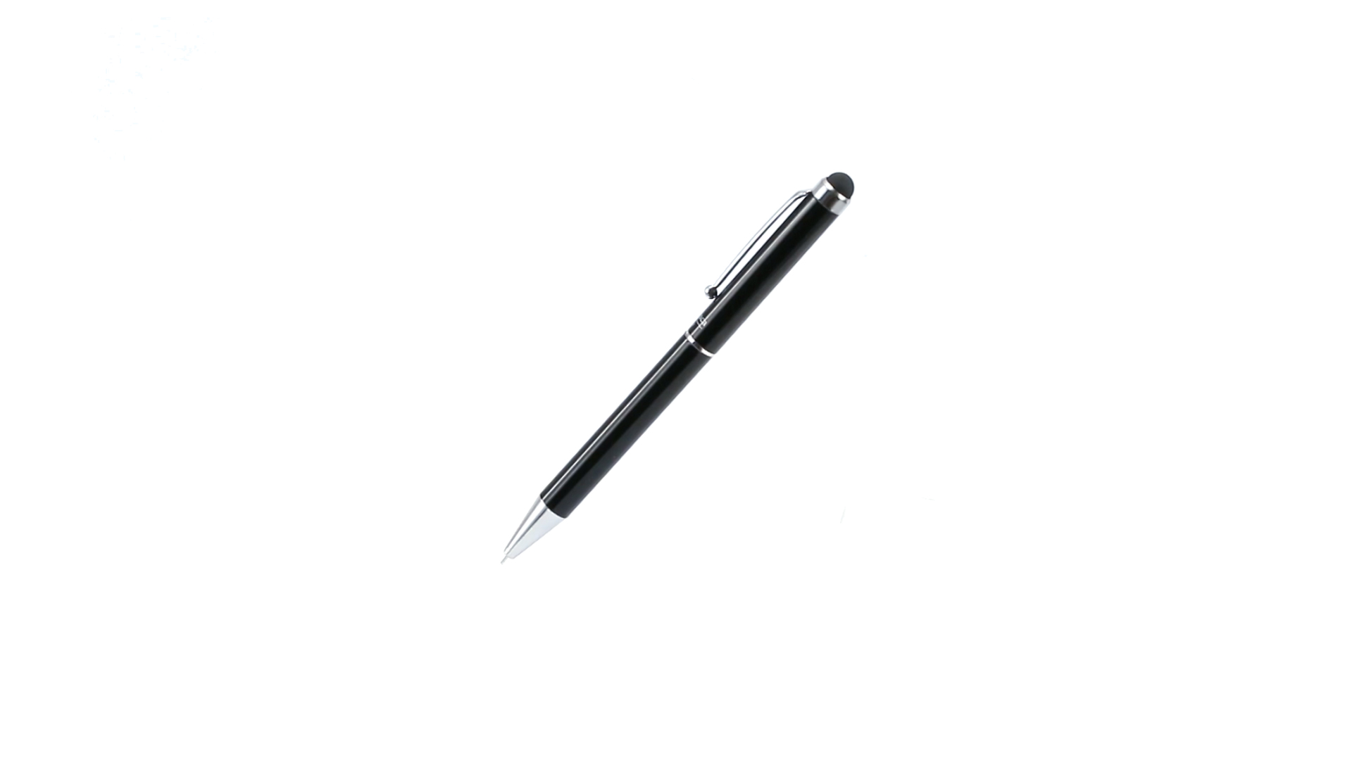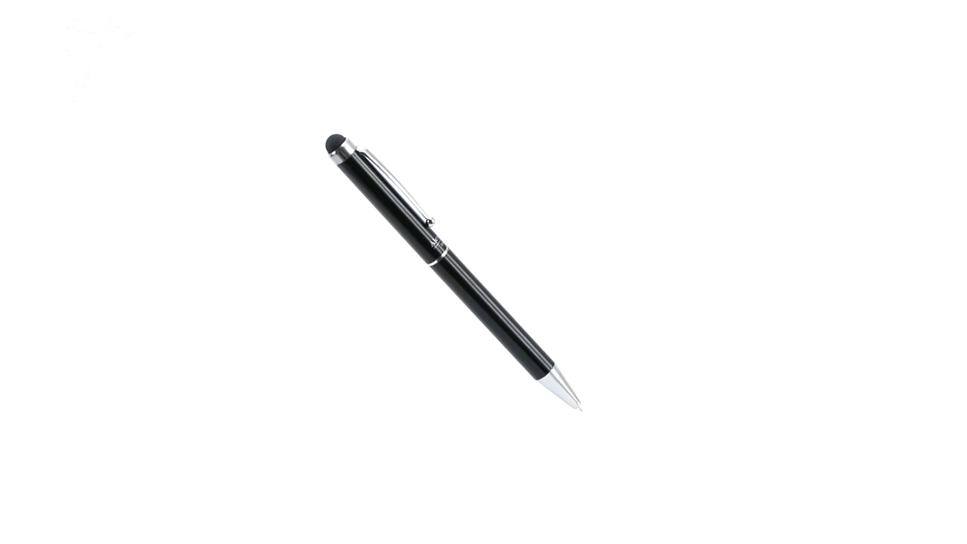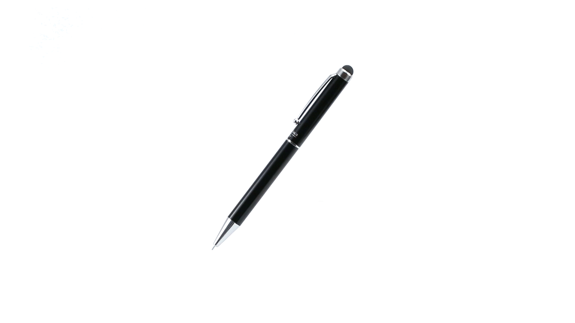 Dreh-Kugelschreiber mit Stylus von Alexluca. Mit angenehm weichem Metallschaft in elegantem Schwarz. Clip und Spitze in passender Farbe. Präsentiert in einem individuellen schwarzem Etui mit Markenlogo. Blaue Tinte.