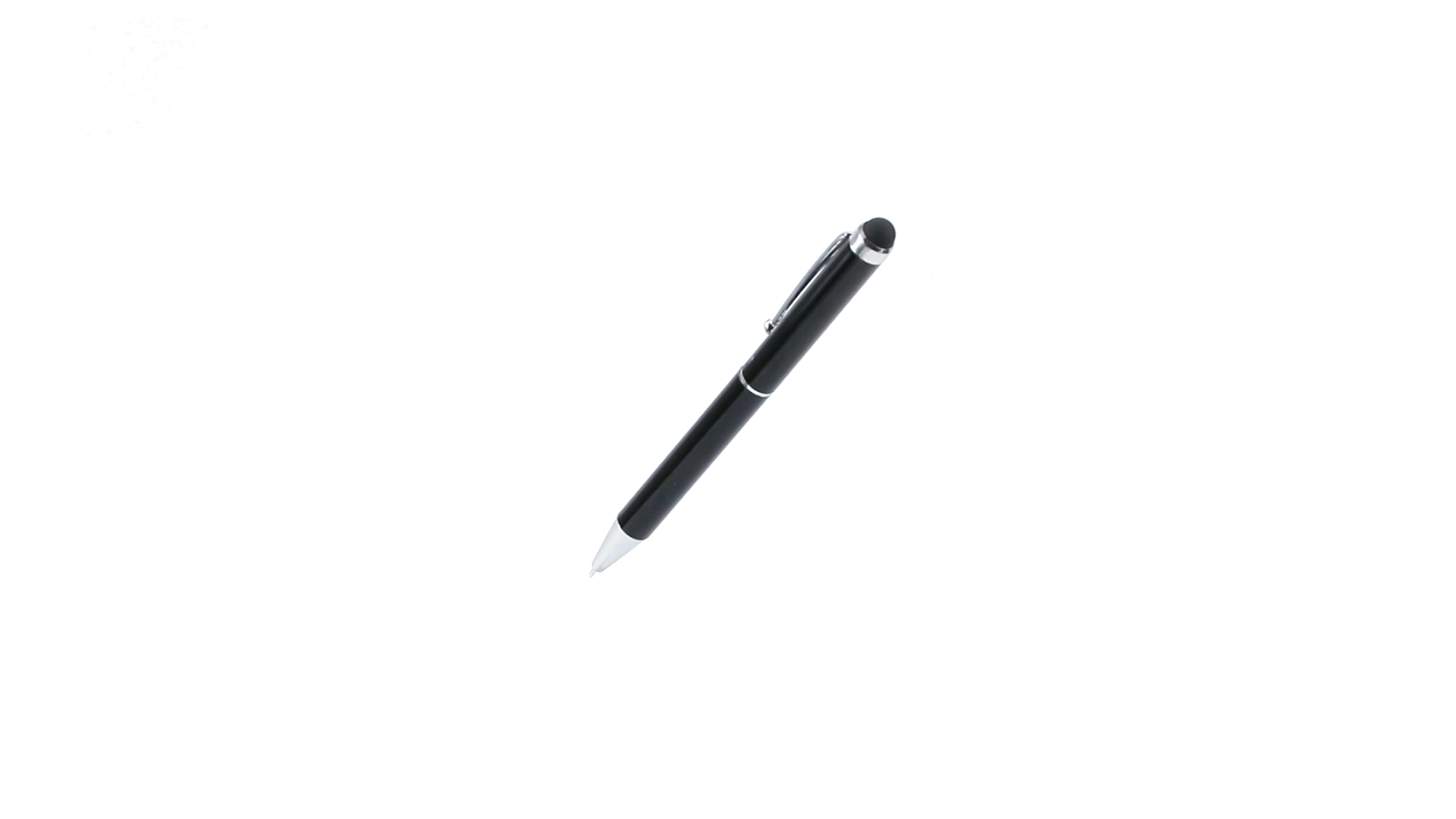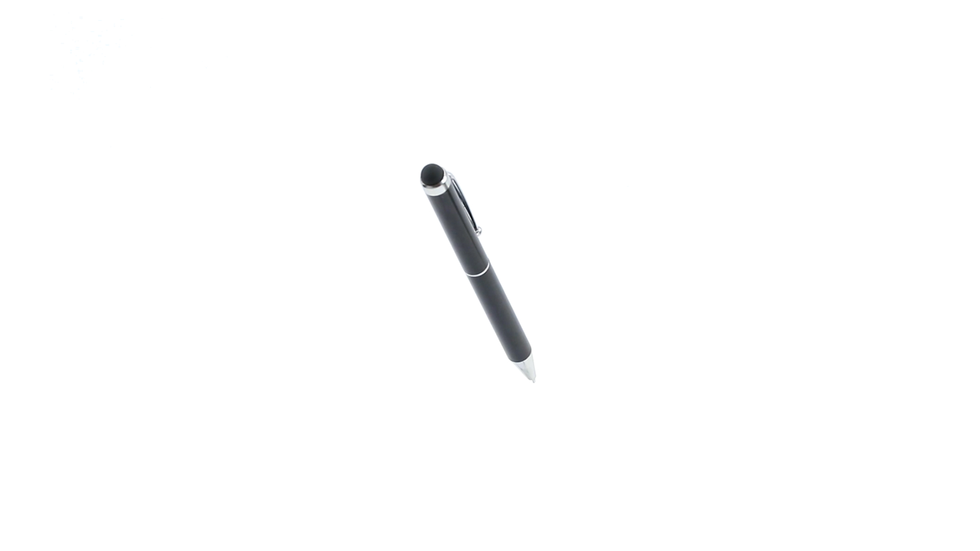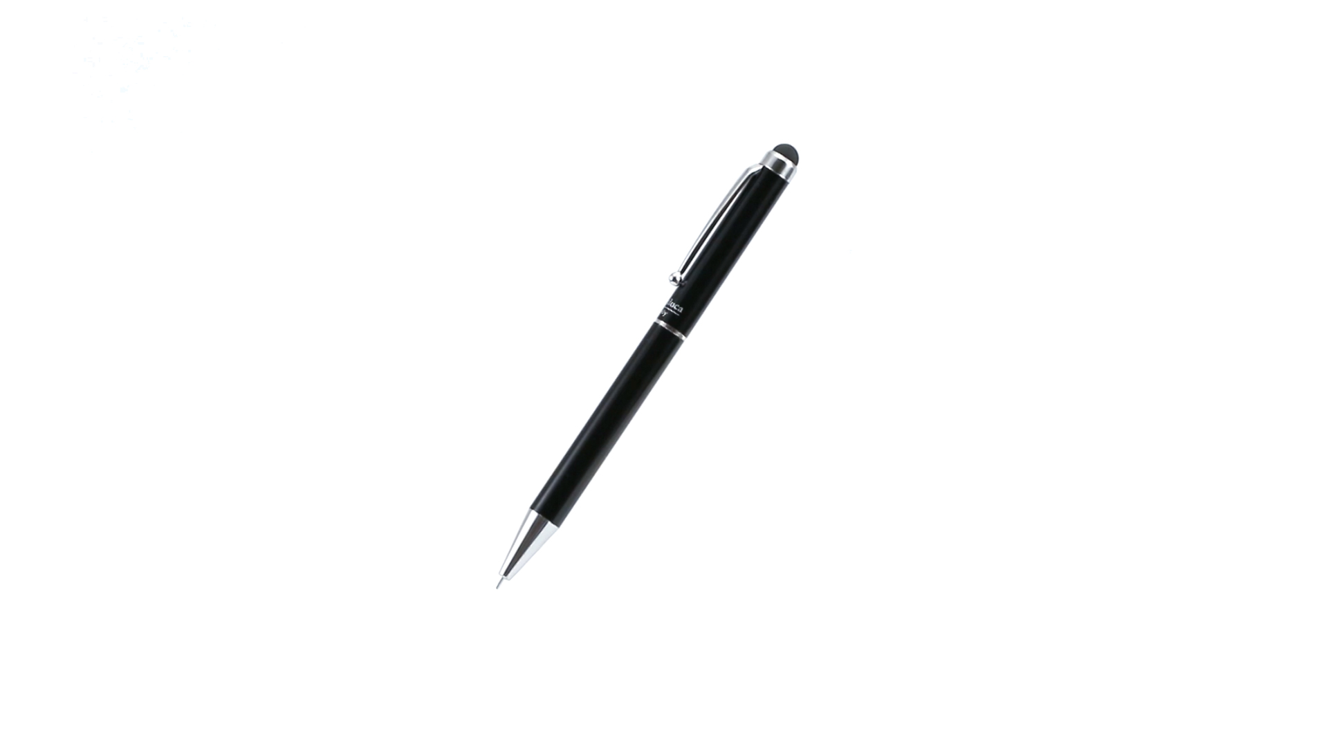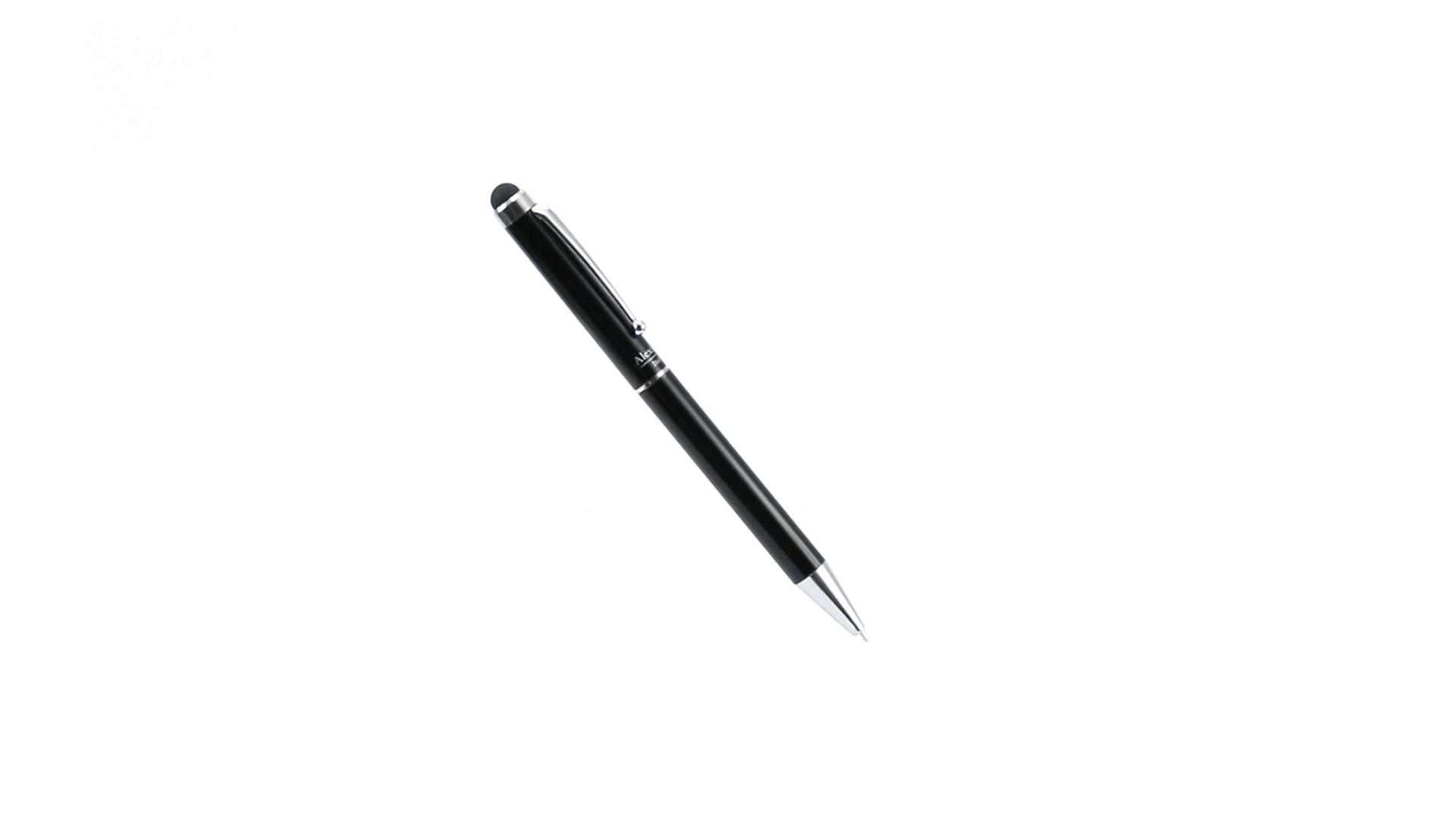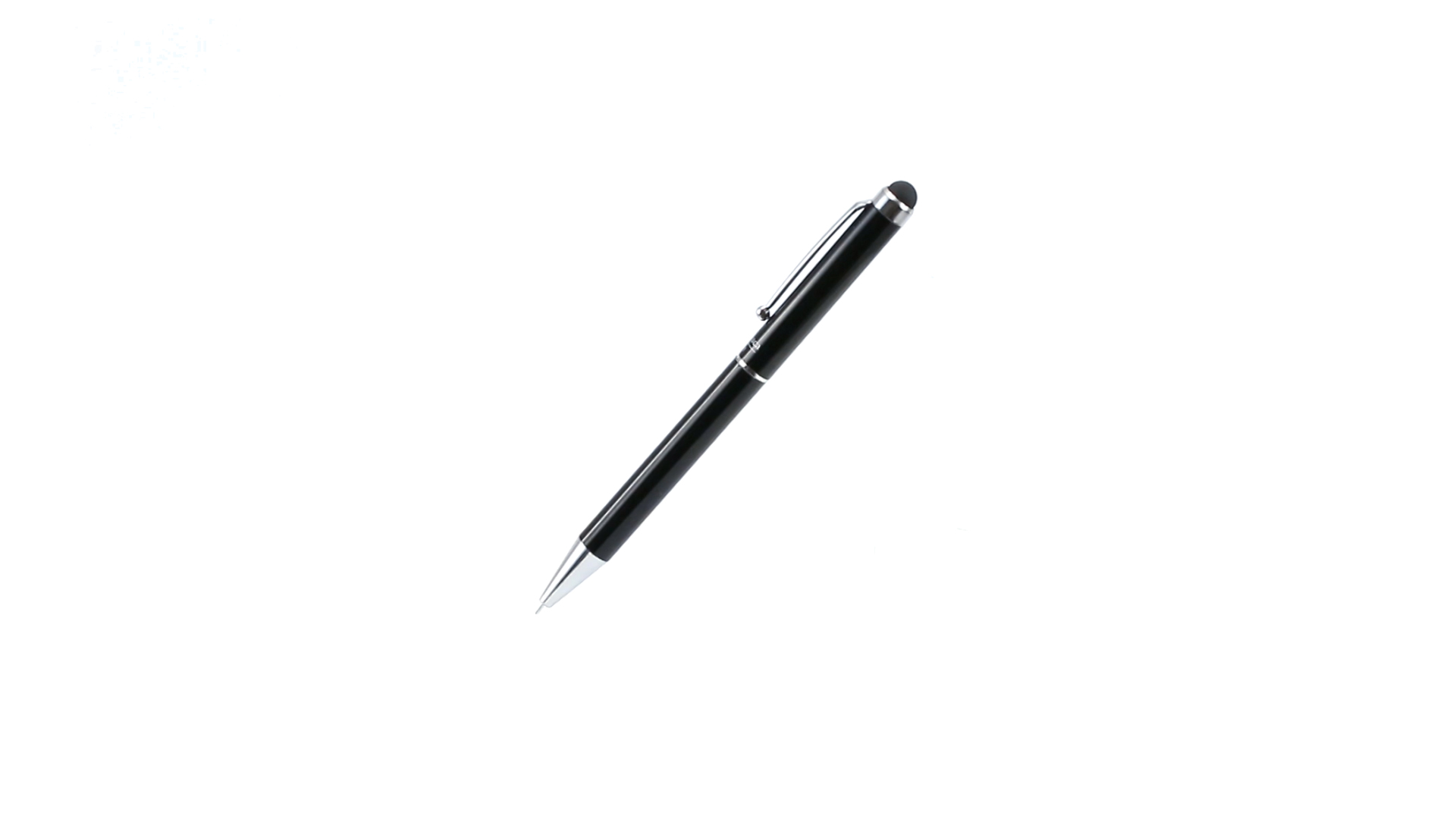 Dreh-Kugelschreiber mit Stylus von Alexluca. Mit angenehm weichem Metallschaft in elegantem Schwarz. Clip und Spitze in passender Farbe. Präsentiert in einem individuellen schwarzem Etui mit Markenlogo. Blaue Tinte.