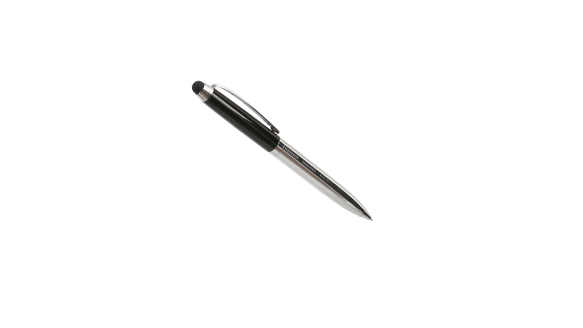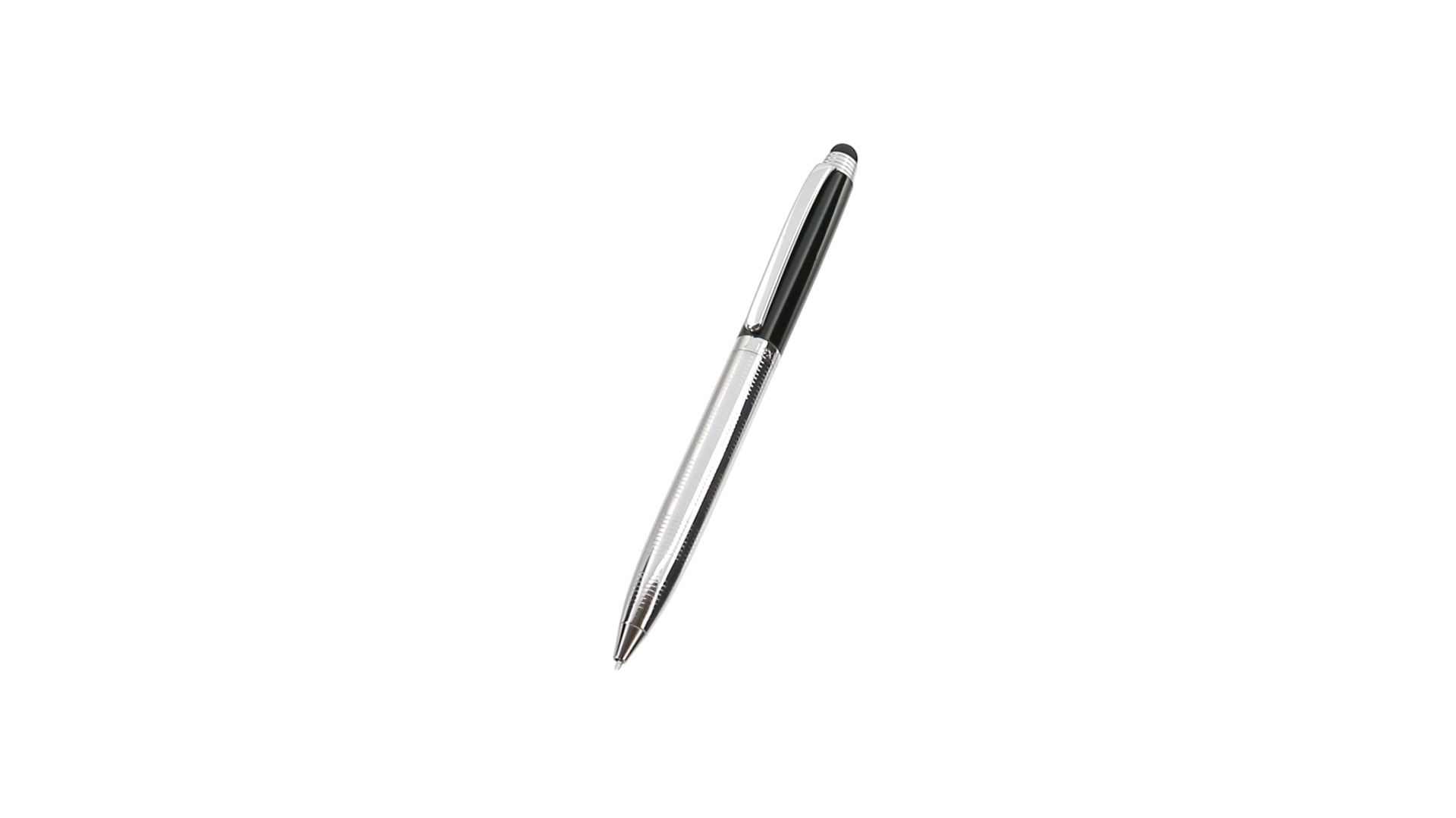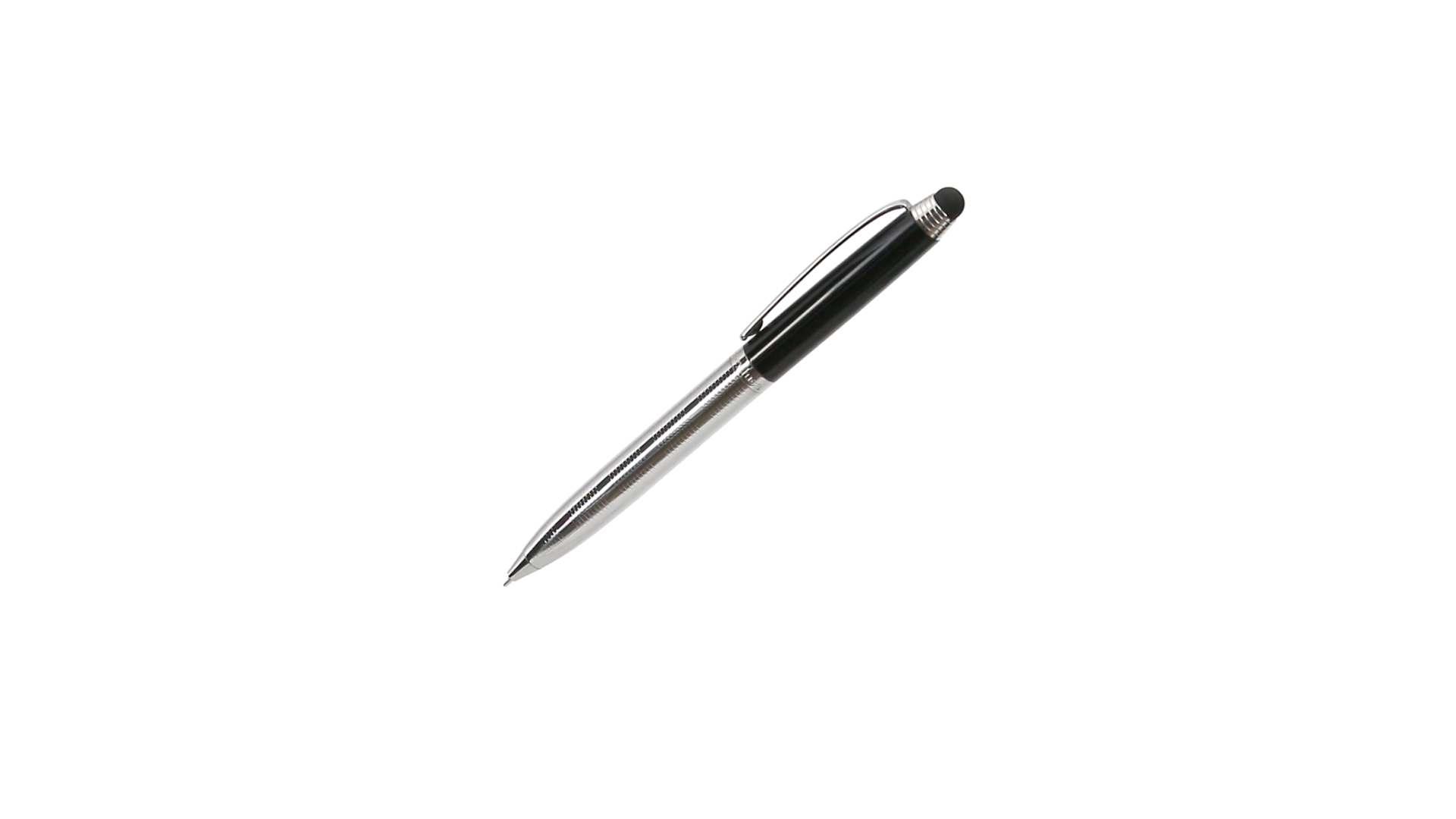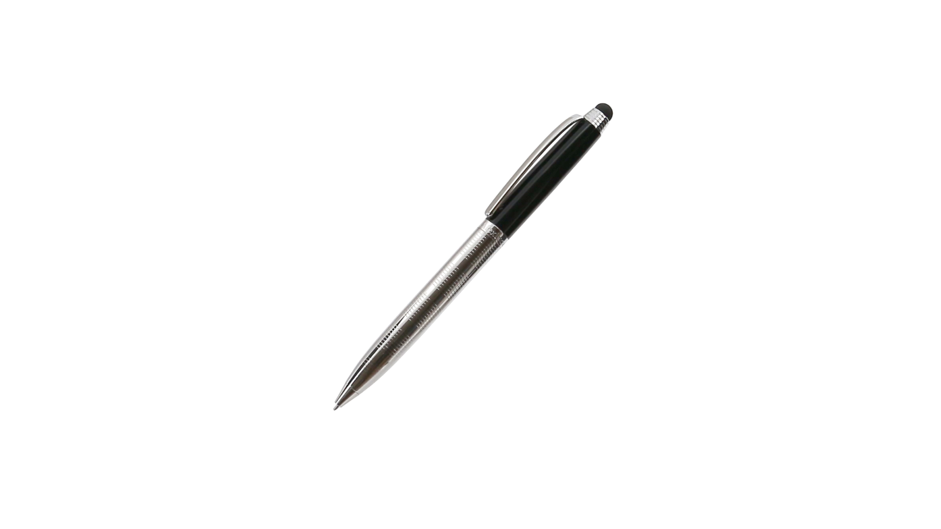 Dreh-Kugelschreiber mit Stylus von Alexluca. Mit angenehm weichem Metallschaft in einer Kombination aus elegantem Schwarz mit Silber. Clip und Griff in passender Farbe. Präsentiert in einem individuellen schwarzem Etui mit Markenlogo. Blaue Tinte.