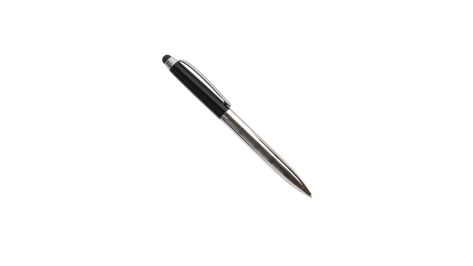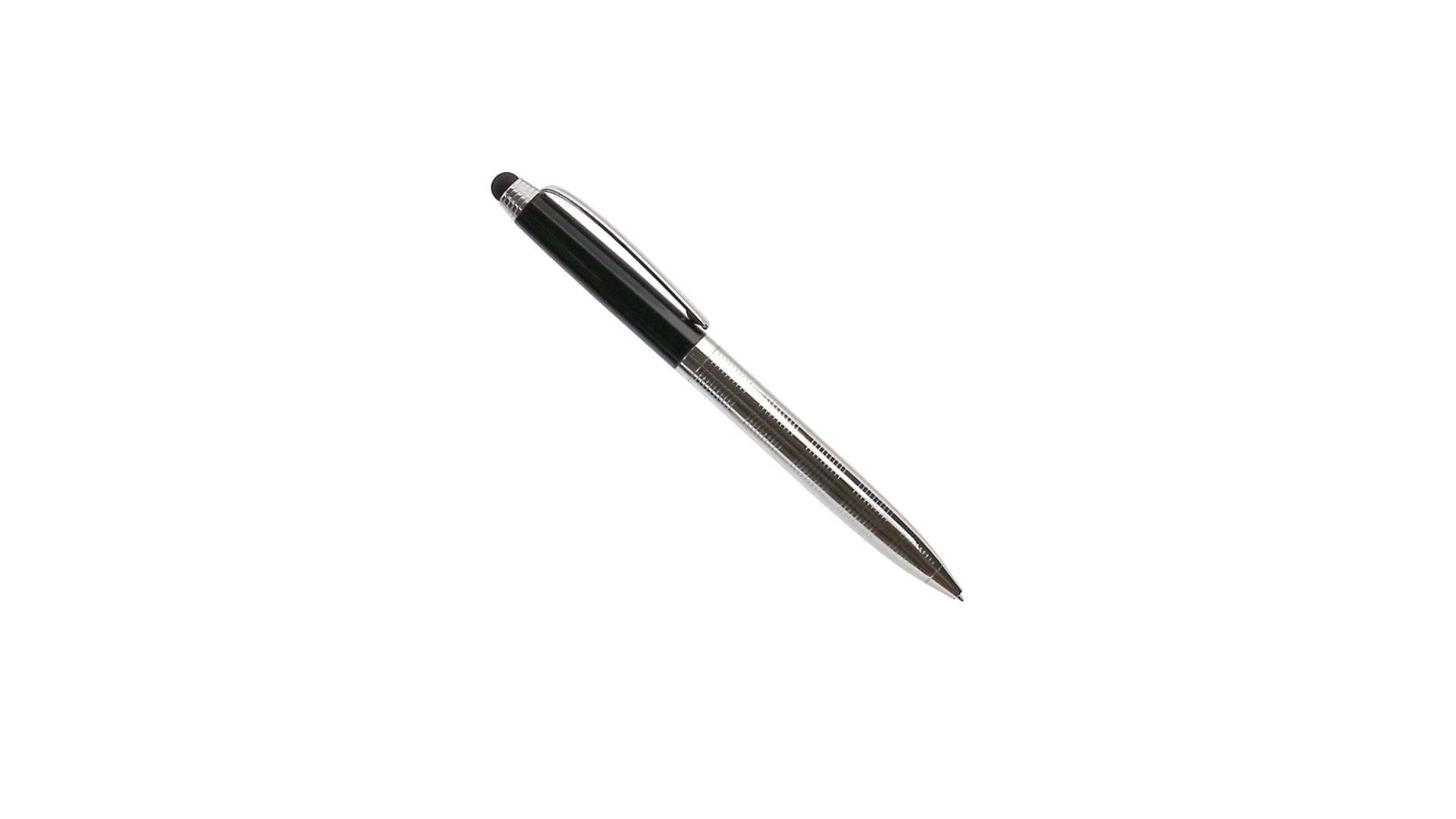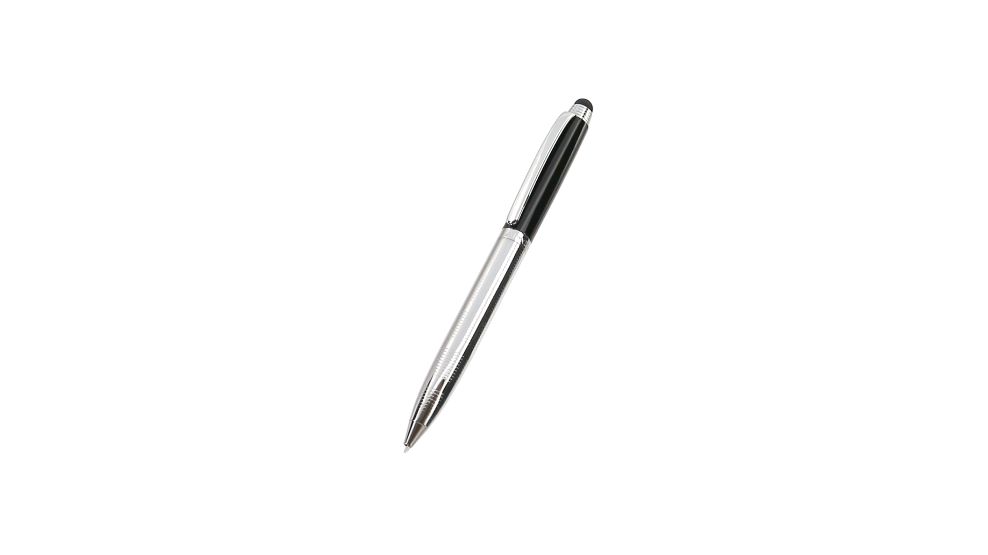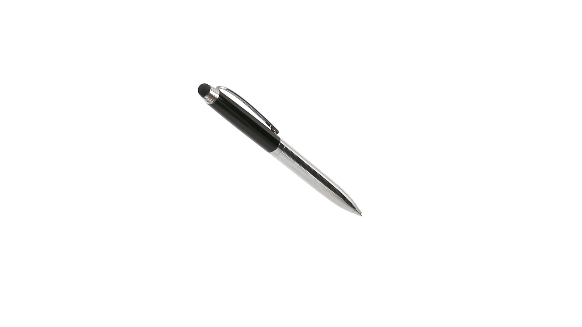 Dreh-Kugelschreiber mit Stylus von Alexluca. Mit angenehm weichem Metallschaft in einer Kombination aus elegantem Schwarz mit Silber. Clip und Griff in passender Farbe. Präsentiert in einem individuellen schwarzem Etui mit Markenlogo. Blaue Tinte.