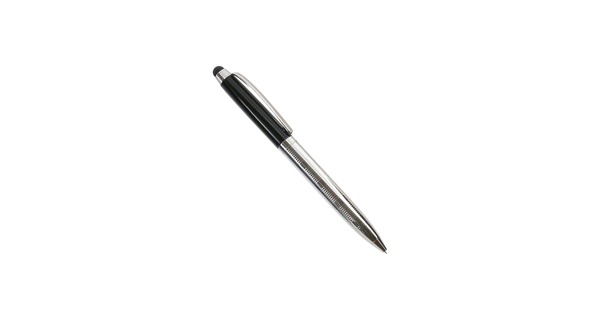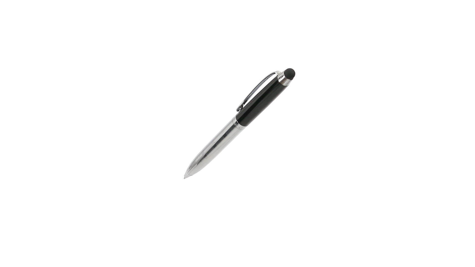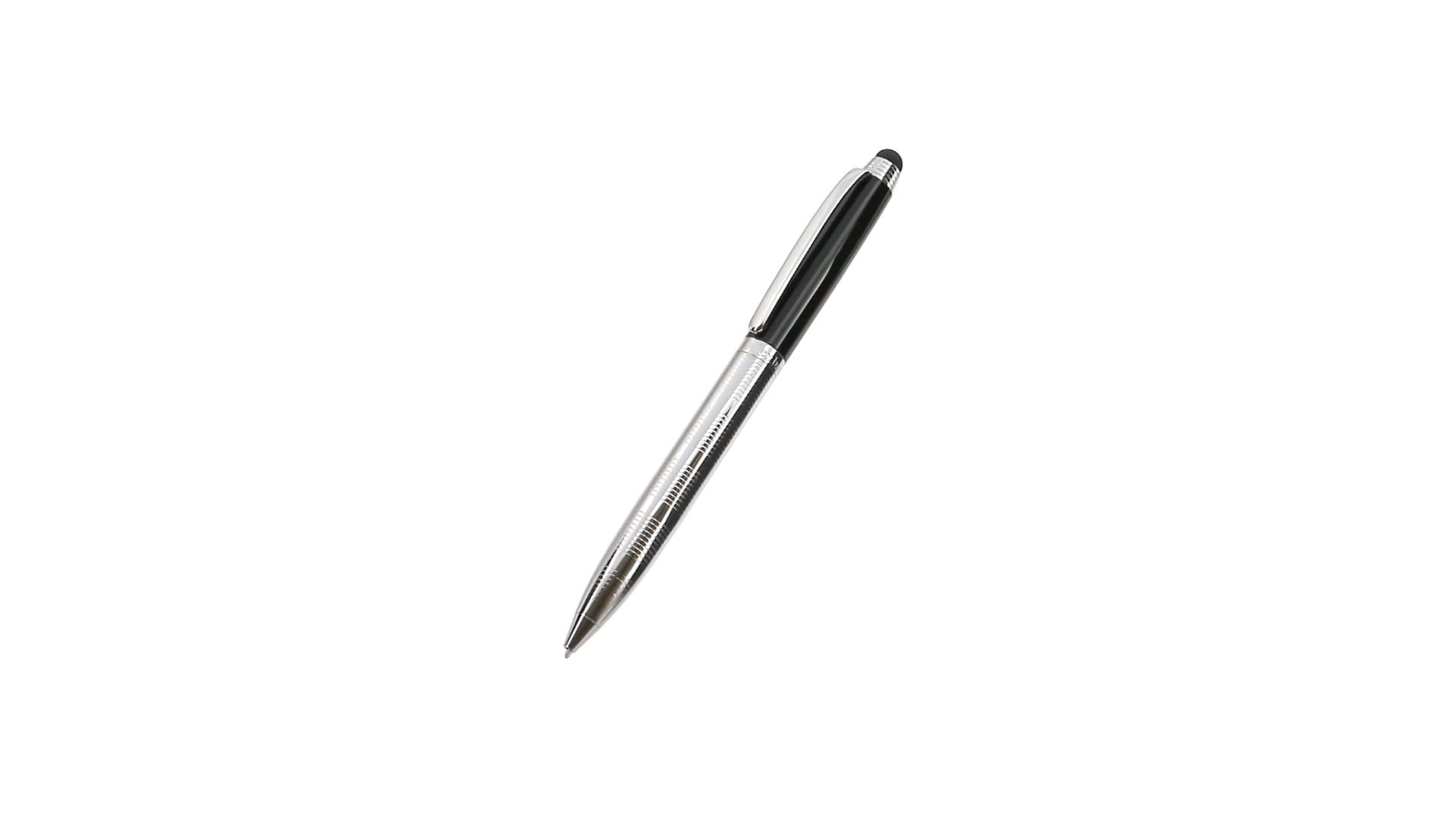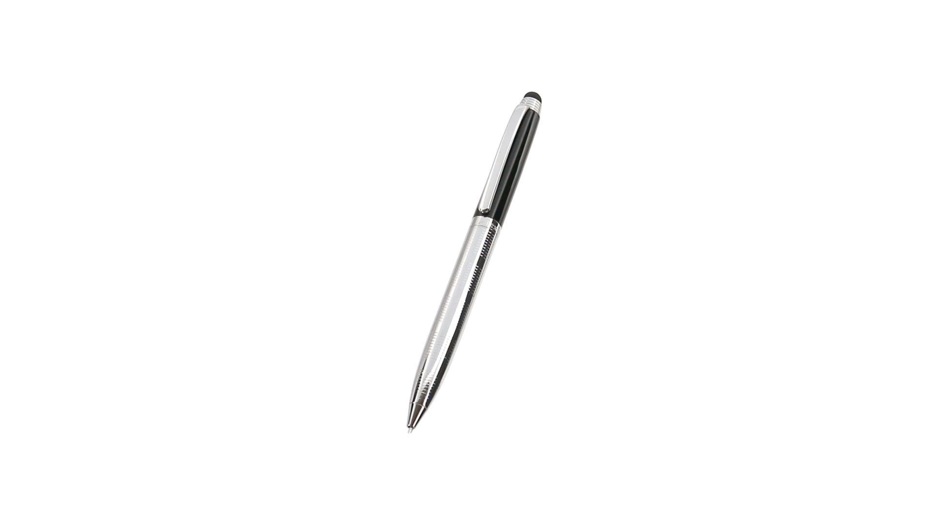 Dreh-Kugelschreiber mit Stylus von Alexluca. Mit angenehm weichem Metallschaft in einer Kombination aus elegantem Schwarz mit Silber. Clip und Griff in passender Farbe. Präsentiert in einem individuellen schwarzem Etui mit Markenlogo. Blaue Tinte.