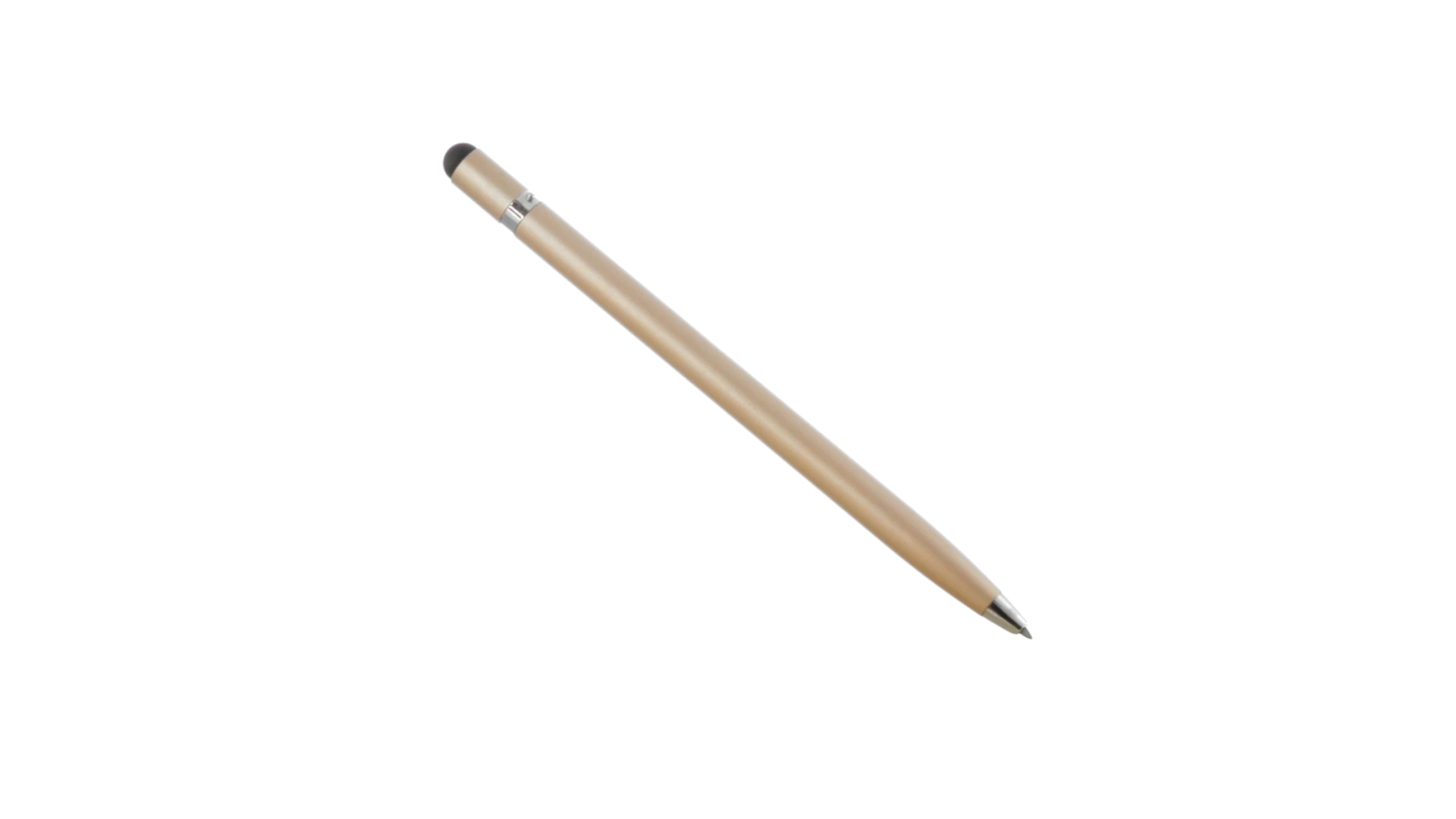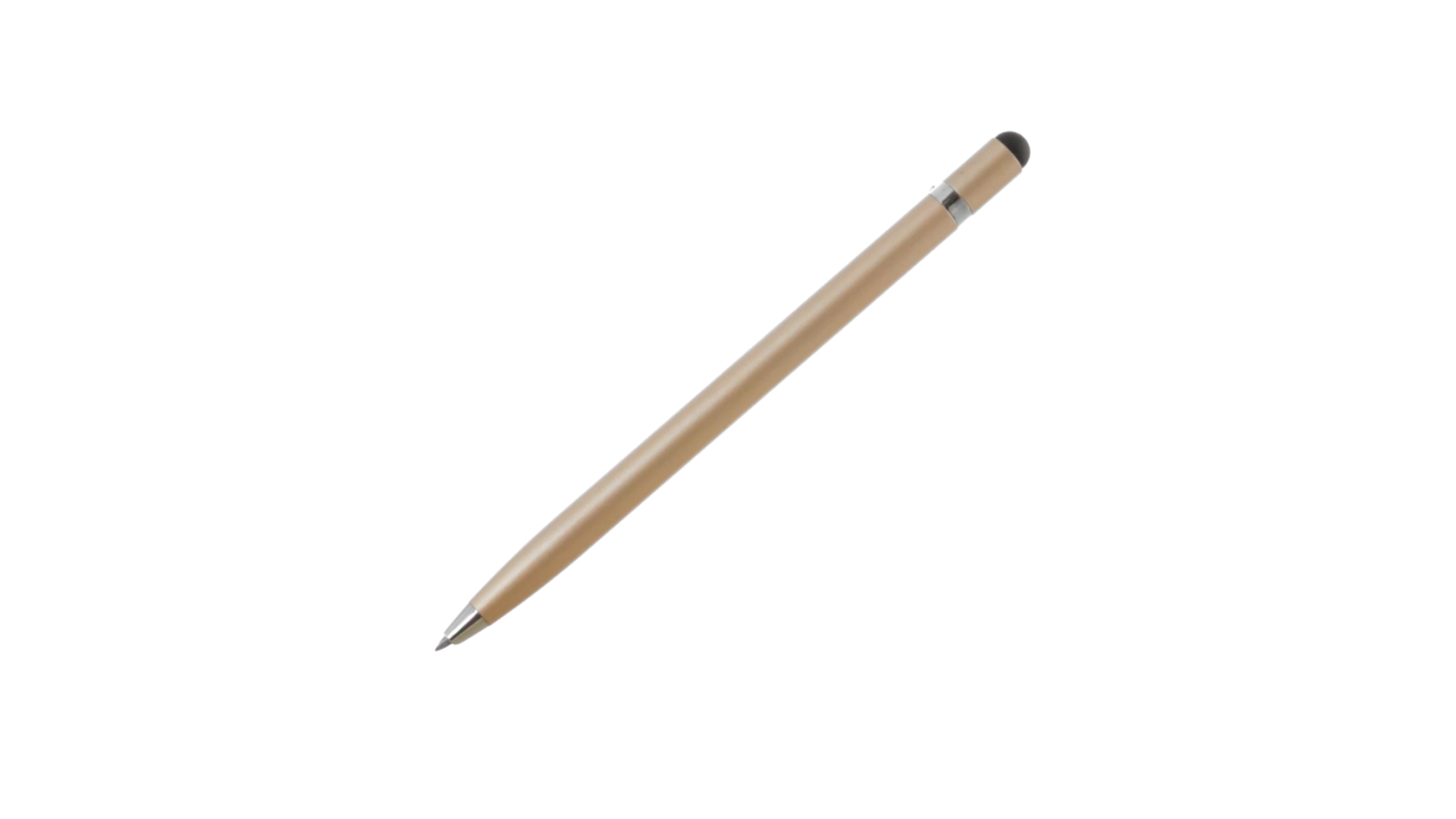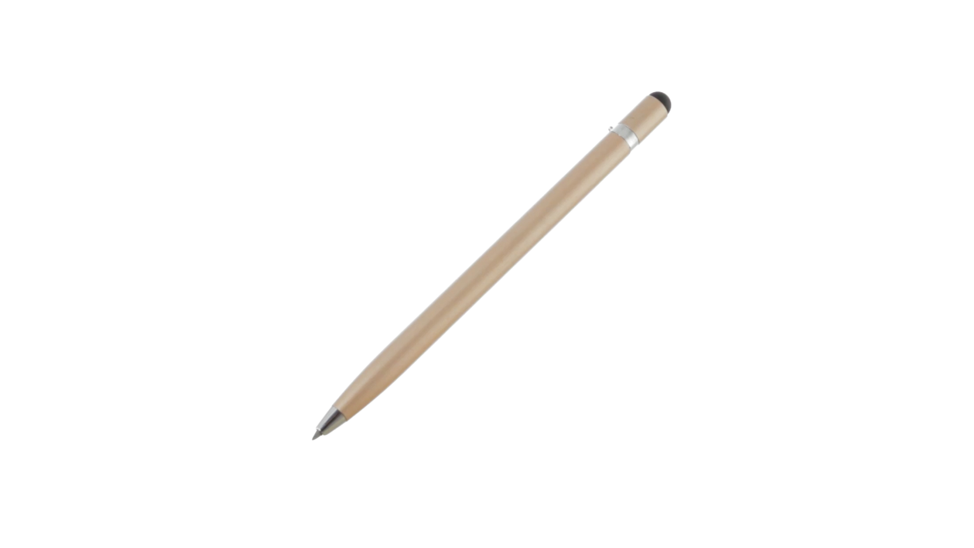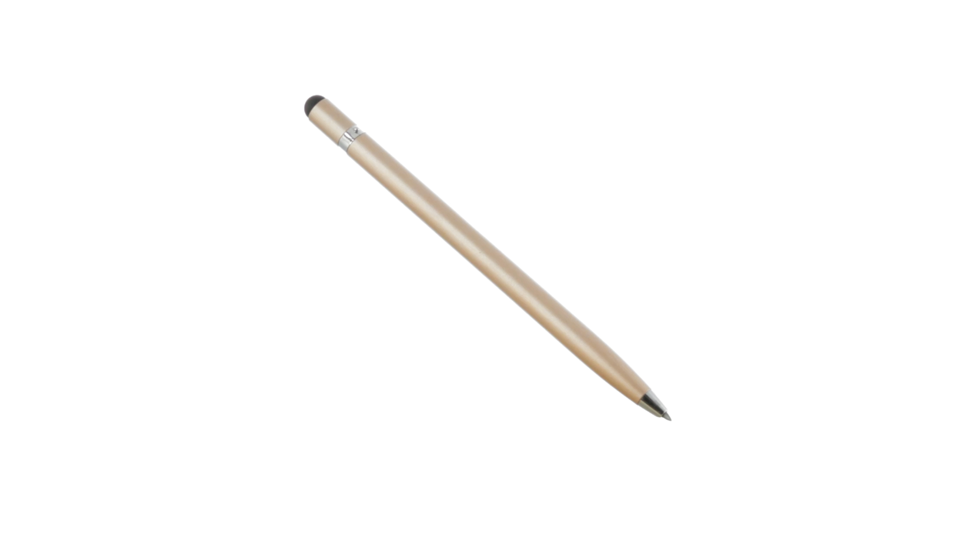 Dreh-Kugelschreiber mit Stylus aus Aluminium mit geschmeidigem Metallic-Finish und verchromtem Ring. Erhältlich in Gold, Rosa und Silber in glänzender Ausführung sowie Weiss in matter Ausführung. Blaue Tinte.