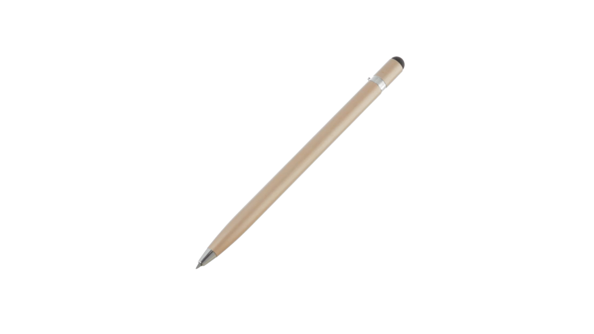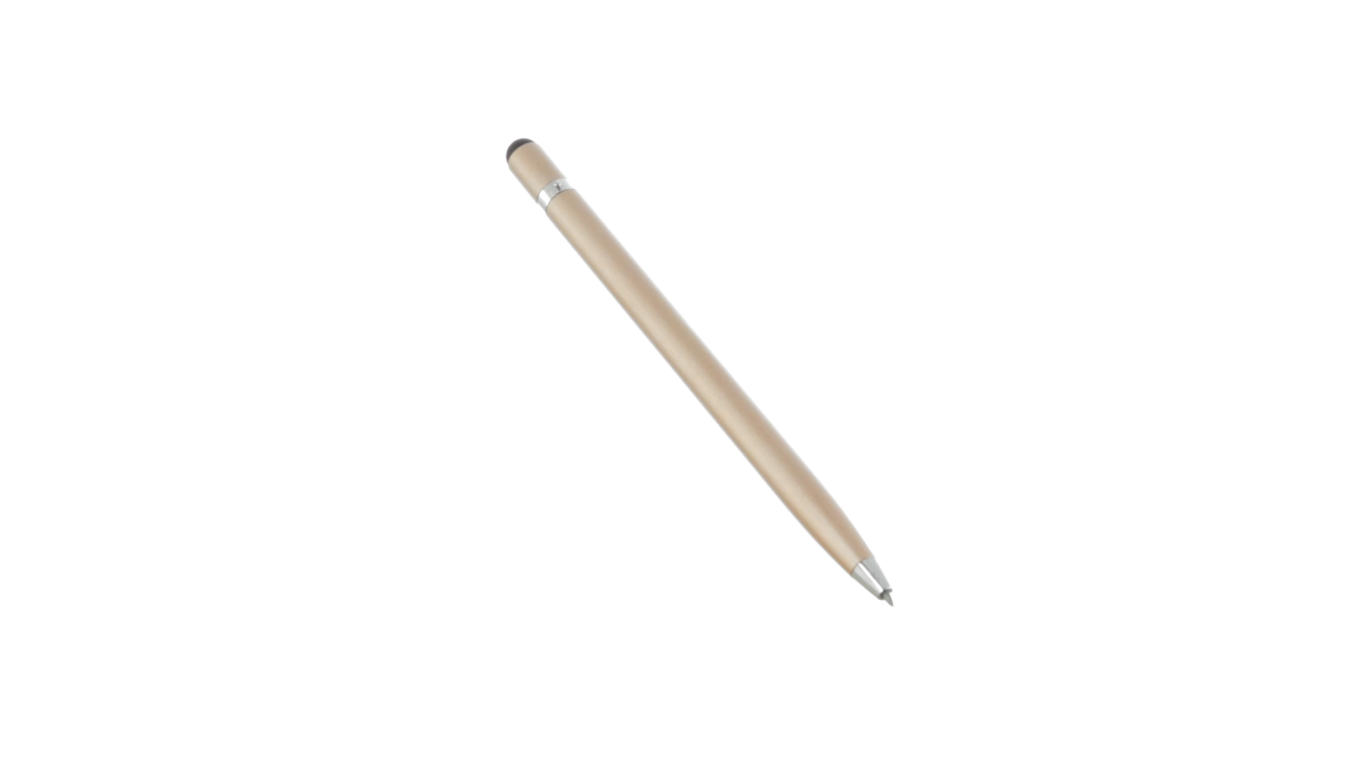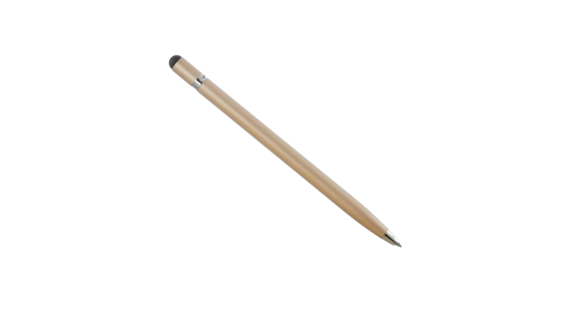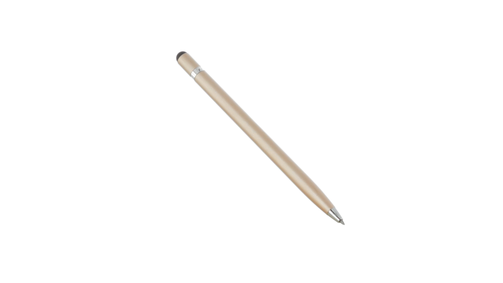 Dreh-Kugelschreiber mit Stylus aus Aluminium mit geschmeidigem Metallic-Finish und verchromtem Ring. Erhältlich in Gold, Rosa und Silber in glänzender Ausführung sowie Weiss in matter Ausführung. Blaue Tinte.