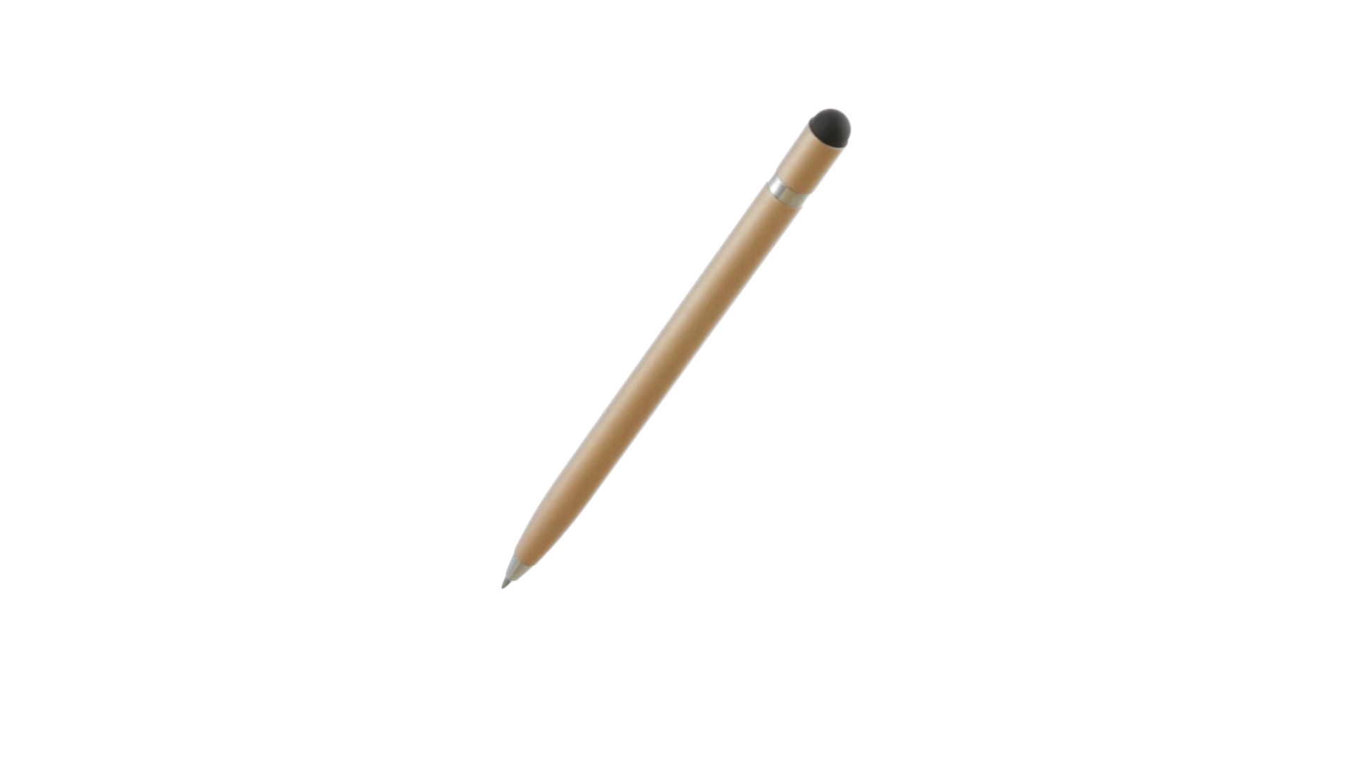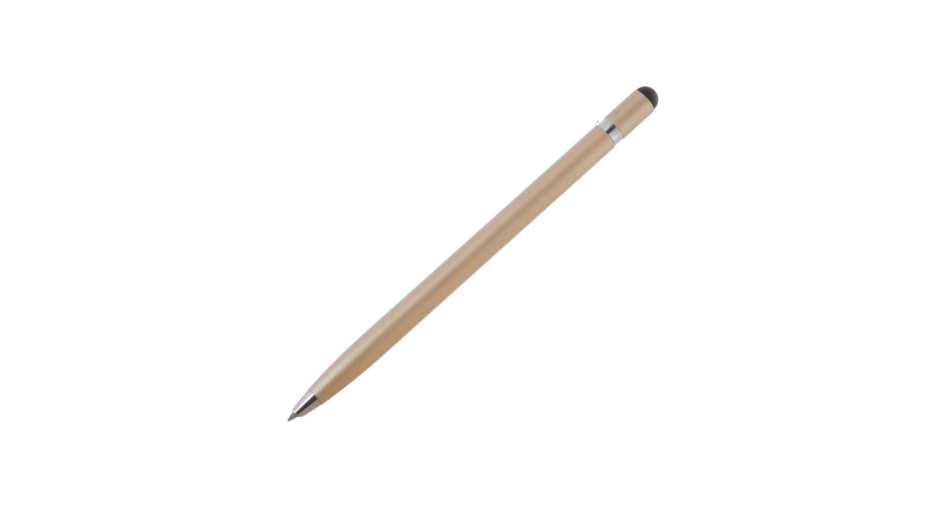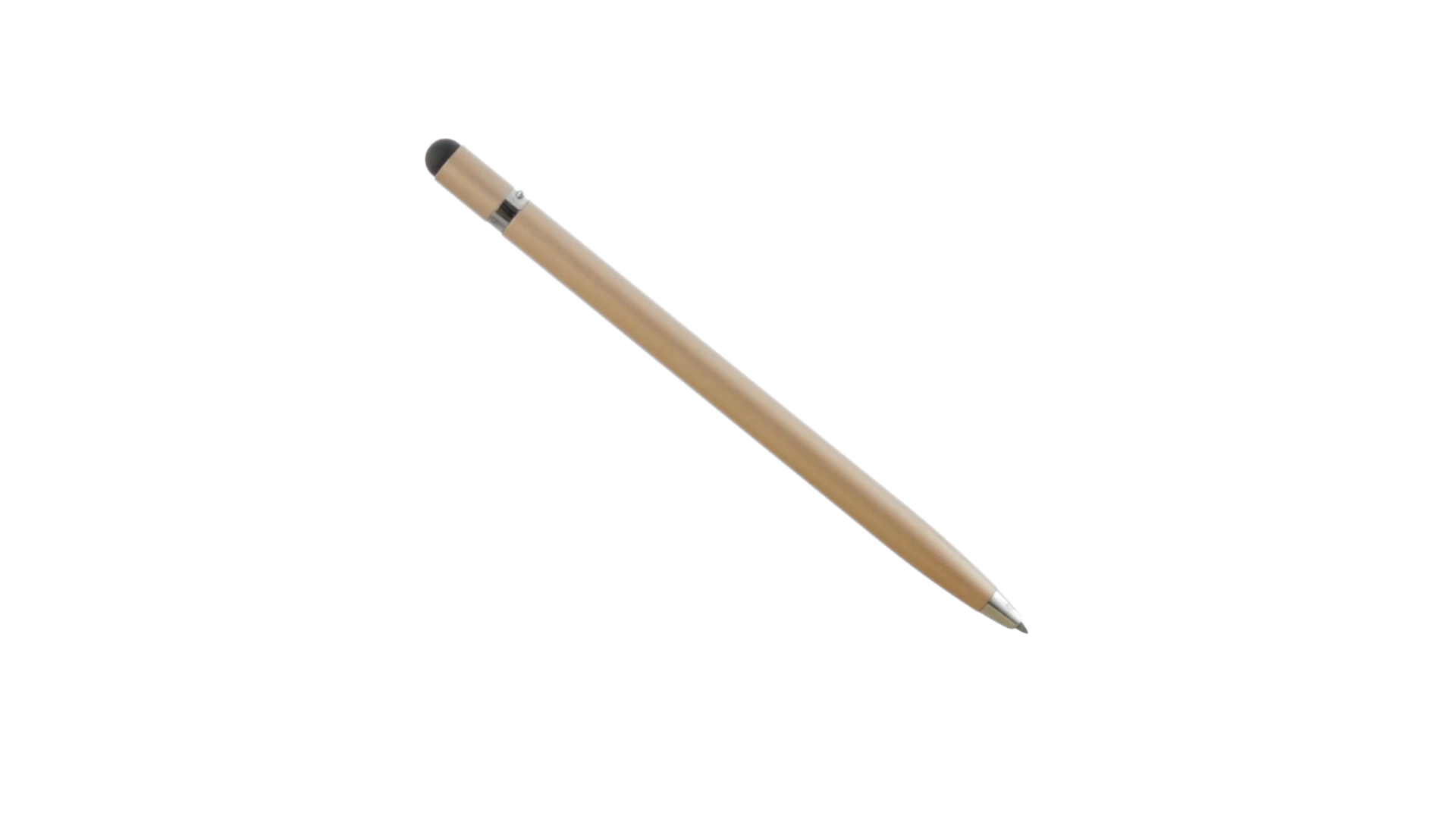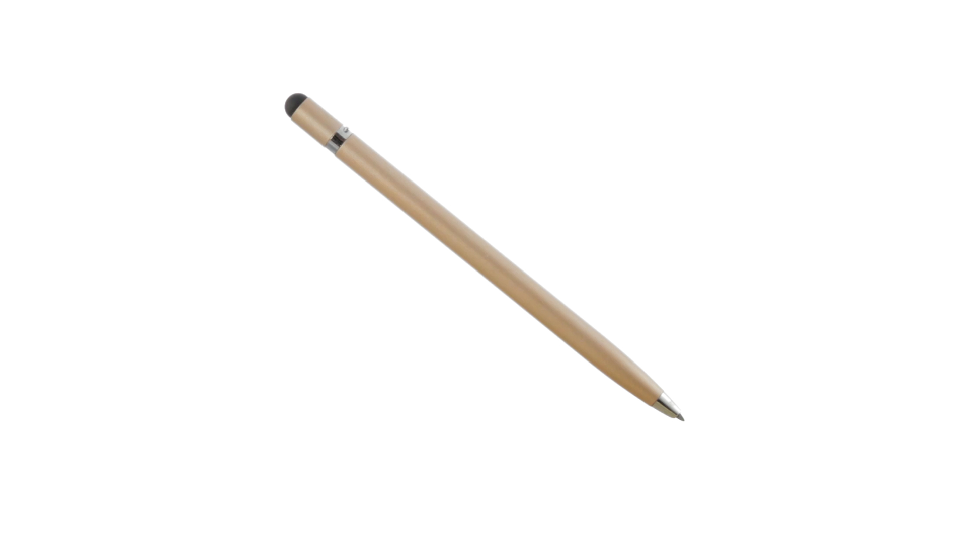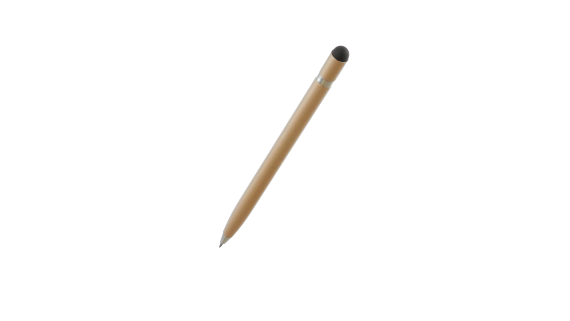 Dreh-Kugelschreiber mit Stylus aus Aluminium mit geschmeidigem Metallic-Finish und verchromtem Ring. Erhältlich in Gold, Rosa und Silber in glänzender Ausführung sowie Weiss in matter Ausführung. Blaue Tinte.