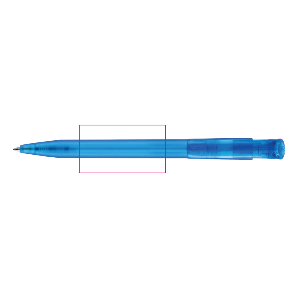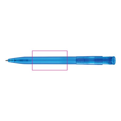 Moderner transparenter Kugelschreiber mit einem gebogenen Clip aus R-PET-Material. R-PET bedeutet recycelten PET-Kunststoff. Mit einer grossen Druckfläche ist es ein idealer Werbeartikel. Der Druckkugelschreiber wird mit einer blau schreibenden X20-Refill-Mine geliefert.