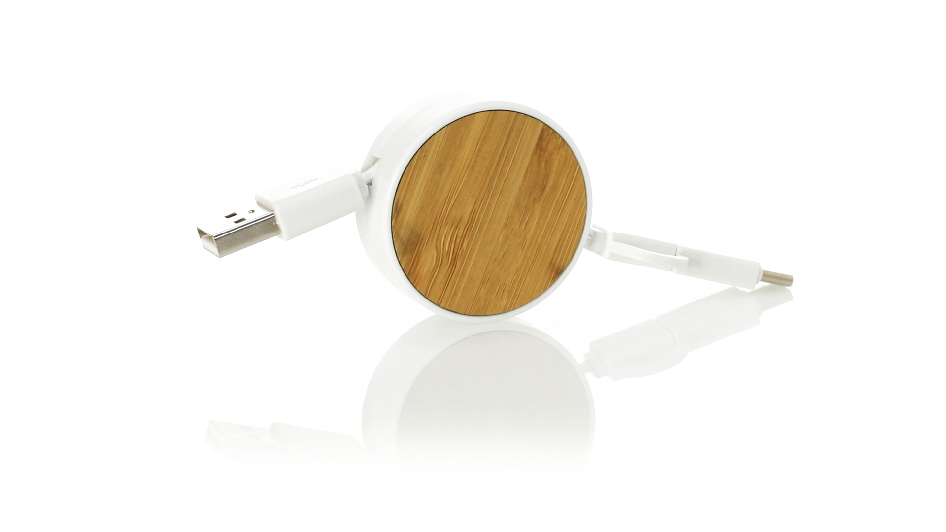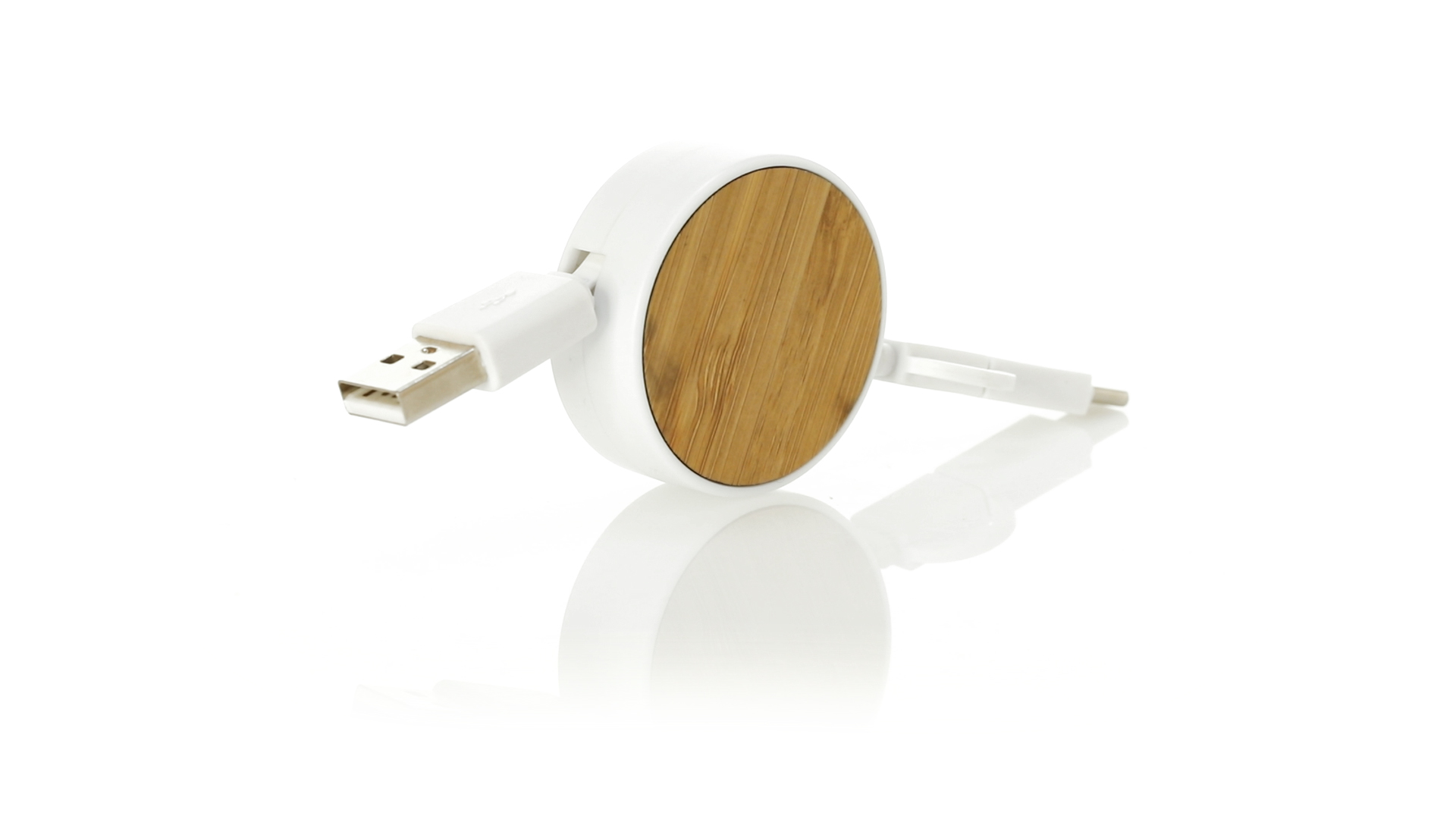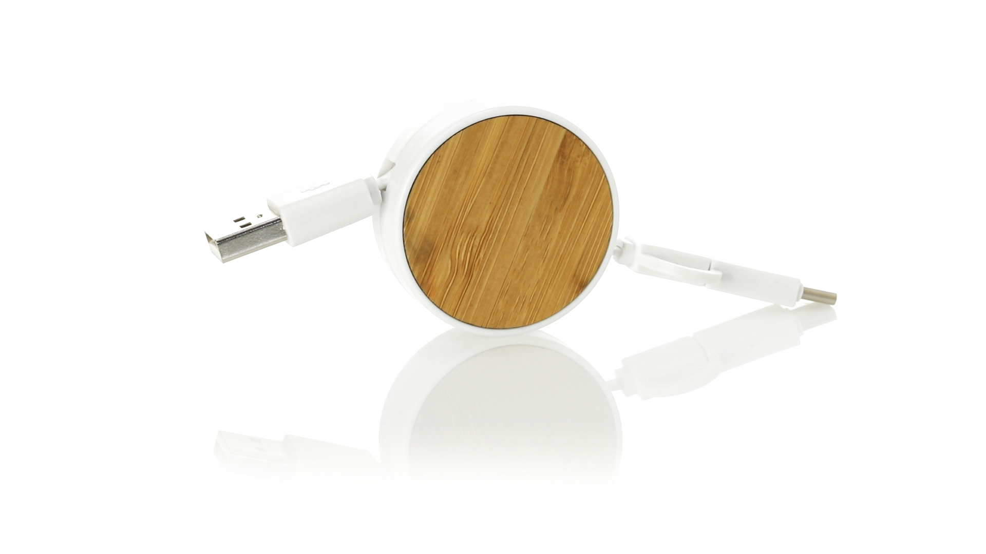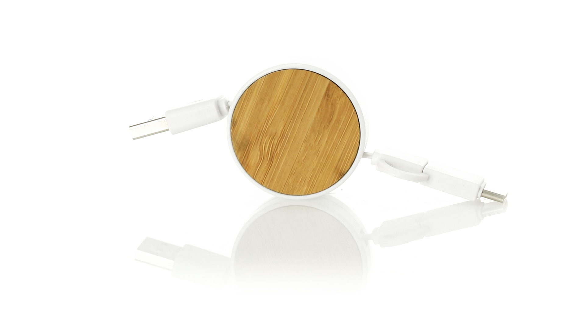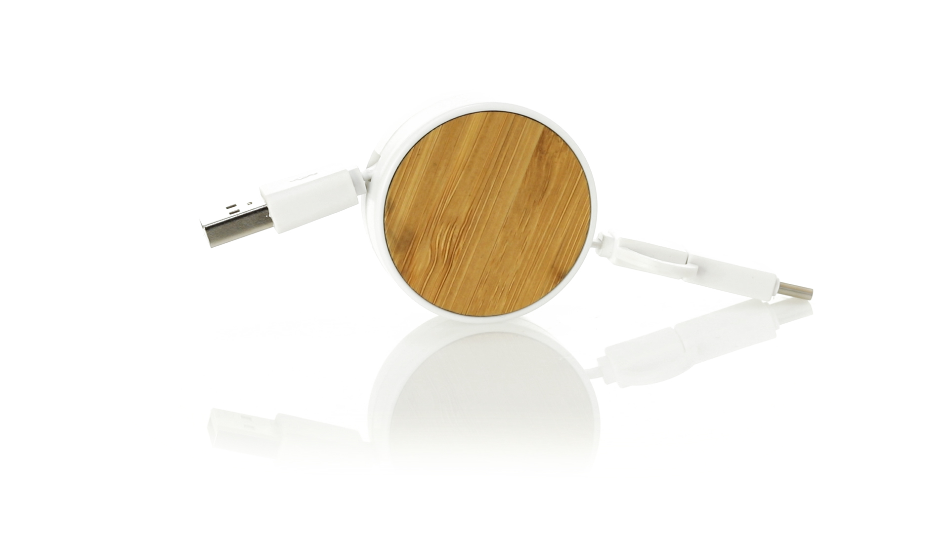 Naturlinie, einziehbares Ladegerät in ultrakompaktem Design. Hergestellt aus Bambus, aus natürlich geschnittenen Bambusstücken. Typ C und zwei Mikro-USB-Beleuchtungsanschlüsse. Breite Druckfläche und in einer attraktiven, individuellen Öko-Design-Box erhältlich.