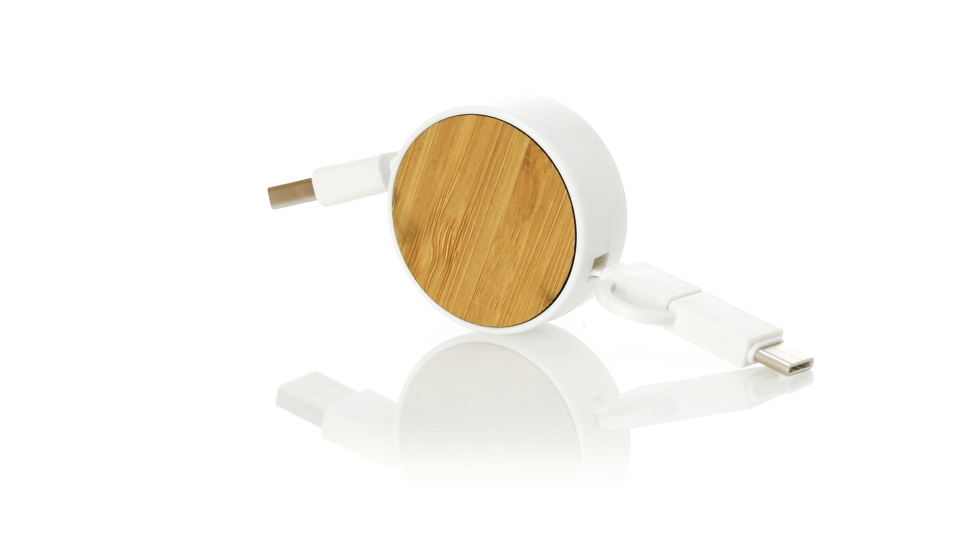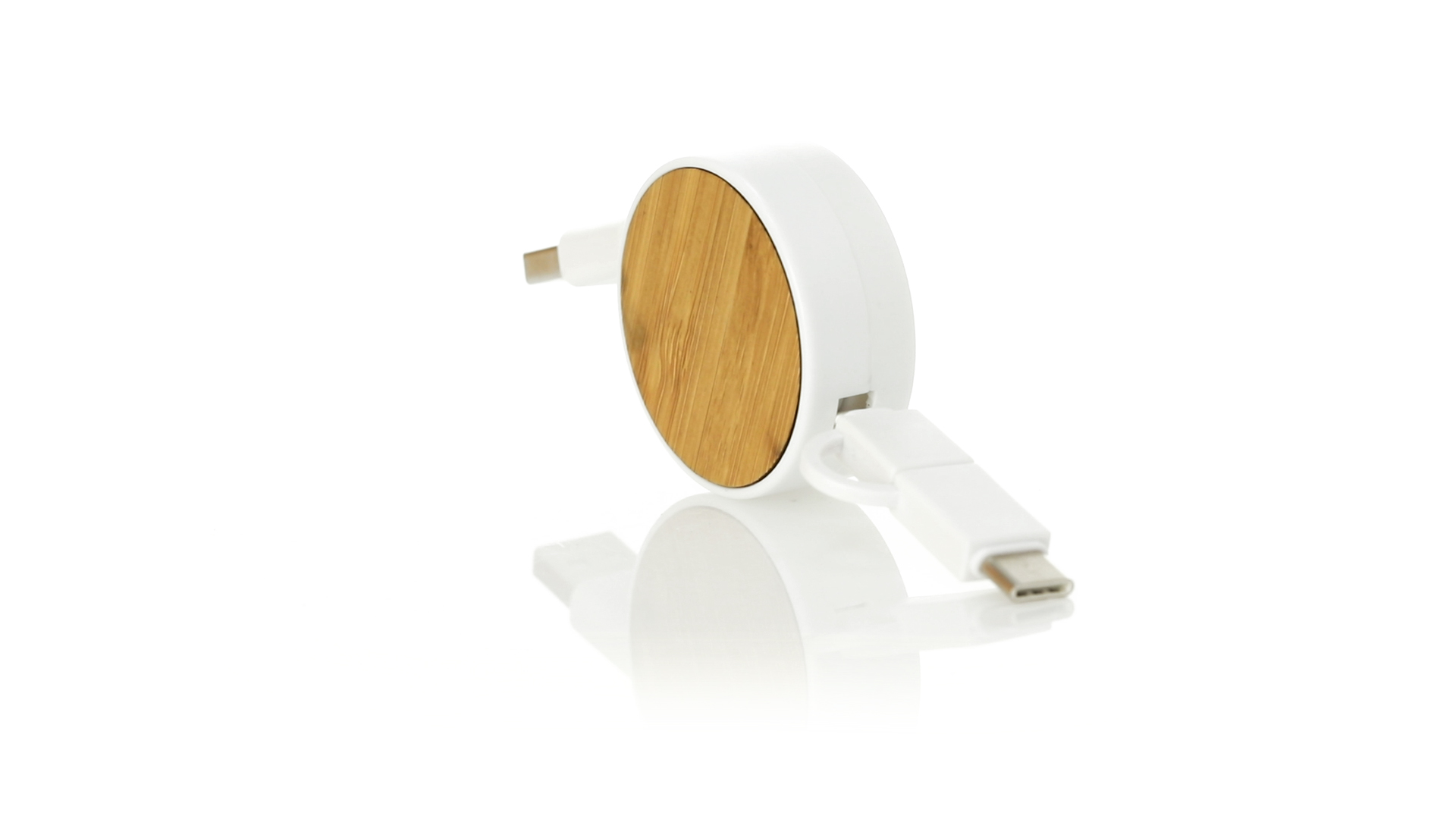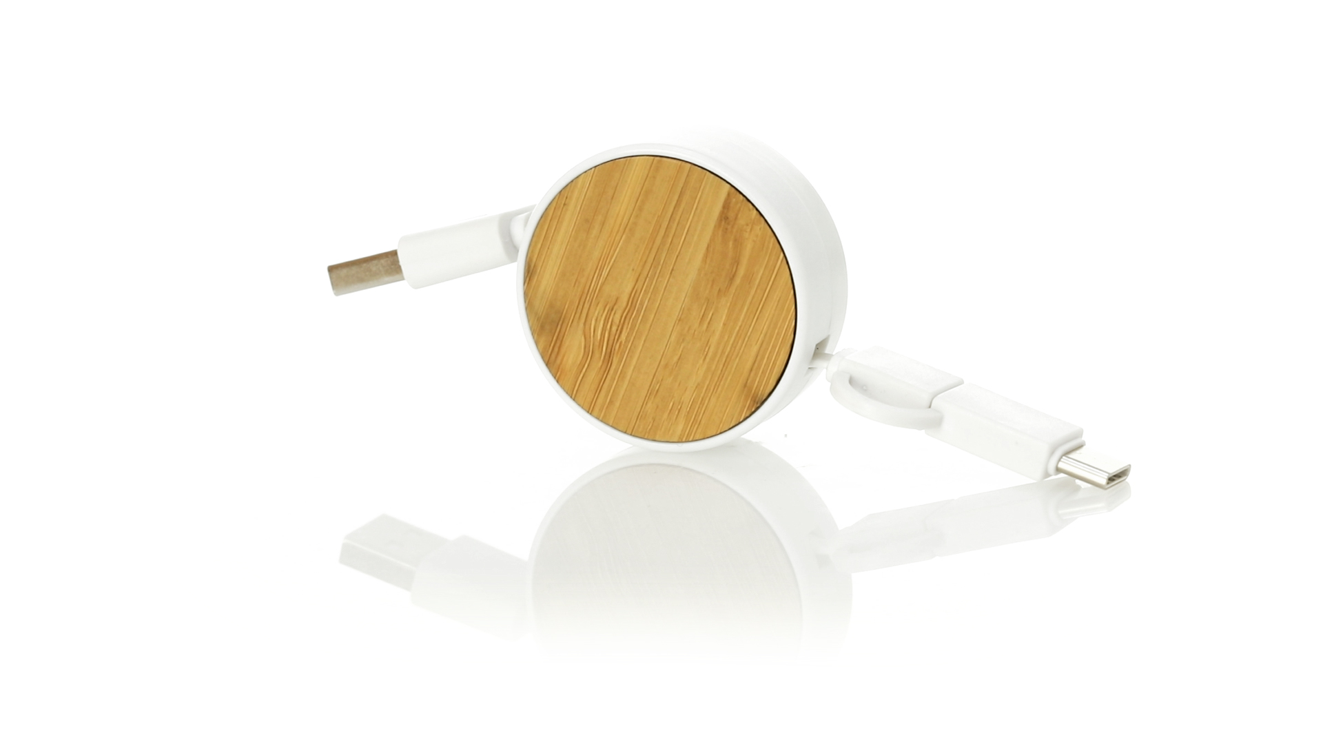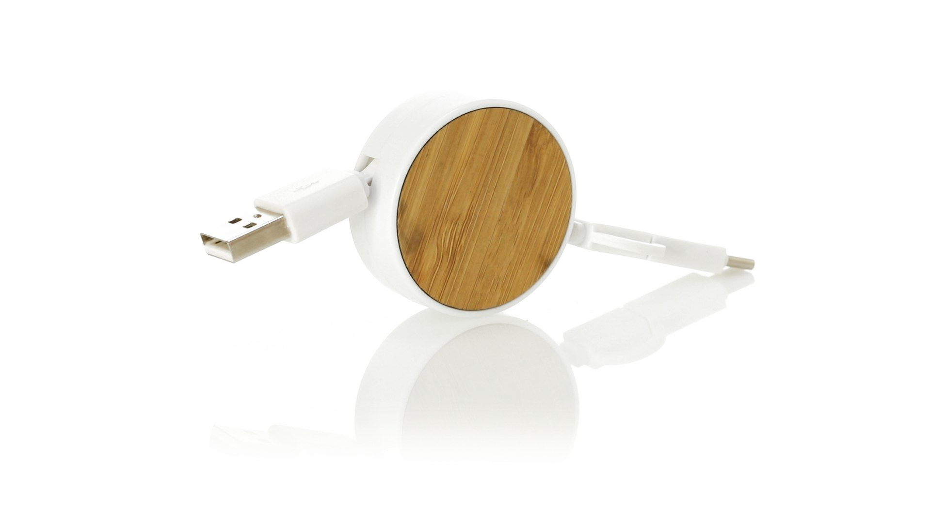 Naturlinie, einziehbares Ladegerät in ultrakompaktem Design. Hergestellt aus Bambus, aus natürlich geschnittenen Bambusstücken. Typ C und zwei Mikro-USB-Beleuchtungsanschlüsse. Breite Druckfläche und in einer attraktiven, individuellen Öko-Design-Box erhältlich.