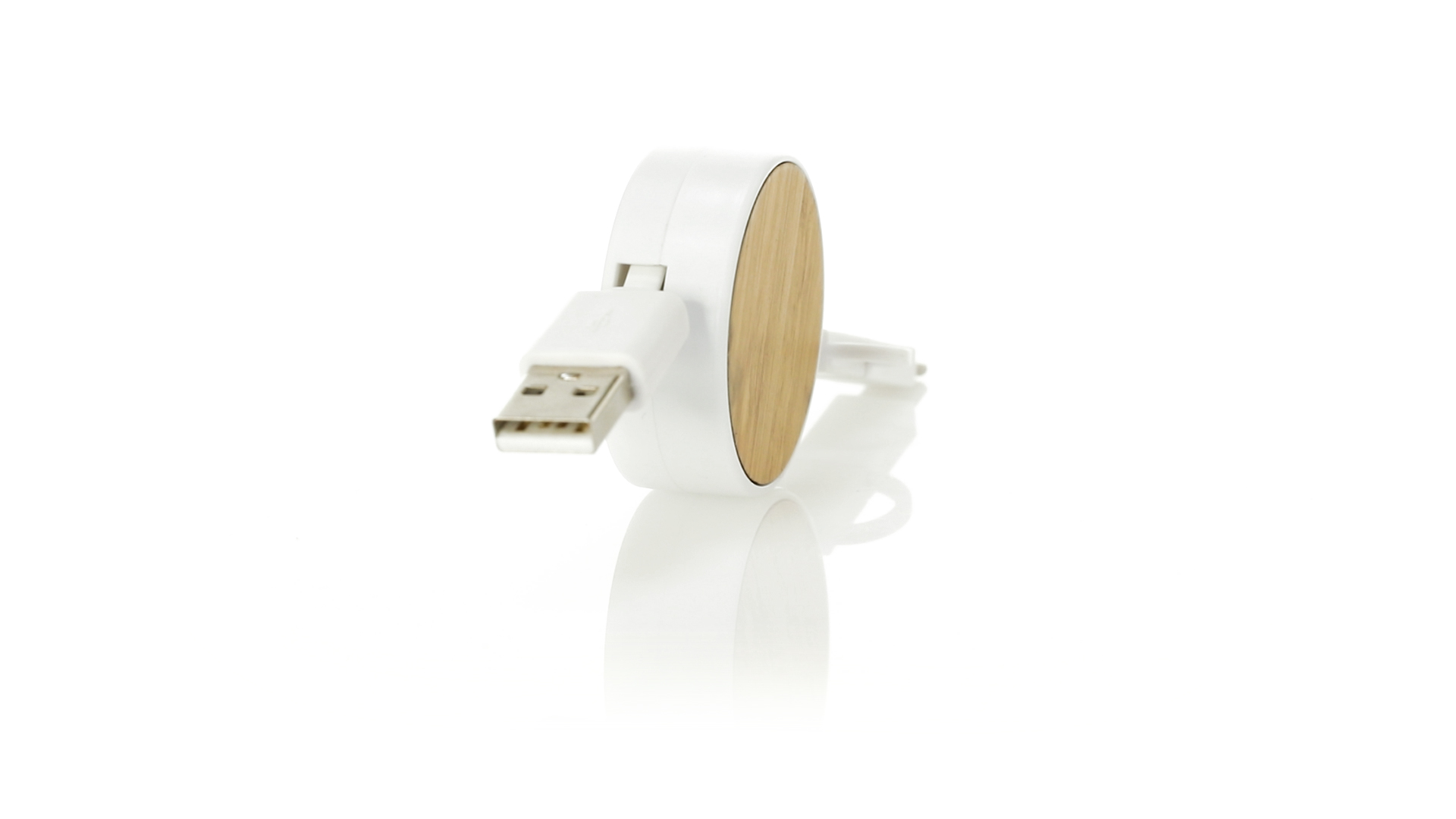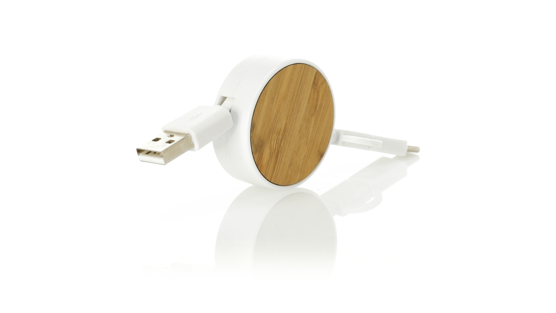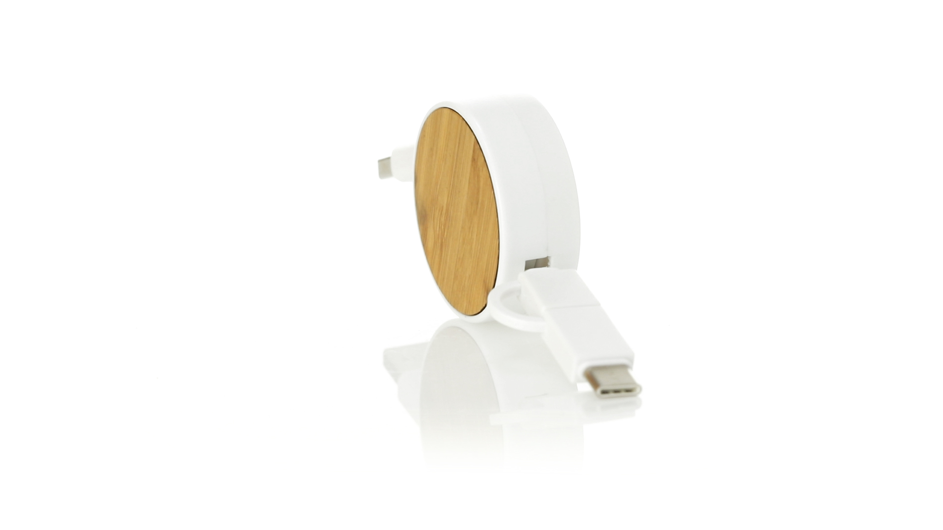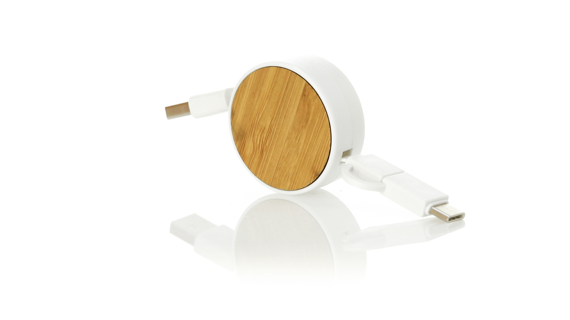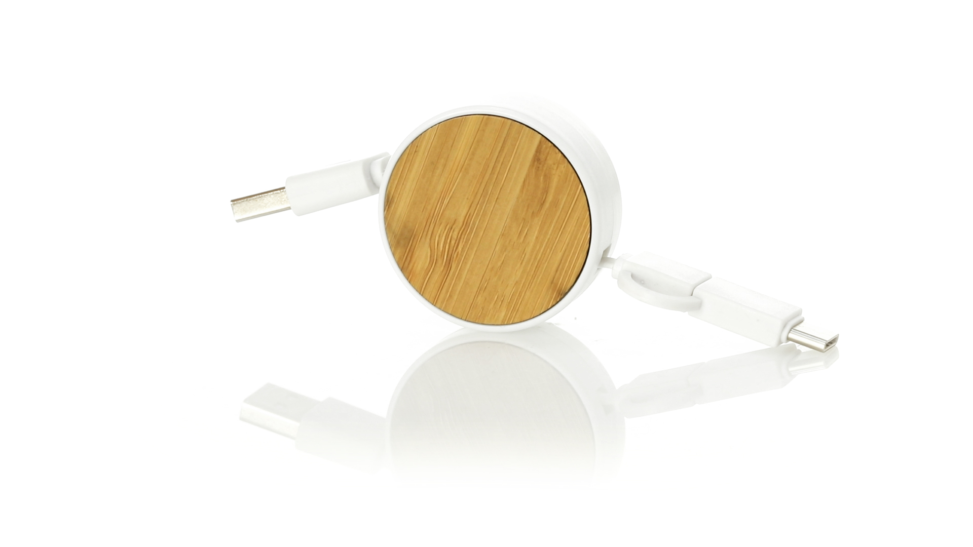 Naturlinie, einziehbares Ladegerät in ultrakompaktem Design. Hergestellt aus Bambus, aus natürlich geschnittenen Bambusstücken. Typ C und zwei Mikro-USB-Beleuchtungsanschlüsse. Breite Druckfläche und in einer attraktiven, individuellen Öko-Design-Box erhältlich.