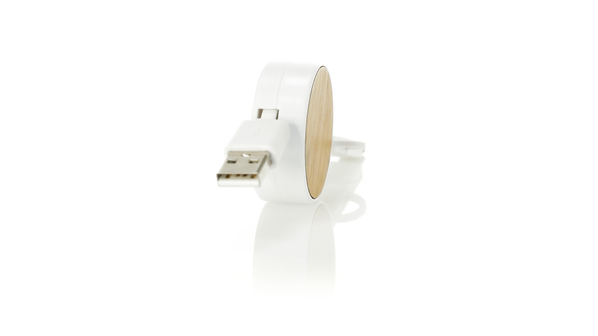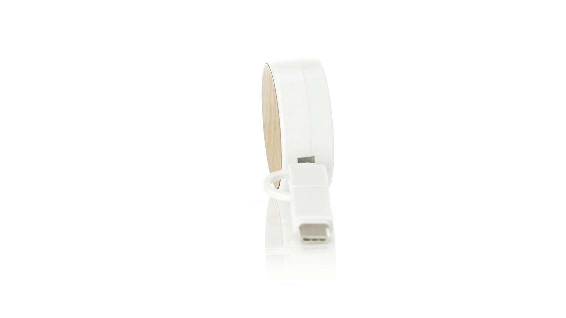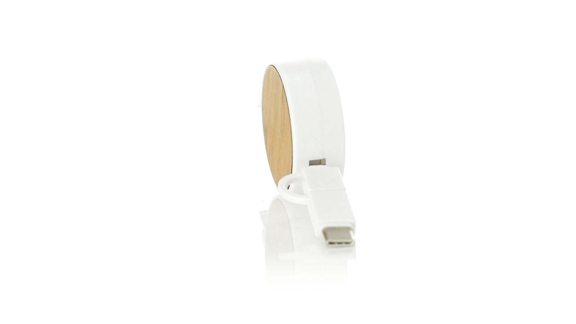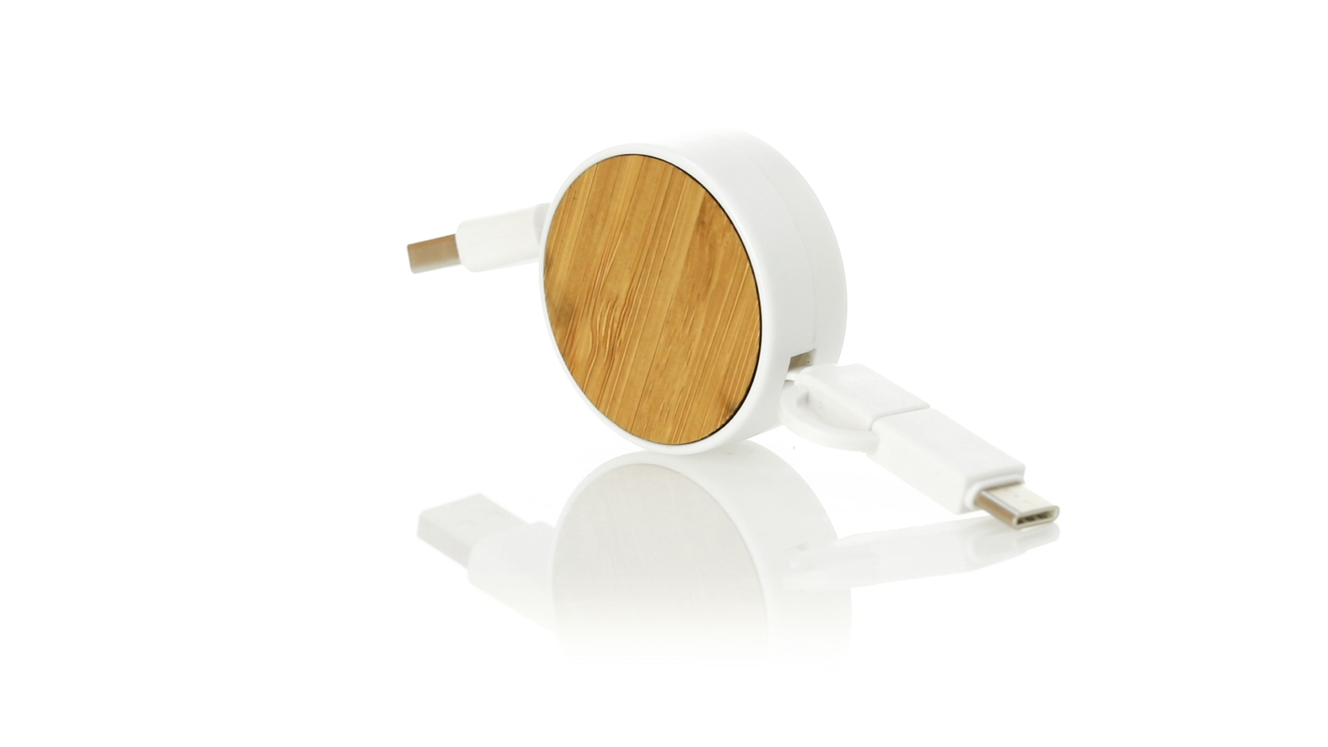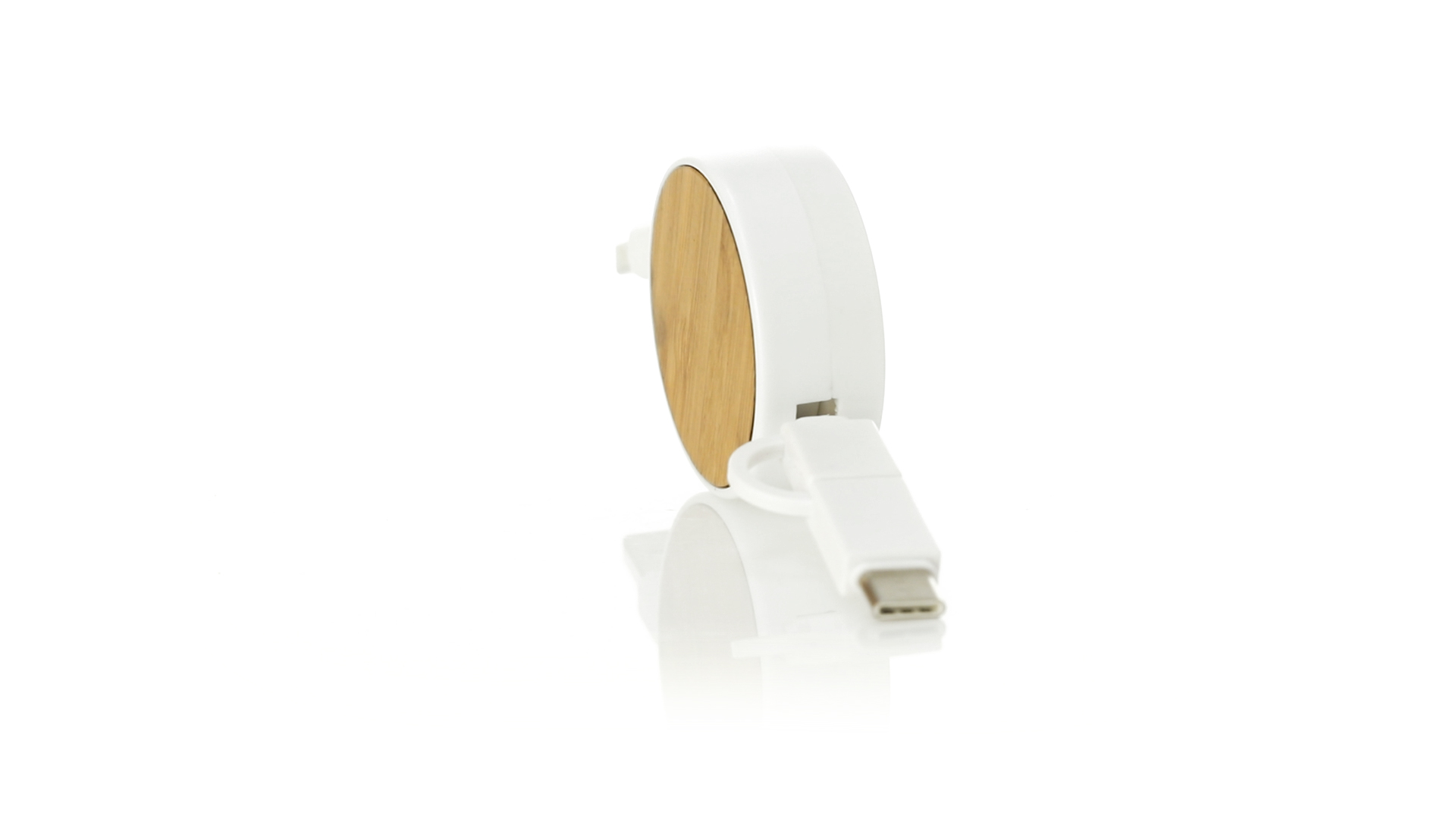 Naturlinie, einziehbares Ladegerät in ultrakompaktem Design. Hergestellt aus Bambus, aus natürlich geschnittenen Bambusstücken. Typ C und zwei Mikro-USB-Beleuchtungsanschlüsse. Breite Druckfläche und in einer attraktiven, individuellen Öko-Design-Box erhältlich.