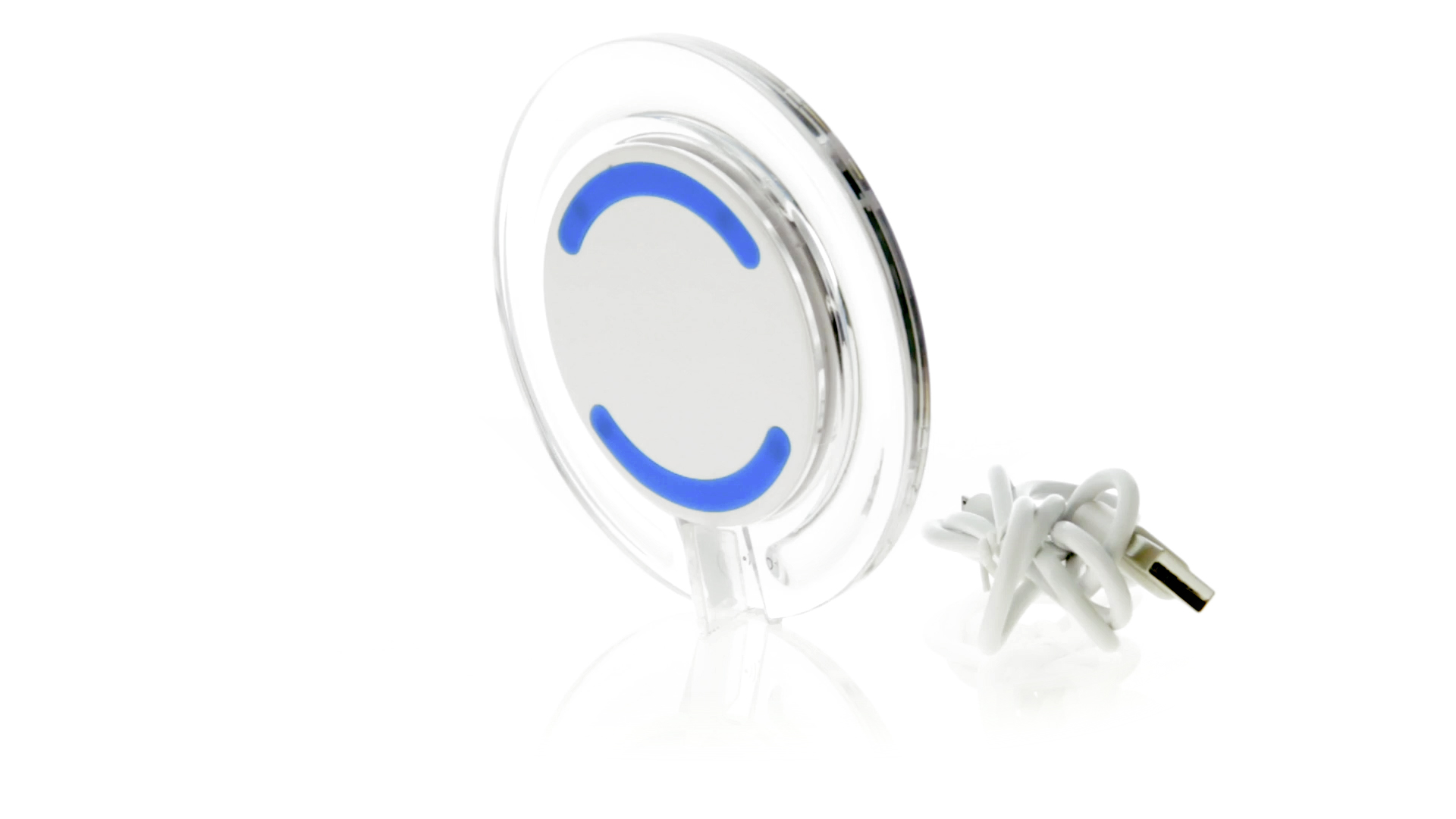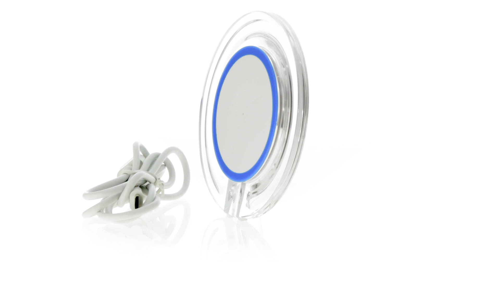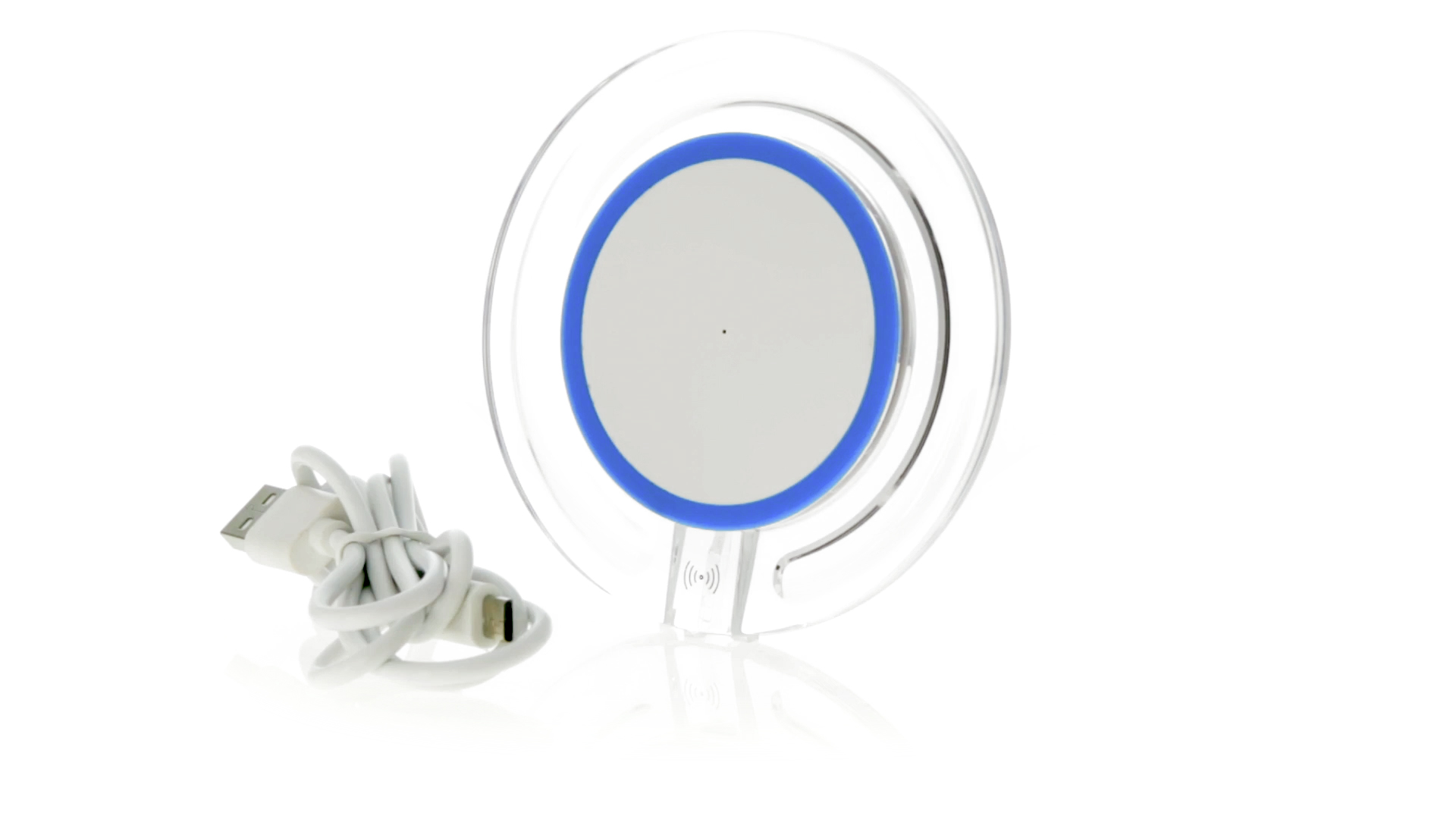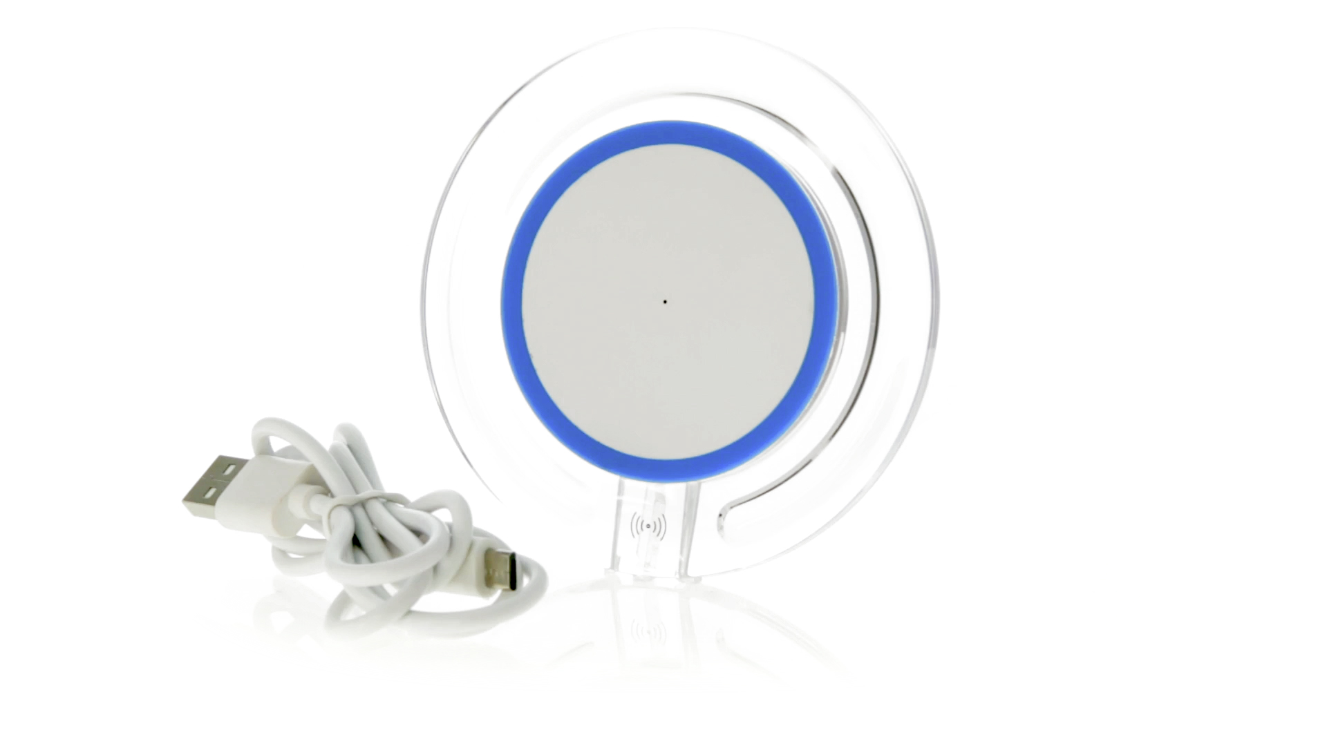 Kabelloses, rundes Ladegerät mit QI-Technologie (induktive Energieübertragung) und transparentem Gehäuse in verschiedenen lebendigen Farben. Mit rutschfester Unterseite und LED-Ladeanzeige. Kompatibel mit Geräten, die mit kabelloser Ladetechnik ausgestattet sind. Präsentiert in einer attraktiven Designbox.