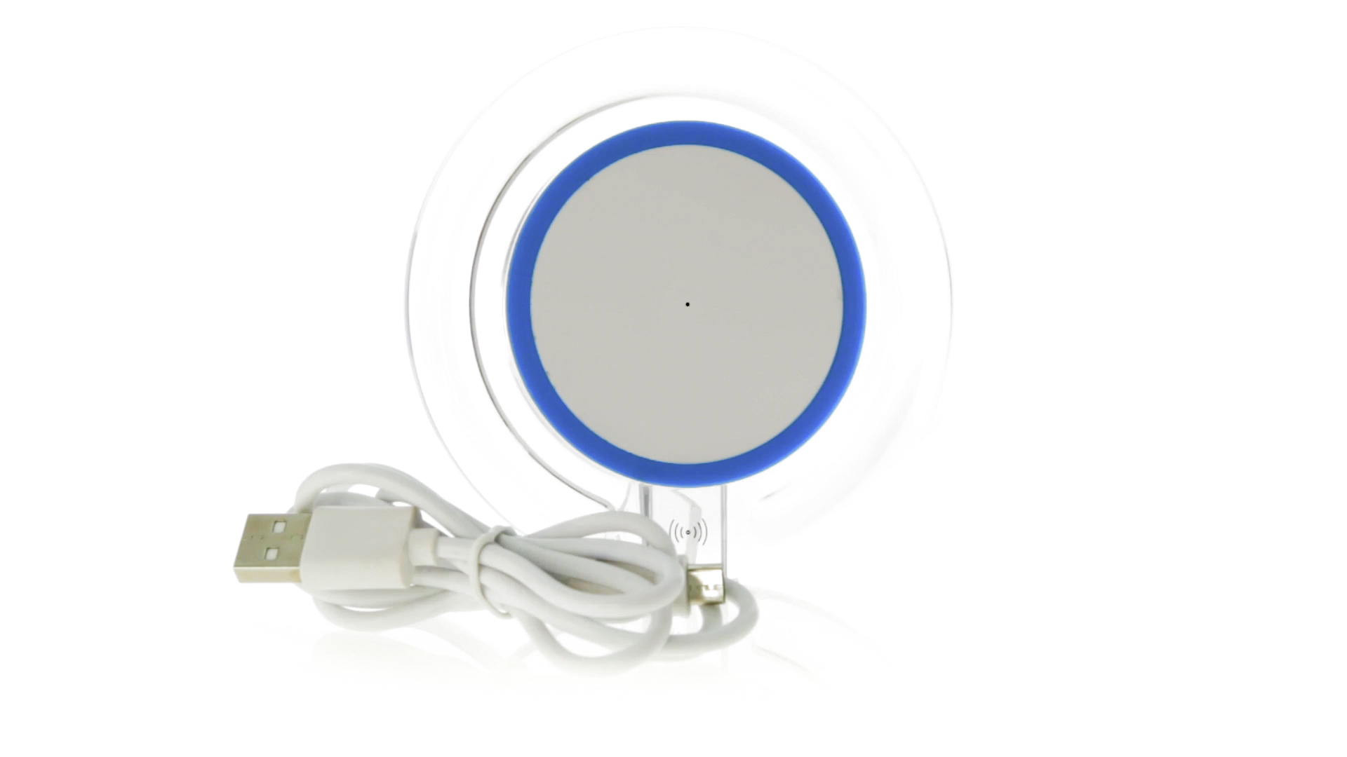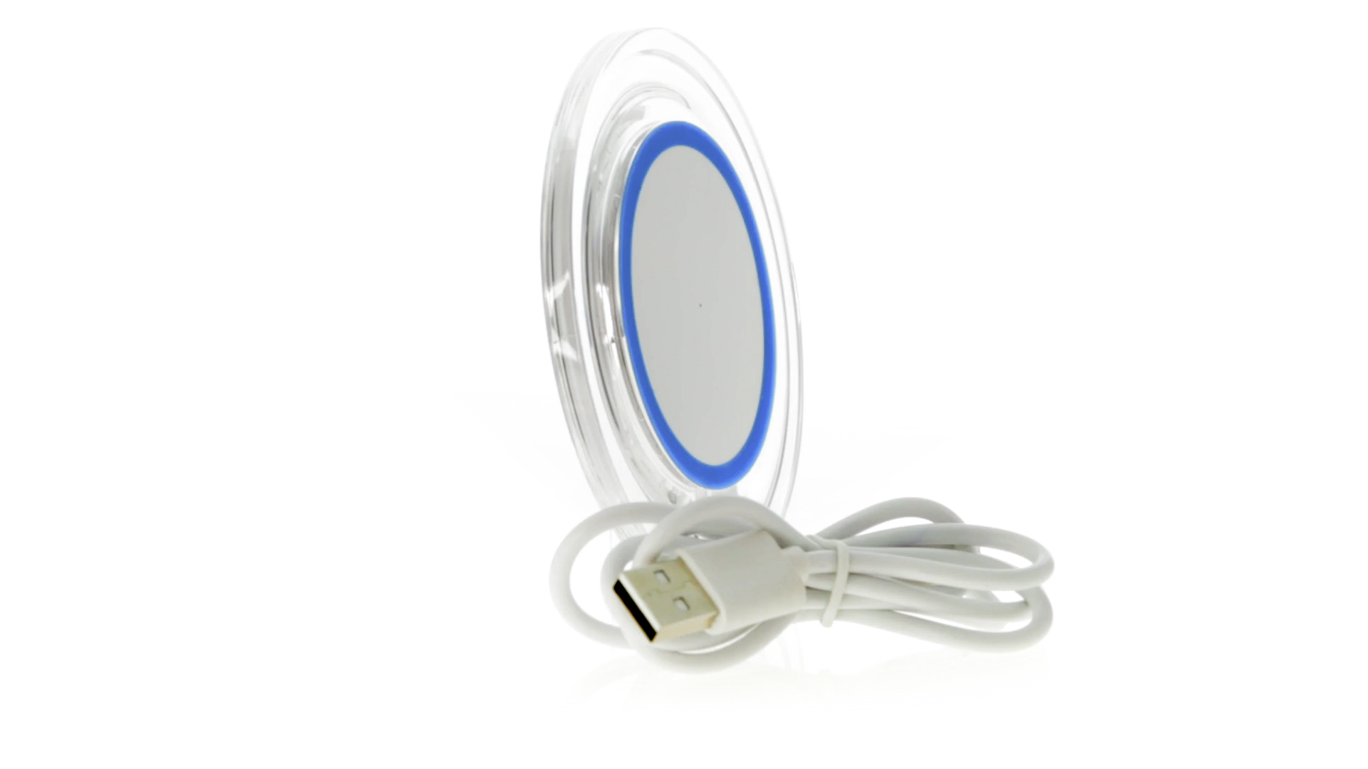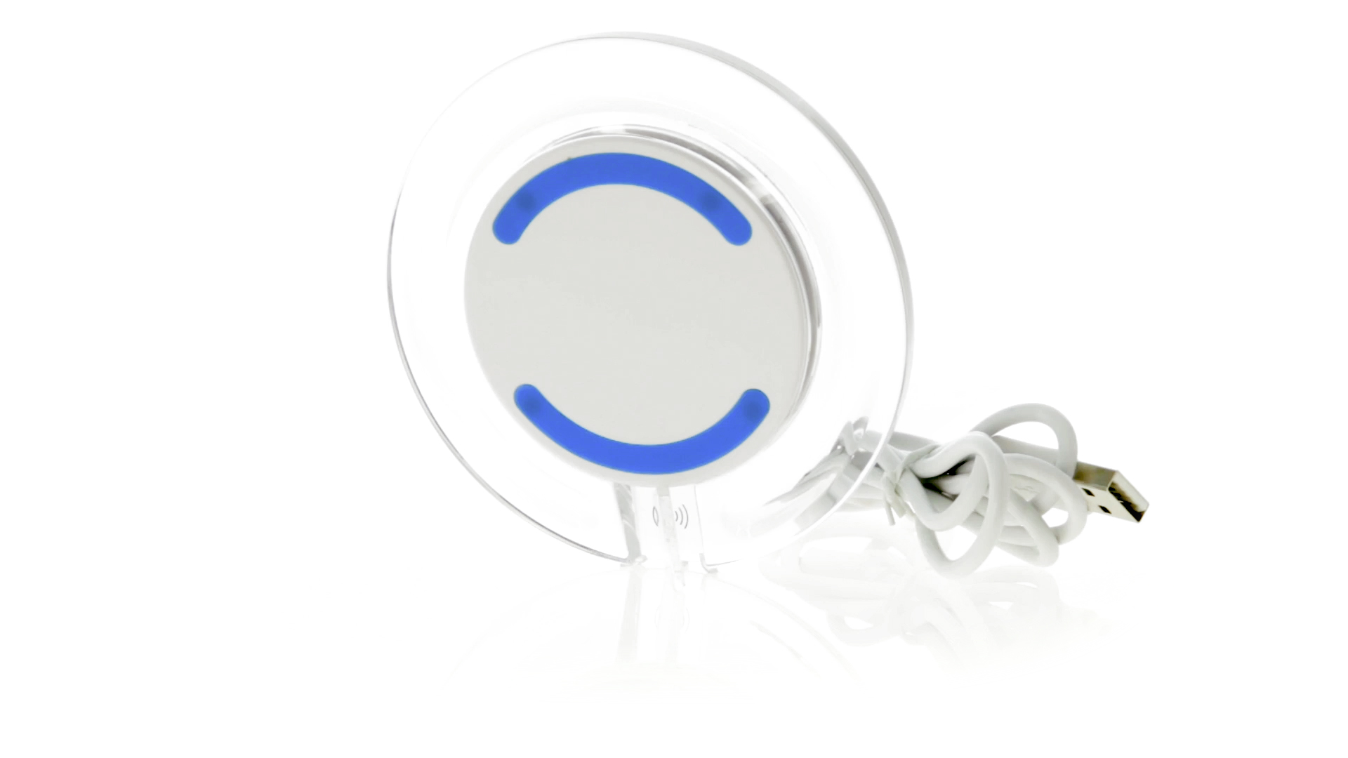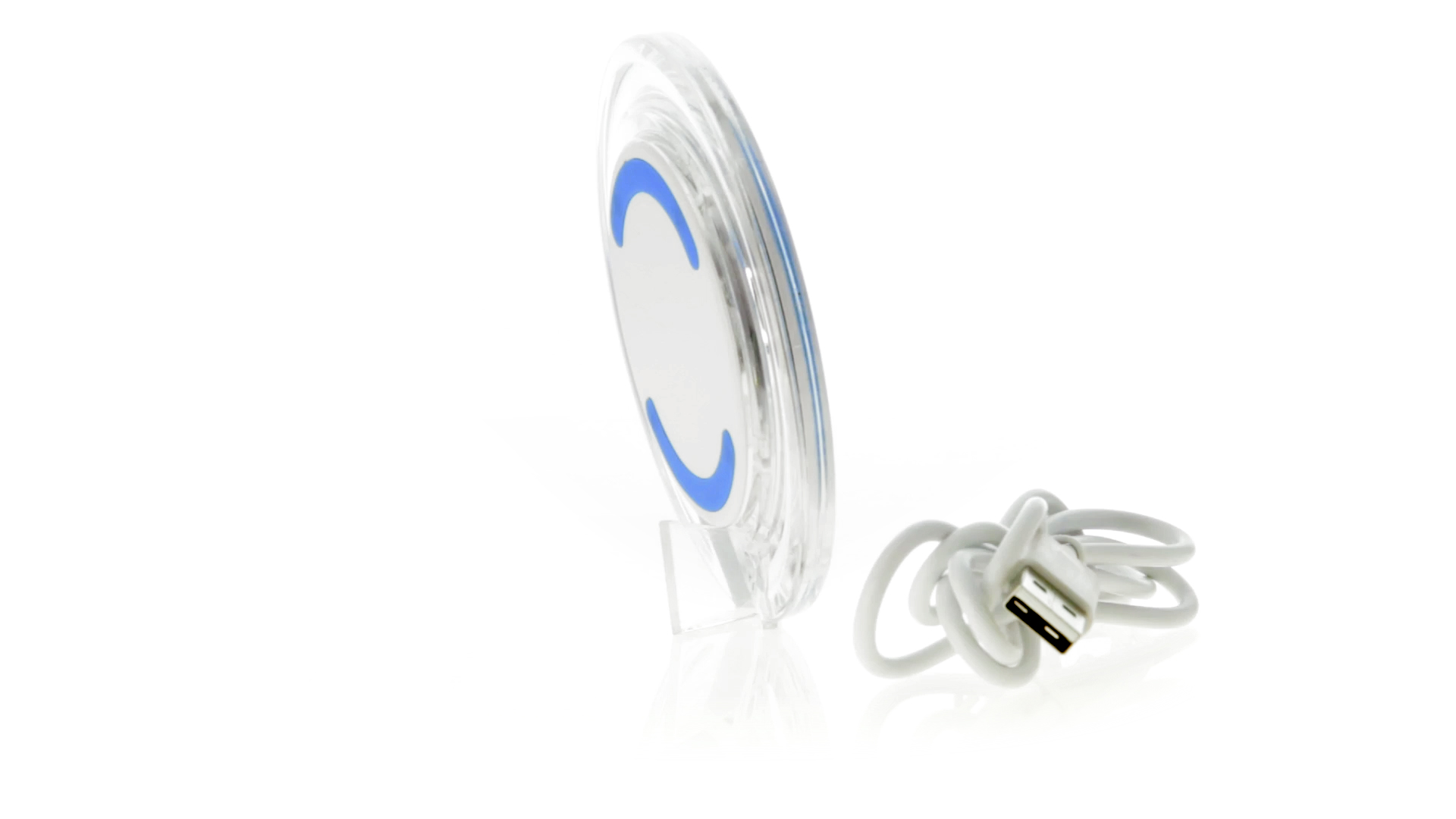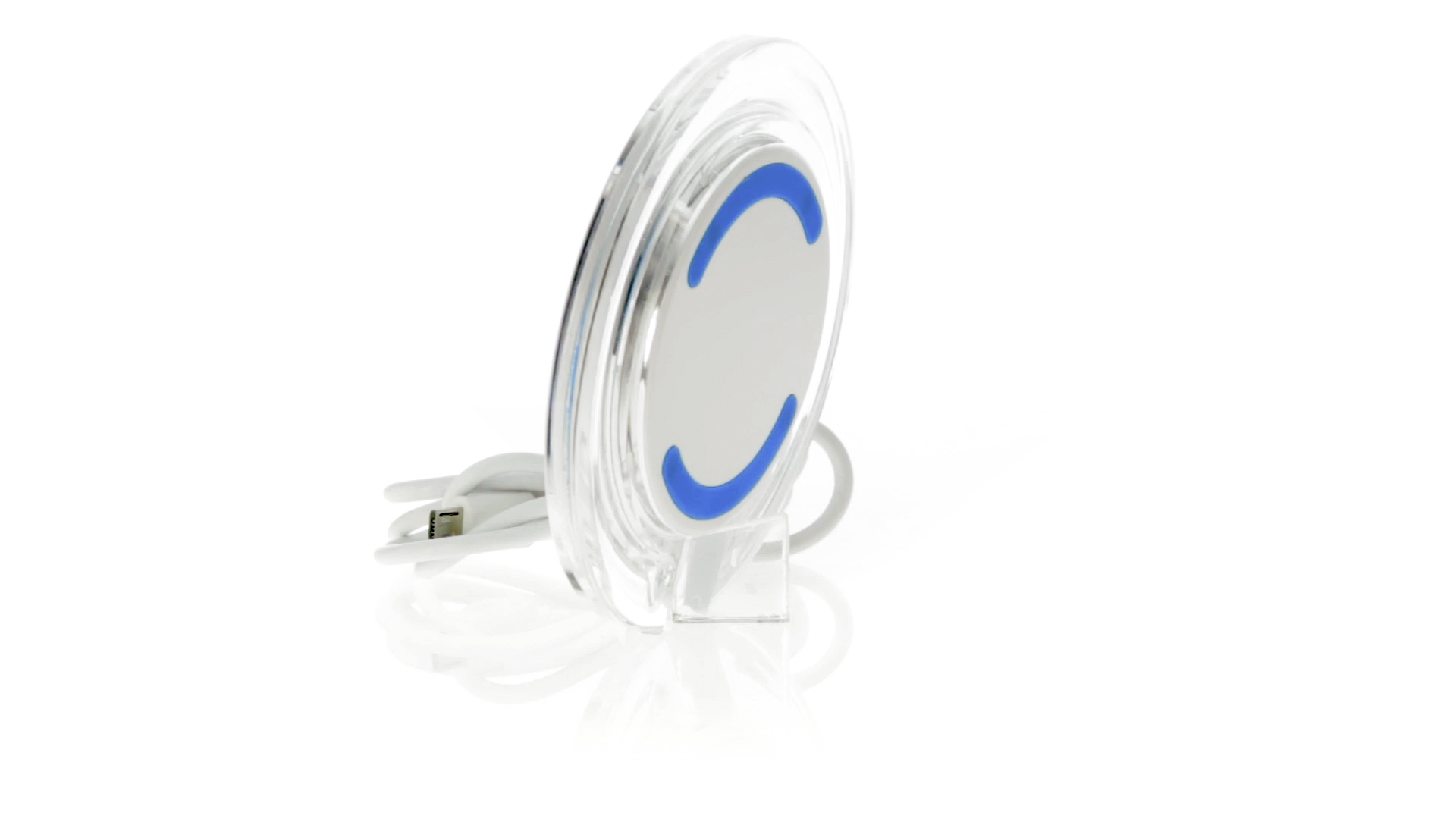 Kabelloses, rundes Ladegerät mit QI-Technologie (induktive Energieübertragung) und transparentem Gehäuse in verschiedenen lebendigen Farben. Mit rutschfester Unterseite und LED-Ladeanzeige. Kompatibel mit Geräten, die mit kabelloser Ladetechnik ausgestattet sind. Präsentiert in einer attraktiven Designbox.