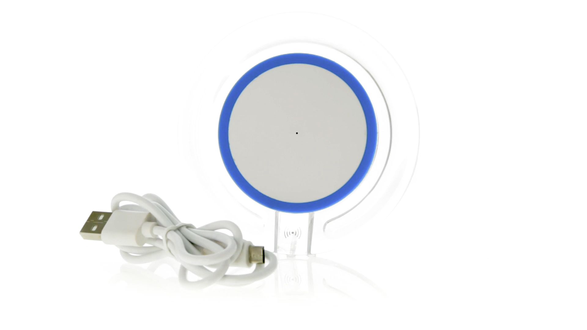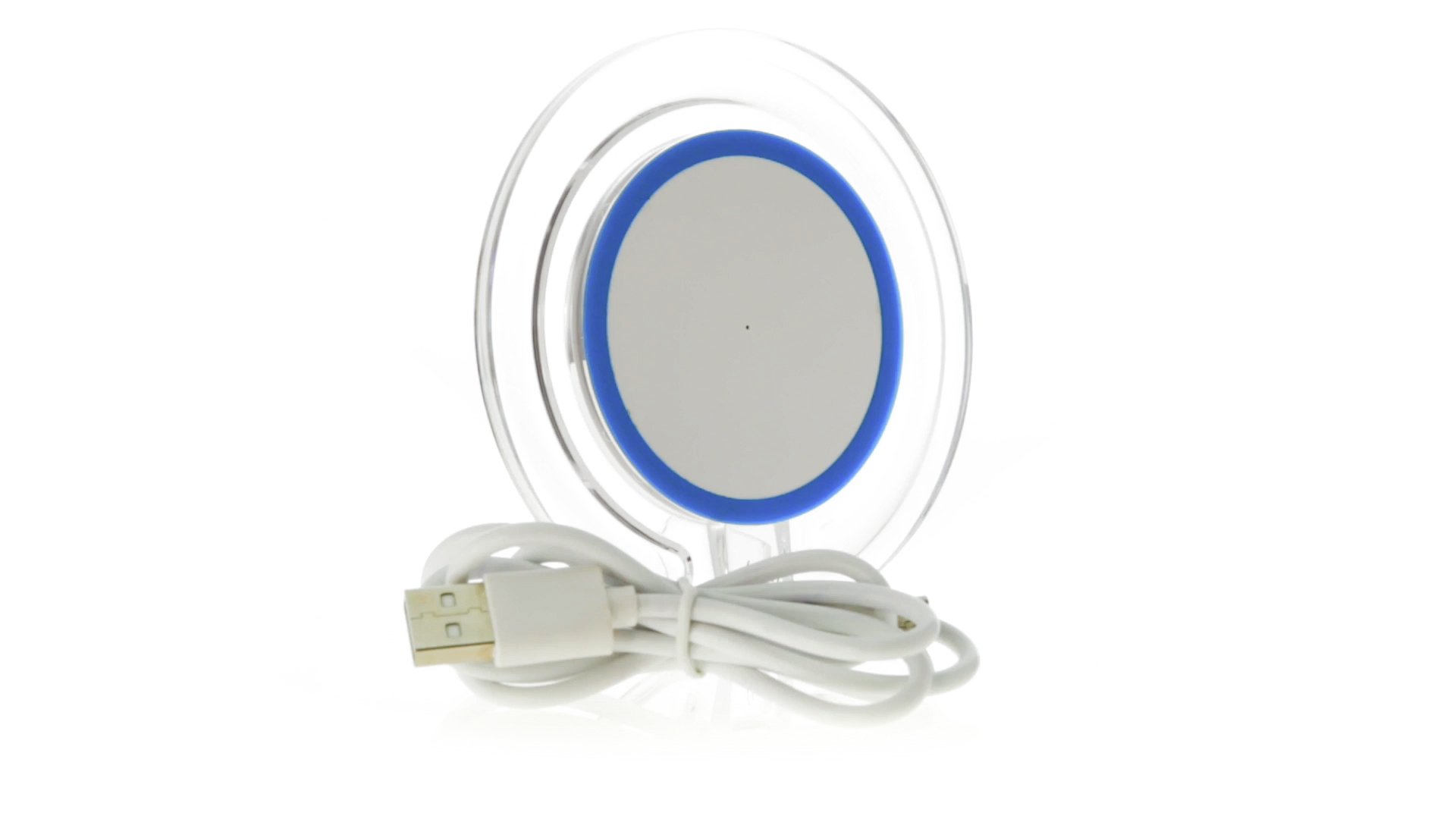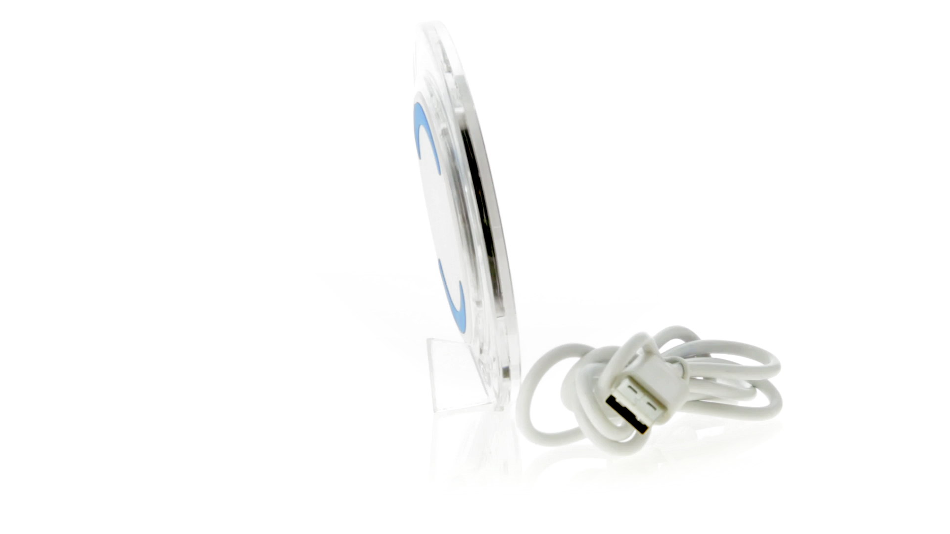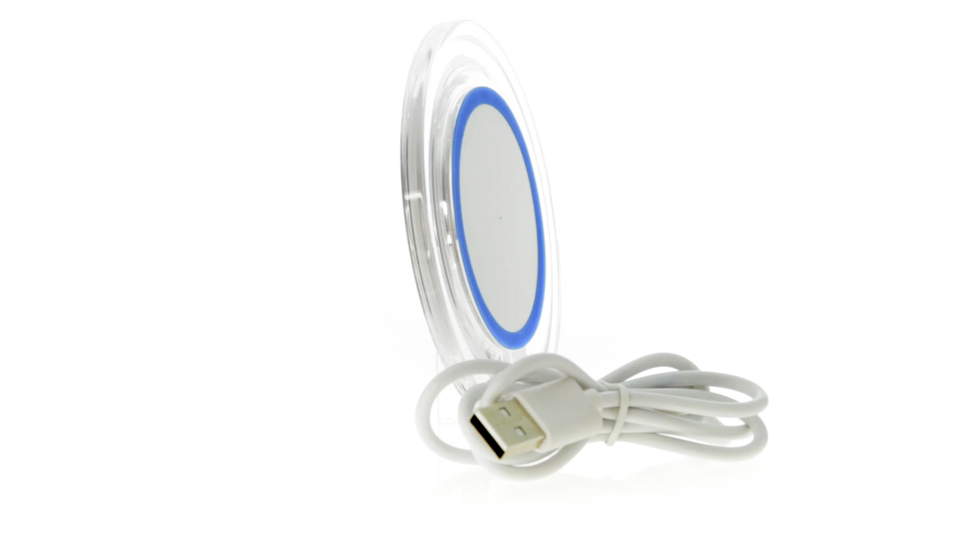 Kabelloses, rundes Ladegerät mit QI-Technologie (induktive Energieübertragung) und transparentem Gehäuse in verschiedenen lebendigen Farben. Mit rutschfester Unterseite und LED-Ladeanzeige. Kompatibel mit Geräten, die mit kabelloser Ladetechnik ausgestattet sind. Präsentiert in einer attraktiven Designbox.