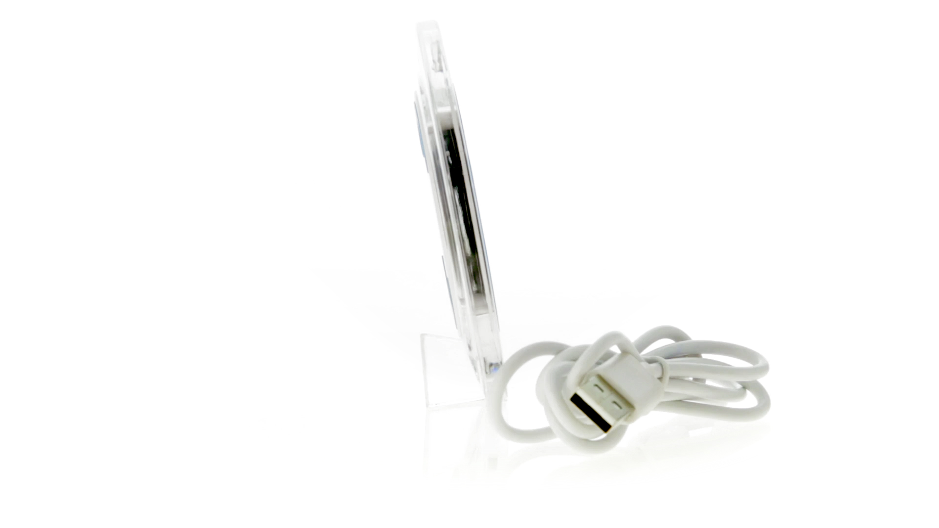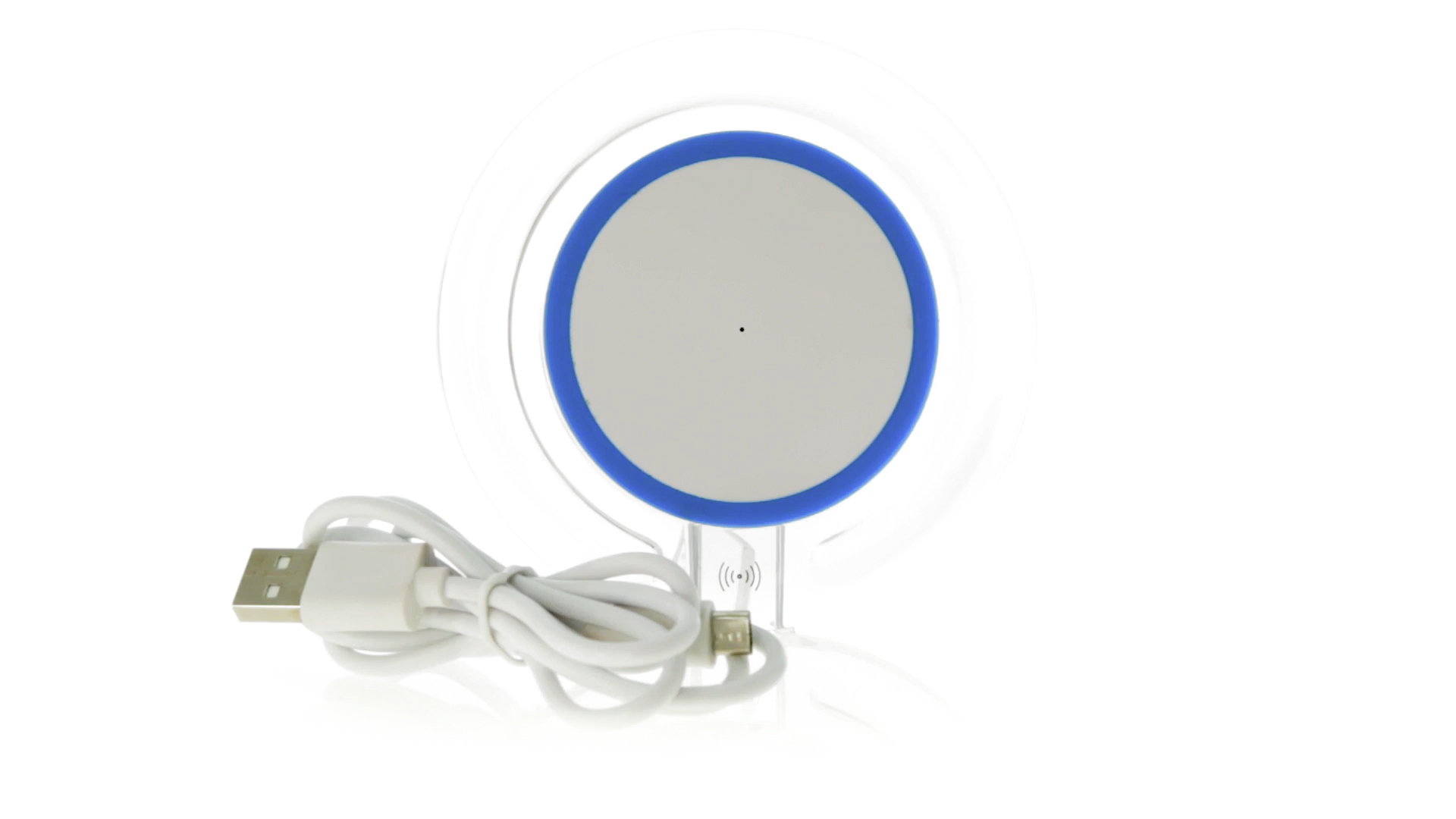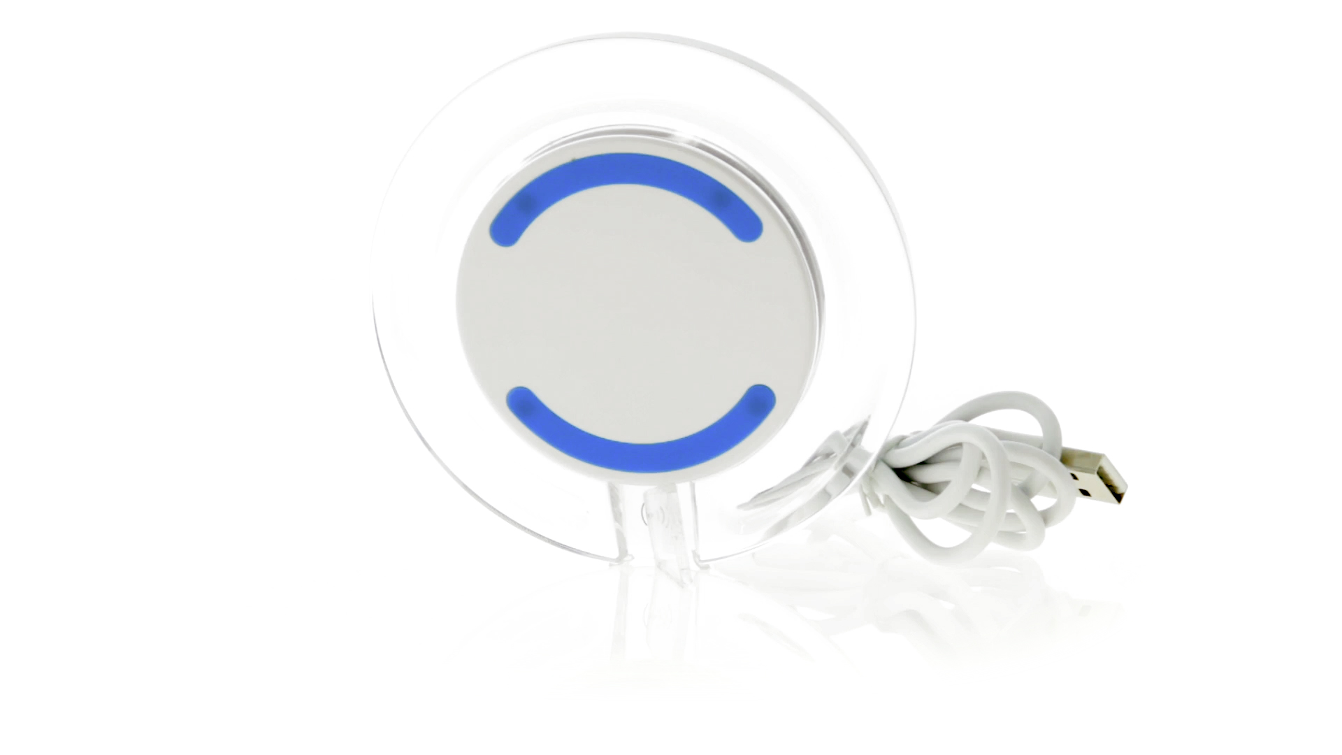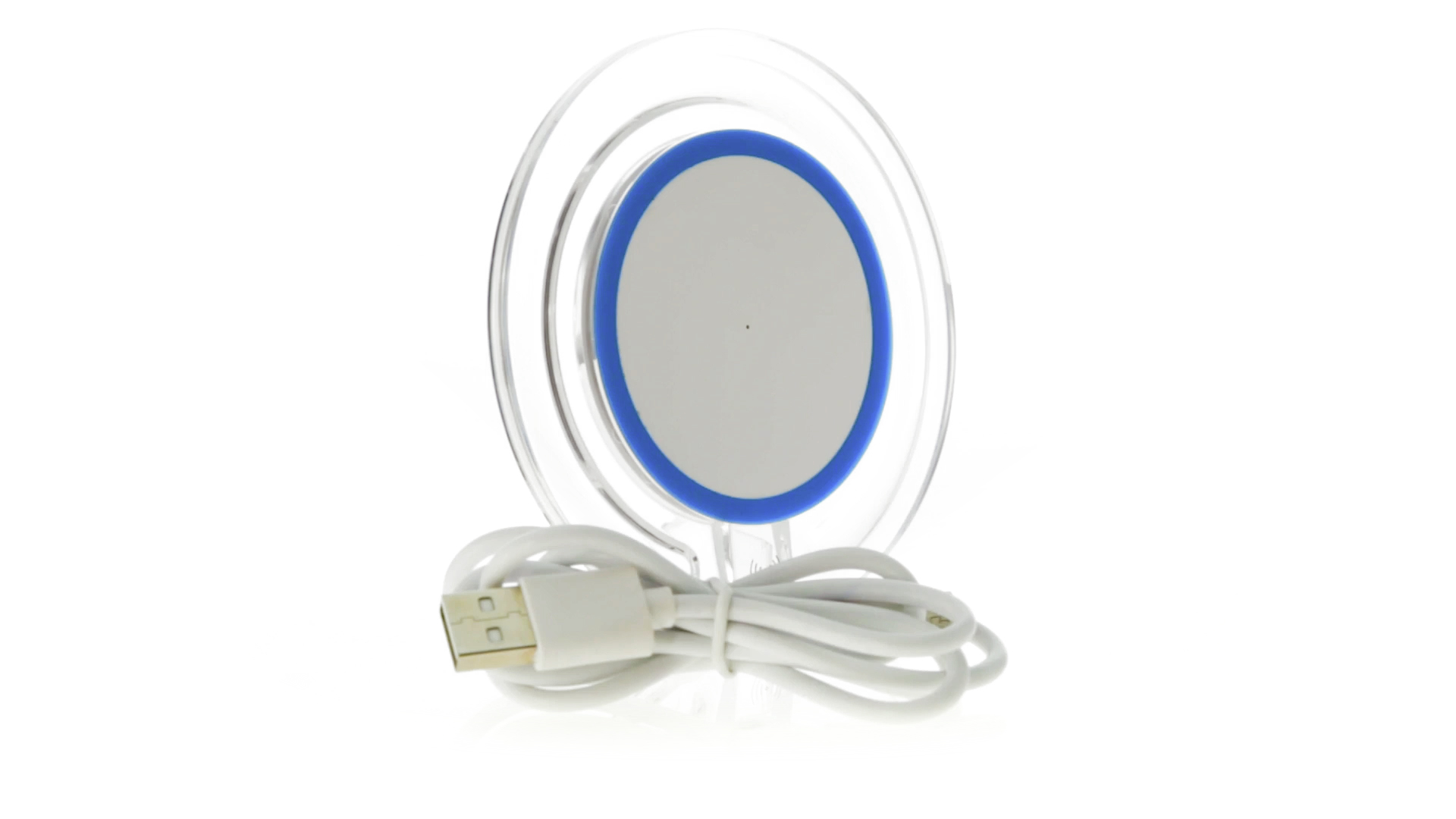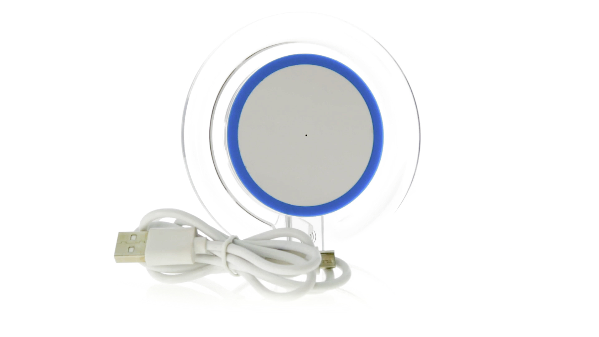 Kabelloses, rundes Ladegerät mit QI-Technologie (induktive Energieübertragung) und transparentem Gehäuse in verschiedenen lebendigen Farben. Mit rutschfester Unterseite und LED-Ladeanzeige. Kompatibel mit Geräten, die mit kabelloser Ladetechnik ausgestattet sind. Präsentiert in einer attraktiven Designbox.