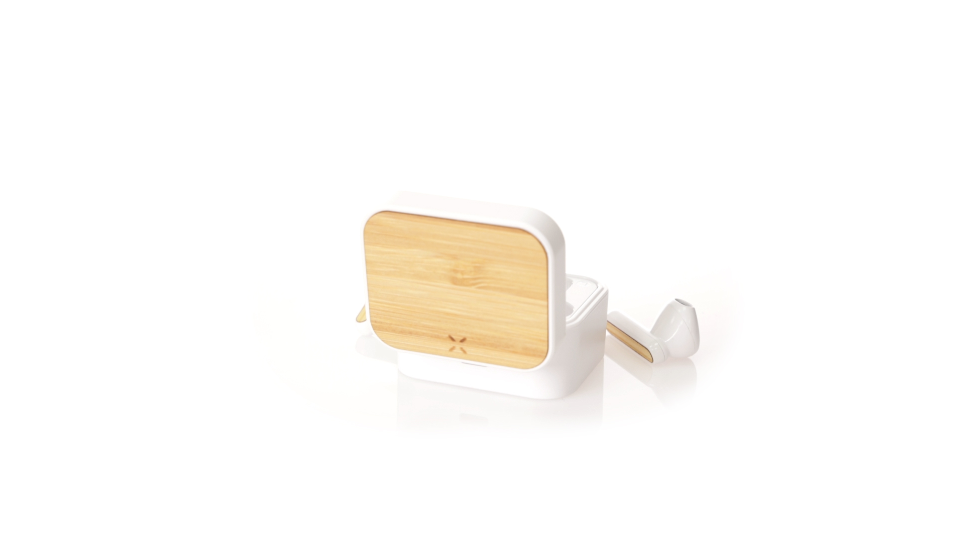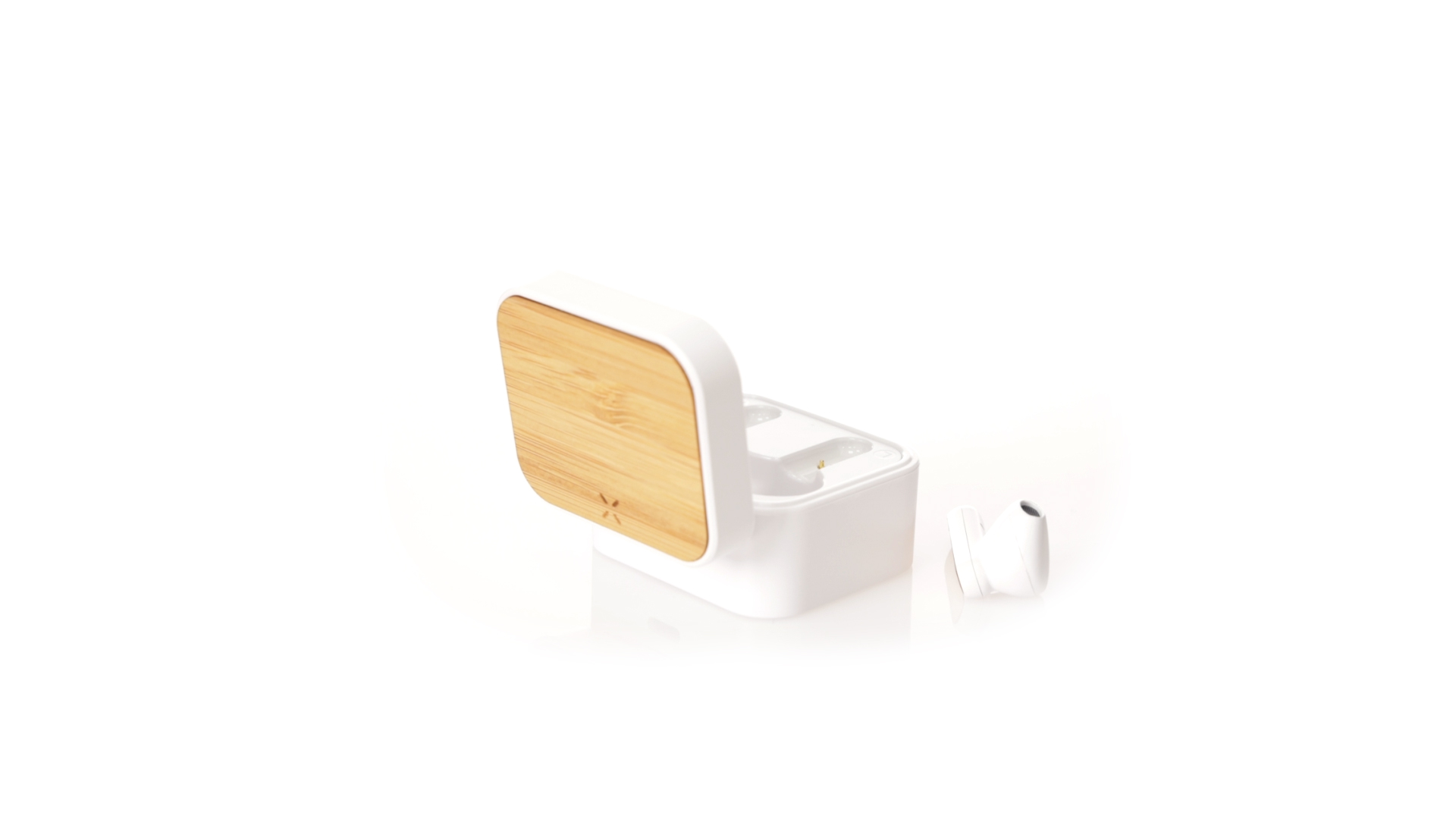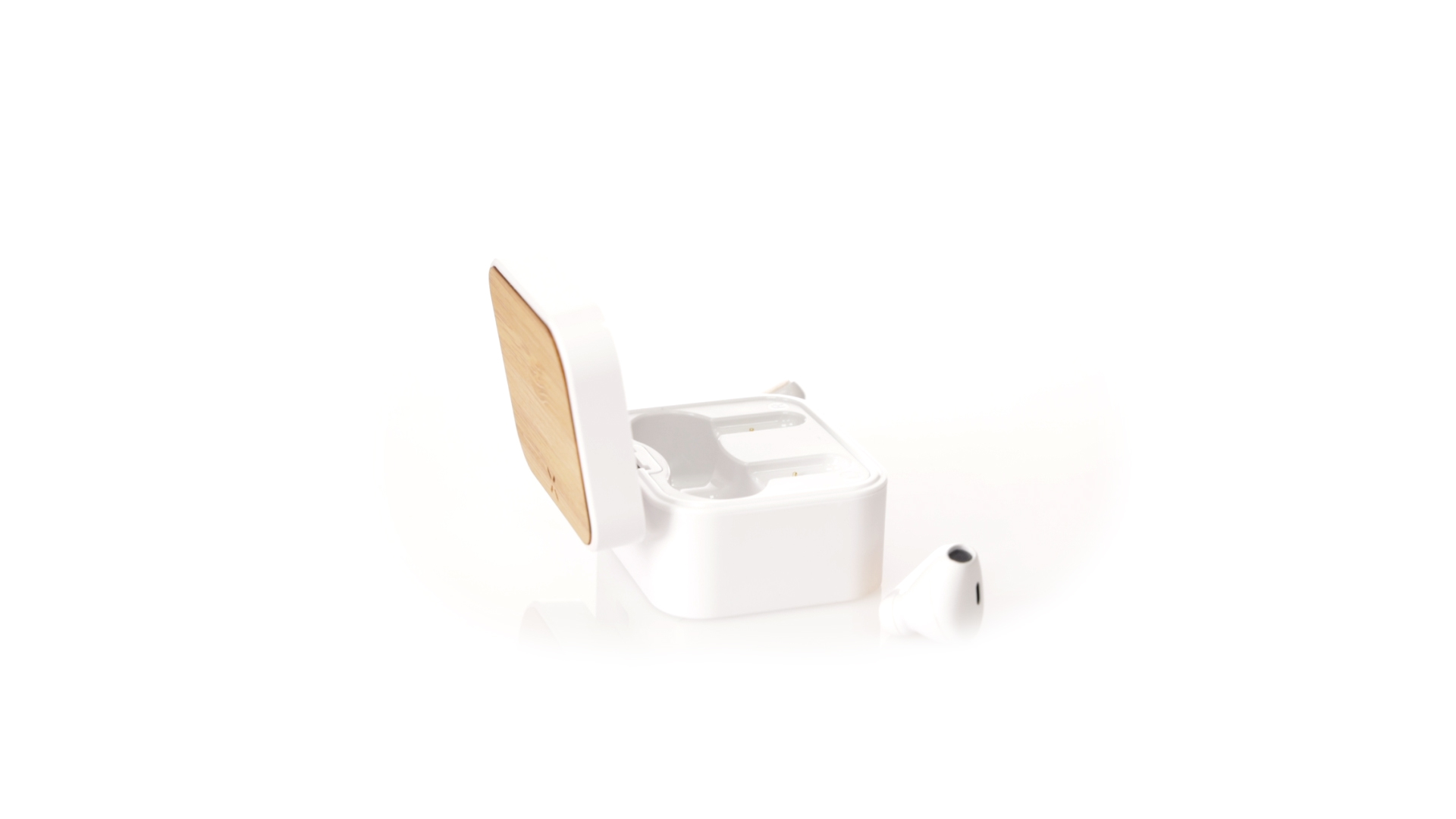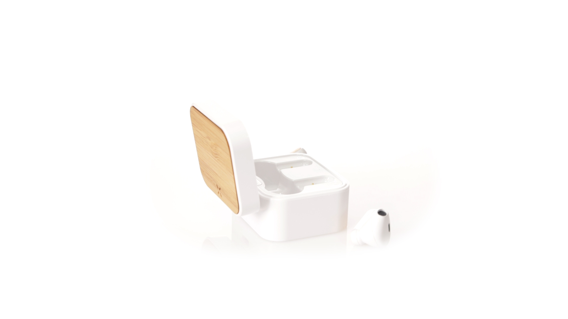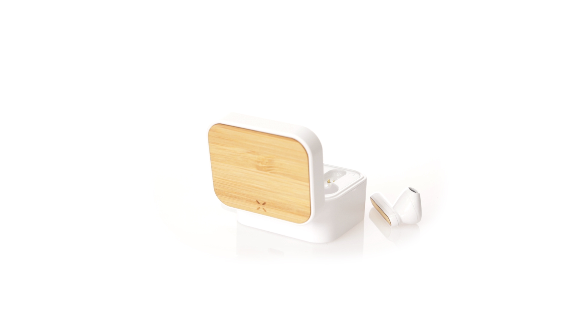 Ohrhörer der Linie Natur. Hergestellt aus widerstandsfähigem ABS mit Bambusdetails in Ohrhörern und Basis. Bluetooth® 5.0-Verbindung und Freisprechfunktion, mit Touch-Control-Taste am Ohrhörer. Kabelloses 10-W-Ladegerät im Bambusdeckel der Basis integriert und über USB wiederaufladbar, mit Typ-C-Kabel im Lieferumfang. Präsentiert in einer individuellen Ökodesign-Box aus Kraftkarton.