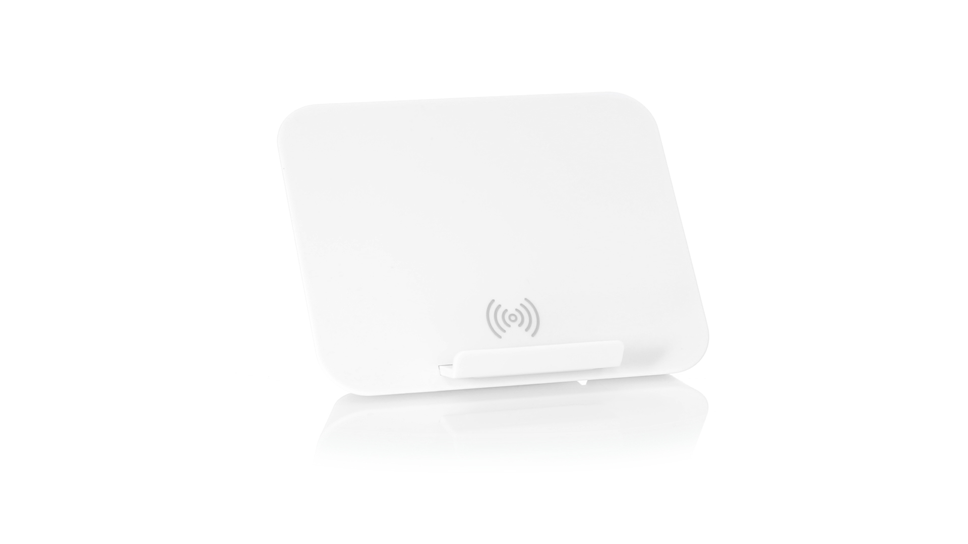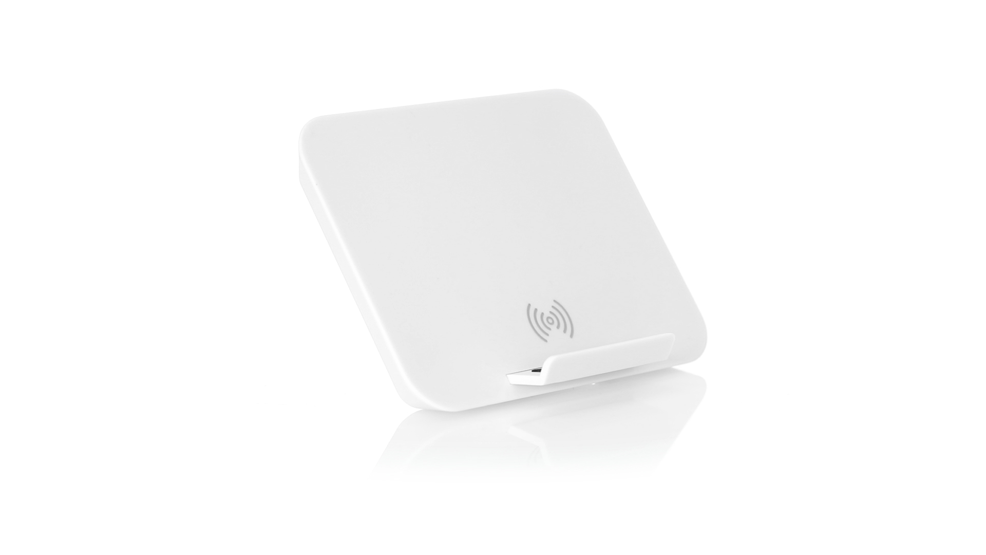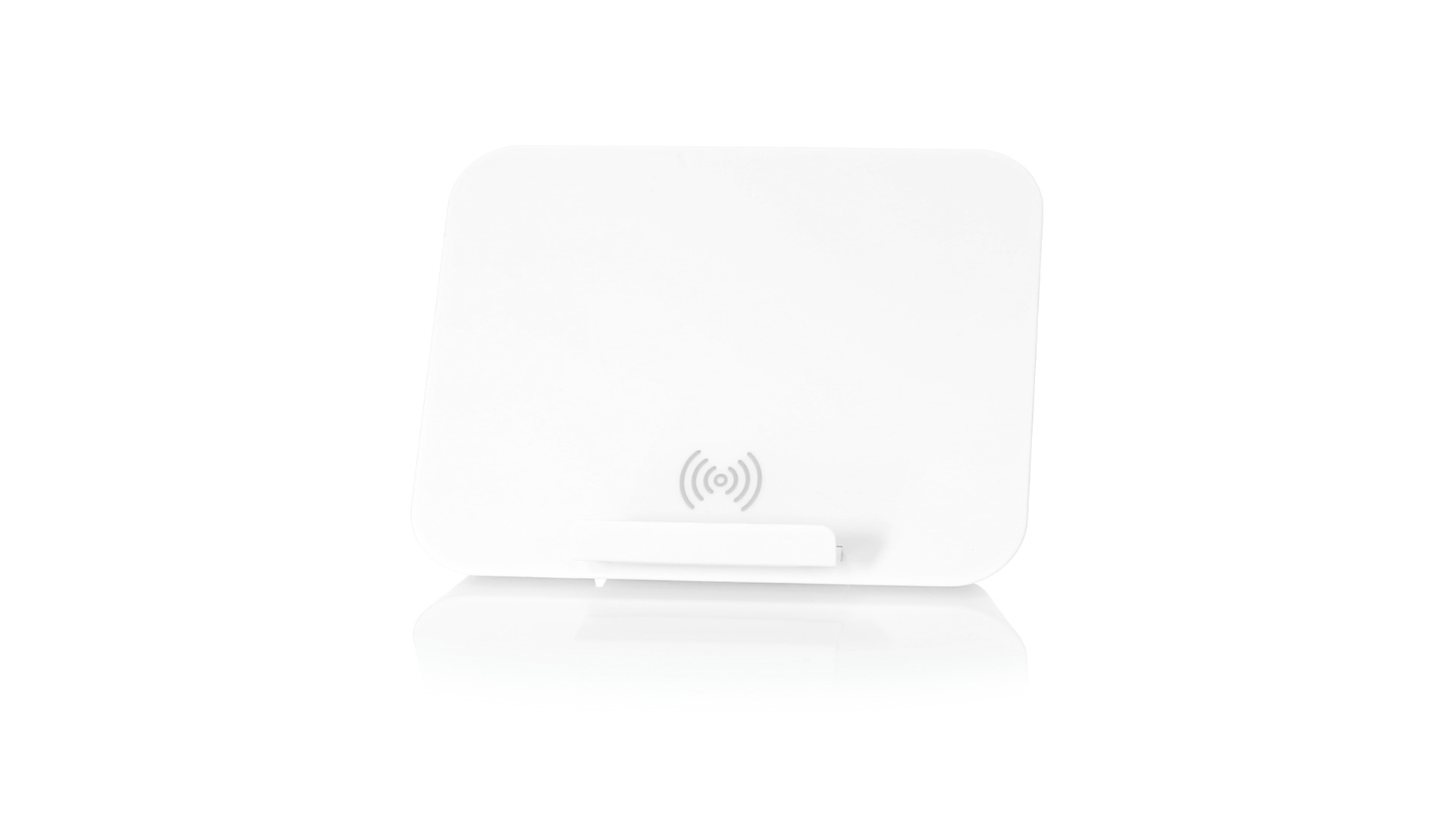 Cargador inalámbrico con función soporte de smartphone. De sobrio diseño monocolor en blanco, con cable de carga micro USB incluido. Compatible con dispositivos equipados con tecnología de carga inalámbrica. Presentado en atractiva caja de diseño.
