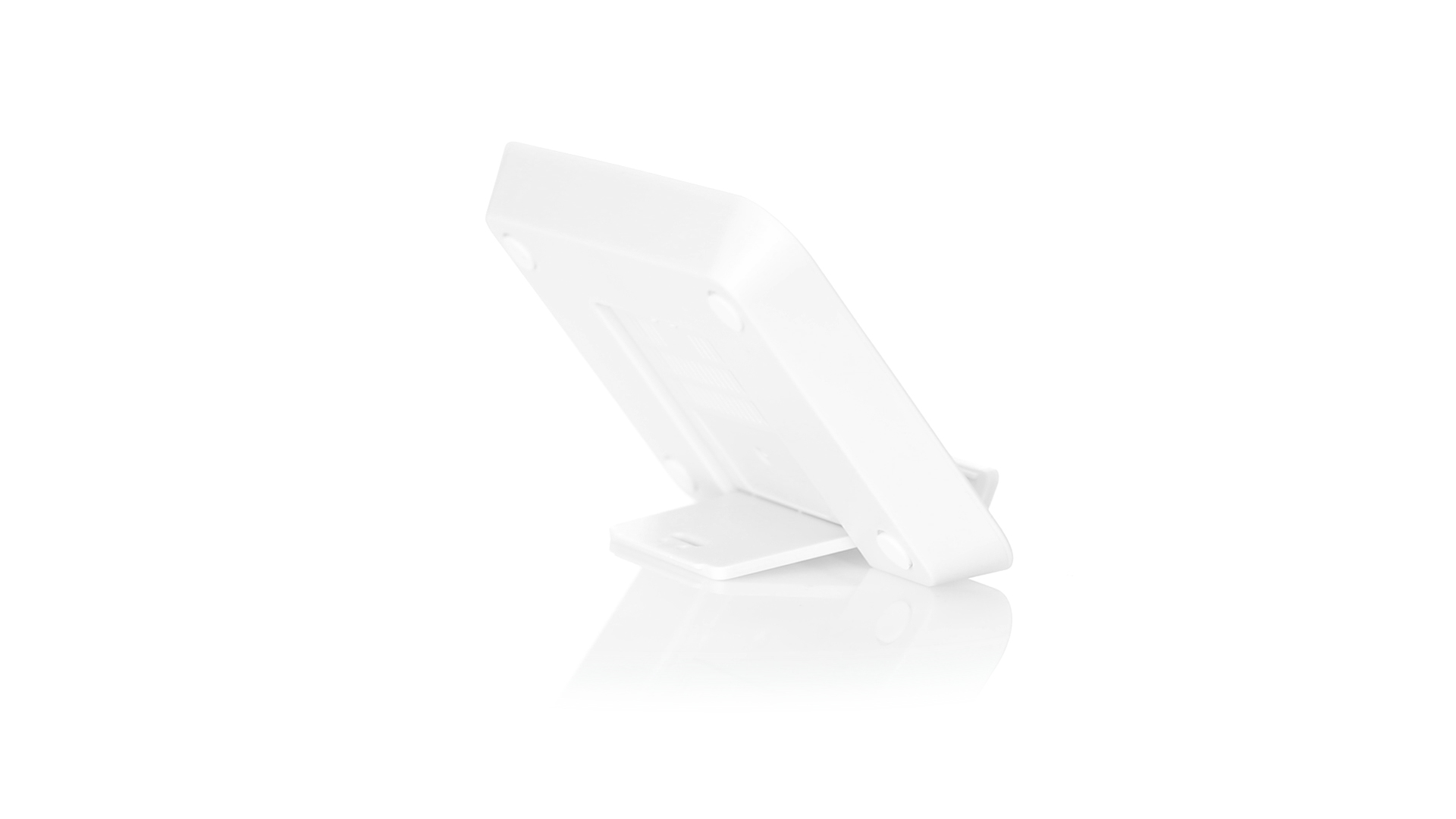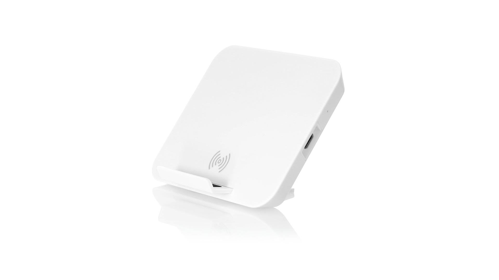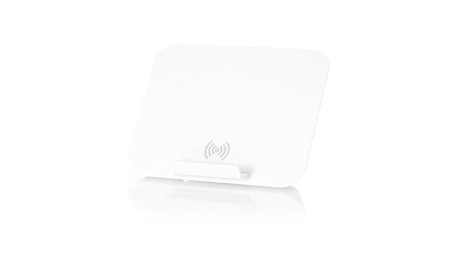 Cargador inalámbrico con función soporte de smartphone. De sobrio diseño monocolor en blanco, con cable de carga micro USB incluido. Compatible con dispositivos equipados con tecnología de carga inalámbrica. Presentado en atractiva caja de diseño.