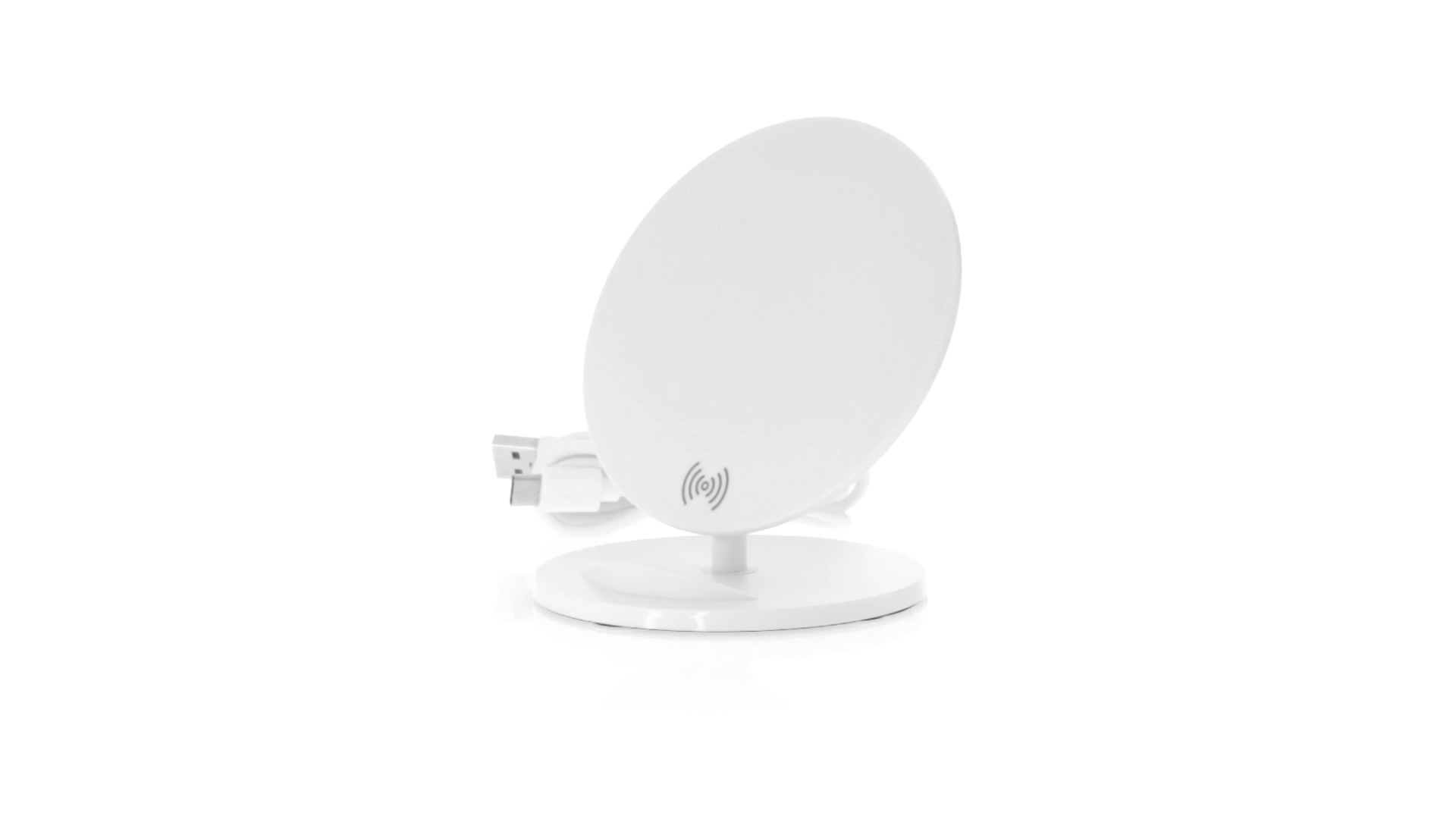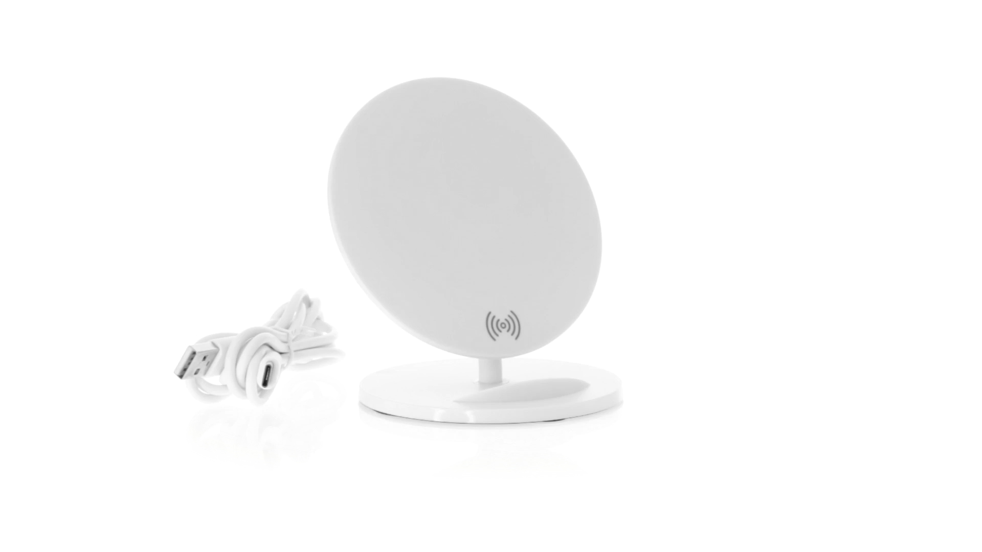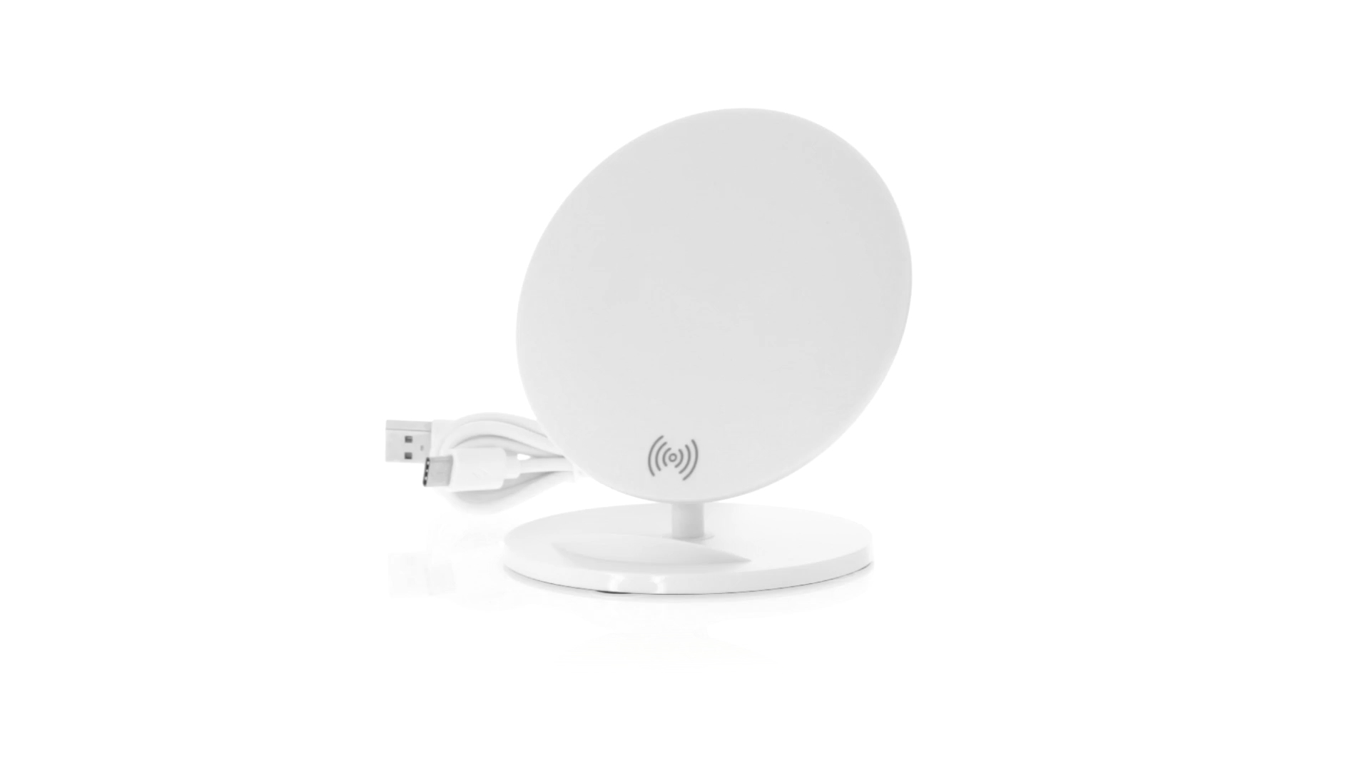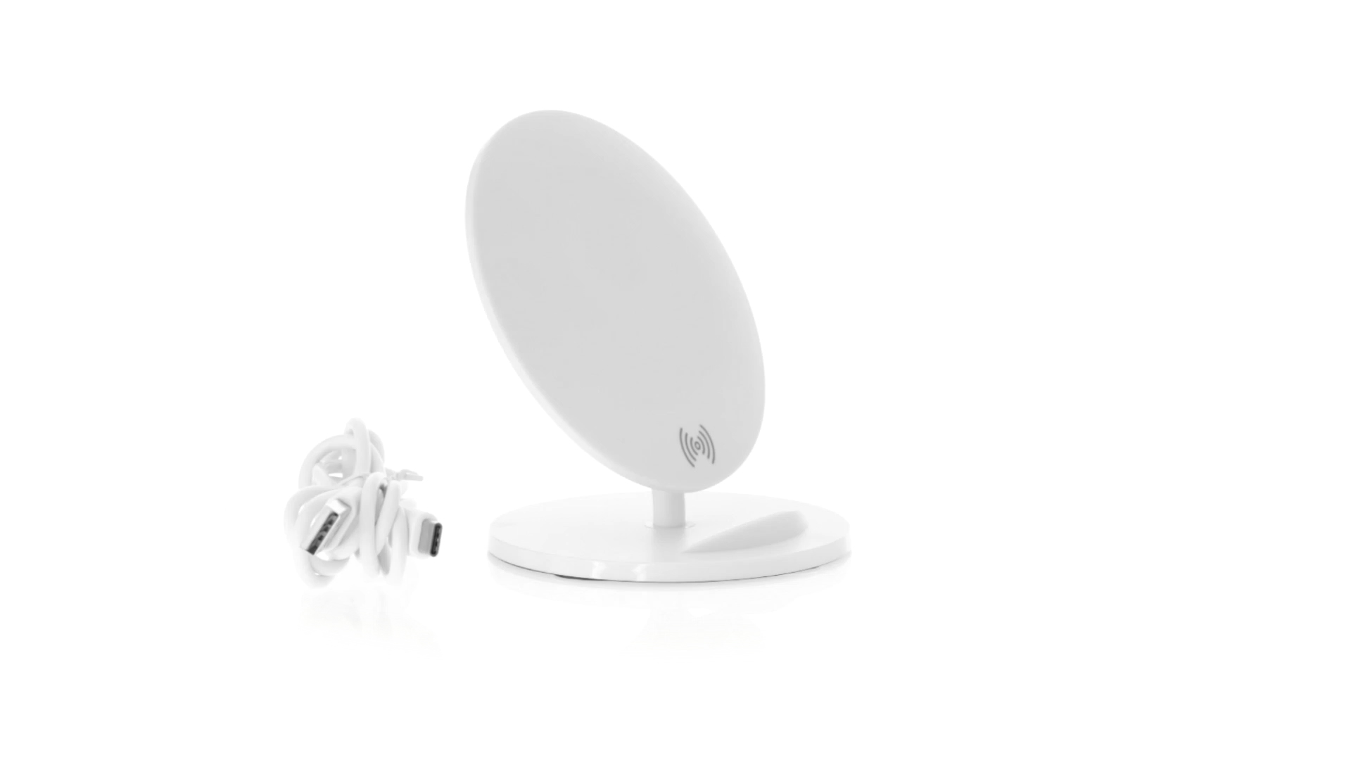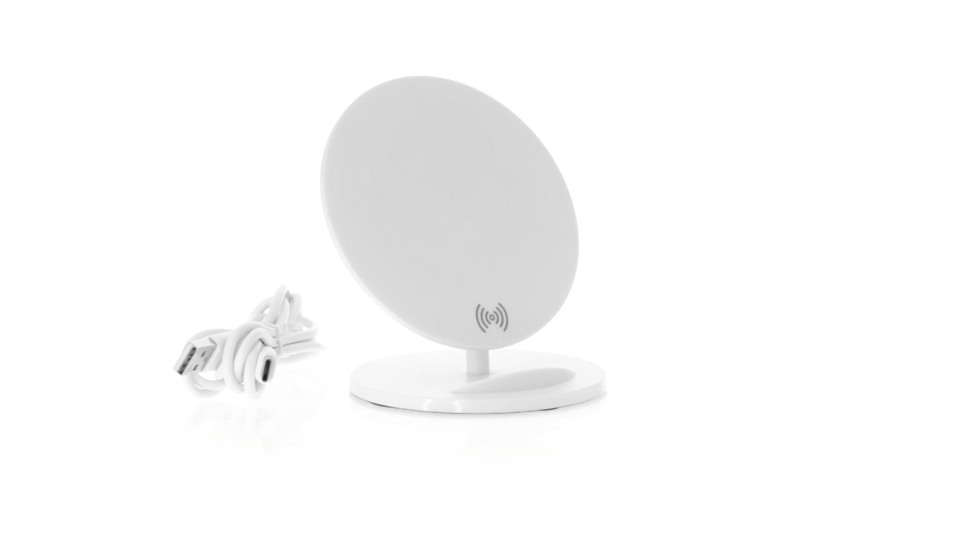 Kabelloses Ladegerät in Weiss mit QI-Technologie (induktive Energieübertragung). Mit integriertem Ständer für Mobilgerät und rutschfester Unterseite. Kompatibel mit Geräten, die mit kabelloser Ladetechnik ausgestattet sind. Präsentiert in einer attraktiven Designbox.