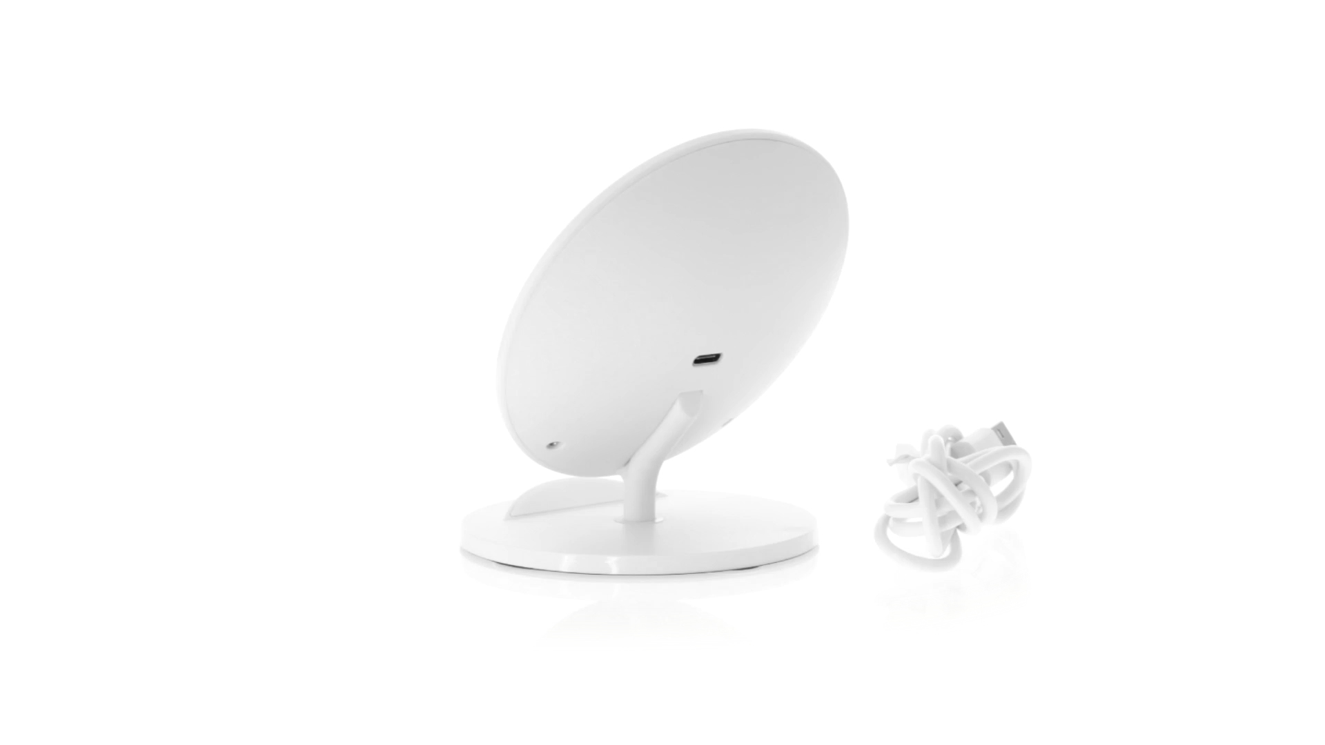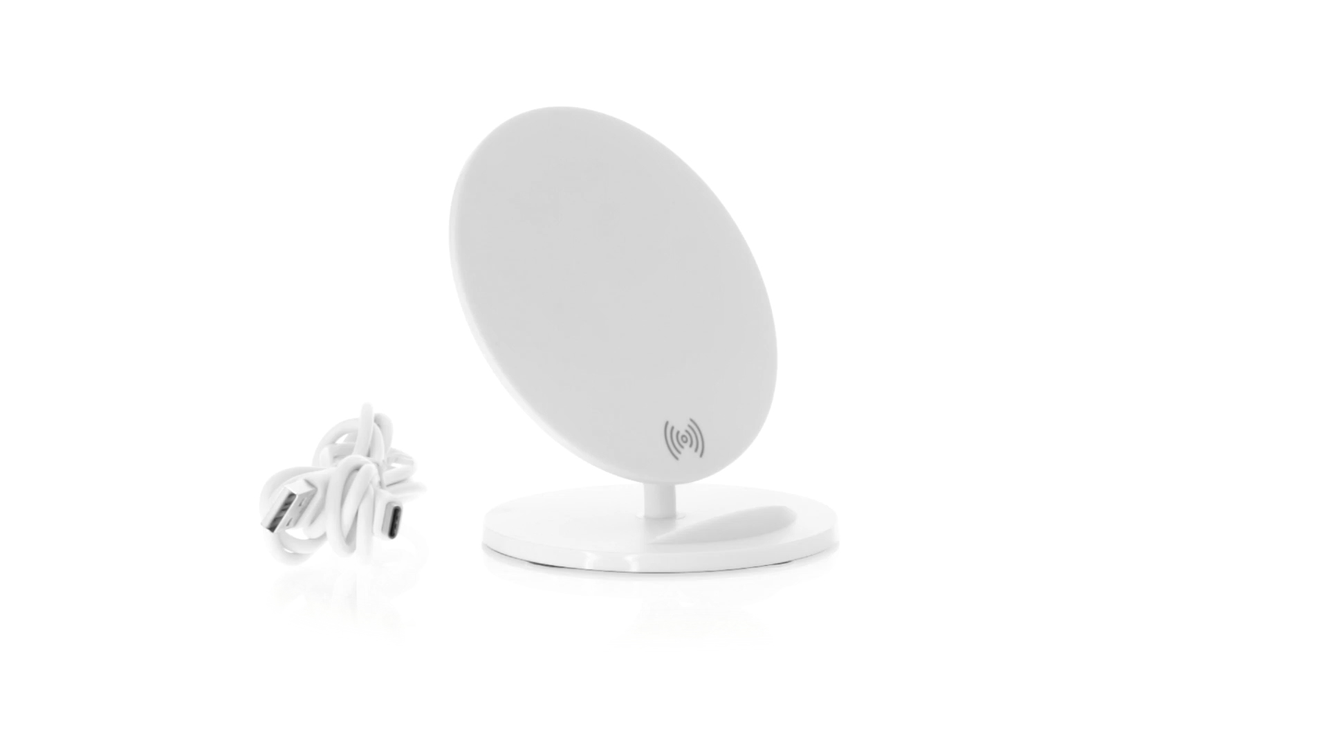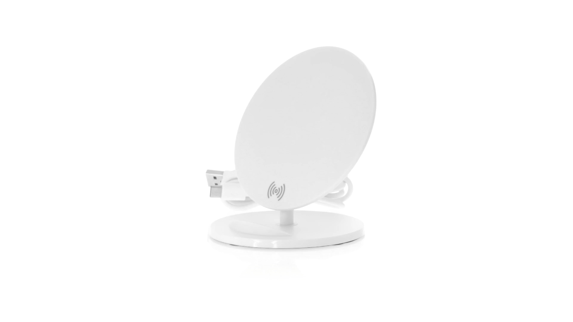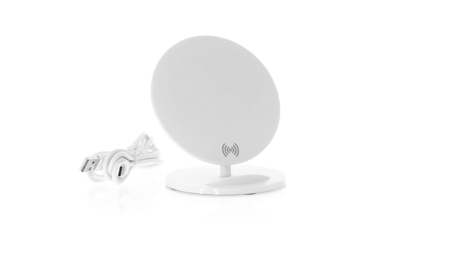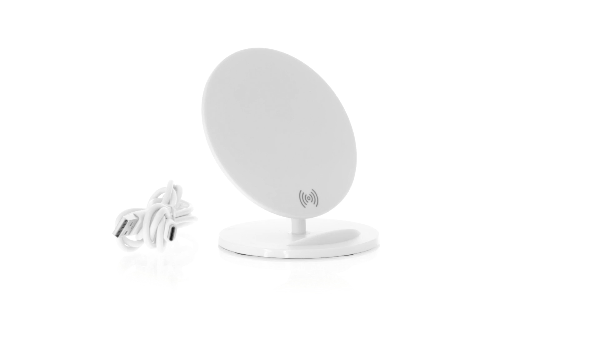 Kabelloses Ladegerät in Weiss mit QI-Technologie (induktive Energieübertragung). Mit integriertem Ständer für Mobilgerät und rutschfester Unterseite. Kompatibel mit Geräten, die mit kabelloser Ladetechnik ausgestattet sind. Präsentiert in einer attraktiven Designbox.