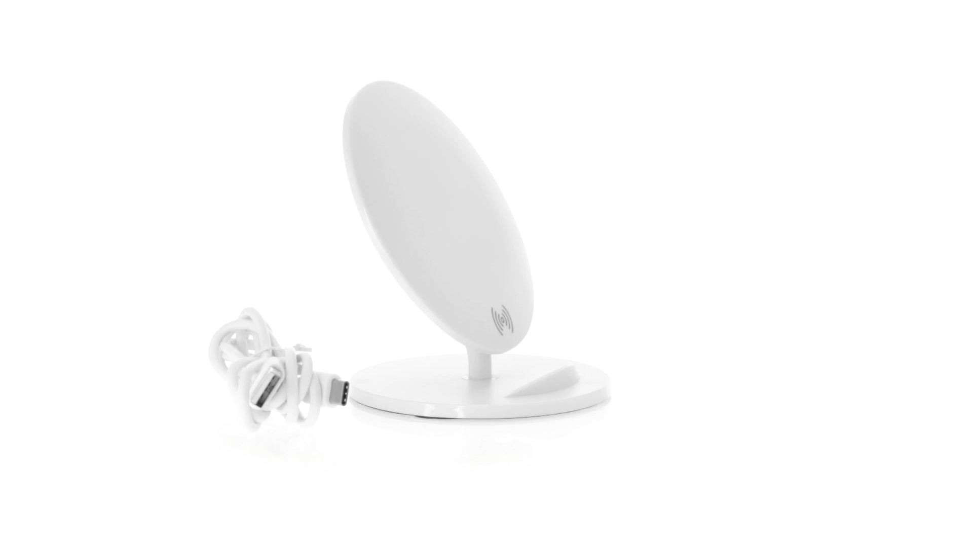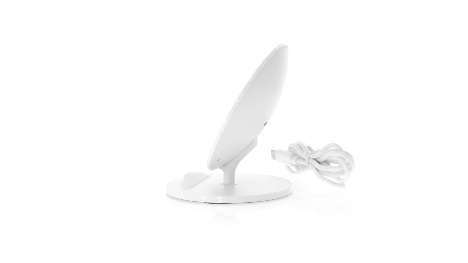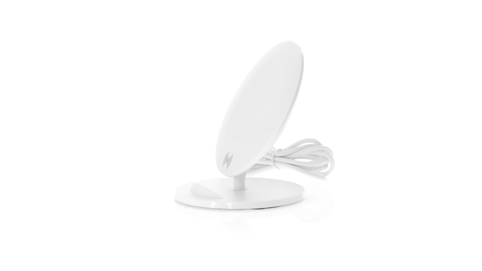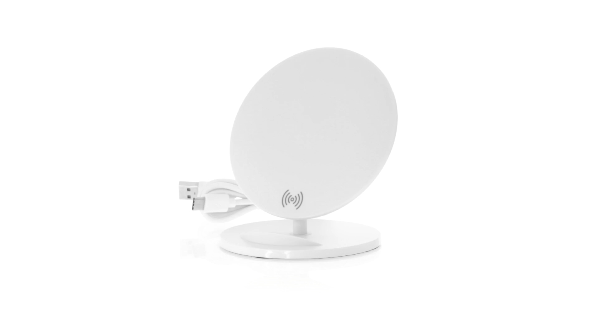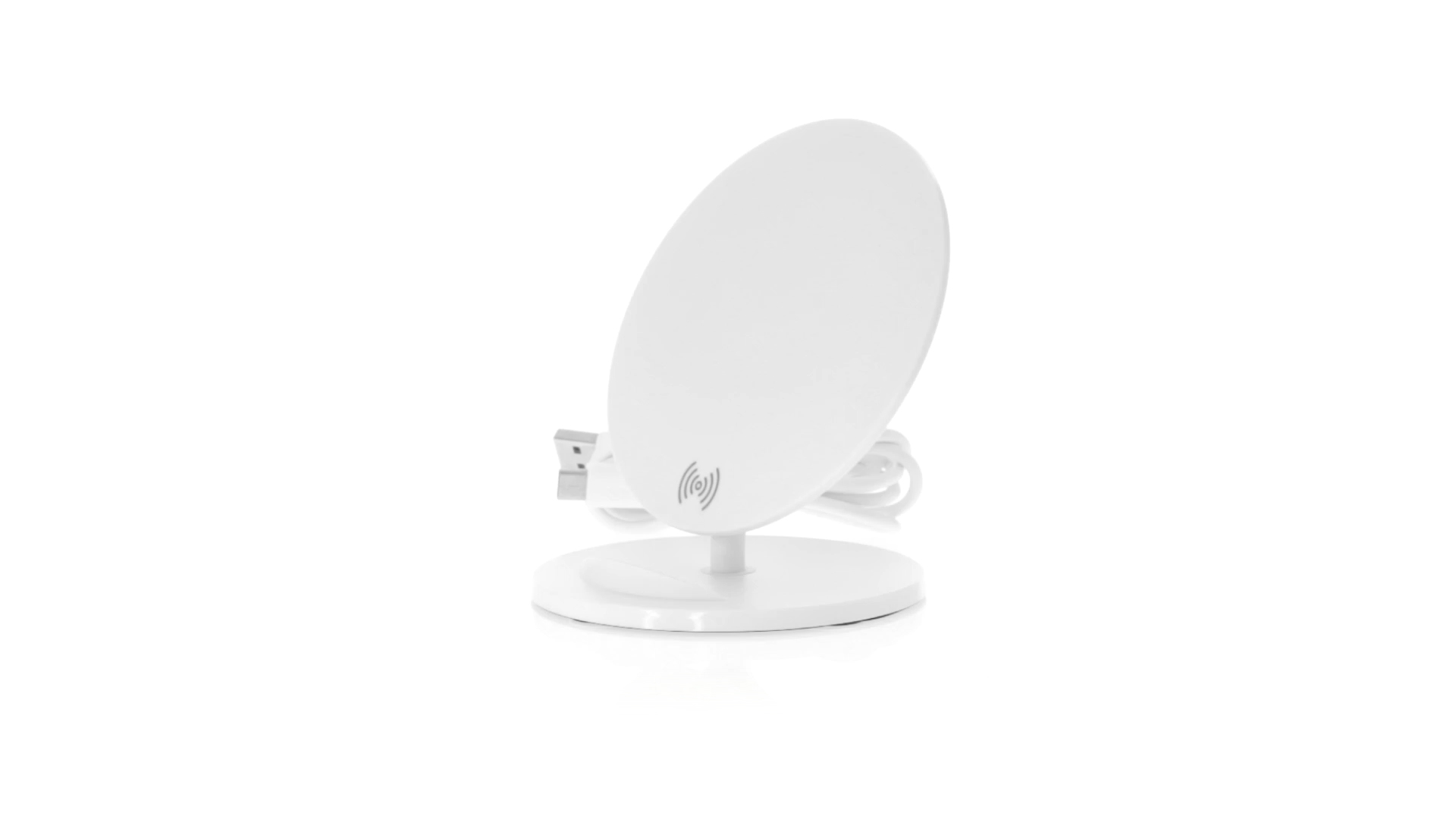 Kabelloses Ladegerät in Weiss mit QI-Technologie (induktive Energieübertragung). Mit integriertem Ständer für Mobilgerät und rutschfester Unterseite. Kompatibel mit Geräten, die mit kabelloser Ladetechnik ausgestattet sind. Präsentiert in einer attraktiven Designbox.