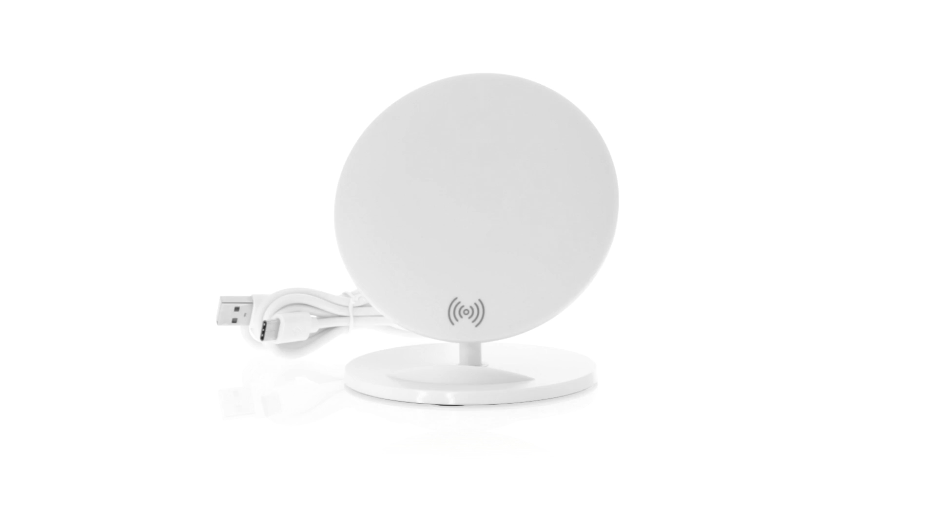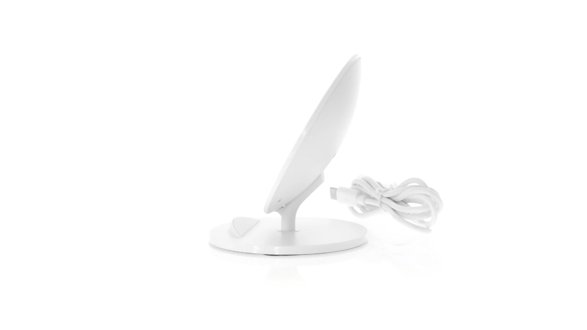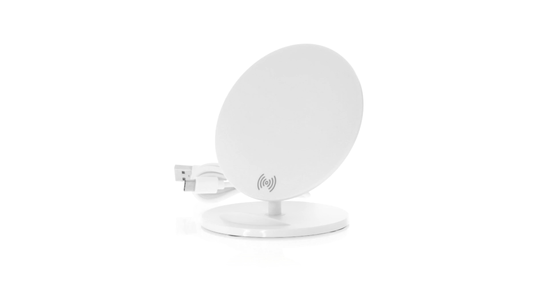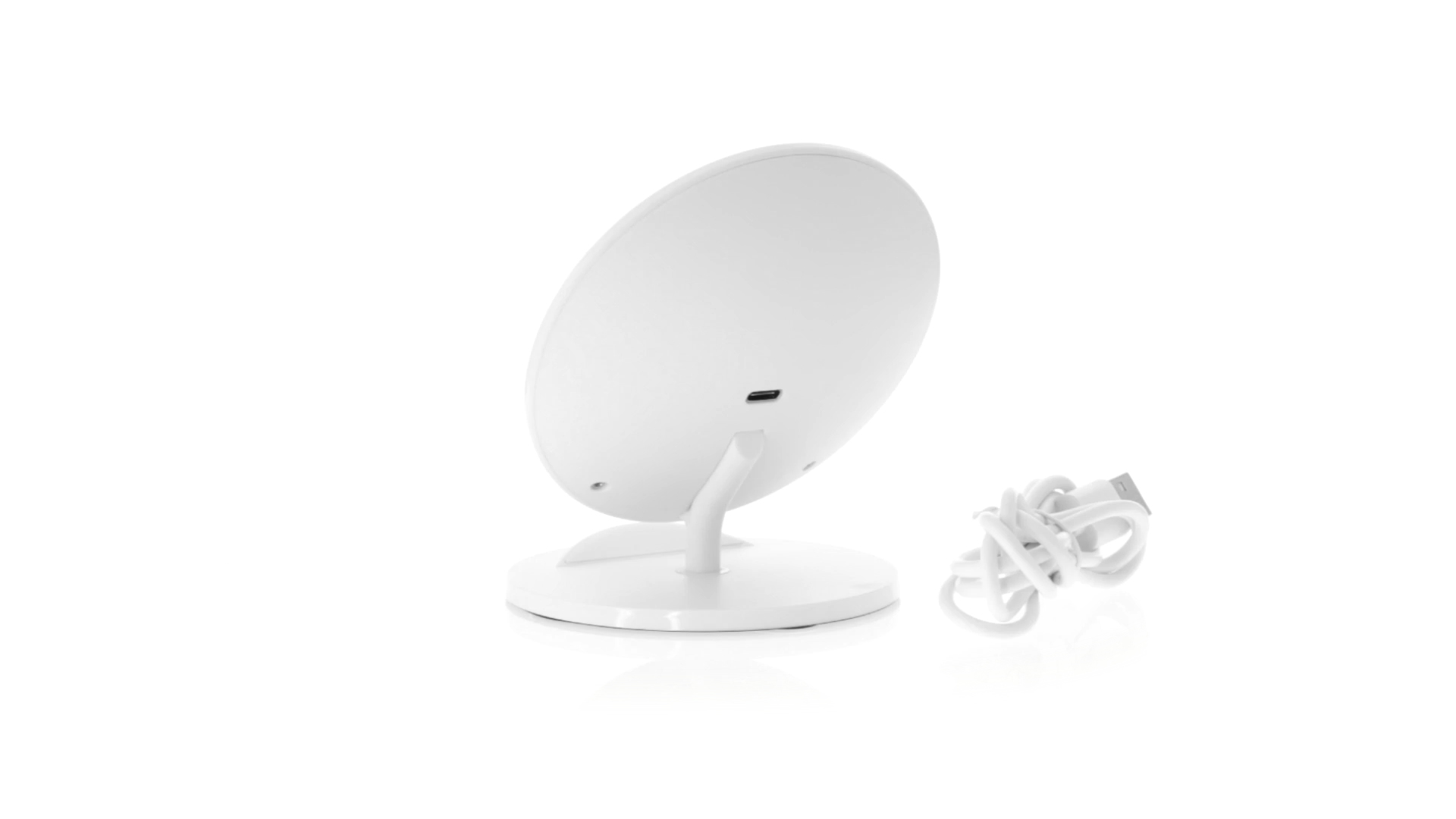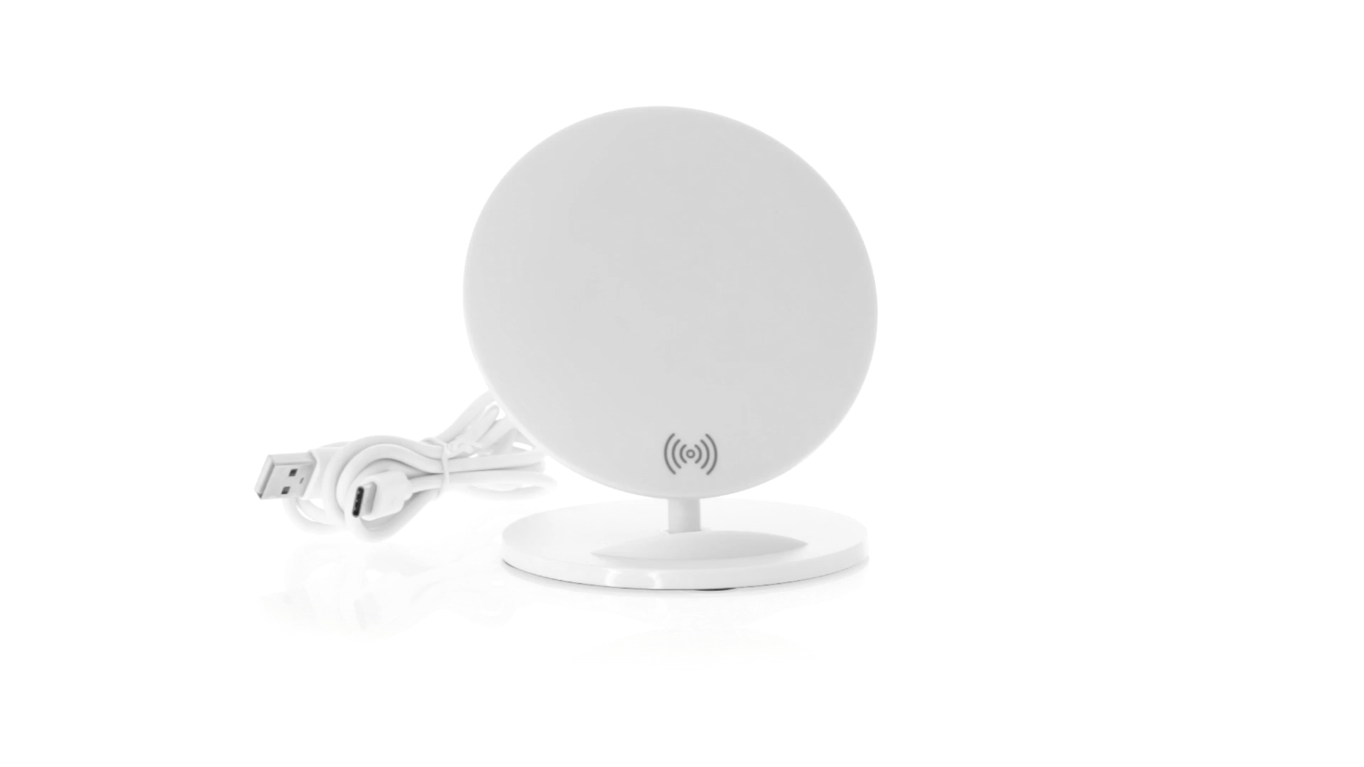 Kabelloses Ladegerät in Weiss mit QI-Technologie (induktive Energieübertragung). Mit integriertem Ständer für Mobilgerät und rutschfester Unterseite. Kompatibel mit Geräten, die mit kabelloser Ladetechnik ausgestattet sind. Präsentiert in einer attraktiven Designbox.
