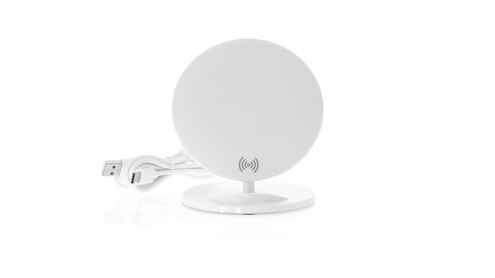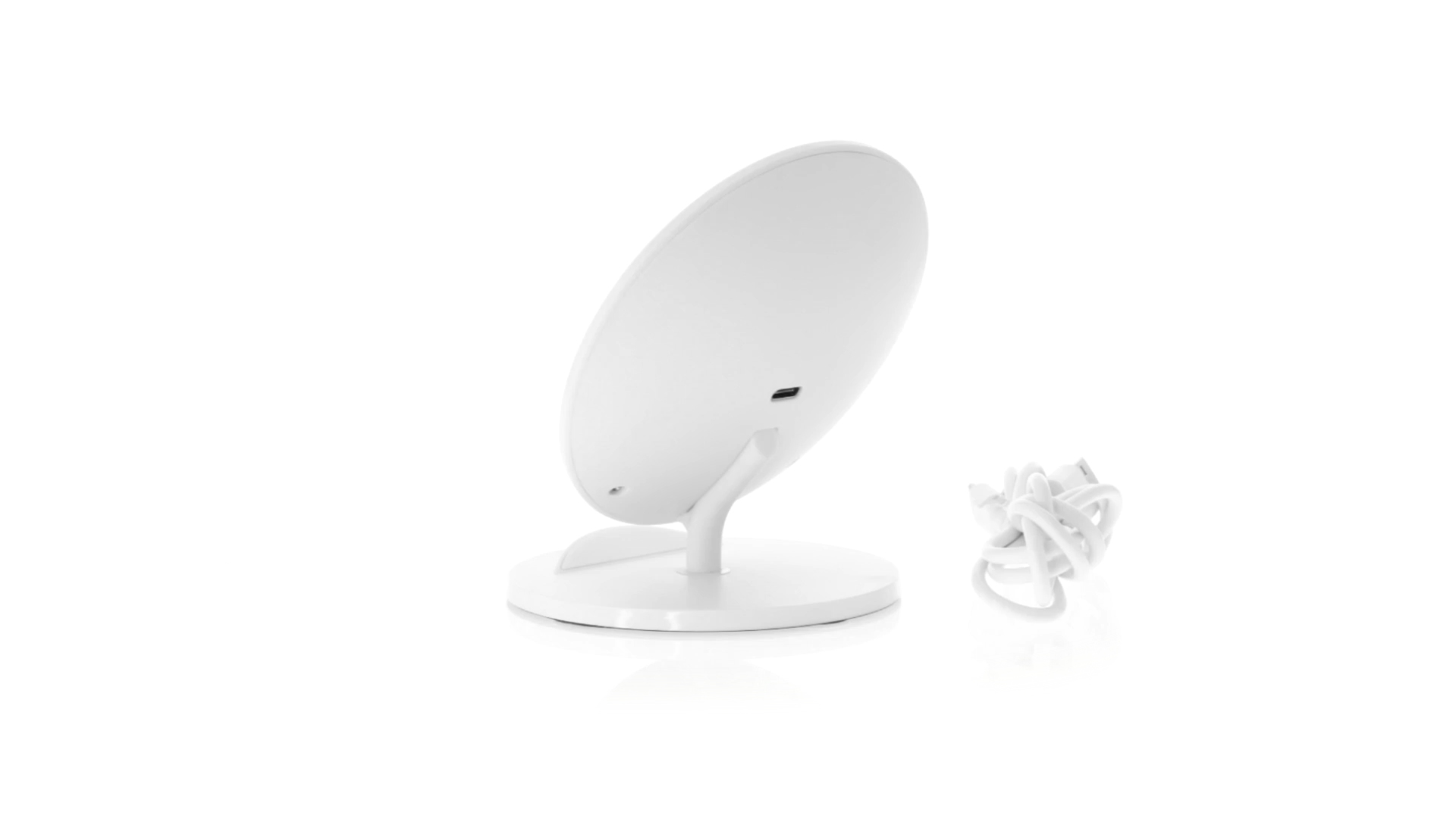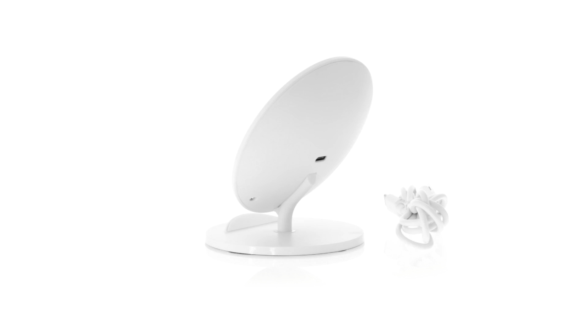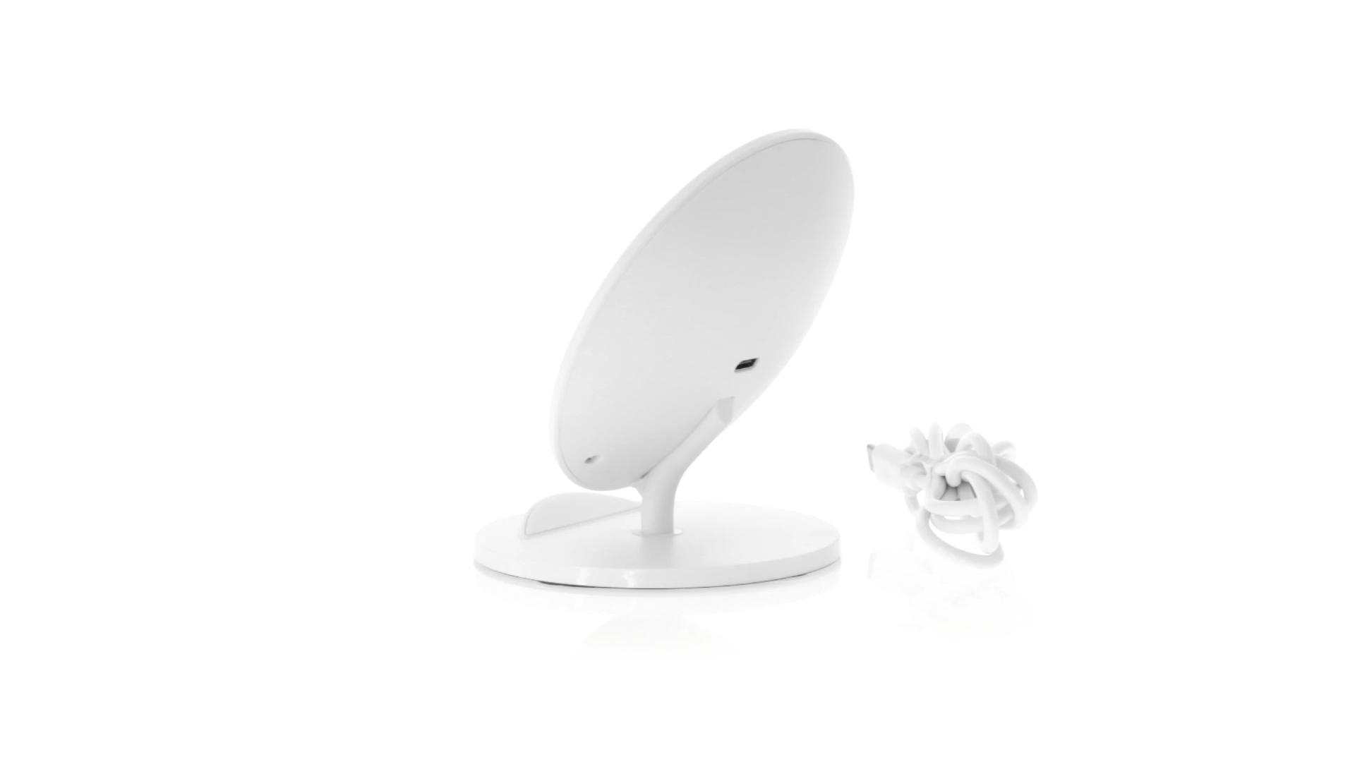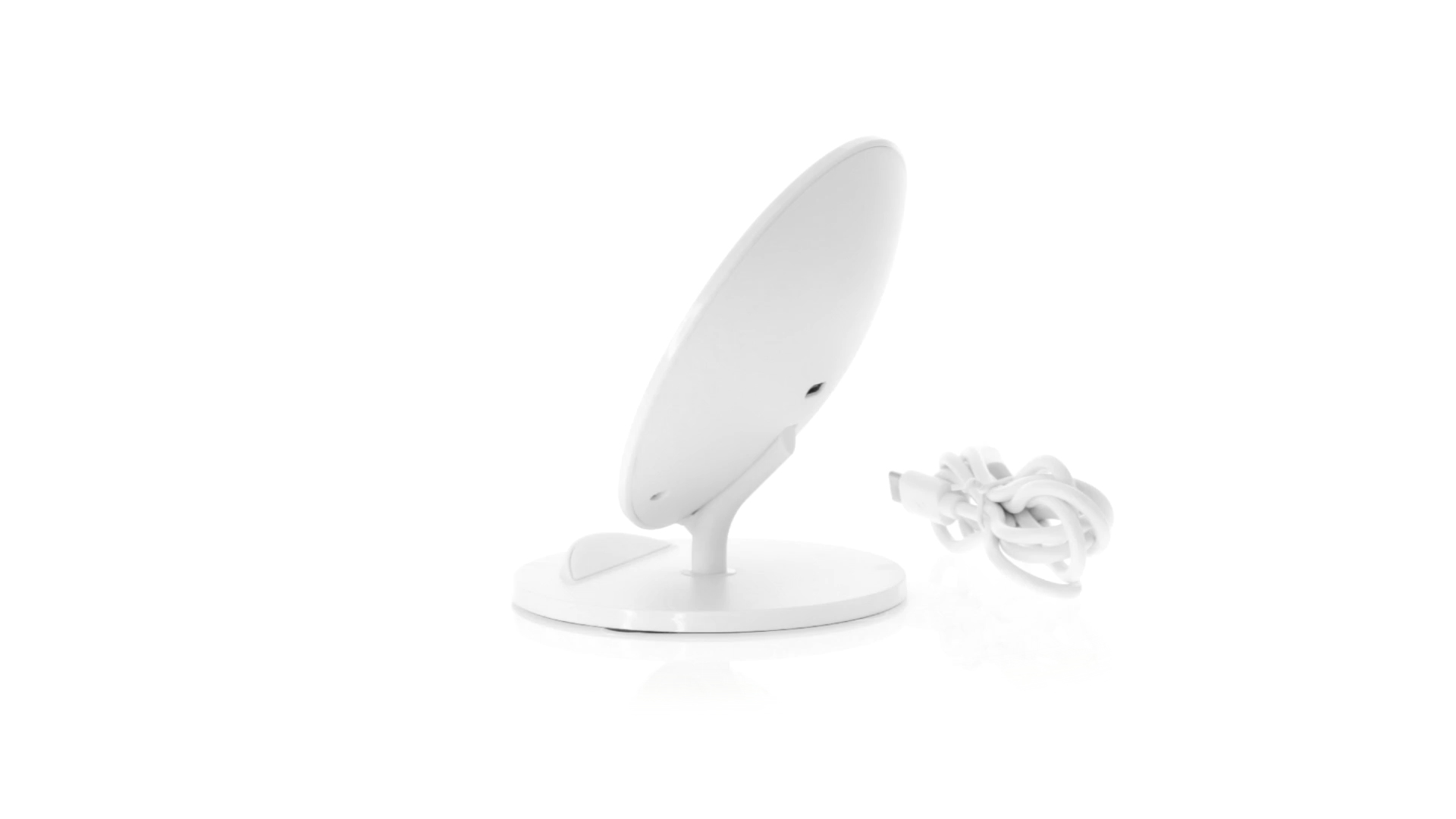 Kabelloses Ladegerät in Weiss mit QI-Technologie (induktive Energieübertragung). Mit integriertem Ständer für Mobilgerät und rutschfester Unterseite. Kompatibel mit Geräten, die mit kabelloser Ladetechnik ausgestattet sind. Präsentiert in einer attraktiven Designbox.