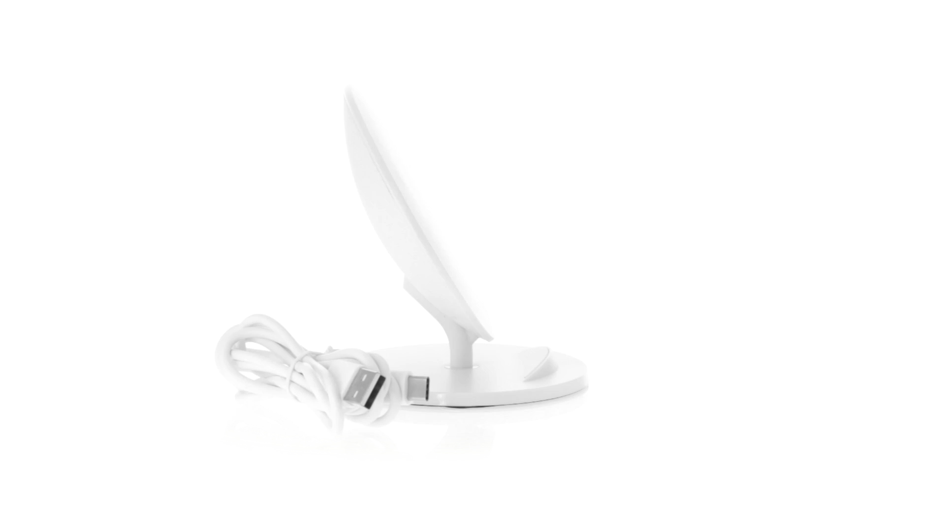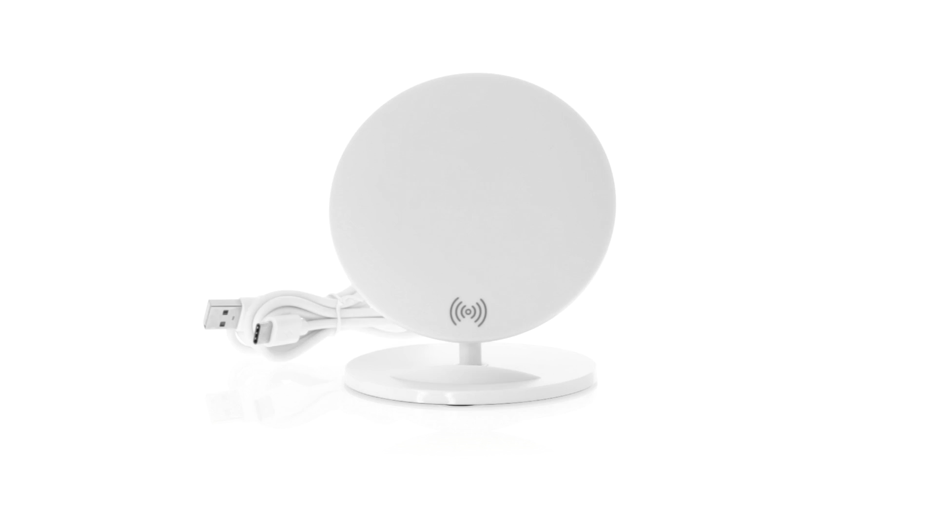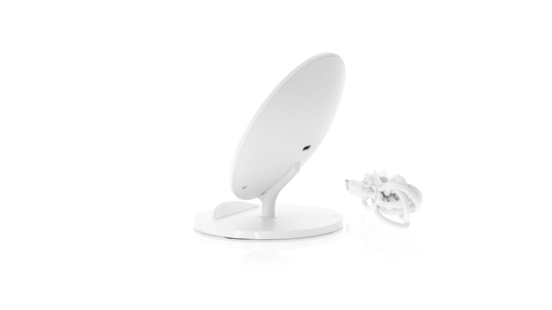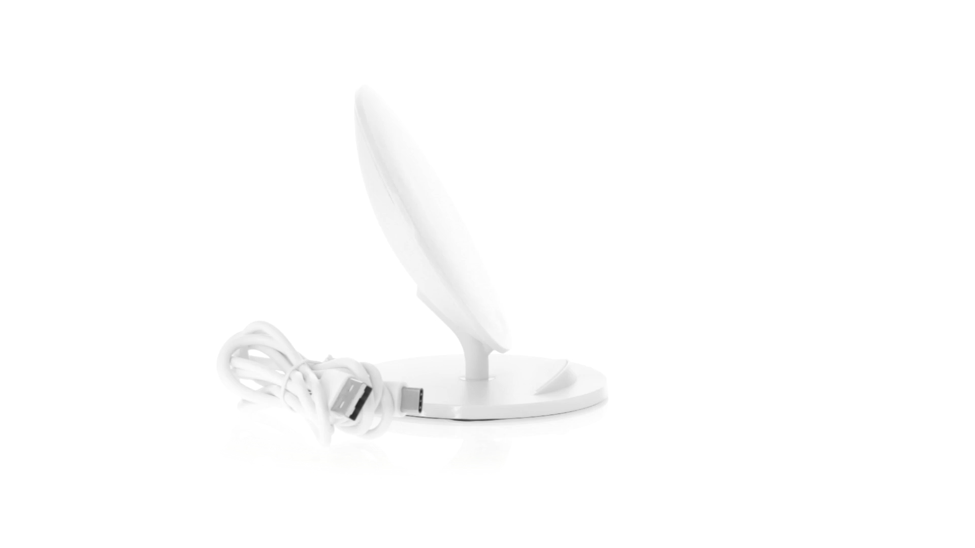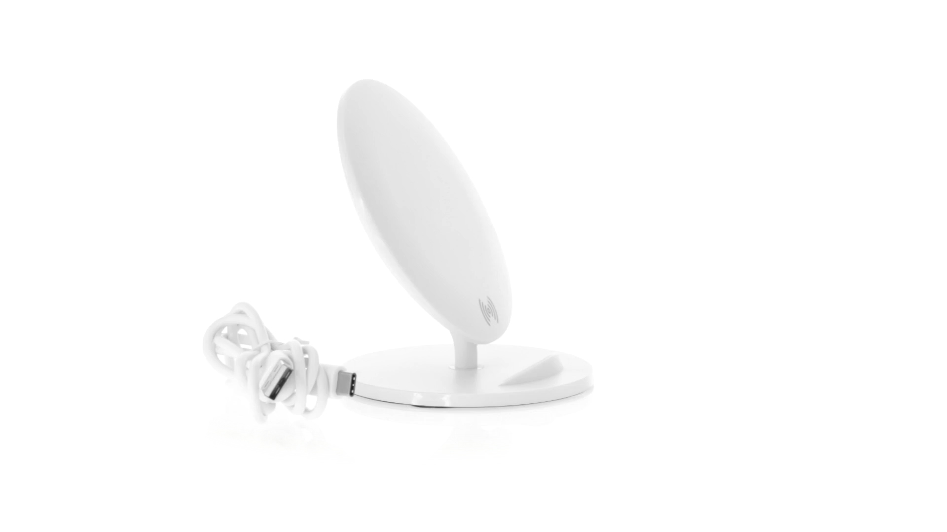 Kabelloses Ladegerät in Weiss mit QI-Technologie (induktive Energieübertragung). Mit integriertem Ständer für Mobilgerät und rutschfester Unterseite. Kompatibel mit Geräten, die mit kabelloser Ladetechnik ausgestattet sind. Präsentiert in einer attraktiven Designbox.