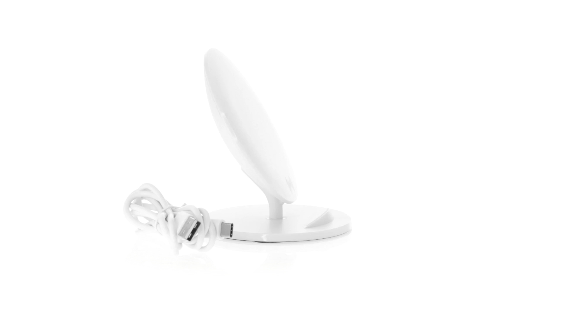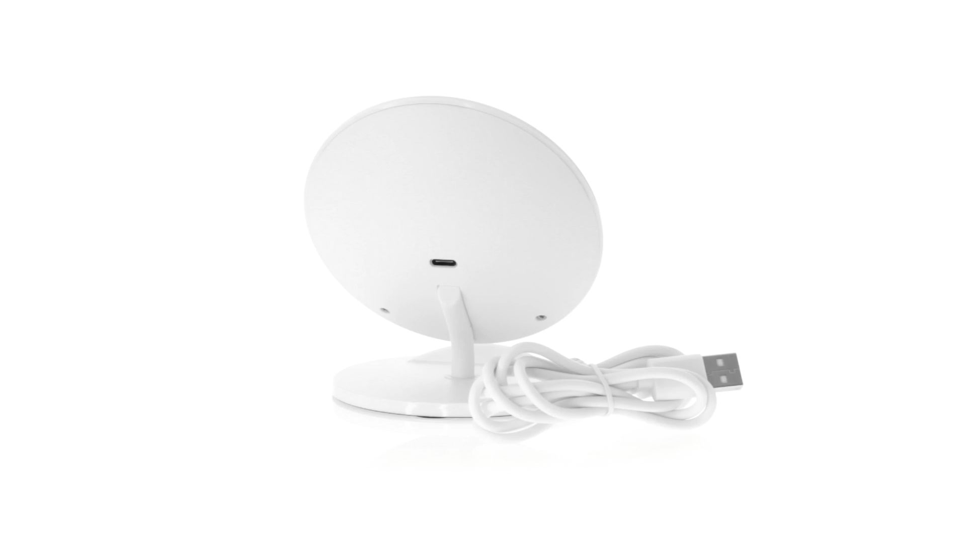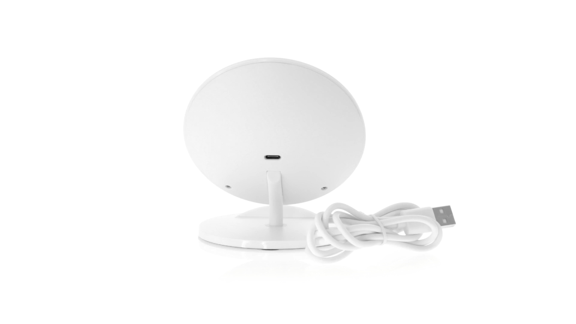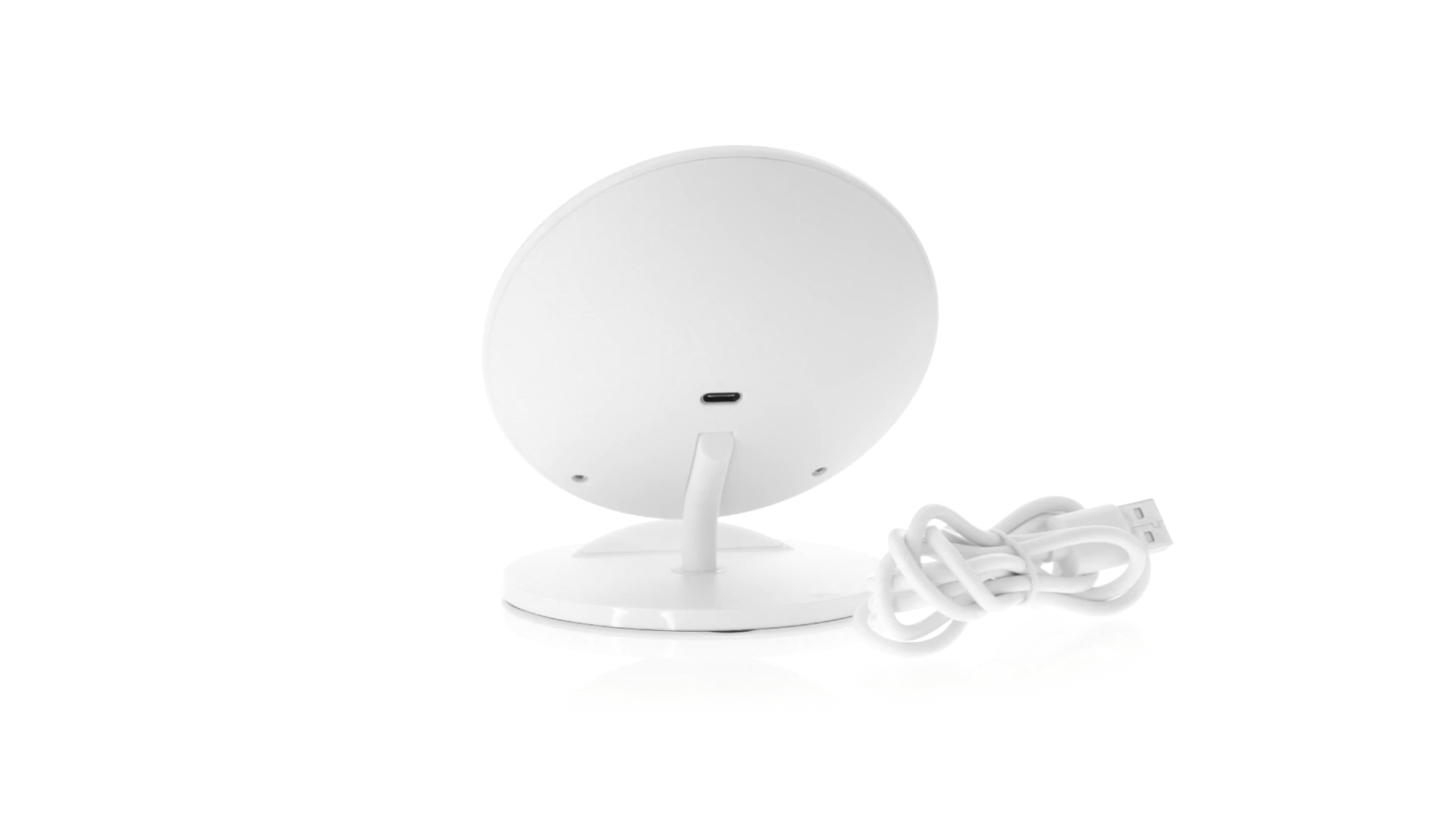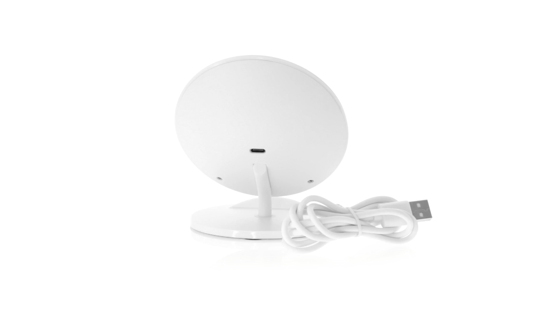 Kabelloses Ladegerät in Weiss mit QI-Technologie (induktive Energieübertragung). Mit integriertem Ständer für Mobilgerät und rutschfester Unterseite. Kompatibel mit Geräten, die mit kabelloser Ladetechnik ausgestattet sind. Präsentiert in einer attraktiven Designbox.
