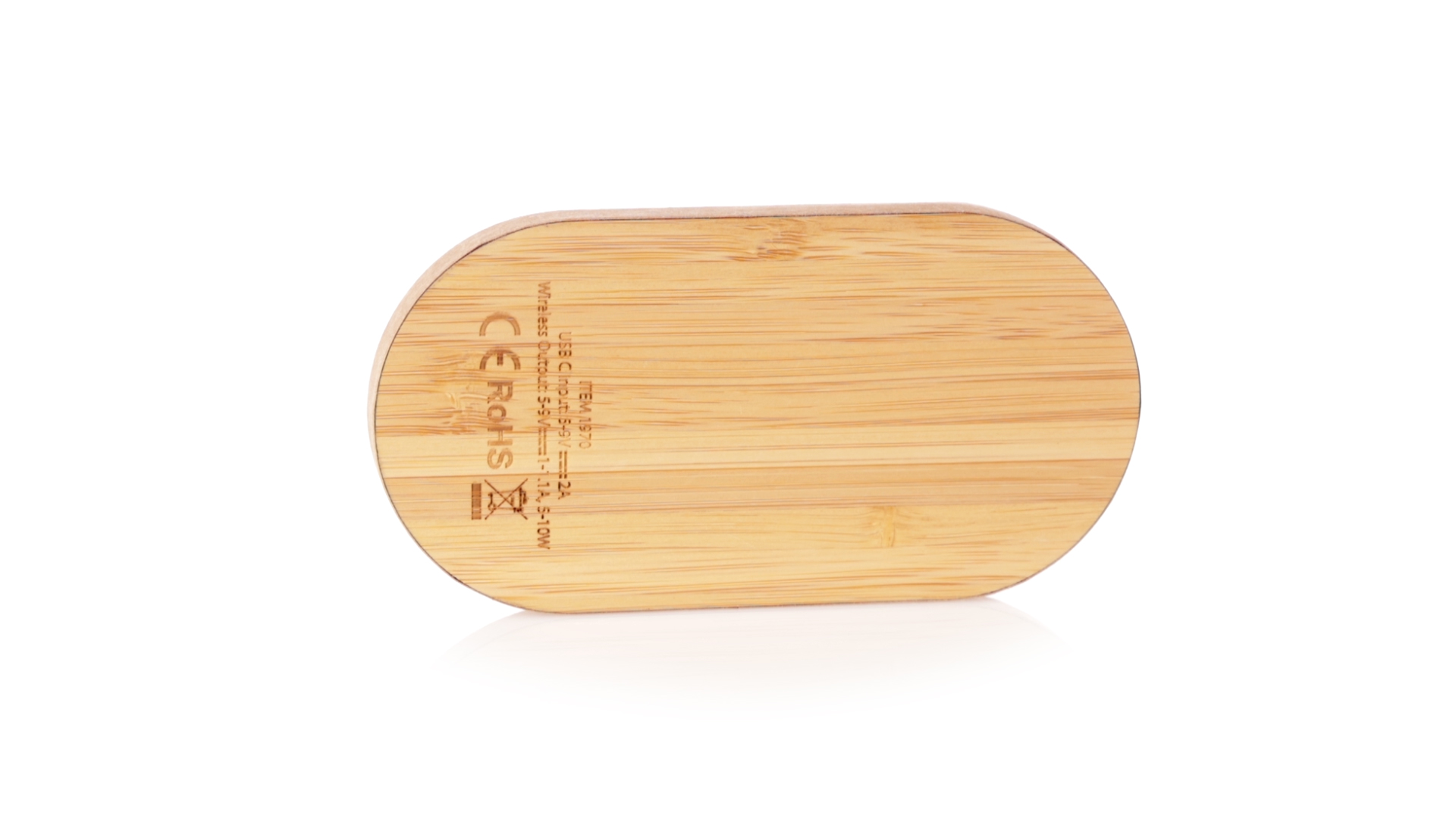 Kabelloses Ladegerät 10 W in der Nature-Linie mit Sockel aus recyceltem Karton und Bambus-Ladefläche. Kompatibel mit Geräten, die mit der kabellosen Qi-Ladetechnologie ausgestattet sind. Mit LED-Ladestatusanzeige und Typ-C-Ladekabel im Lieferumfang enthalten. Rutschfeste Basis, präsentiert in einer individuellen Kraft-Design-Box, mit Bedienungsanleitung in Englisch und Spanisch. Hergestellt nach RoHS-Standards und unter Einhaltung der folgenden Sicherheitsanforderungen: Überhitzungsschutzsystem. Überladeschutzsystem. Blockiersystem zur Vermeidung von Kurzschlüssen.