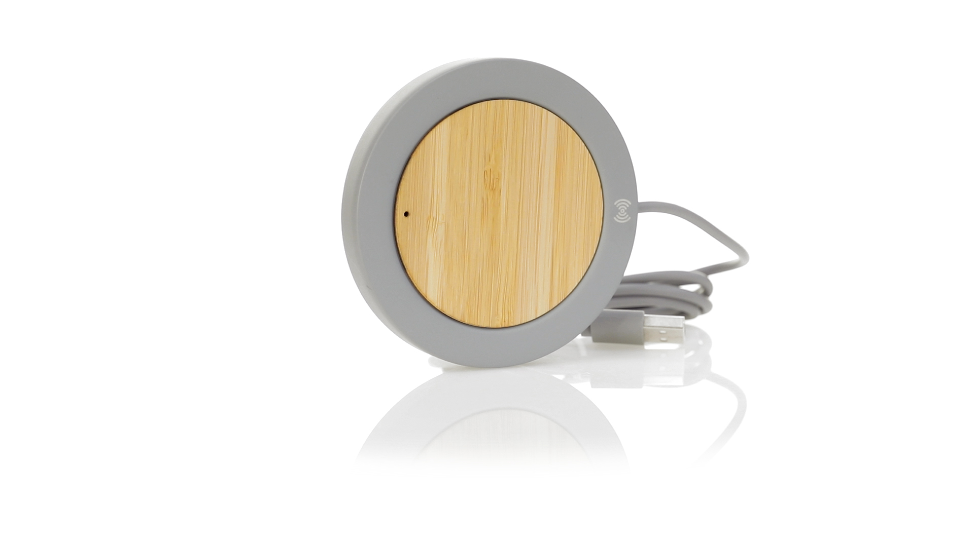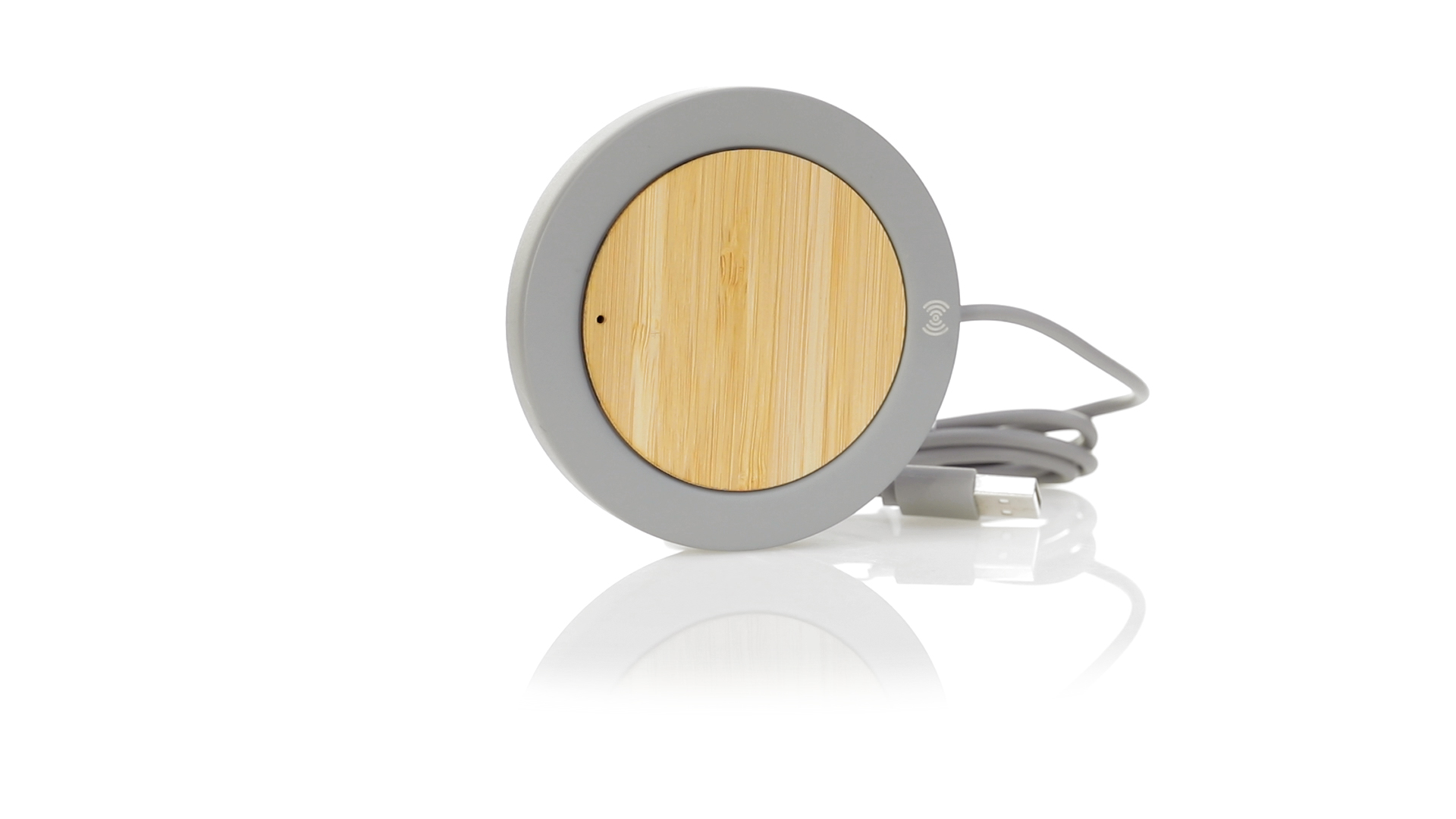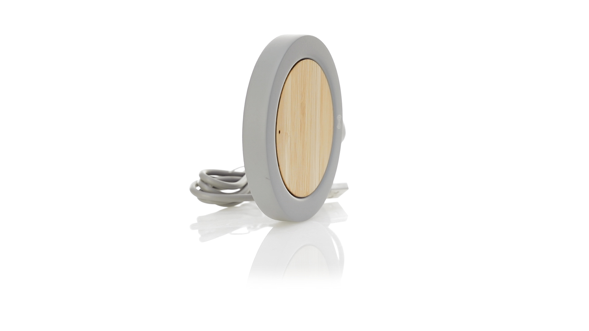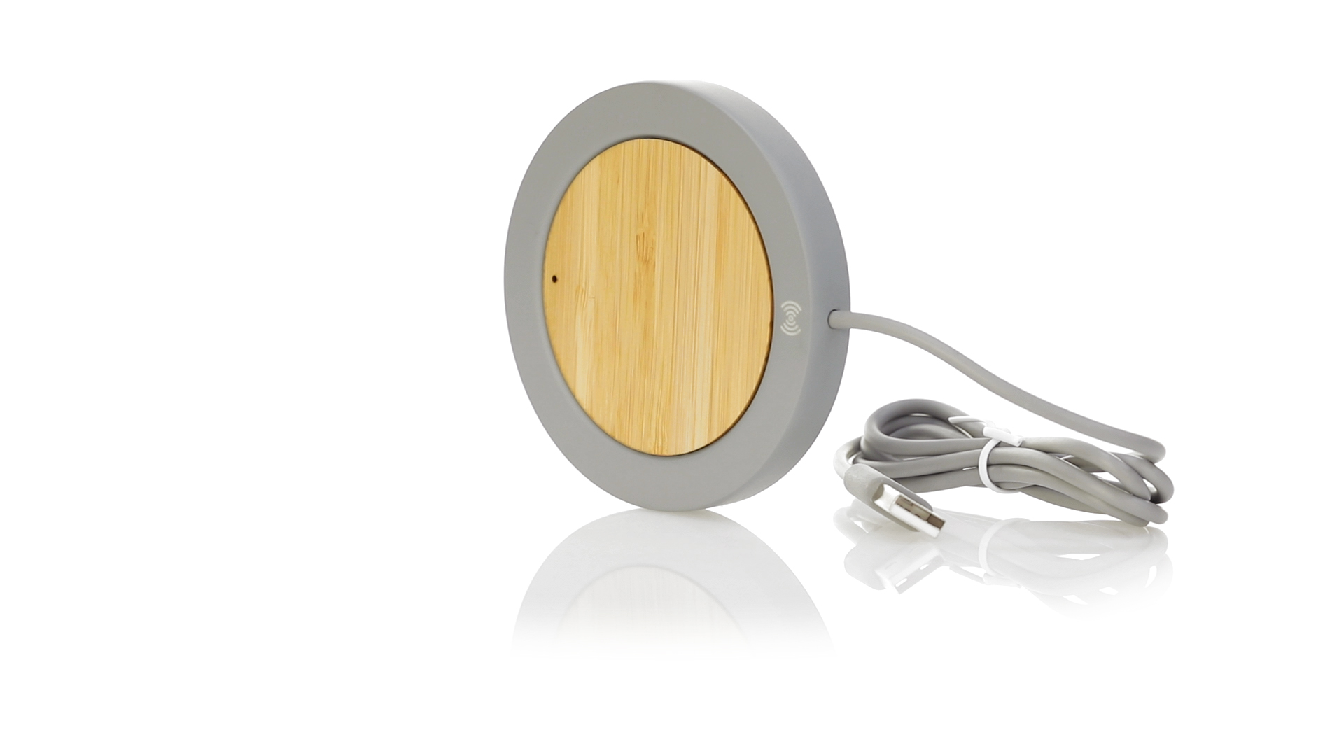 Drahtloses Ladegerät mit rundem Design in Kombination aus natürlich geschnittenen Bambusstücken und Kalksteinzement, einem Konglomerat, das durch die Mischung natürlicher Materialien, hauptsächlich gemahlener Kalkstein und Wasser, gebildet wird, wodurch ein Material von grosser Konsistenz und Haltbarkeit entsteht.USB-Ladekabel in passender Farbe, kompatibel mit Geräten, die mit drahtloser Ladetechnologie ausgestattet sind. Sicherheitsschutz zur Vermeidung von Überhitzung, Überladung und Kurzschluss. Präsentiert in einer attraktiven Design-Box.
