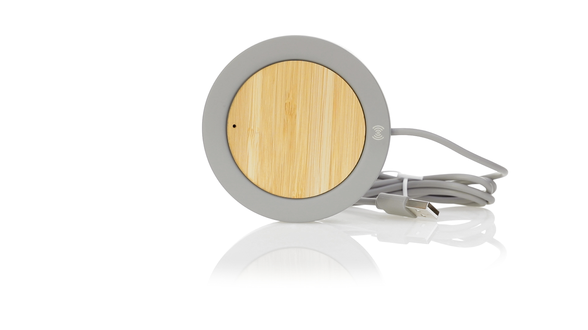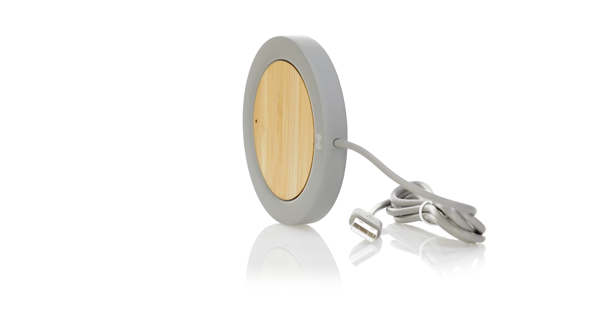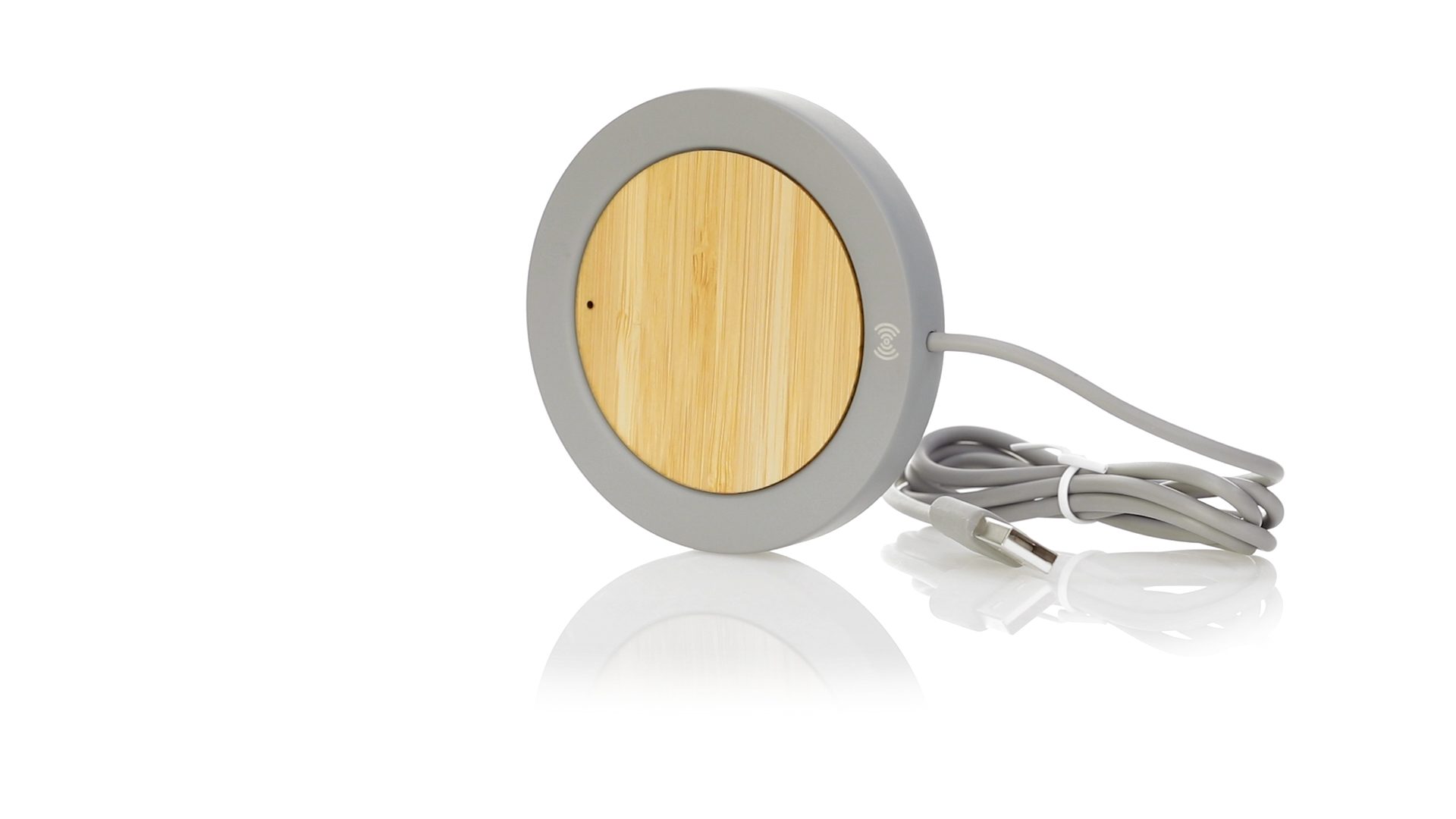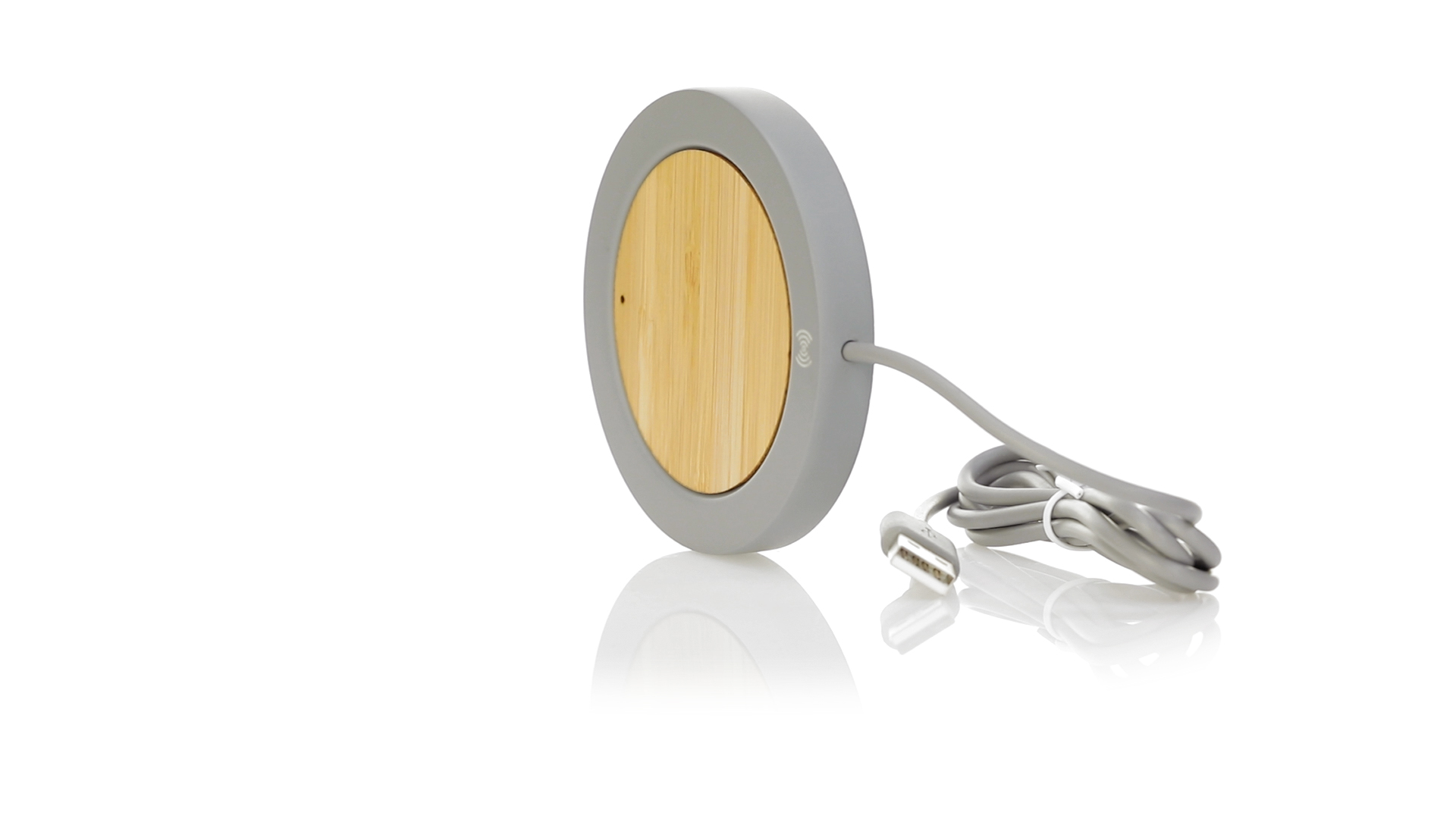 Drahtloses Ladegerät mit rundem Design in Kombination aus natürlich geschnittenen Bambusstücken und Kalksteinzement, einem Konglomerat, das durch die Mischung natürlicher Materialien, hauptsächlich gemahlener Kalkstein und Wasser, gebildet wird, wodurch ein Material von grosser Konsistenz und Haltbarkeit entsteht.USB-Ladekabel in passender Farbe, kompatibel mit Geräten, die mit drahtloser Ladetechnologie ausgestattet sind. Sicherheitsschutz zur Vermeidung von Überhitzung, Überladung und Kurzschluss. Präsentiert in einer attraktiven Design-Box.