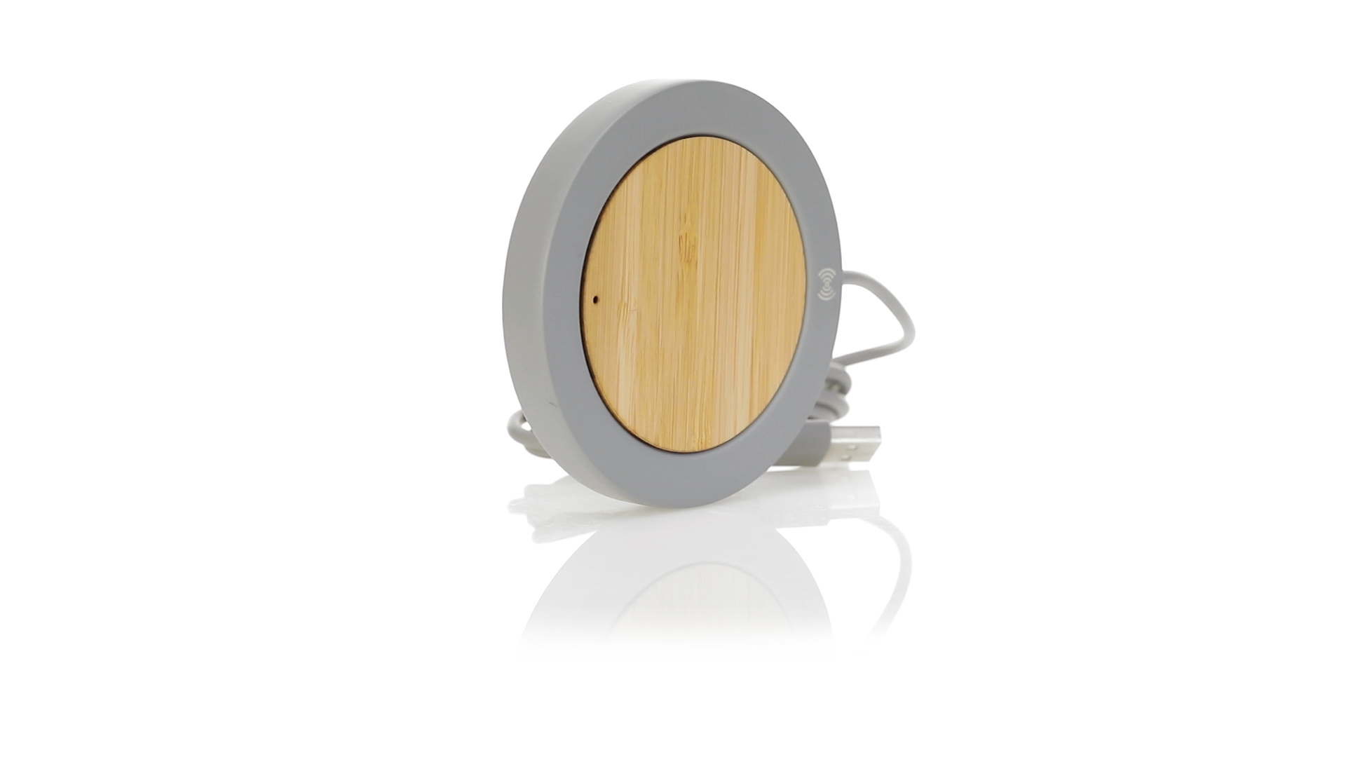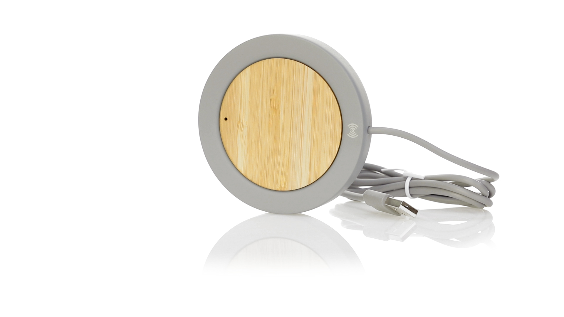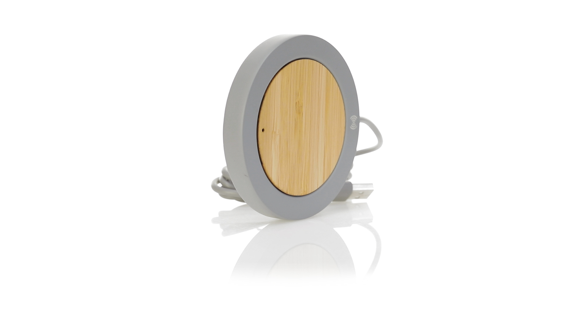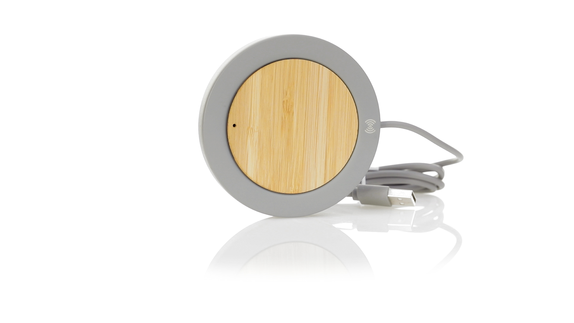 Drahtloses Ladegerät mit rundem Design in Kombination aus natürlich geschnittenen Bambusstücken und Kalksteinzement, einem Konglomerat, das durch die Mischung natürlicher Materialien, hauptsächlich gemahlener Kalkstein und Wasser, gebildet wird, wodurch ein Material von grosser Konsistenz und Haltbarkeit entsteht.USB-Ladekabel in passender Farbe, kompatibel mit Geräten, die mit drahtloser Ladetechnologie ausgestattet sind. Sicherheitsschutz zur Vermeidung von Überhitzung, Überladung und Kurzschluss. Präsentiert in einer attraktiven Design-Box.